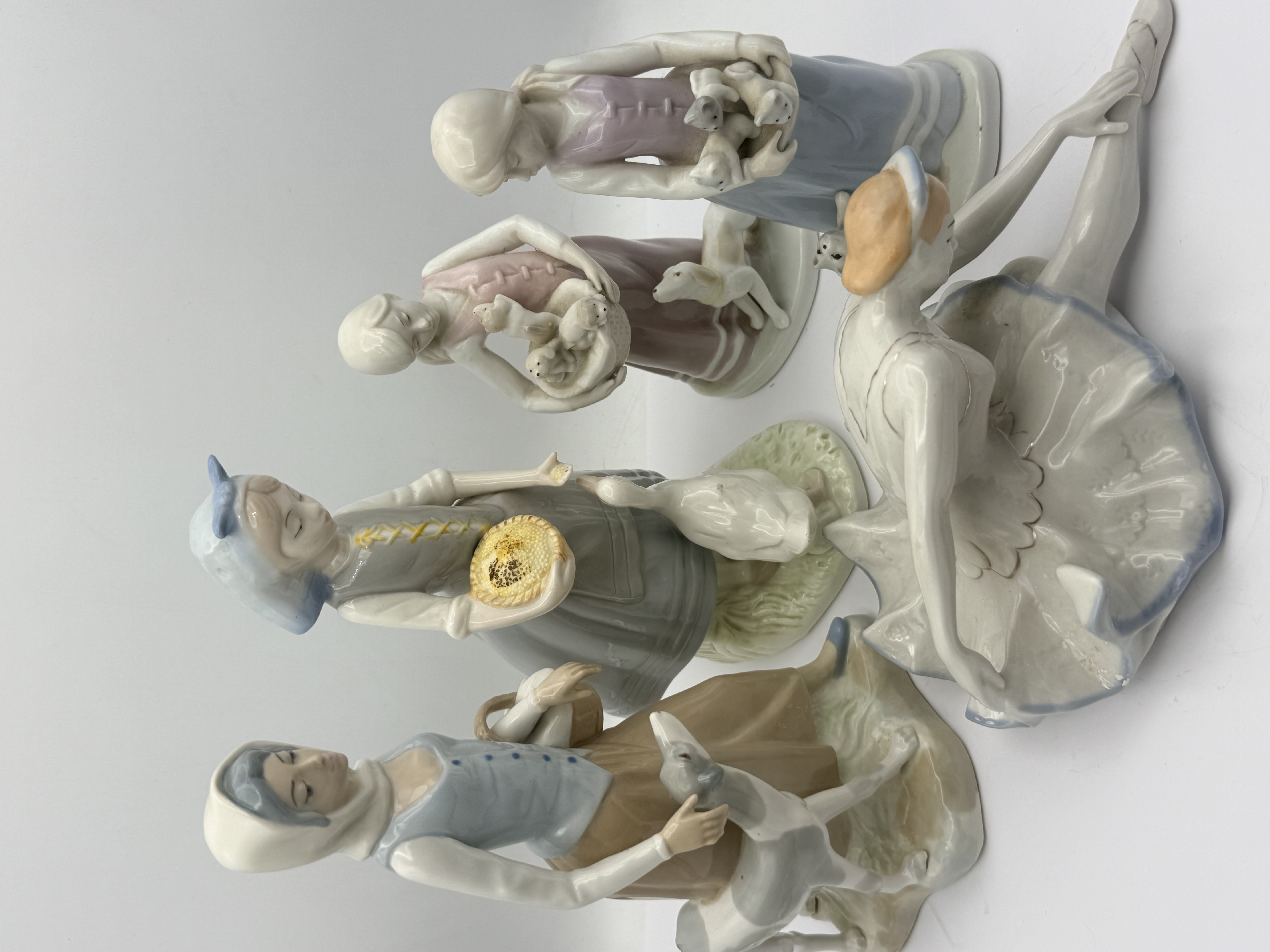 A collection of five glazed porcelain figurines produced by Lladro and Nao. The group features various subjects including a seated ballerina in a flared tutu, two young women in pastoral attire accompanied by animals, and two girls holding baskets of puppies. The figures are rendered in a palette of muted pastel tones including soft blues, grays, and pinks, finished with a high-gloss glaze. These pieces are characteristic of late 20th-century Spanish decorative arts.