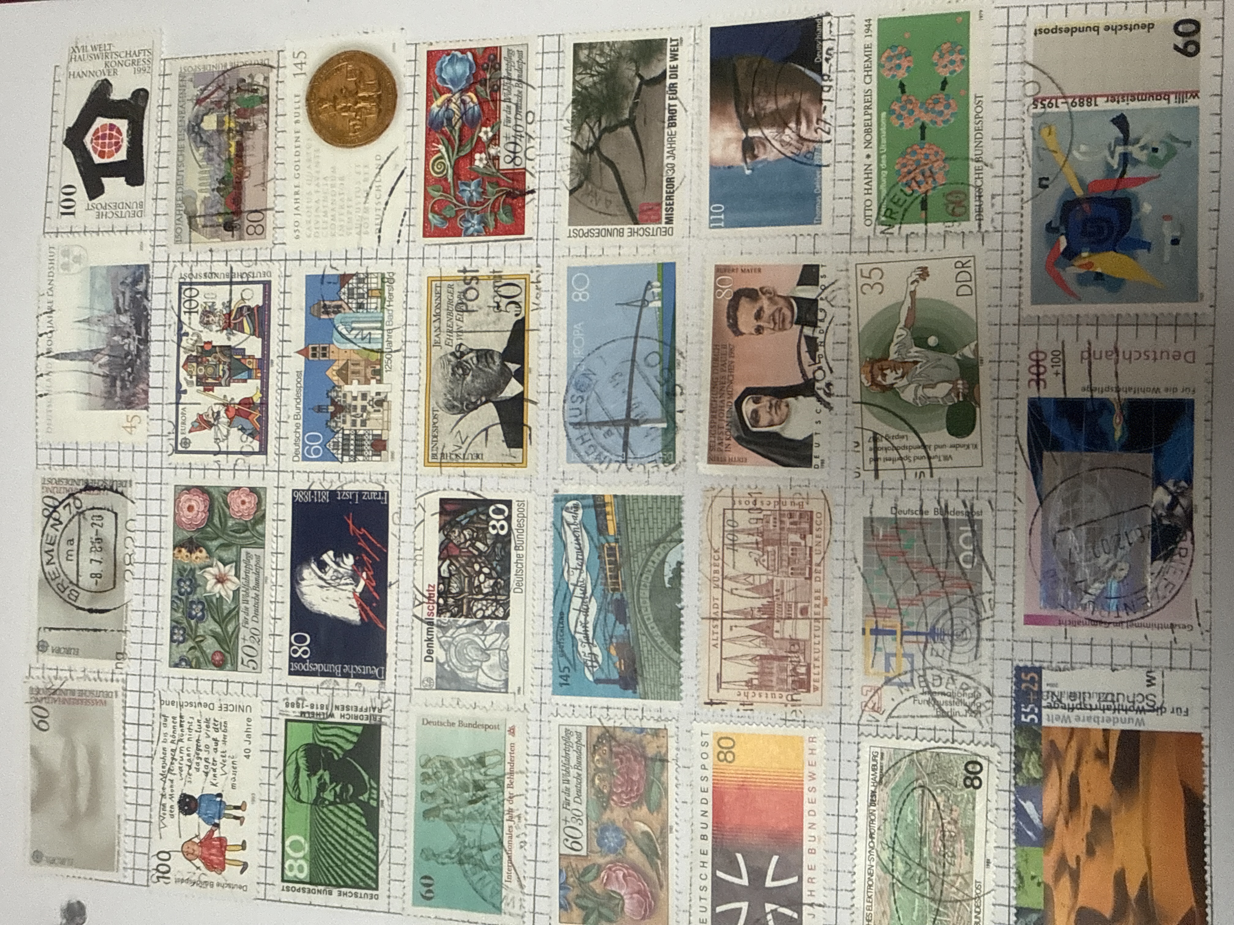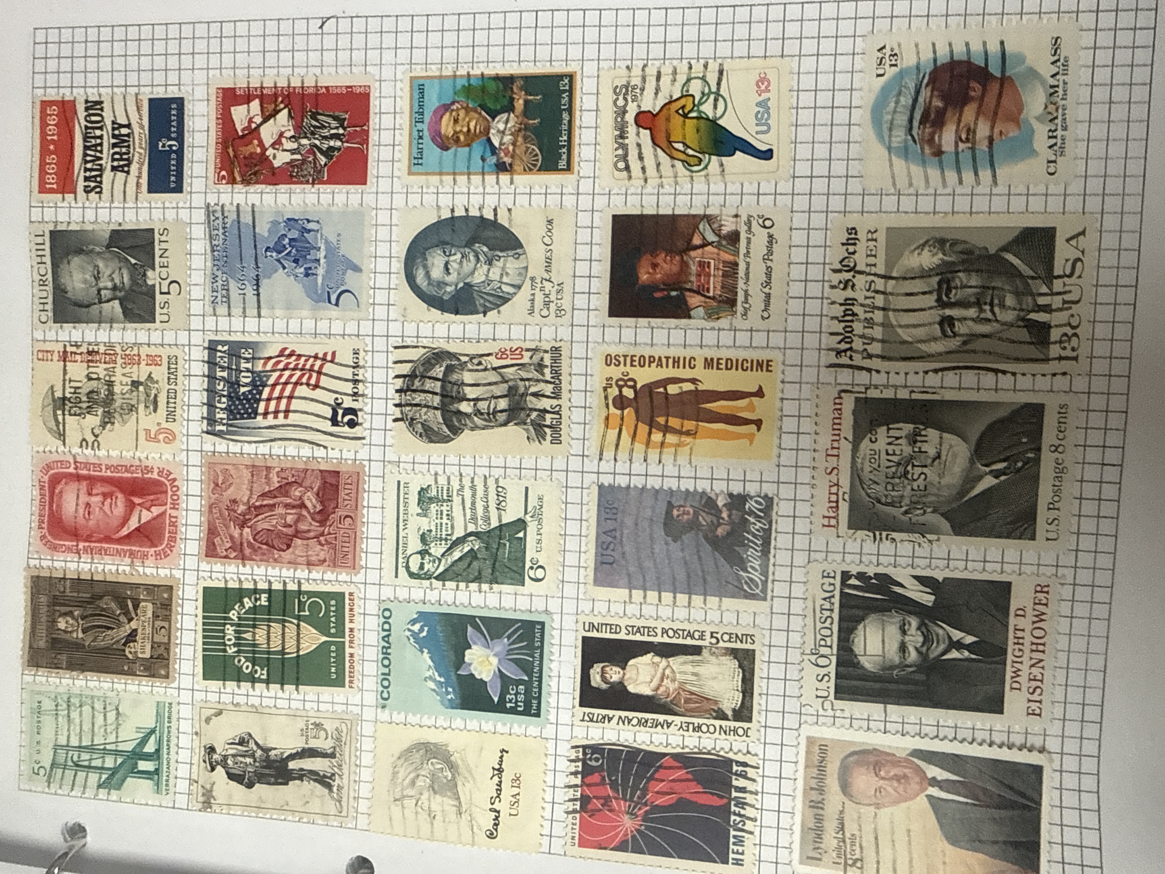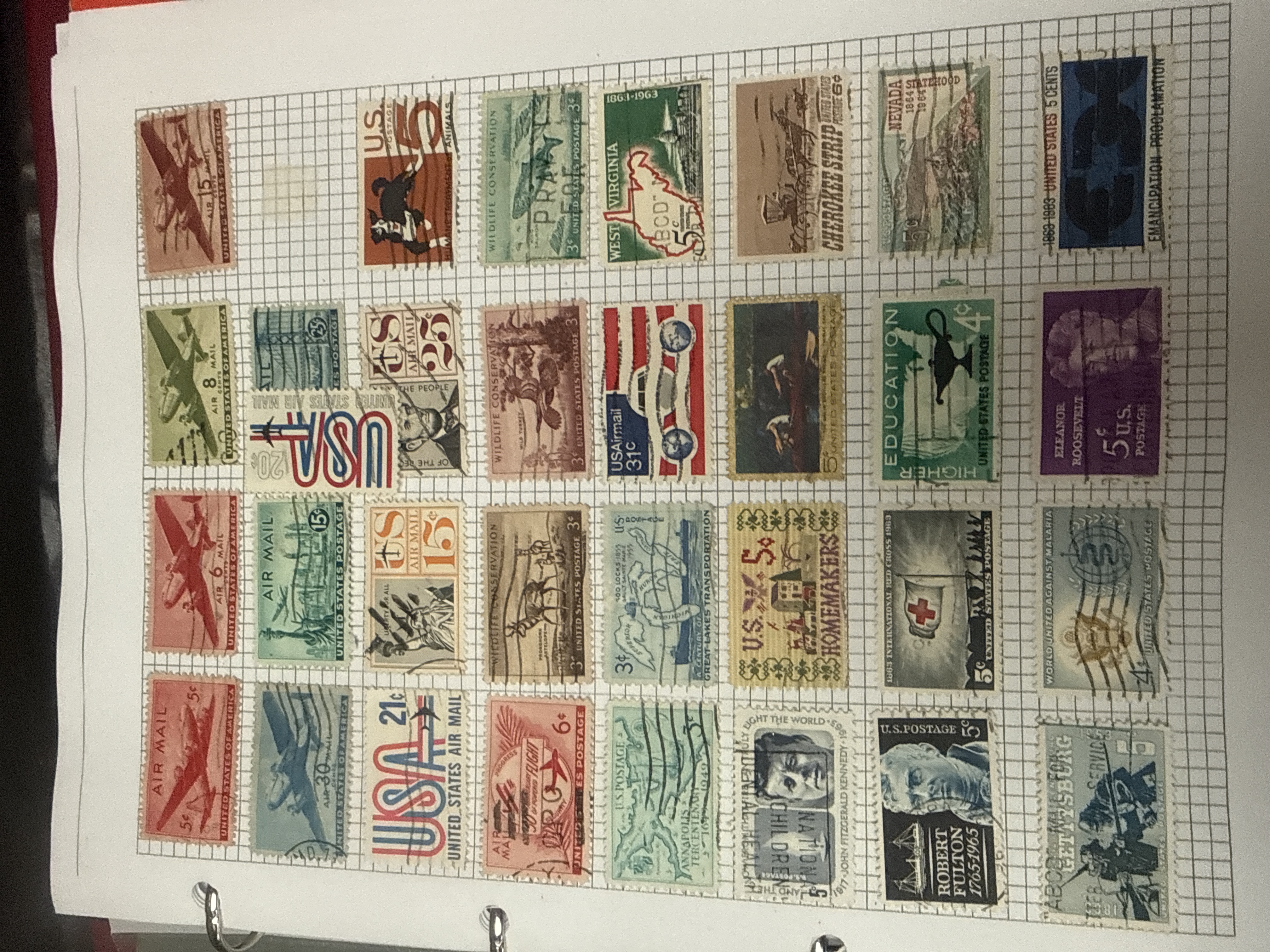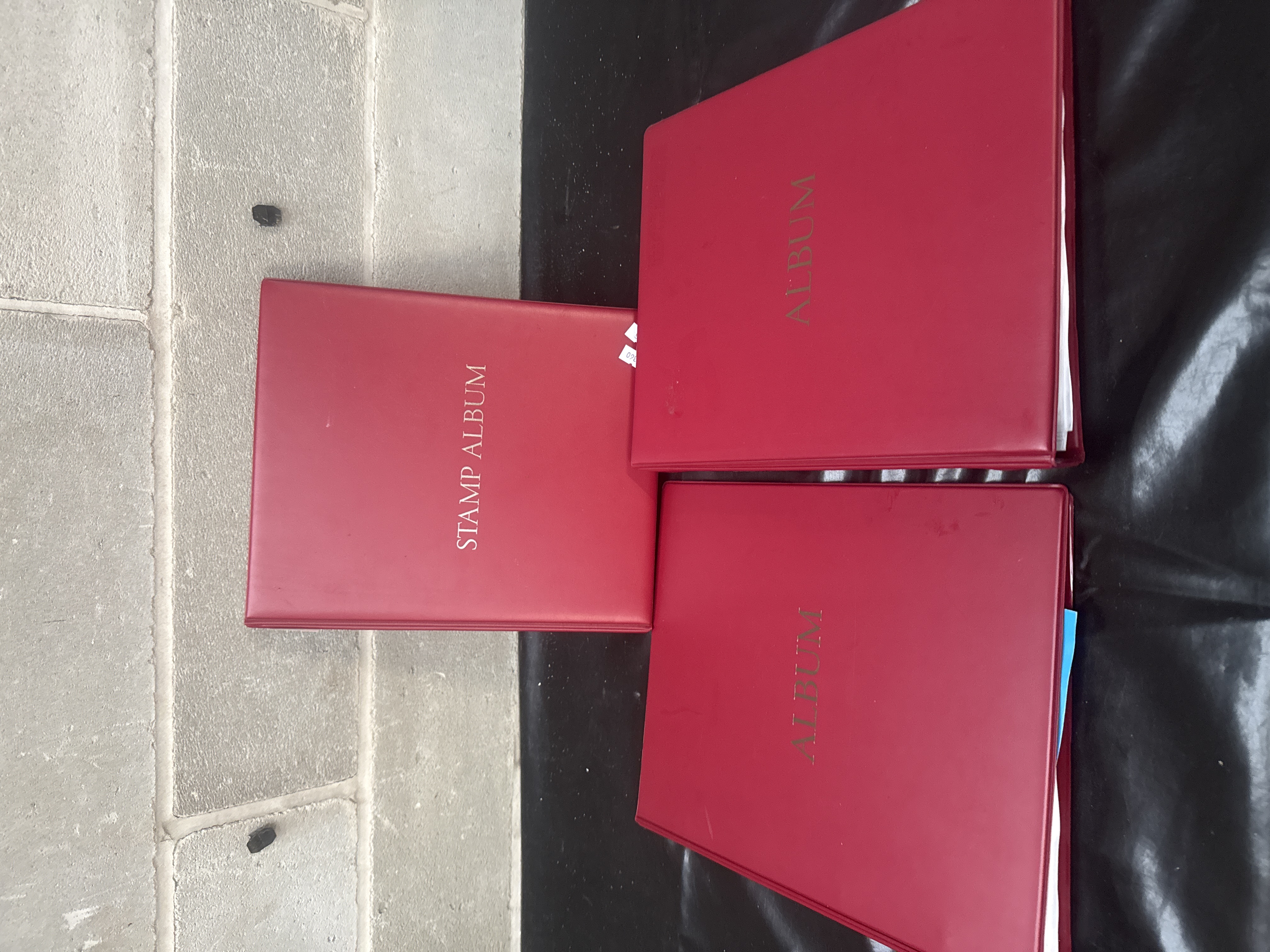 A collection of three stamp albums featuring red vinyl covers with gold-foil lettering reading STAMP ALBUM and ALBUM. The philatelic material is mounted on grid-marked paper pages and includes a diverse range of domestic and international issues primarily from the mid-to-late 20th century. United States issues include commemorative and airmail stamps depicting historical figures such as Harriet Tubman, Winston Churchill, and various U.S. Presidents, alongside themes of conservation and space exploration. European material includes issues from the Deutsche Bundespost and the DDR (East Germany). A significant portion of the collection consists of Soviet-era stamps marked ПОЧТА СССР (USSR Post) featuring themes of cosmonautics, political history, and cultural achievements. The stamps comprise a mix of mint and postmarked examples.