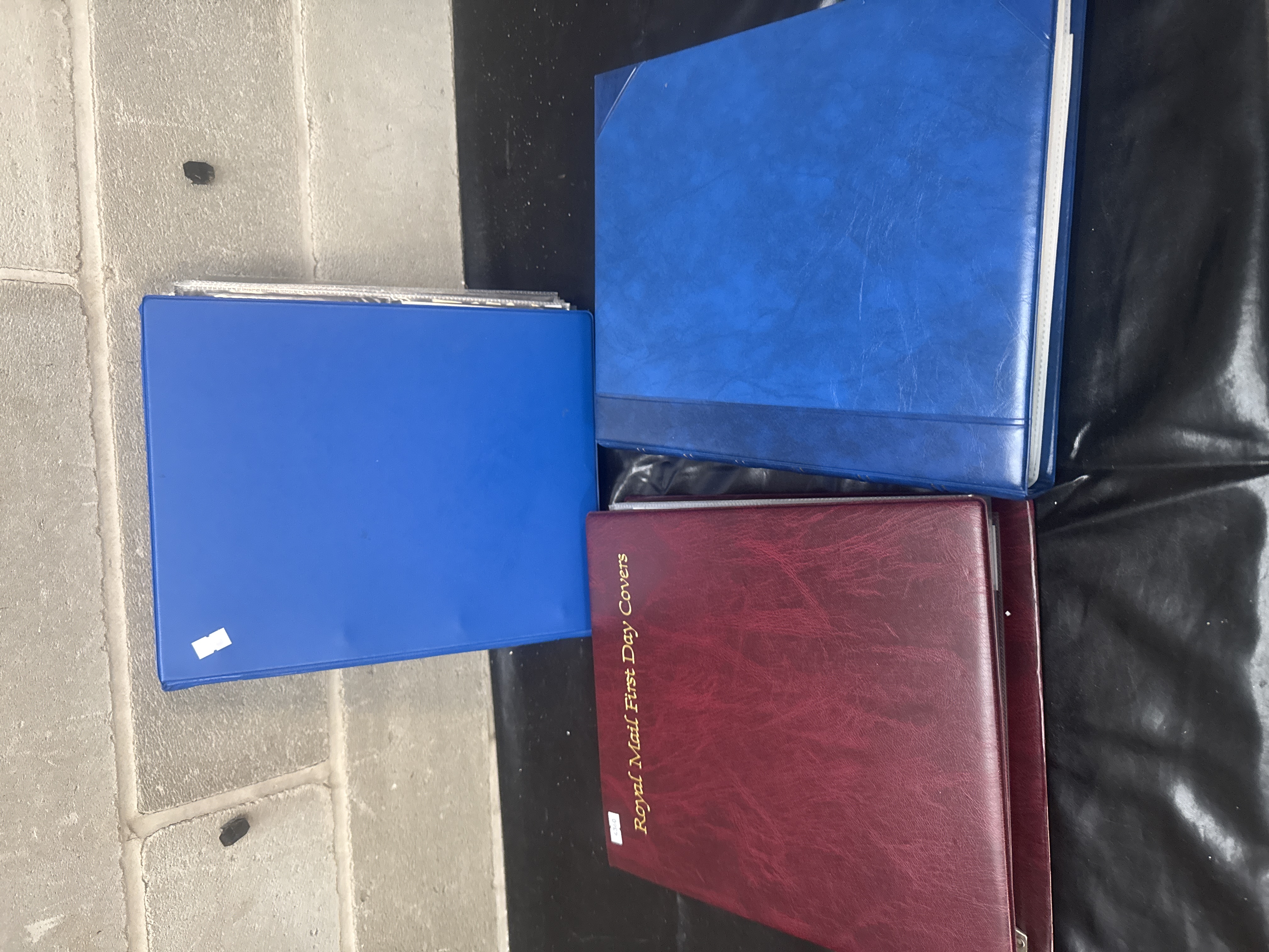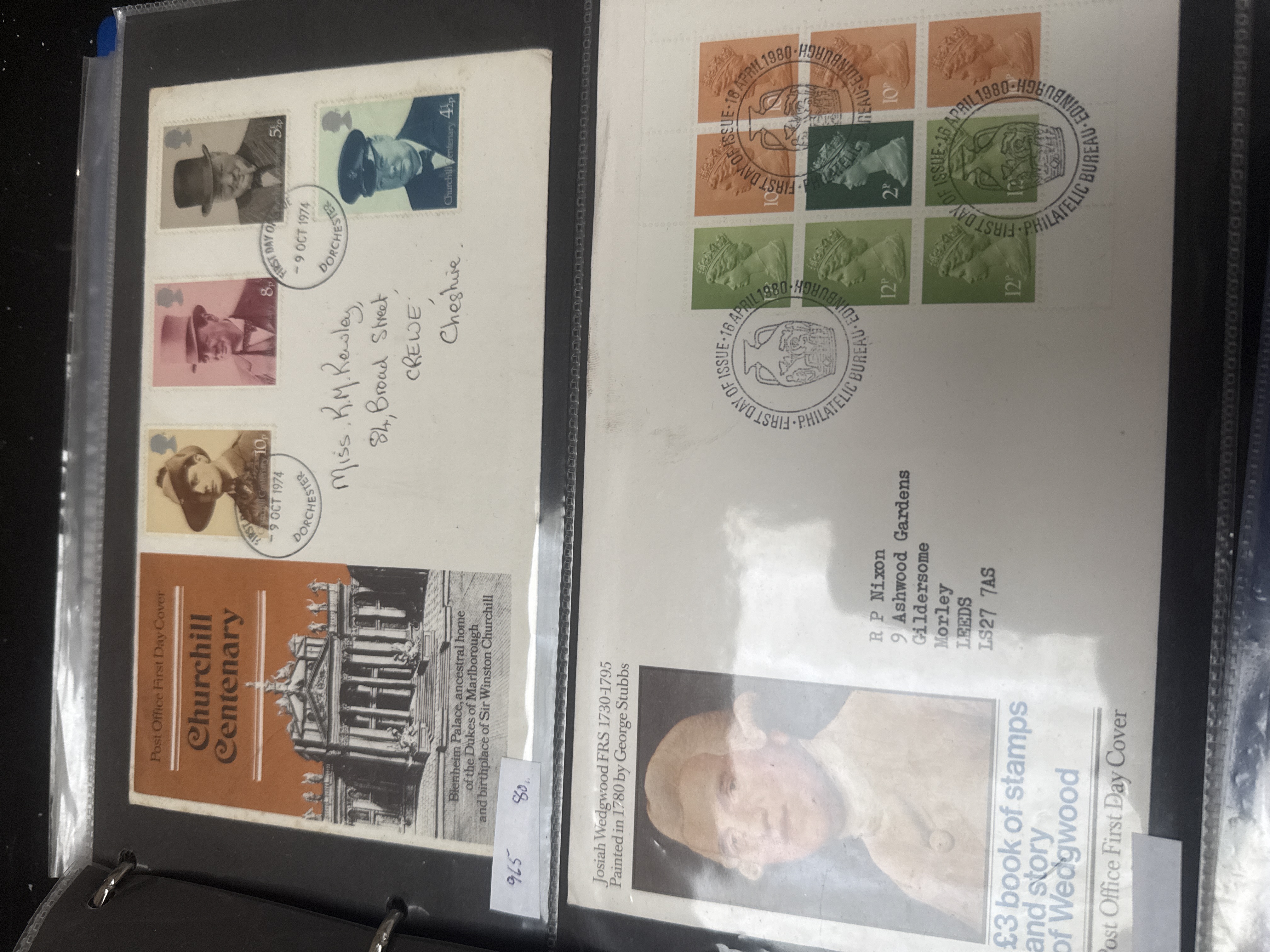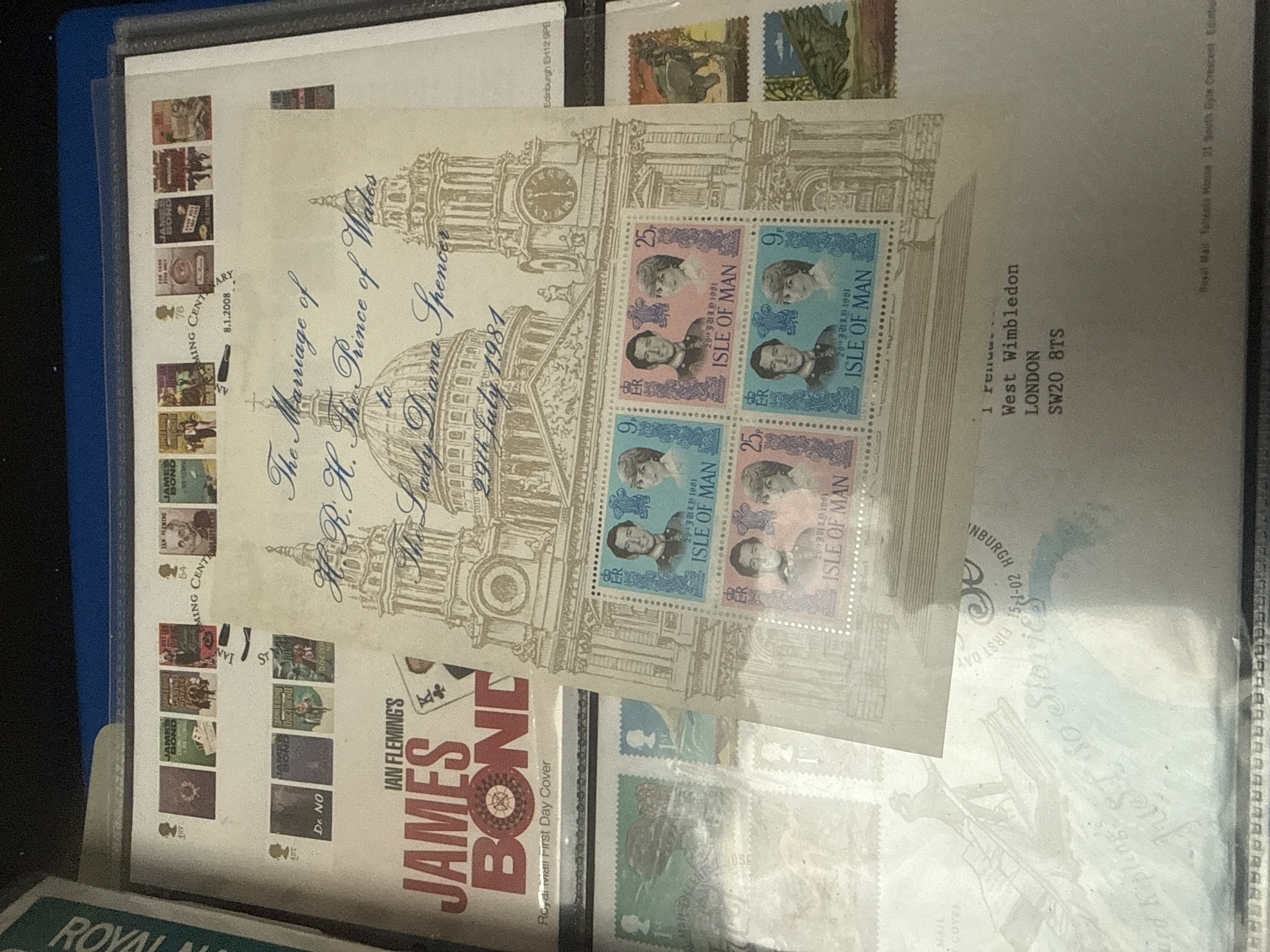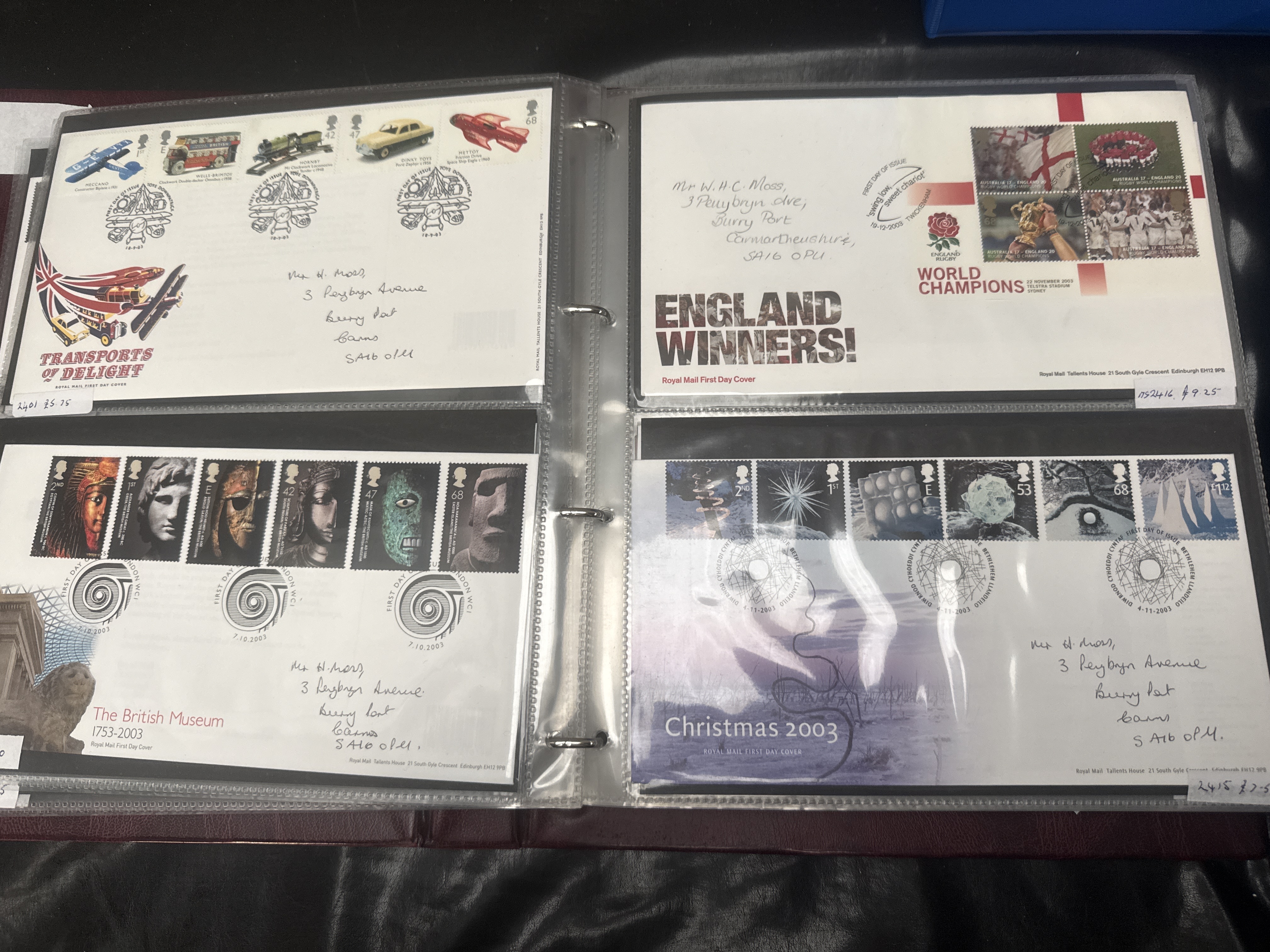 A collection of British and Commonwealth philatelic material, primarily focused on First Day Covers from the late 20th to early 21st centuries, housed within three ring binders. The collection includes one maroon binder with gilt lettering for Royal Mail First Day Covers and two blue binders. Commemorative themes include the Churchill Centenary 1974, the 1981 and 1986 royal weddings, Halley’s Comet 1986, the 2003 Rugby World Cup victory, and James Bond 2008. Additional subjects include Transports of Delight, the British Museum 250th Anniversary, and various Christmas issues. The material originates from the Royal Mail, the Isle of Man Post Office, and includes a souvenir from Stampex 1963. The items are presented in clear protective sleeves and feature official postmarks, with many bearing handwritten addresses.