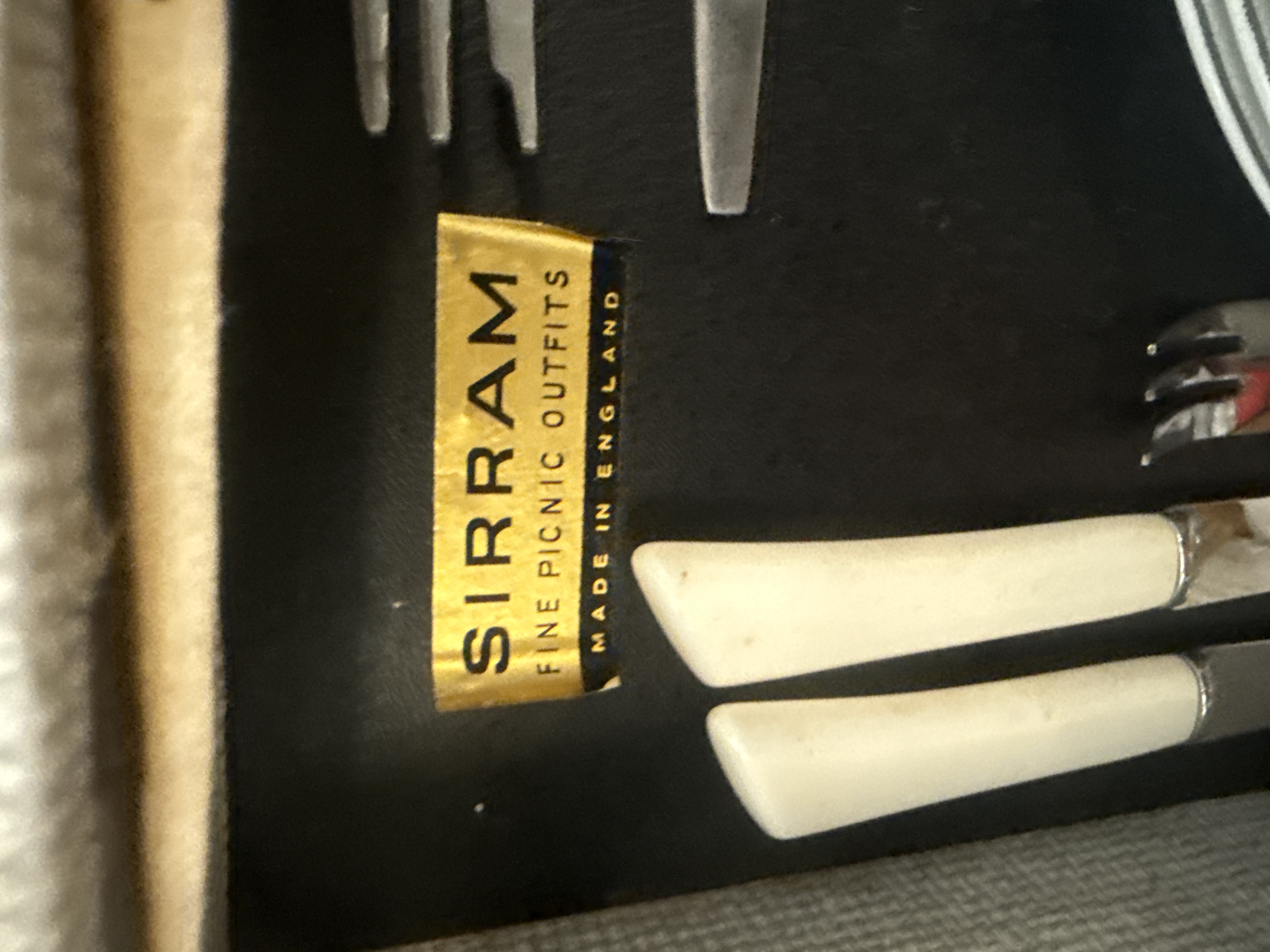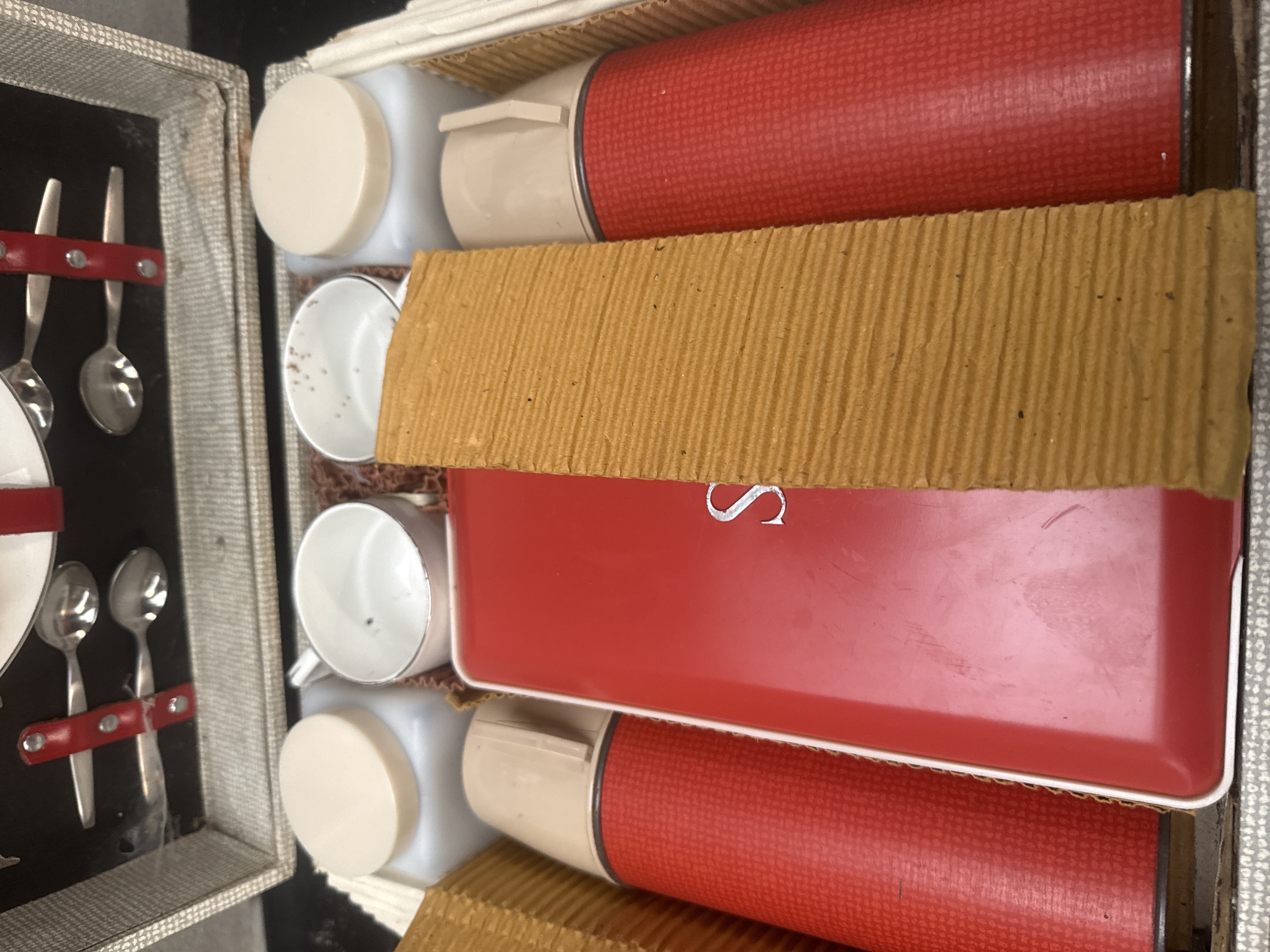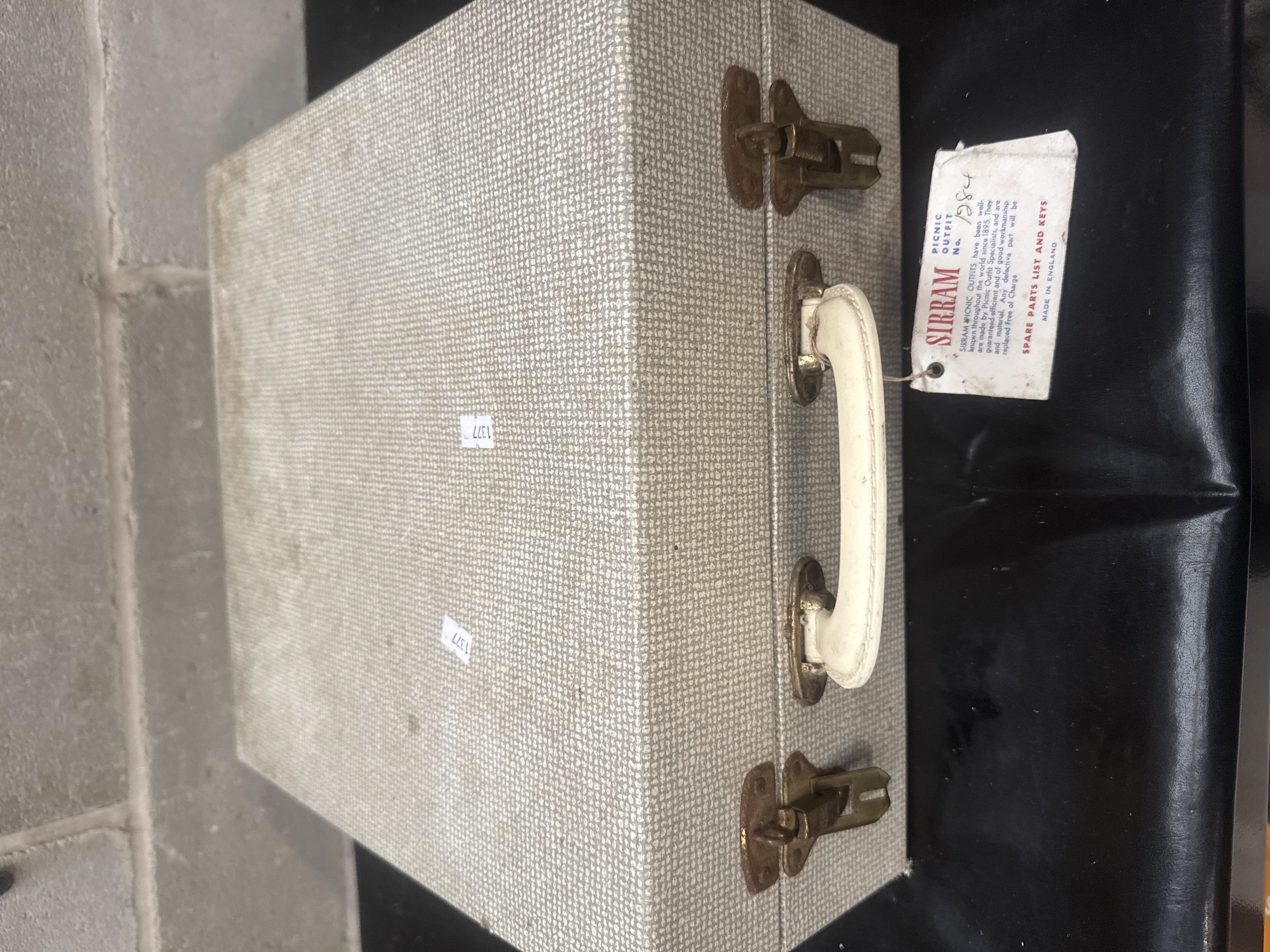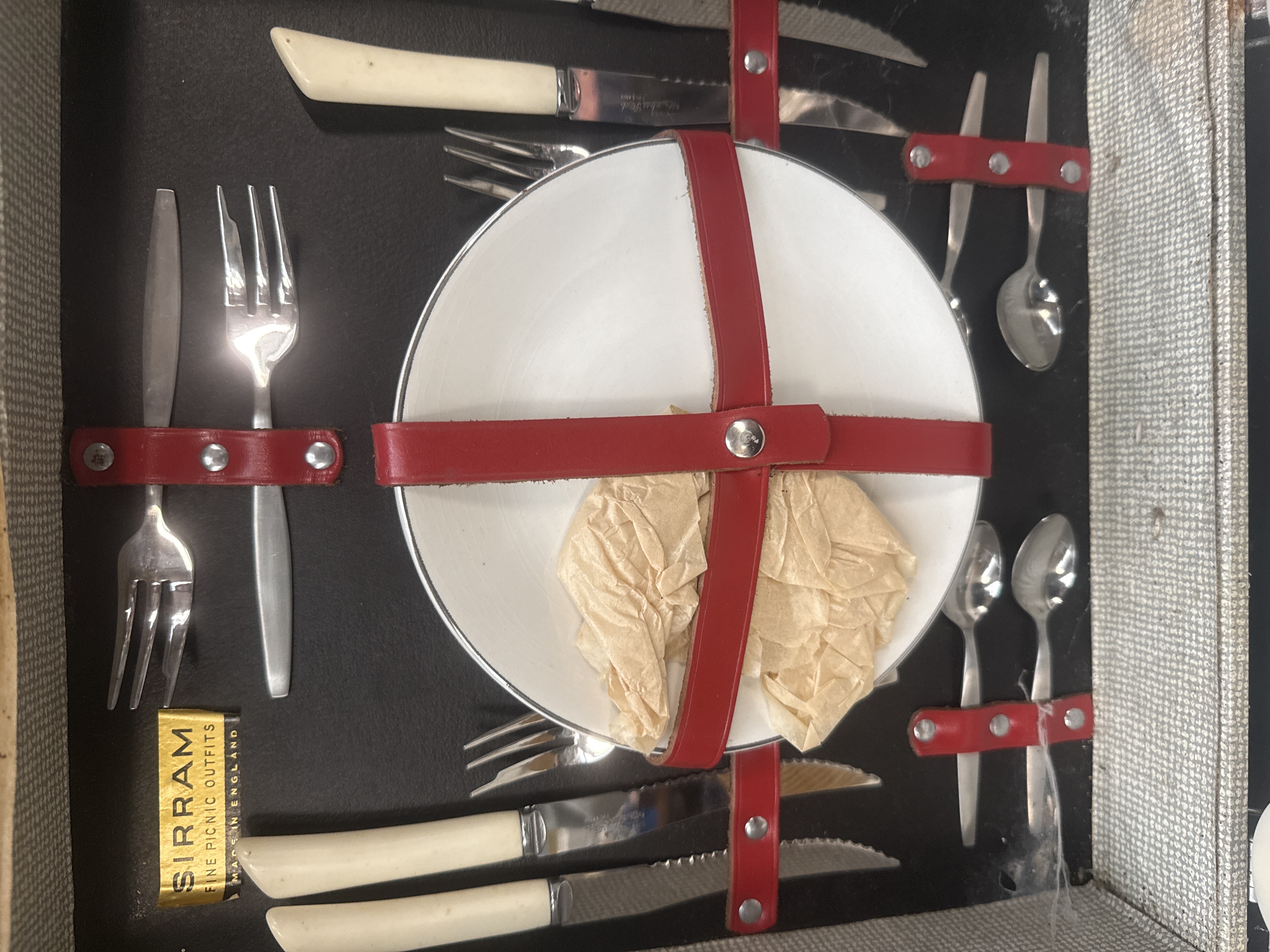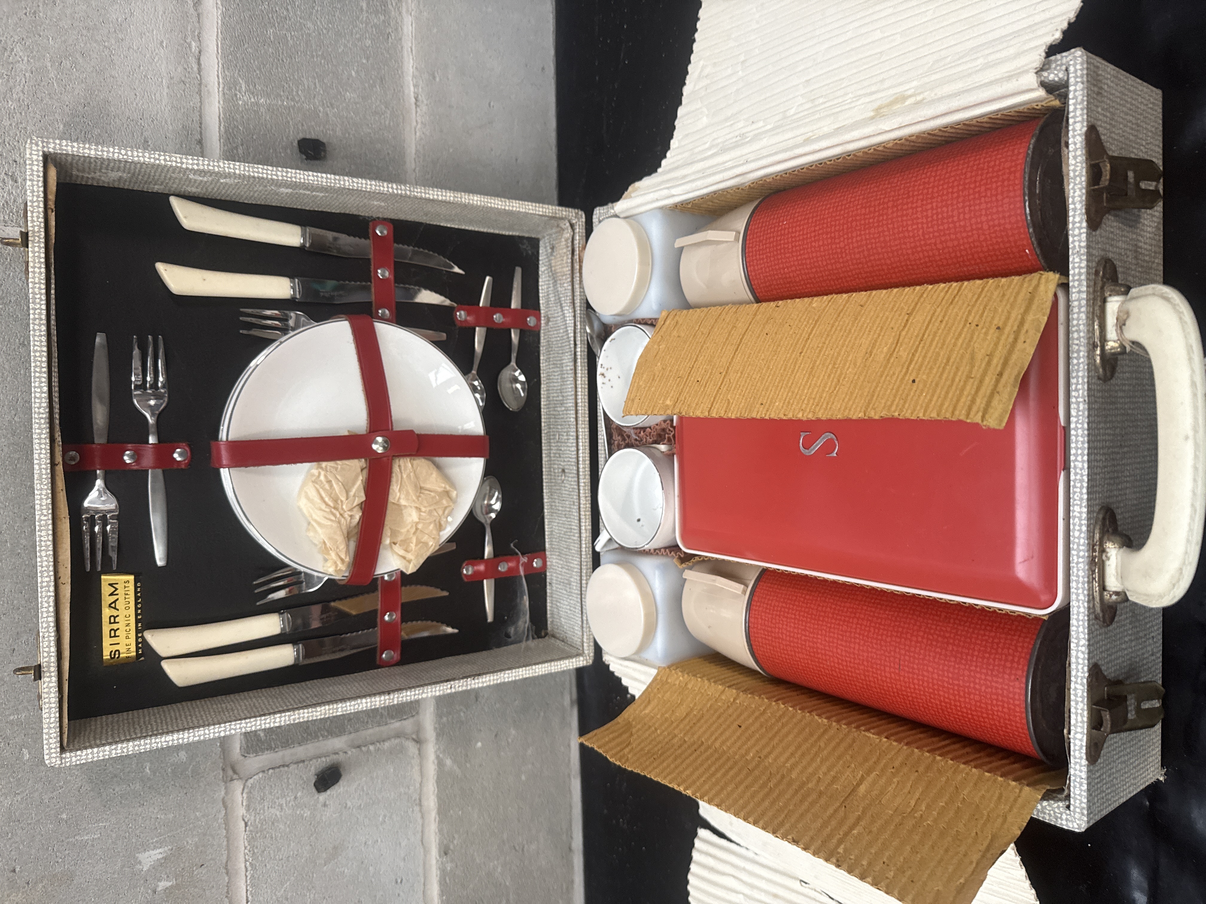 A Sirram Picnic Outfit No. 1984, manufactured in England. The set is housed in a hard-sided case with a textured cream-colored exterior, metal latches, and a molded plastic handle. The interior features a collection of dining essentials secured by red straps, including white plates, stainless steel forks and spoons, and knives with cream-colored handles. The set also includes red textured thermoses with cream caps, a large red rectangular storage container embossed with a silver-tone S monogram, white cups, and square plastic storage jars with screw-on lids. Original manufacturer labels and a paper tag identify the item. Several components remain in original protective packaging.