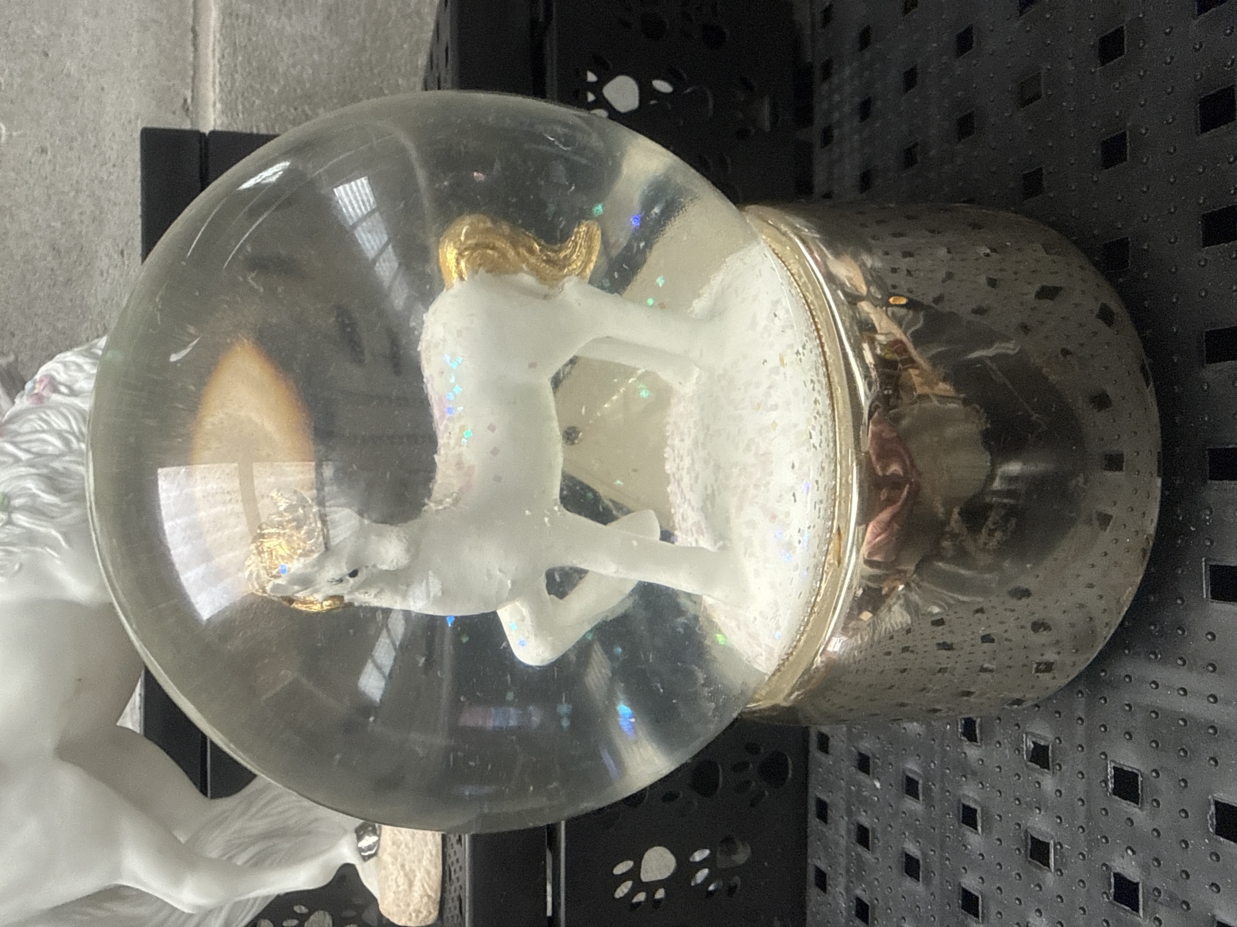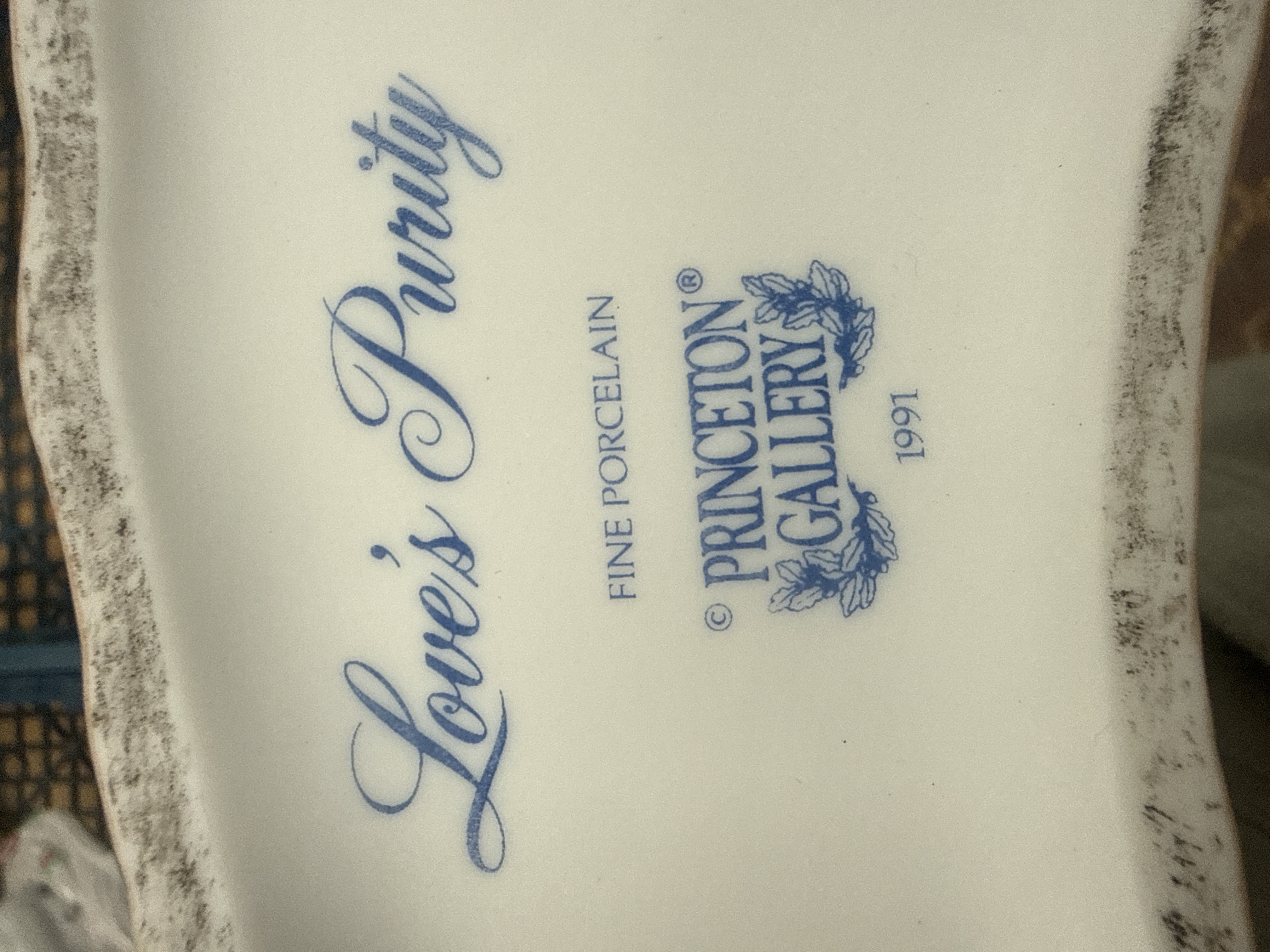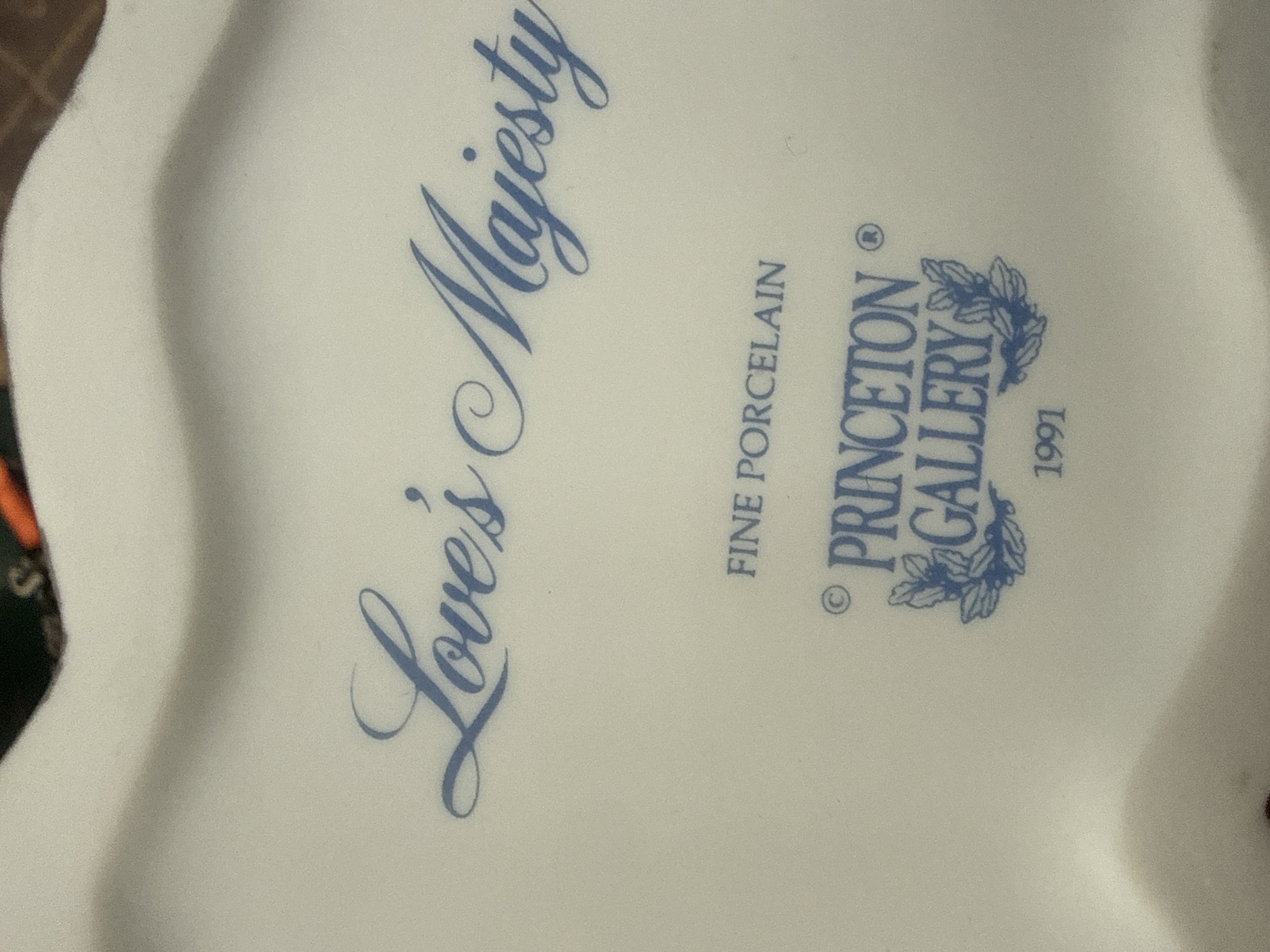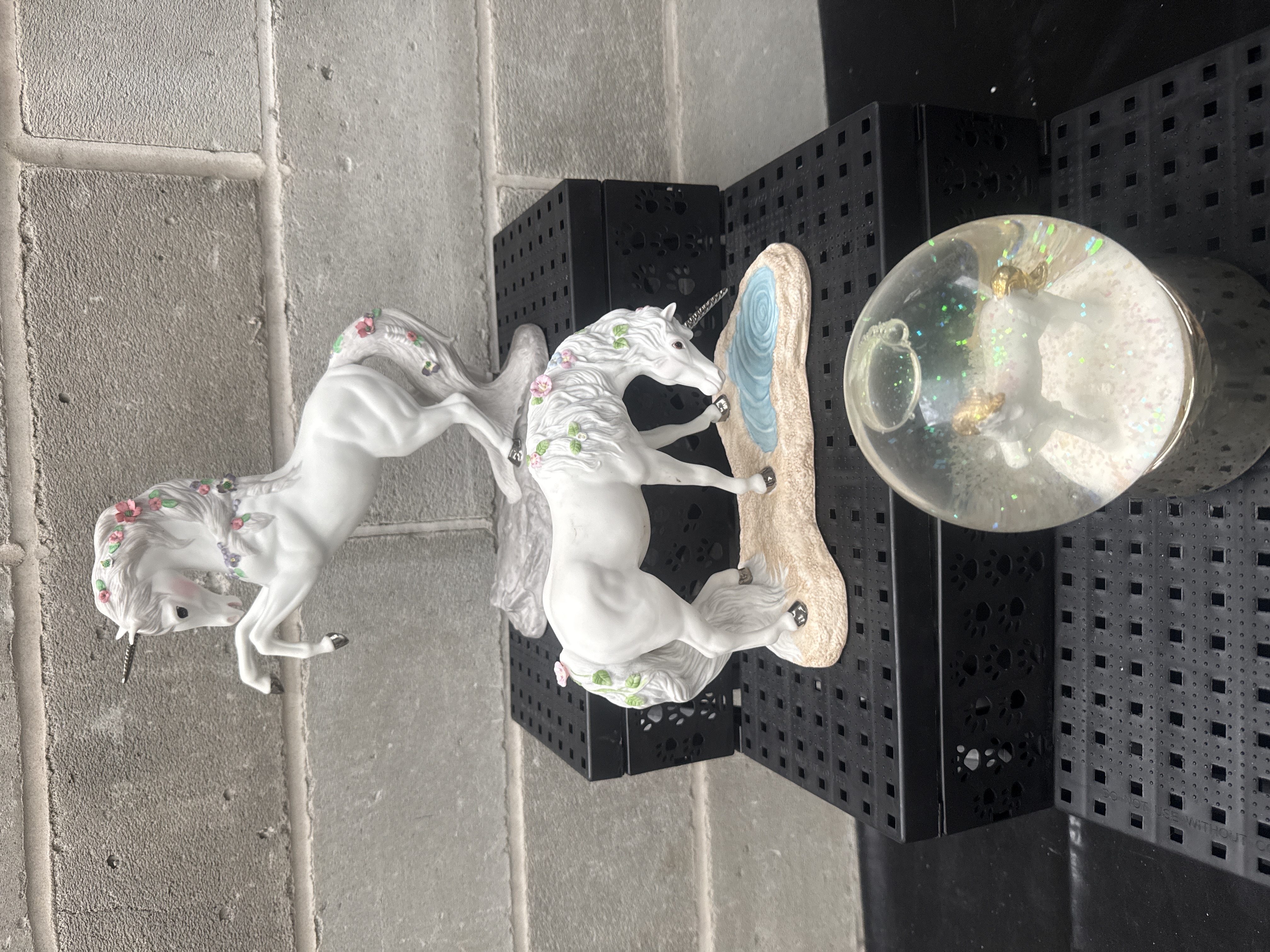 This lot consists of three items from Princeton Gallery, comprising two fine porcelain figurines and one musical snowglobe. The porcelain figurines are titled Love’s Purity and Love’s Majesty, both featuring 1991 blue stamps on the bases. These figurines are finished in white glaze and embellished with pink and purple floral wreaths, green leaves, and metallic-toned hooves and horns. Love’s Purity is modeled in a rearing pose, while Love’s Majesty stands beside an integrated pond. The musical snowglobe contains a white unicorn with gold-toned accents inside a glass sphere, resting on a textured metallic-finish cylindrical base. The largest item in the set measures 9 by 10 inches.