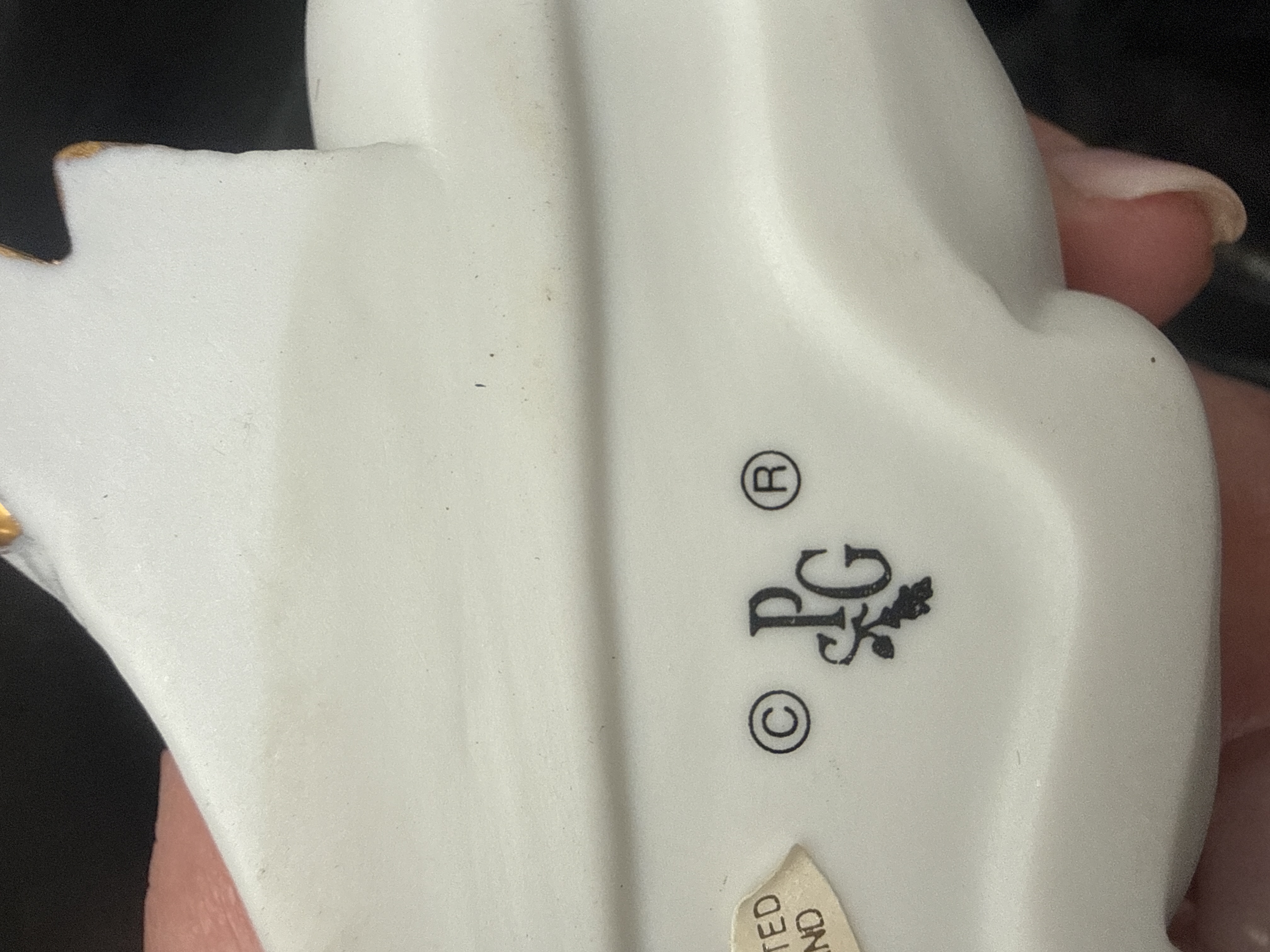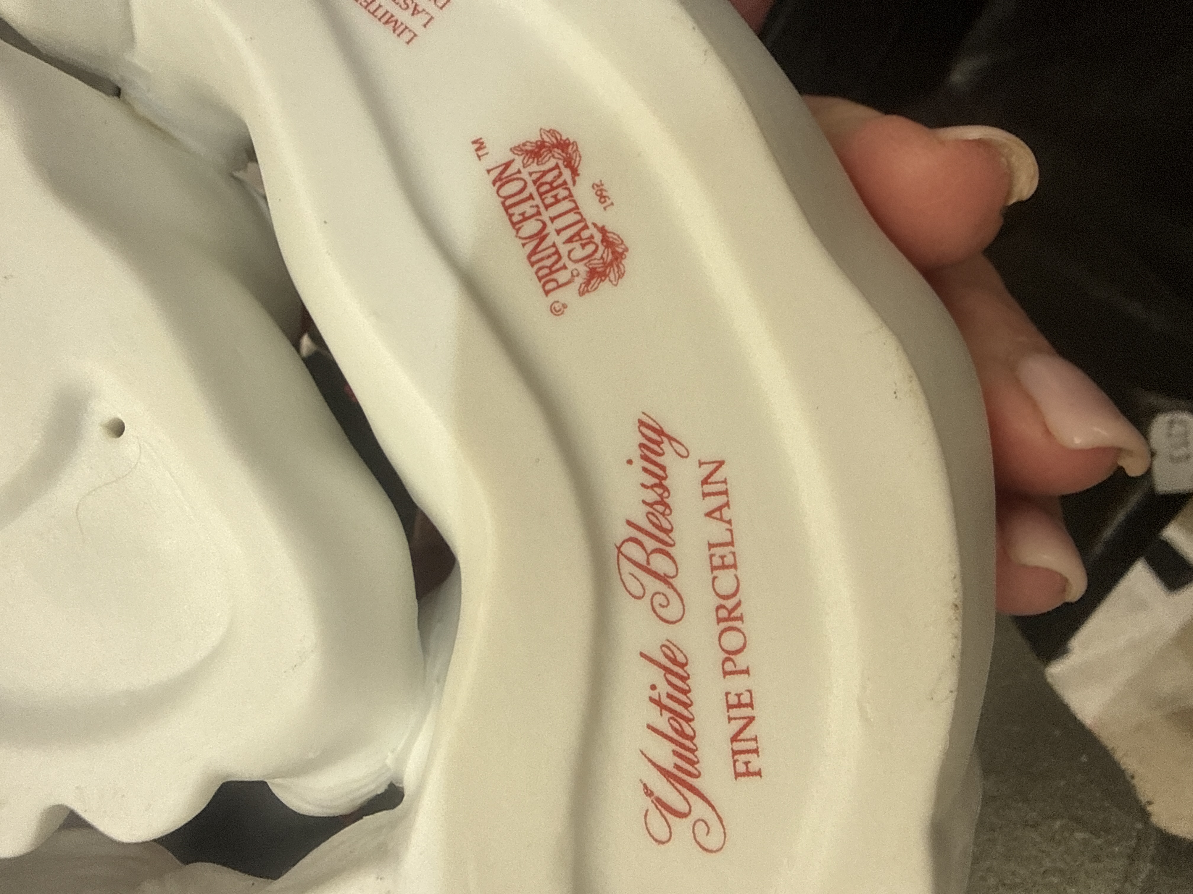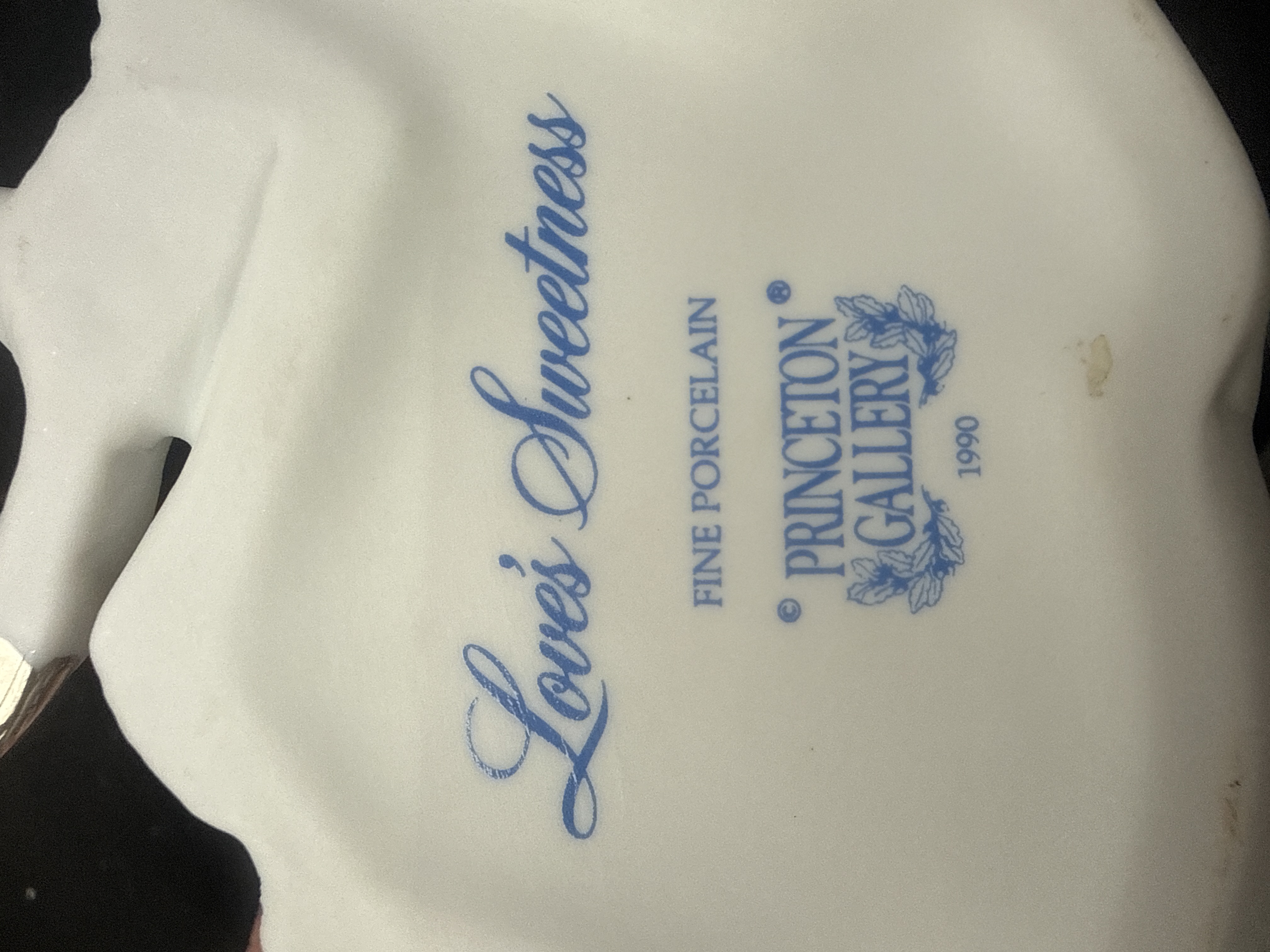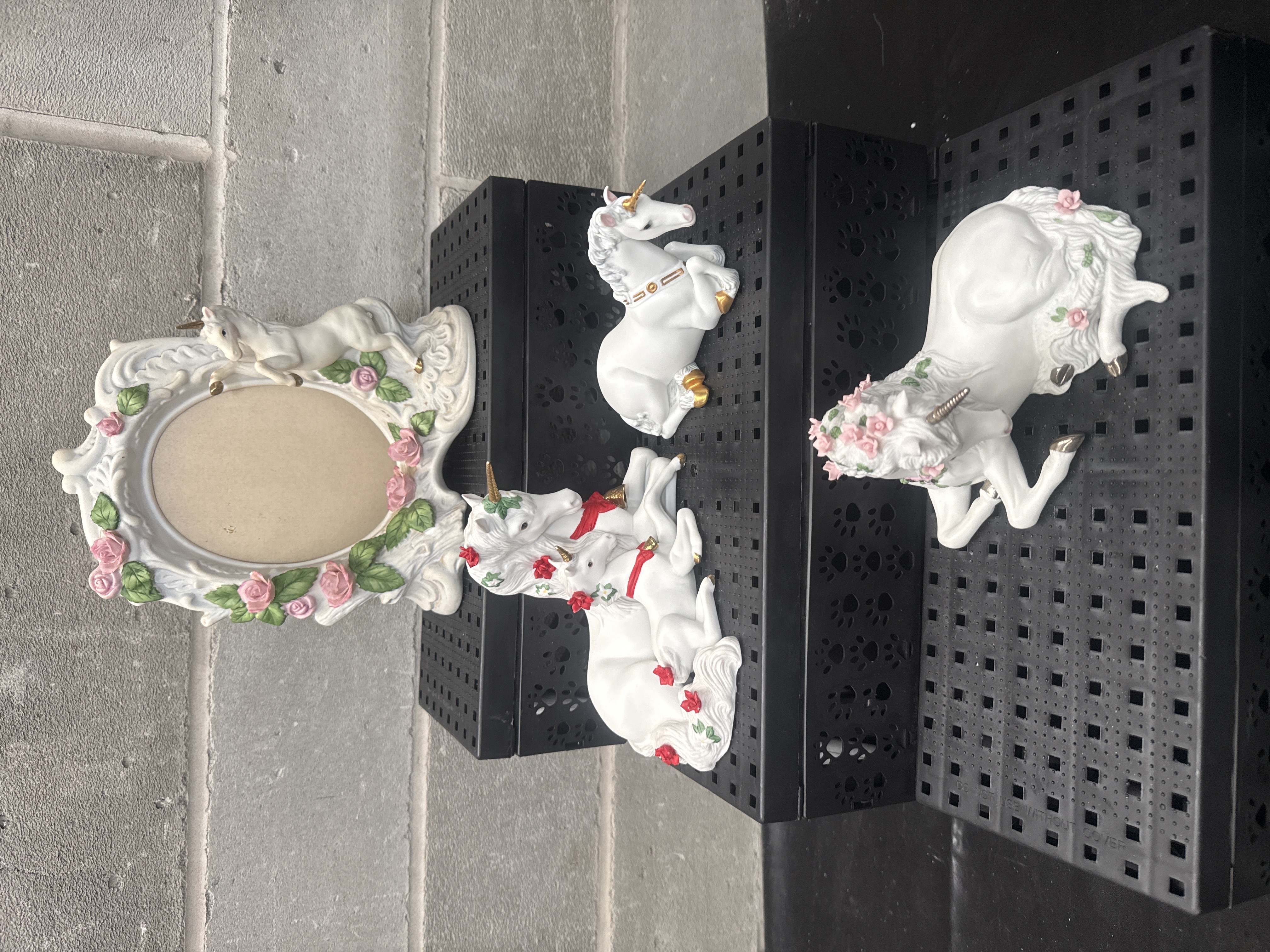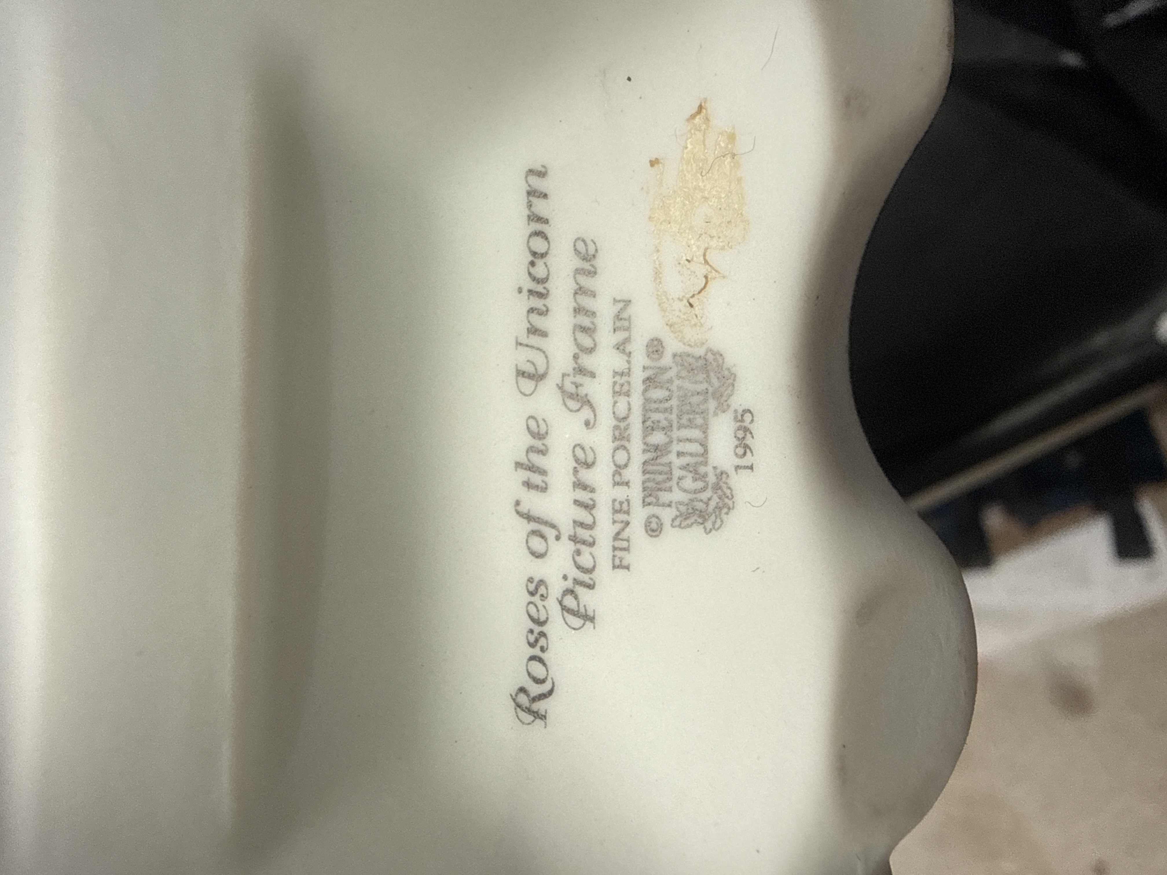 A group of four items from the Princeton Gallery unicorn collection, produced between 1990 and 1995. The collection includes a Roses of the Unicorn picture frame, a Love’s Sweetness figurine, and a Yuletide Blessing figurine. The materials are confirmed as Frame 8 X 9” and fine porcelain. Each piece features a matte finish with polychrome floral accents and gold-toned highlights on the horns and hooves. All items bear the Princeton Gallery backstamp on the underside, which includes the specific titles and copyright dates. The Roses of the Unicorn frame is designed with an oval aperture and decorated with relief-molded pink roses and a reclining unicorn. The Love’s Sweetness figurine depicts a unicorn with pink floral garlands, and the Yuletide Blessing figurine shows two unicorns with red floral and ribbon accents.