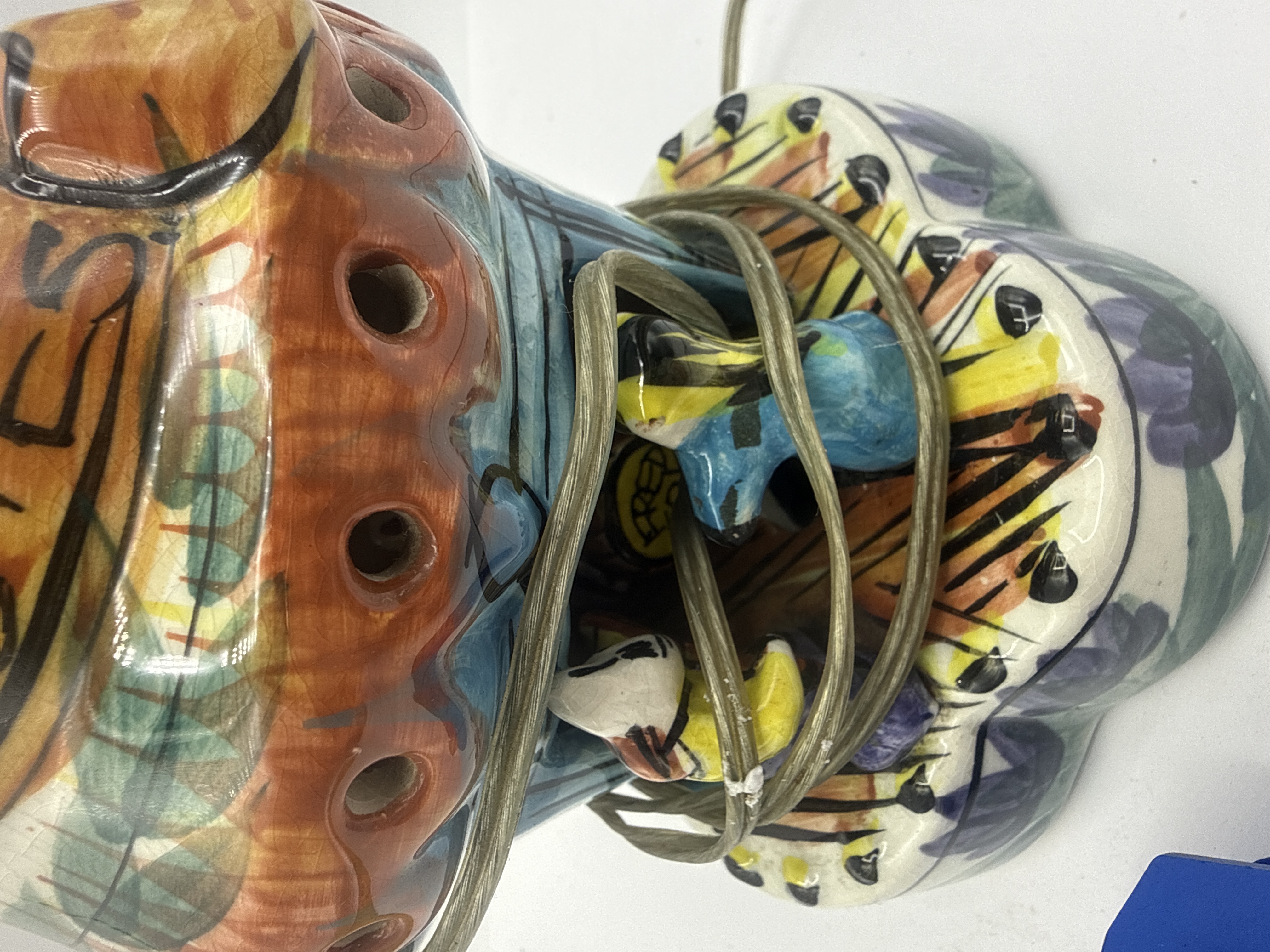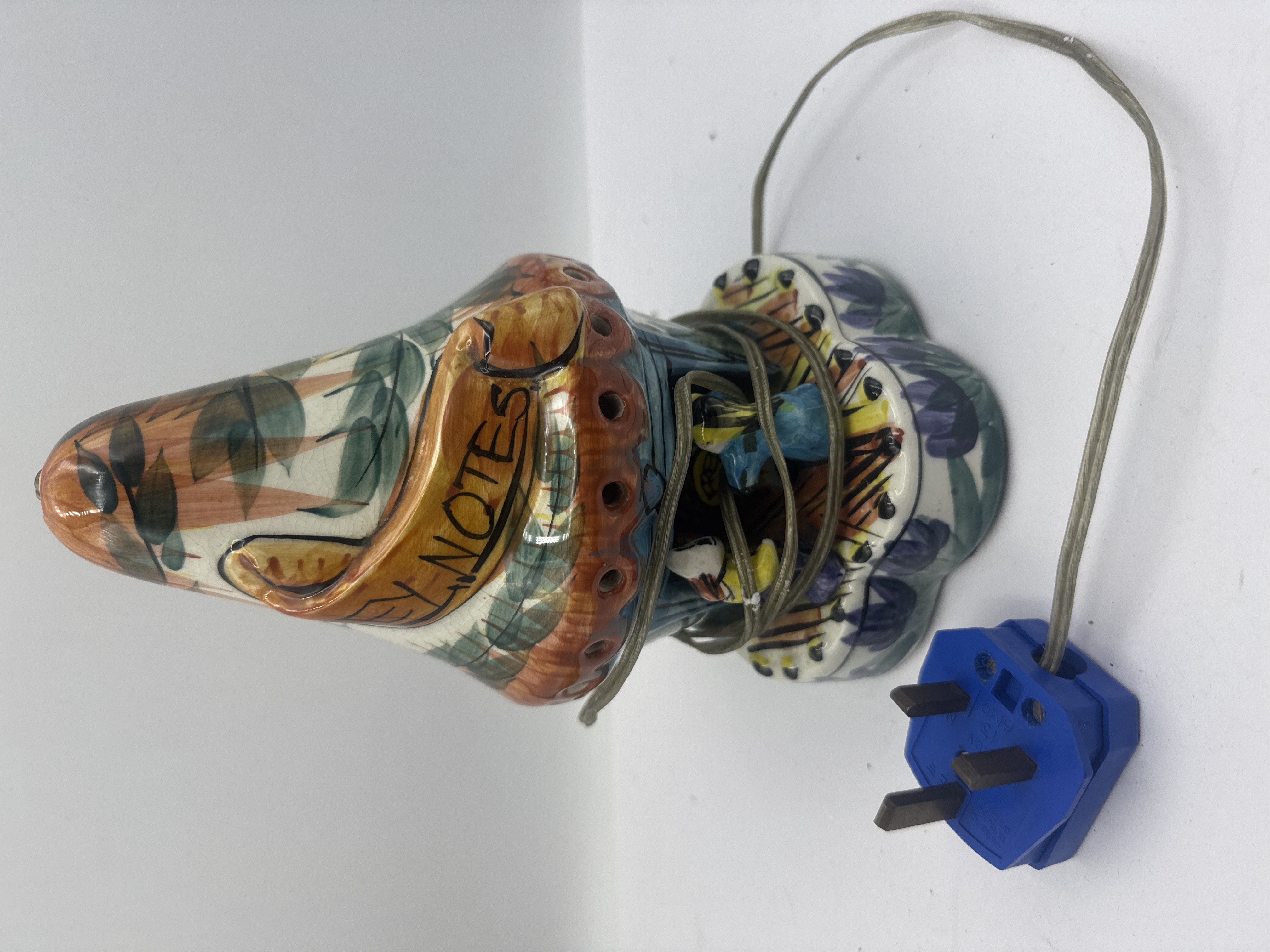 A hand-painted ceramic lamp base by Artesania La Menora, Spain. The piece features a tapered, mountain-like form standing 8 inches tall, set upon a lobed base. It is finished in vibrant, multi-colored glazes with stylized foliate motifs. An arched aperture at the front reveals a group of small, colorful bird figurines nestled inside. A hand-painted scroll detail on one side is inscribed with the word ELNOTES. The lamp is equipped with a gray electrical lead terminating in a blue UK three-pin plug.