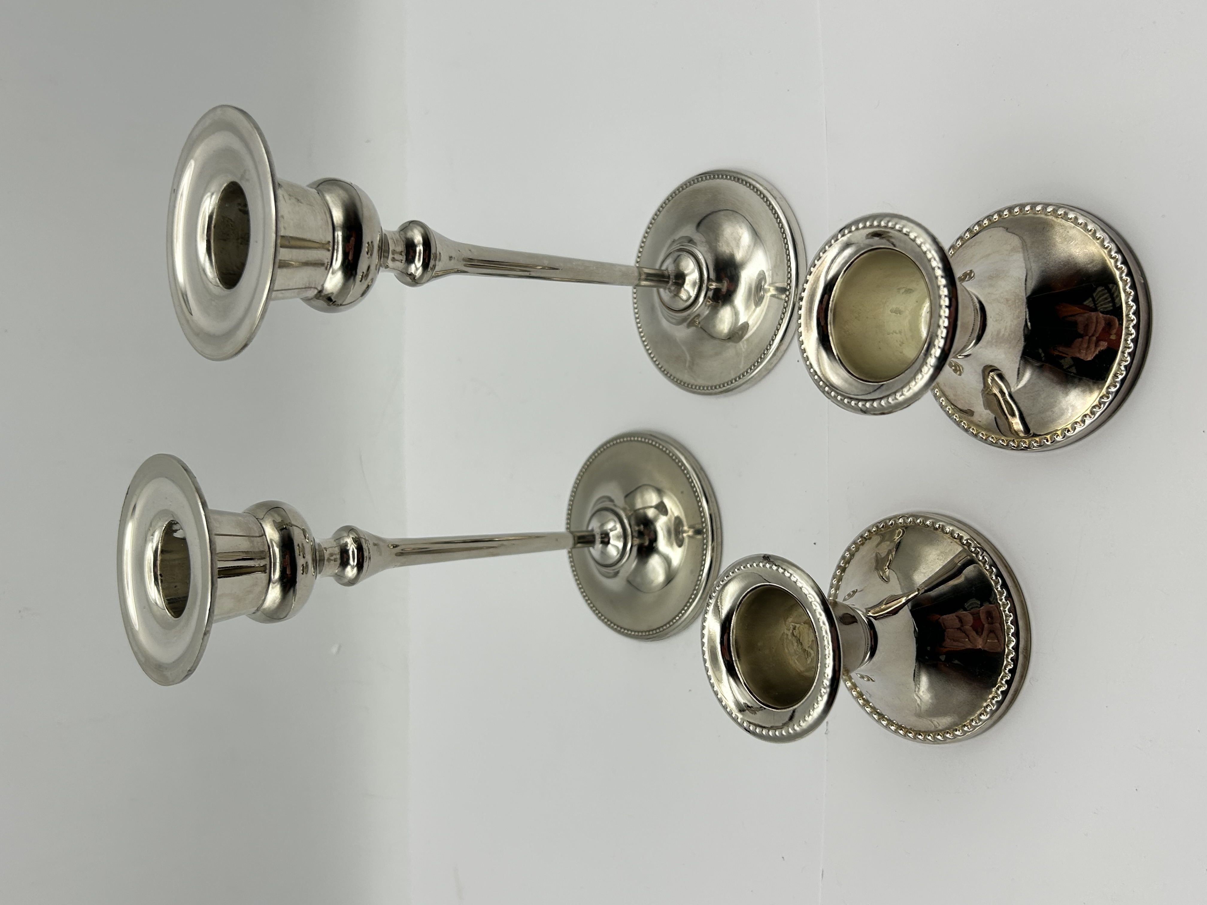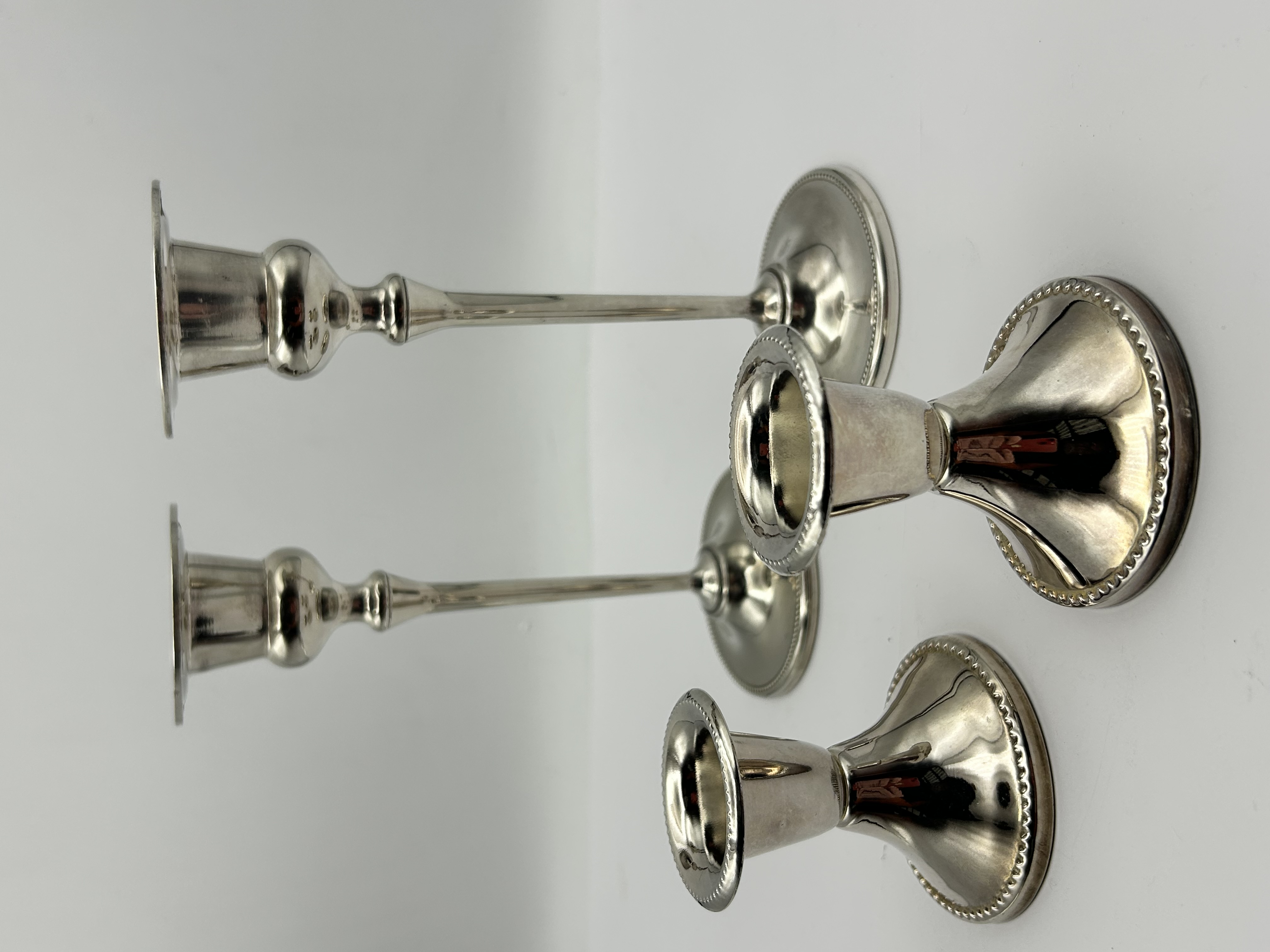A group of silver candlesticks, including a pair of Regency candlesticks, Sheffield. The taller pair features slender baluster-form stems rising from circular bases with beaded borders, a motif mirrored on the flared nozzles. Indistinct hallmarks are visible on the upper section of the stems of this pair. The shorter pair features flared, conical bases with beaded rims supporting wide, similarly decorated nozzles. Both pairs are constructed from silver-toned metal with beaded decorative elements.