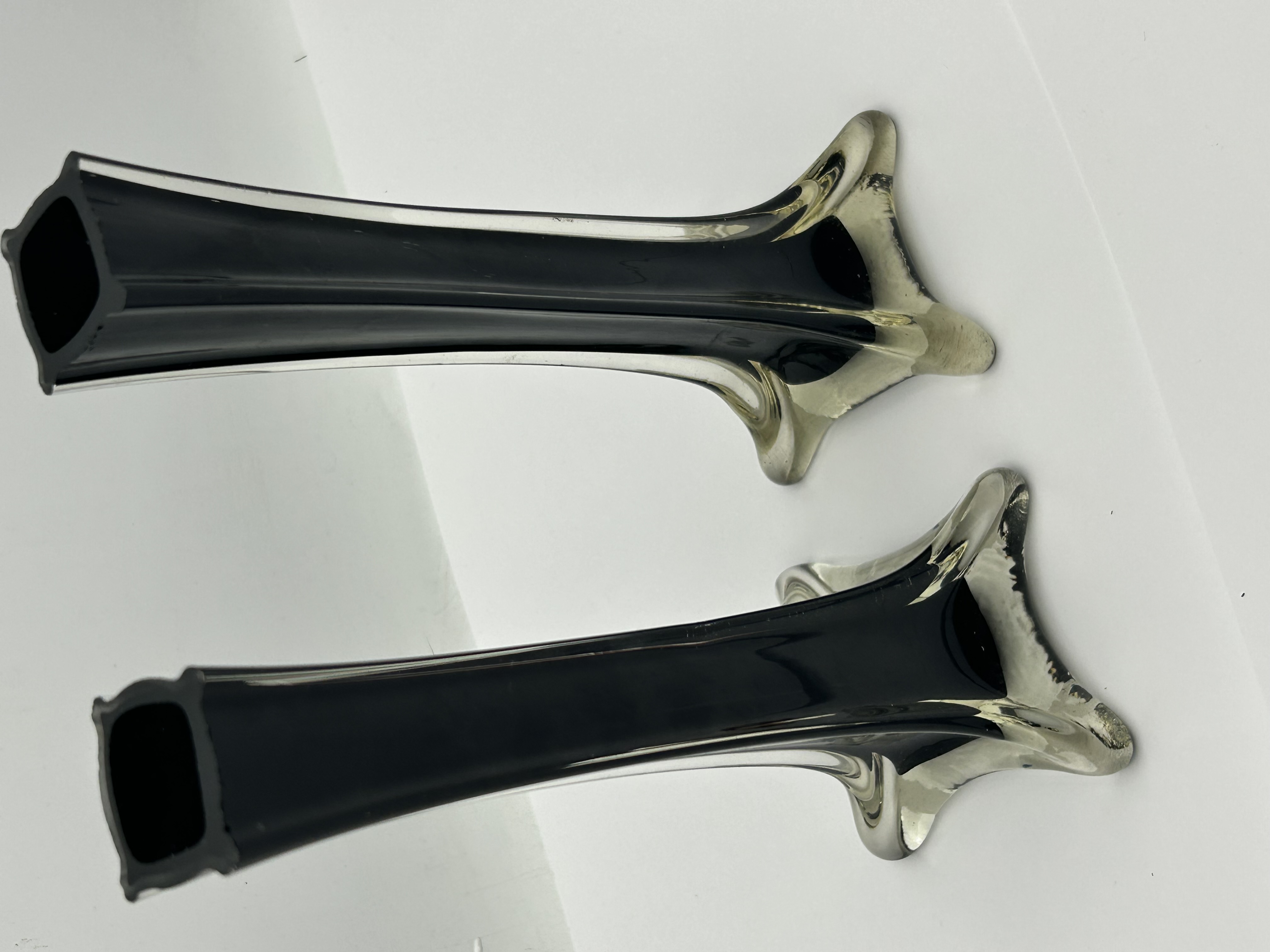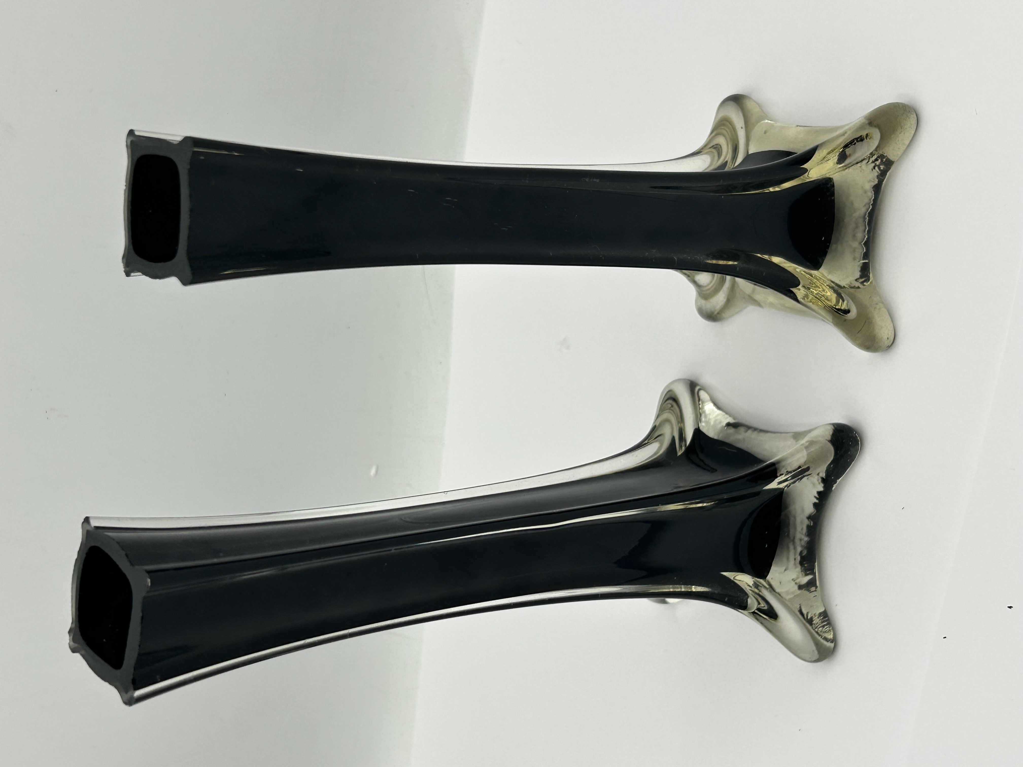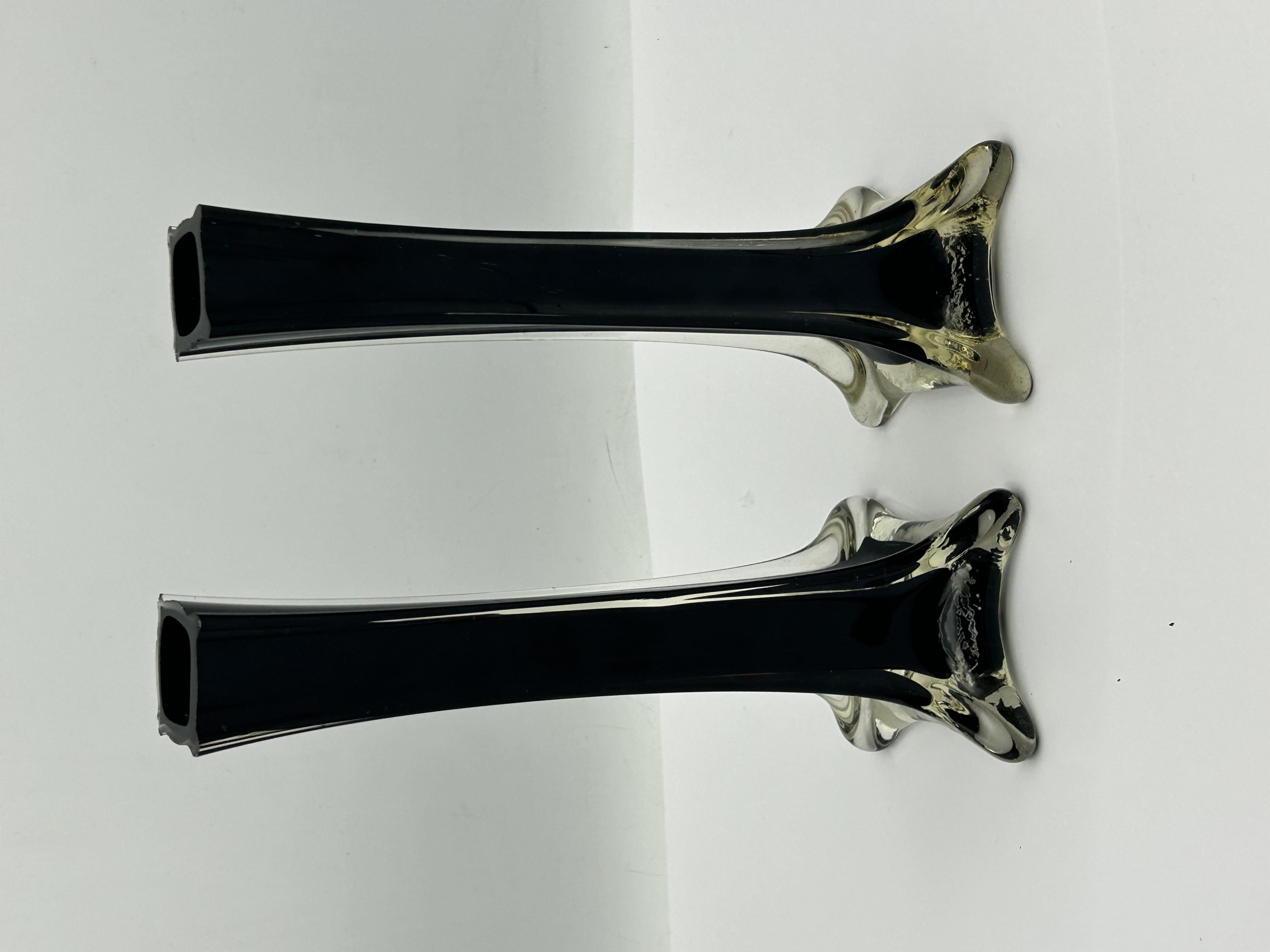A pair of Eiffel Tower style glass vases featuring a tall, slender, square-profile body. Each vase is constructed of thick-walled cased glass with an opaque black interior encased within a clear glass exterior. The form tapers from the rim down to a flared, four-lobed star-shaped foot. The pieces are unsigned and do not bear any maker marks or labels.