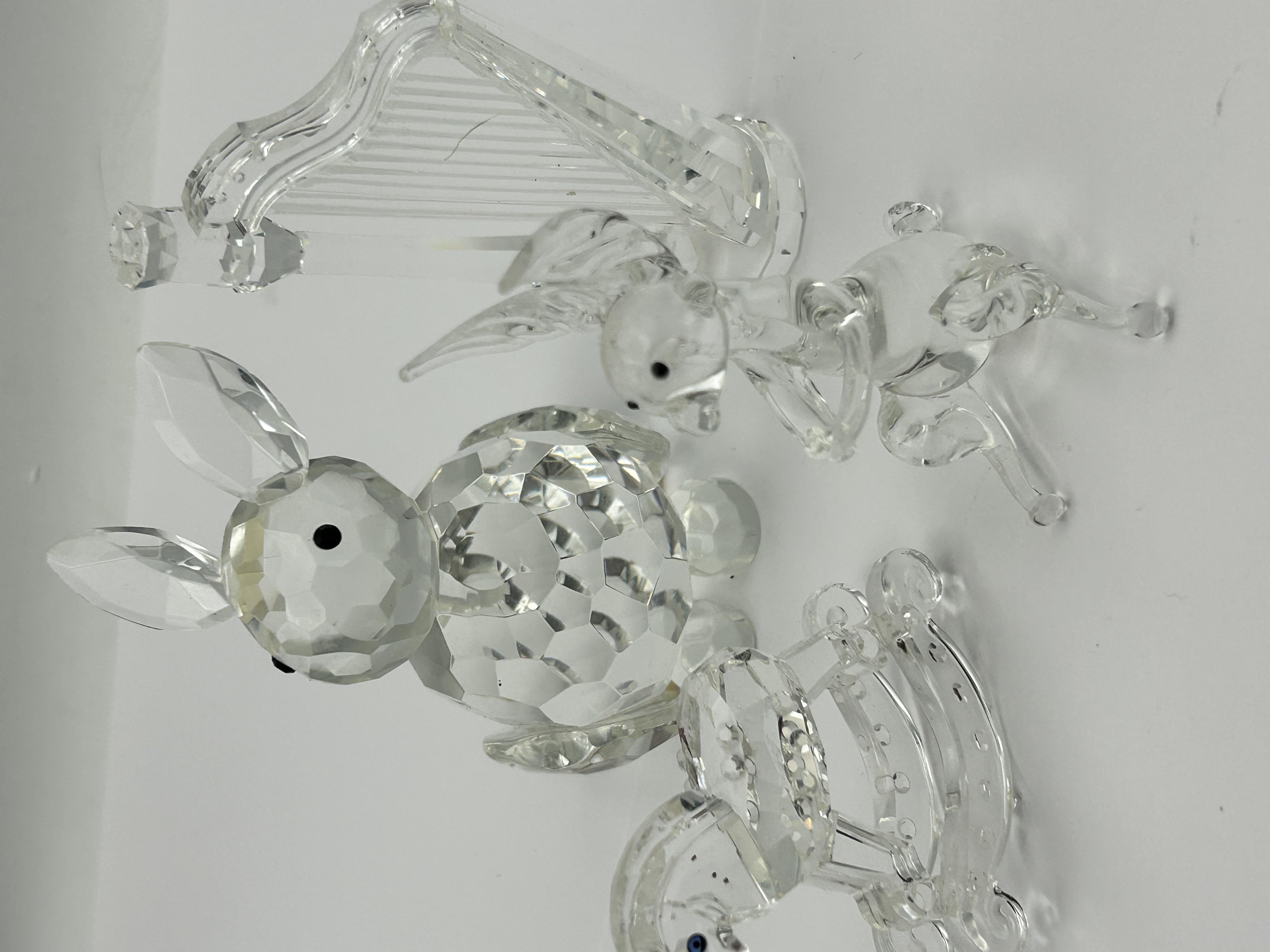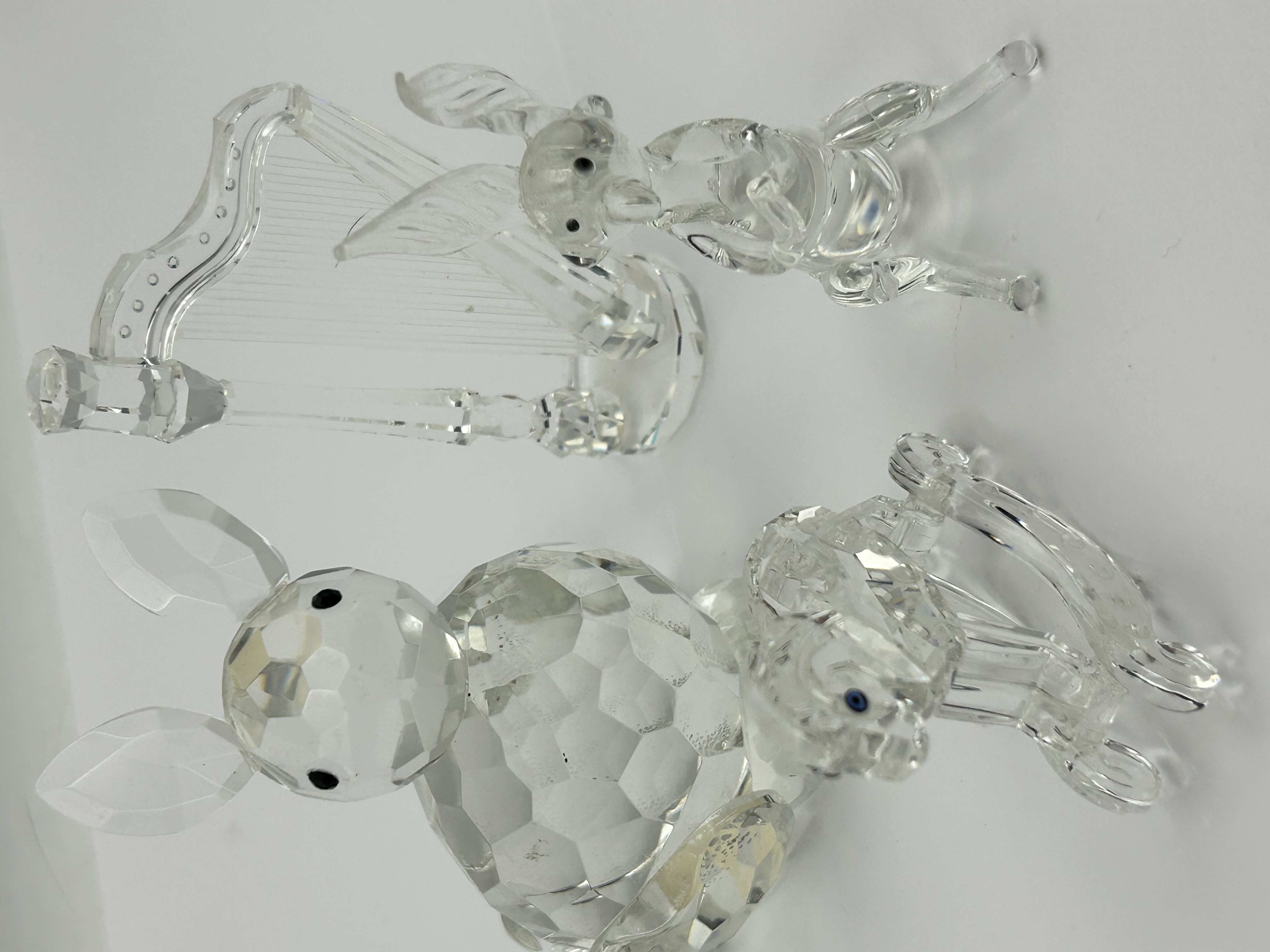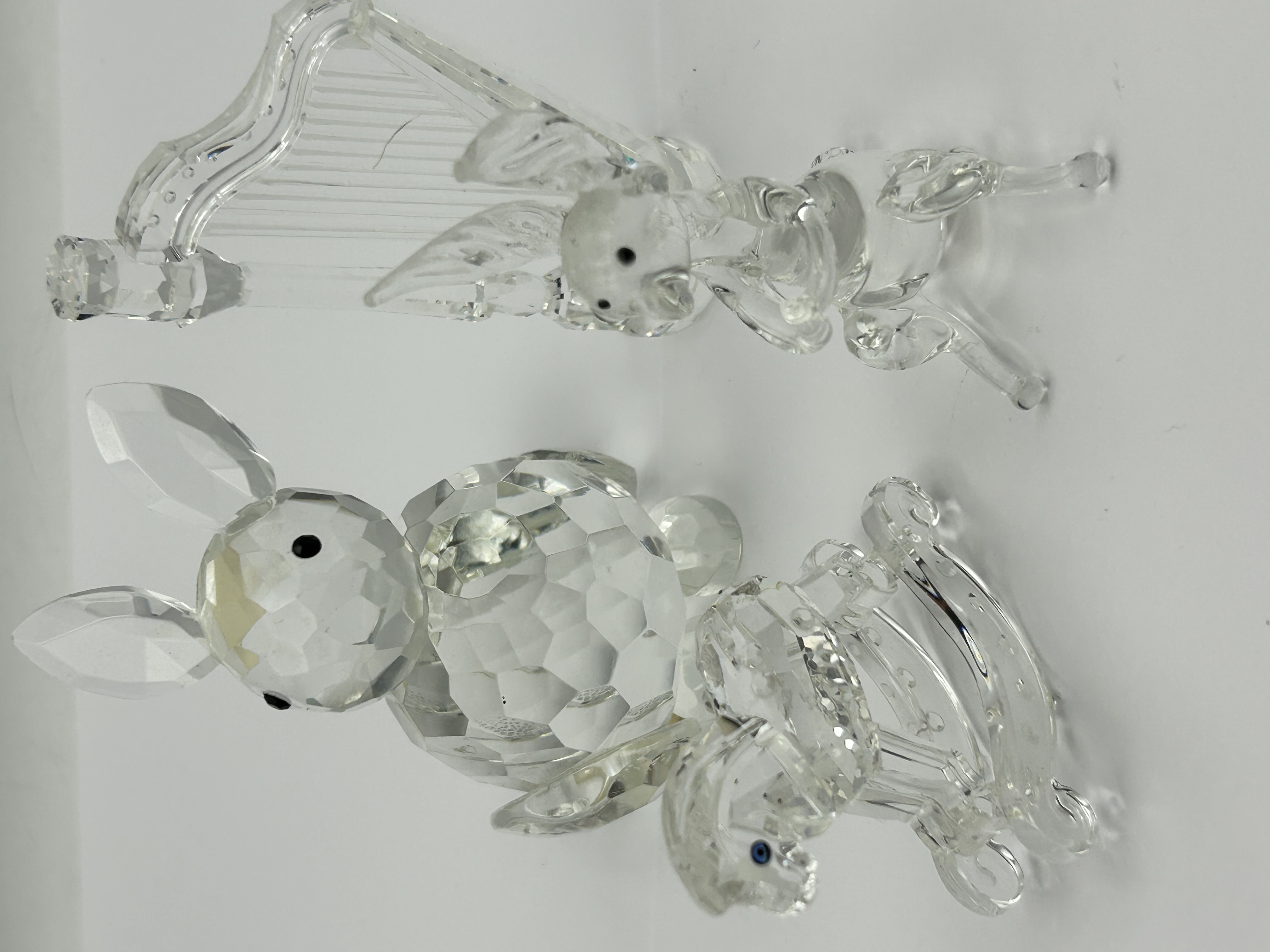 Four Swarovski faceted lead crystal figurines. The collection includes a large seated squirrel with long ears and black inset eyes, a rocking horse with blue inset eyes, and a smaller animal figure positioned behind a harp featuring etched strings. Each piece is constructed from clear, high-refractive crystal with precision-cut facets. No visible maker marks or signatures are present on the items.