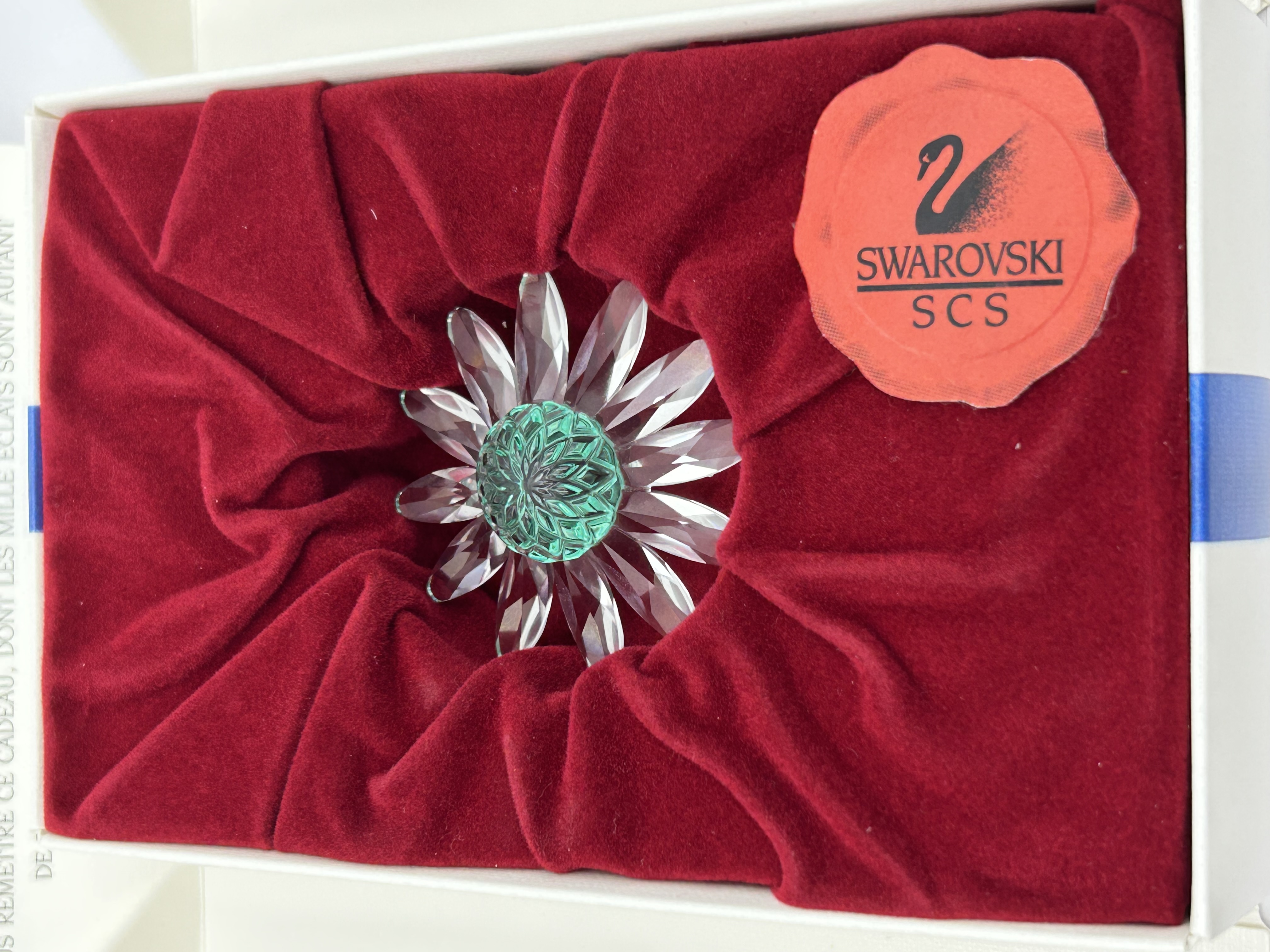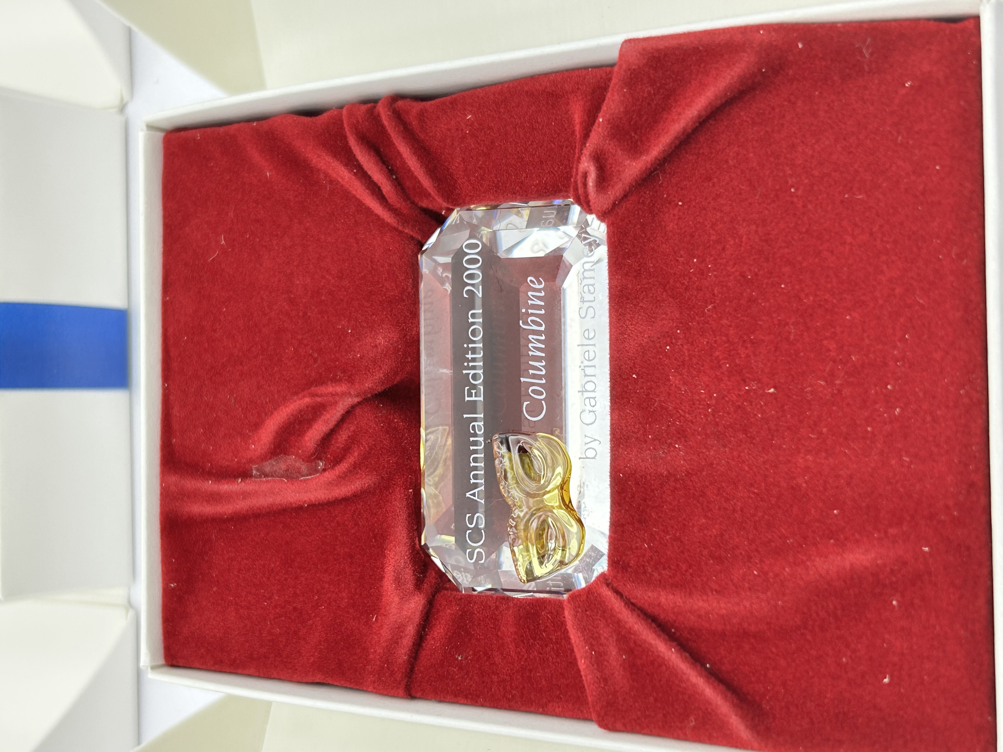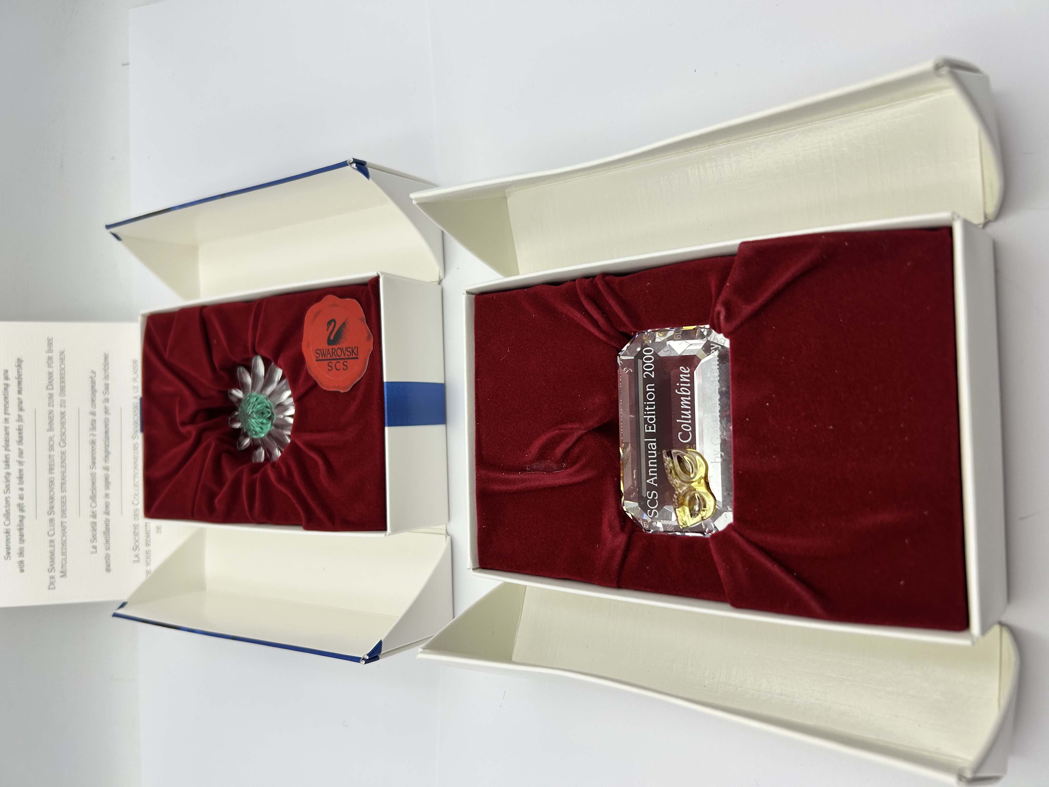 A pair of Swarovski Crystal Society (SCS) collectibles. The first item is a faceted clear crystal commemorative plaque for the SCS Annual Edition 2000, titled Columbine. It features etched text reading SCS Annual Edition 2000, Columbine, and by Gabriele Stamey, accented with an applied yellow crystal mask. The second item is a Marguerite daisy flower figurine featuring clear crystal petals and a multi-faceted green crystal center. Both pieces are housed in their original white presentation boxes with red velvet-lined inserts. The lot includes a red Swarovski SCS swan logo sticker and membership-related ephemera in English, German, and French.