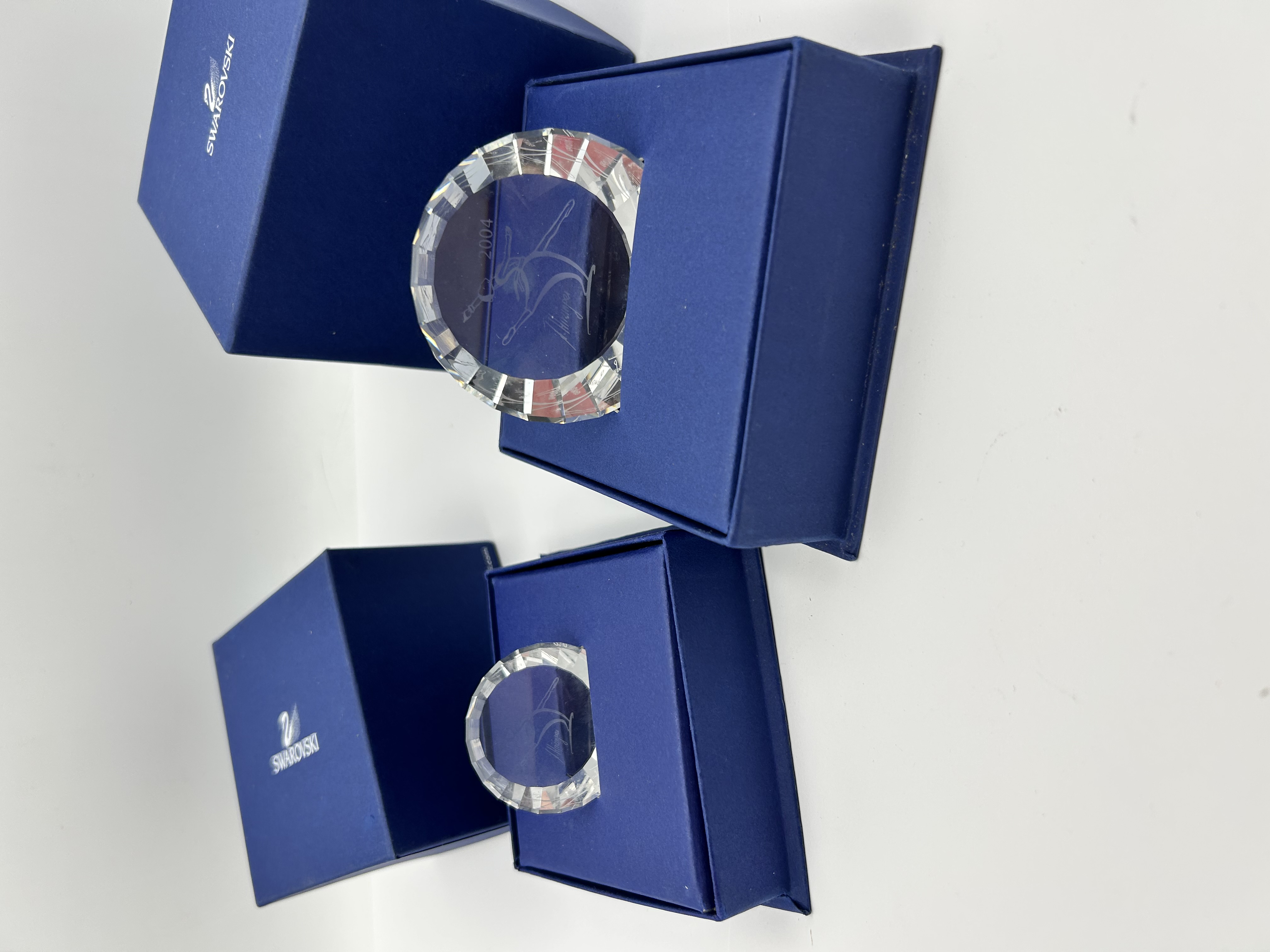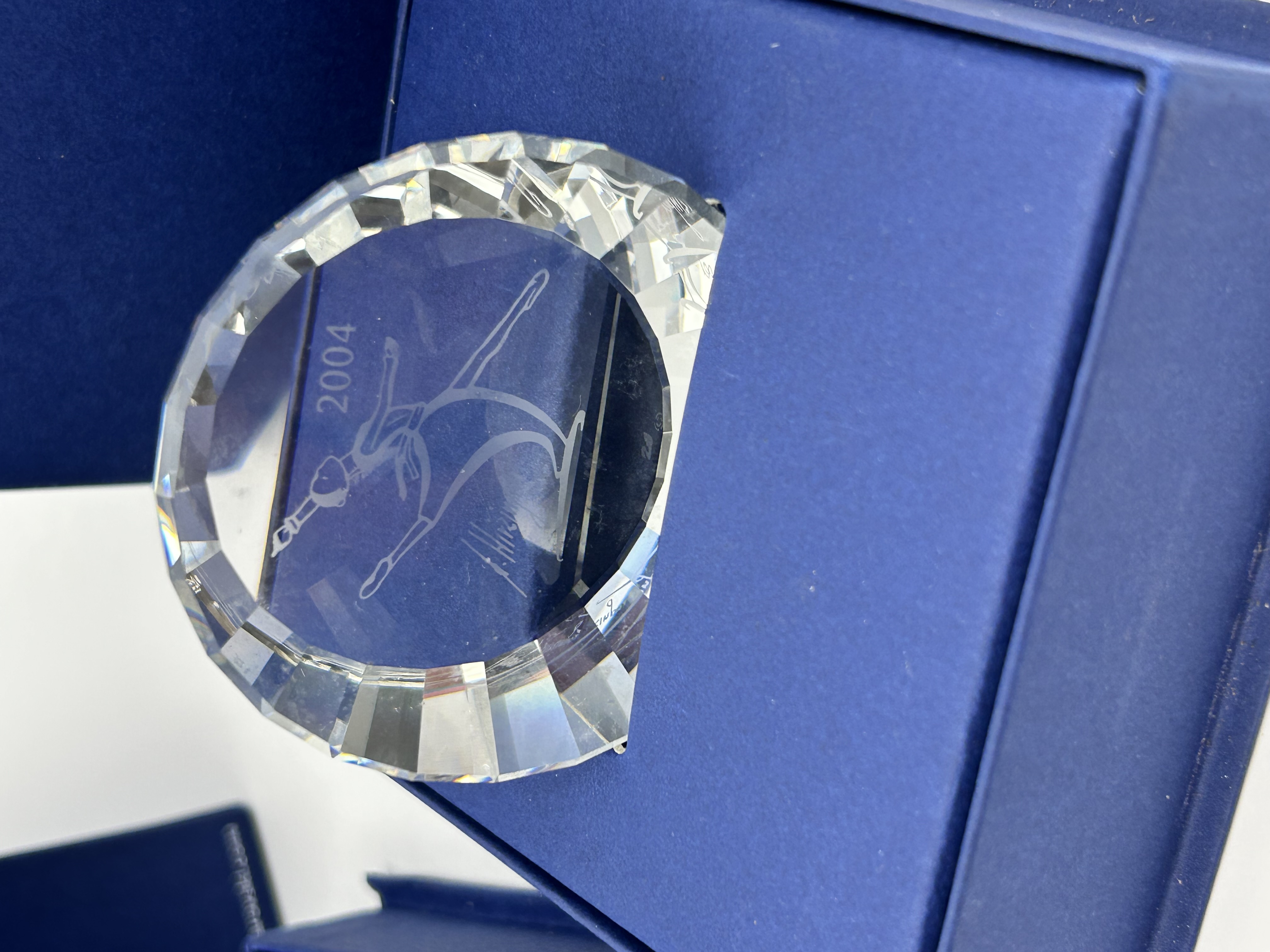 Two Swarovski Crystal Society (SCS) paperweights from the 2004 Magic of Dance collection, featuring the Anna motif. These pieces are constructed from clear crystal with precision-cut faceted edges. Each plaque displays an etched ballerina figure. One plaque is marked with the year 2004 and includes the etched signature of designer Anton Hirzinger. Both items are housed in their original blue Swarovski branded presentation boxes with protective foam inserts.