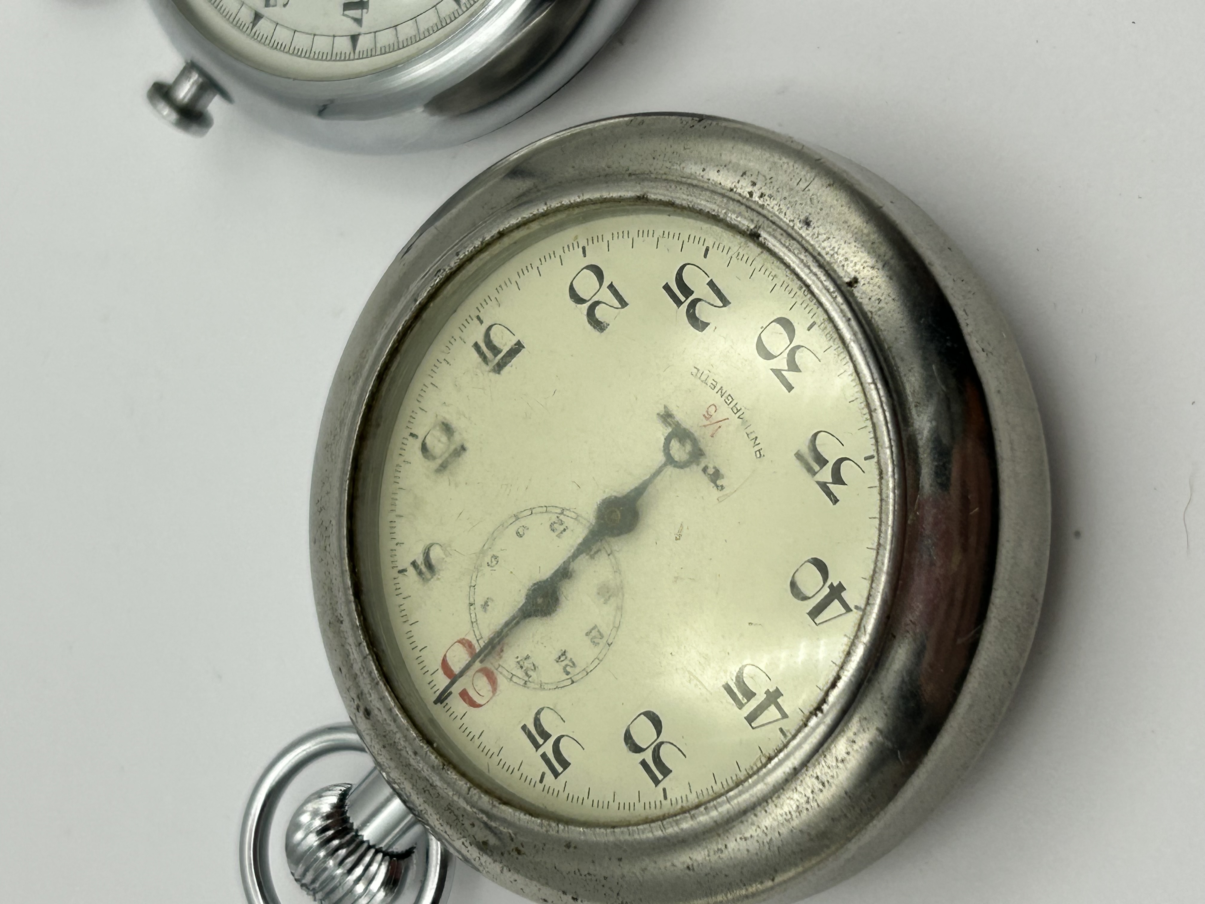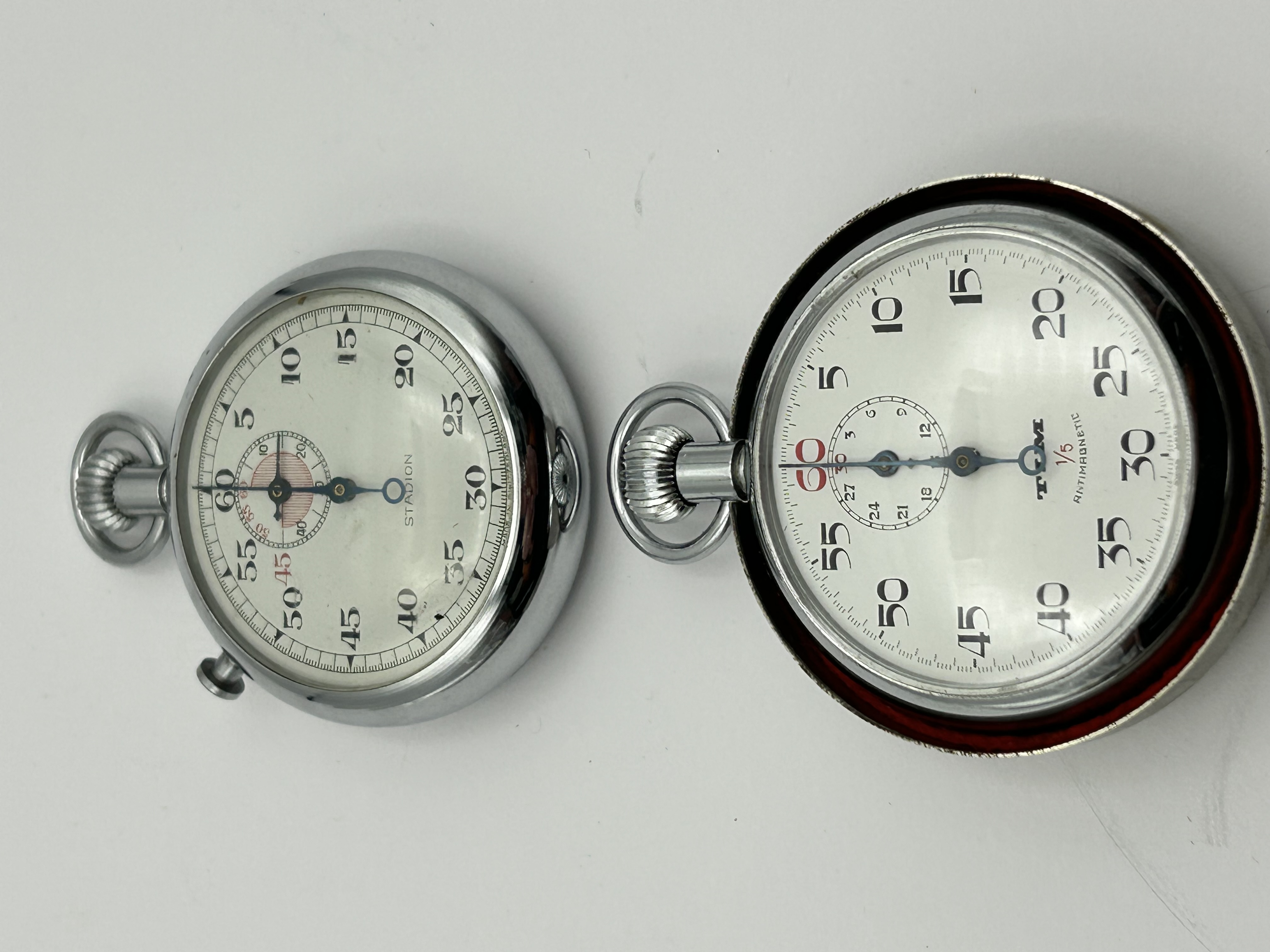 A pair of vintage mechanical stopwatches featuring chrome-plated or nickel-finished metal cases. One unit is marked Stadion on the white dial, which includes a 60-second outer track and a sub-dial featuring red detailing. The second unit bears a Tim logo and is marked 1/5 Antimagnetic, with a red 60 at the top of the dial and a central minute-tracking sub-dial. Both instruments are constructed with top-mounted winders and integrated hanging loops. The cases exhibit a rounded form with snap-on backs.