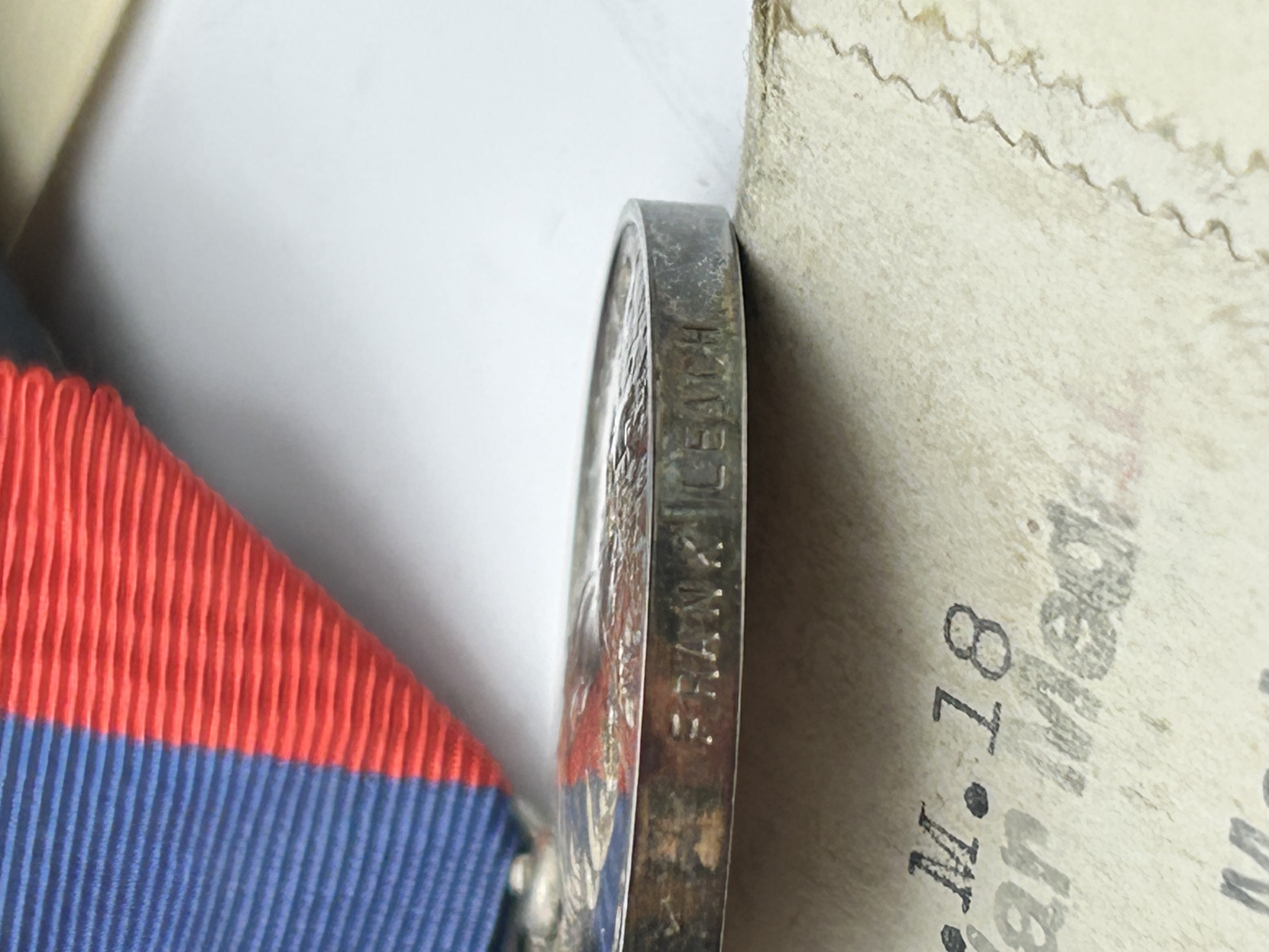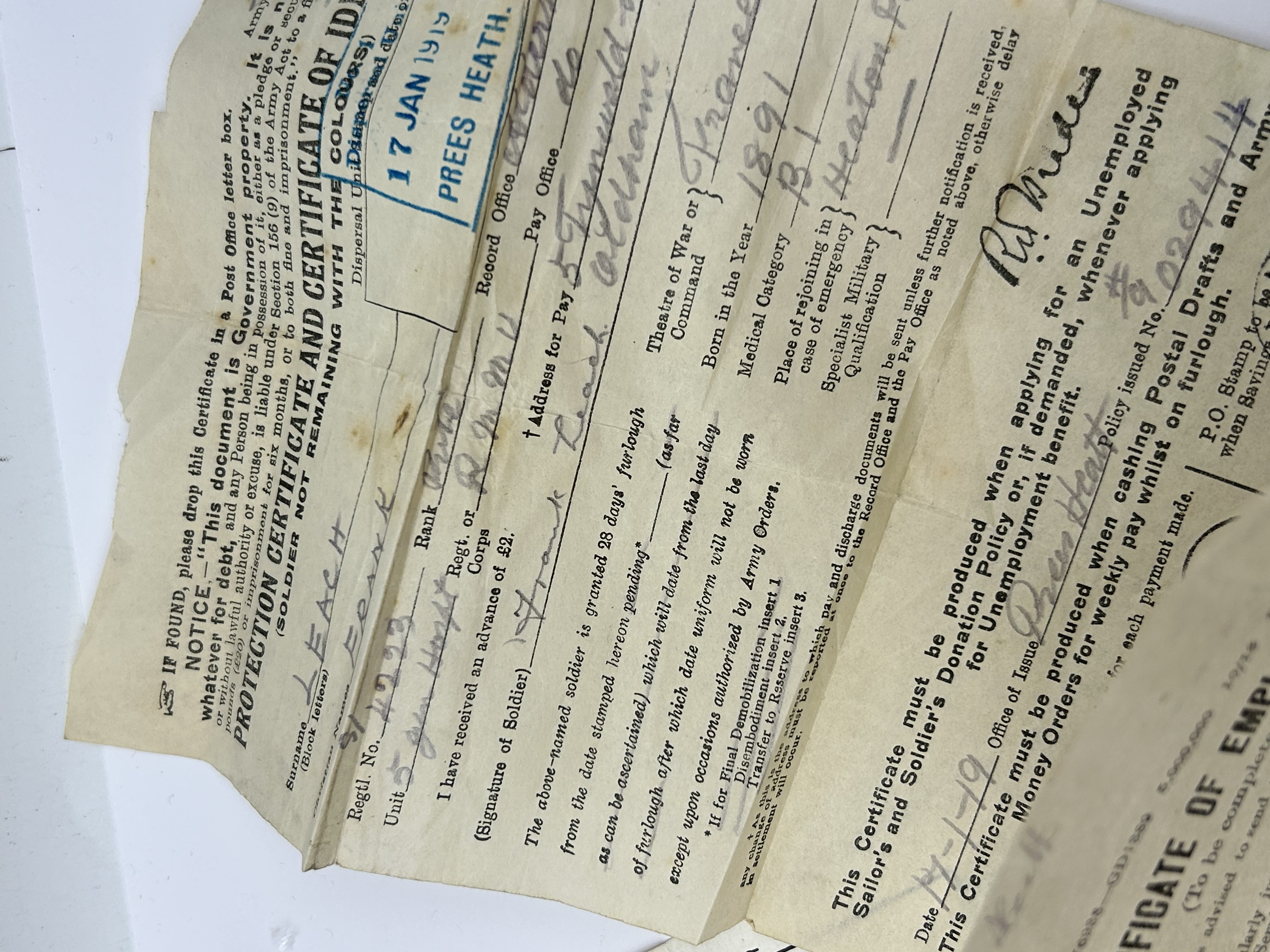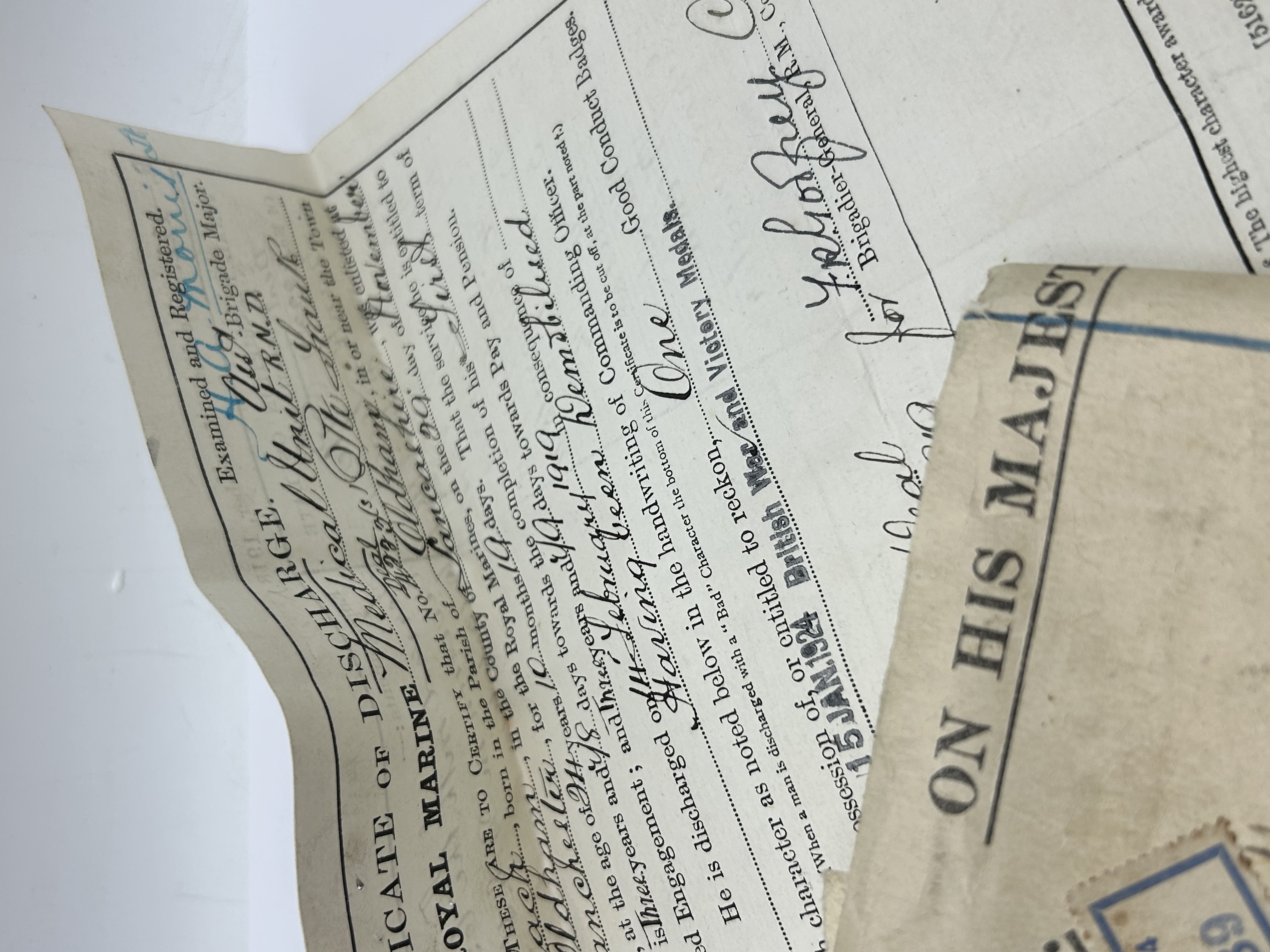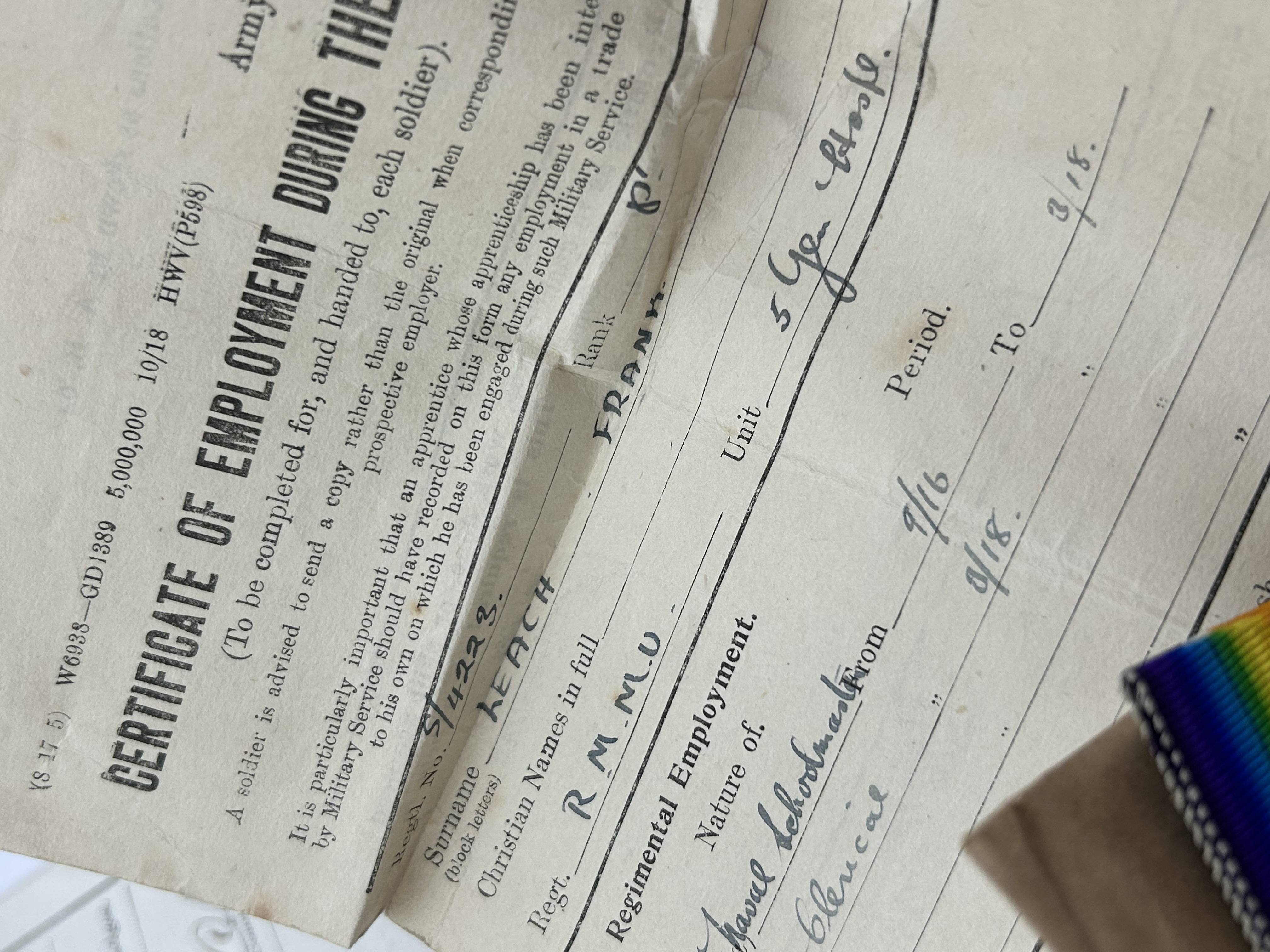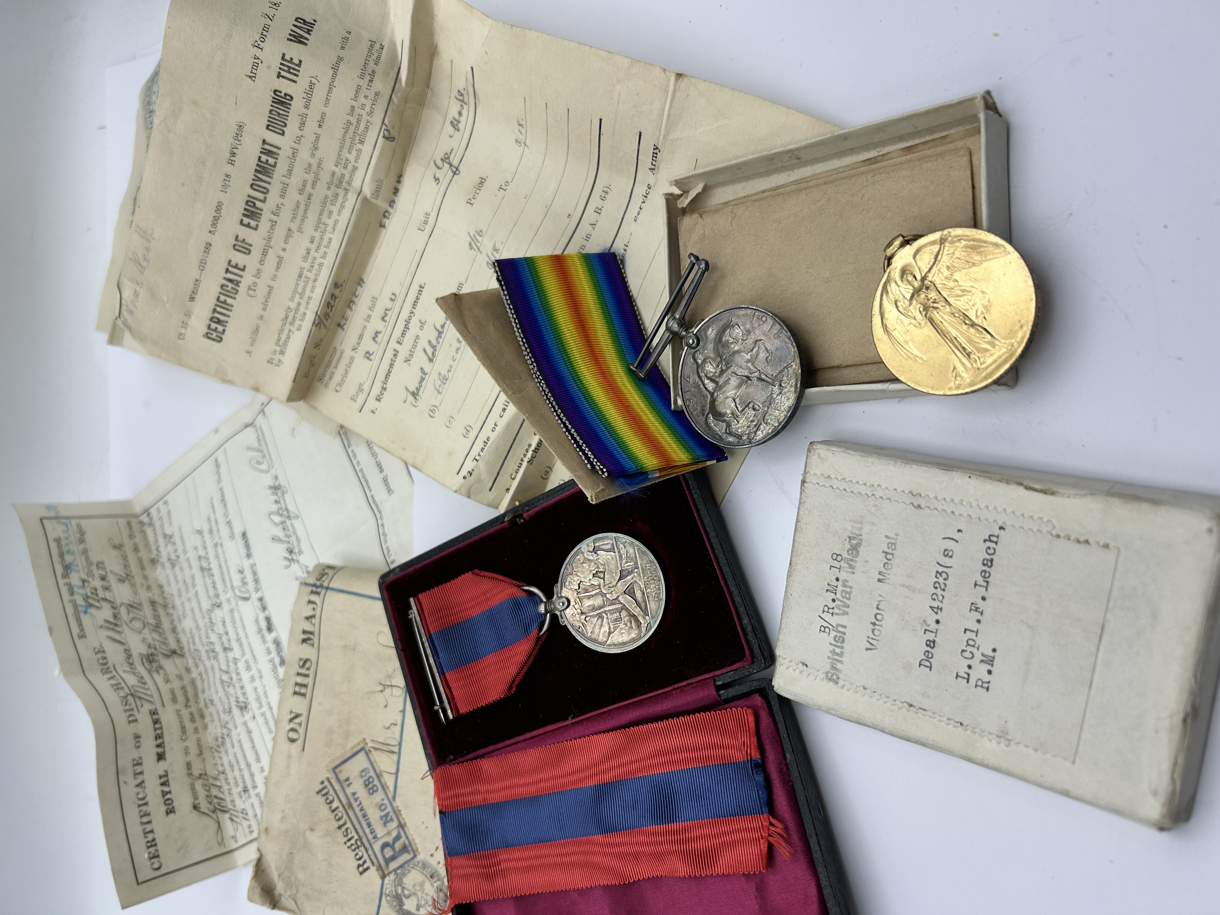 A collection of World War I British military medals and original service documents attributed to Lance Corporal Frank Leach of the Royal Marine Medical Unit (R.M.M.U.), service number Deal. 4223(S). The group includes a silver British War Medal, a bronze Victory Medal, and a silver-colored George V Imperial Service Medal. The Imperial Service Medal is housed in its original black presentation case with a red and blue striped ribbon. The collection is accompanied by several original paper documents, including a 1919 Certificate of Discharge from the Royal Marines, a Protection Certificate and Certificate of Identity, and a Certificate of Employment during the war. Also present is the original cardboard mailing box addressed to L. Cpl. F. Leach. The medals feature impressed naming on the rims corresponding to the recipient.