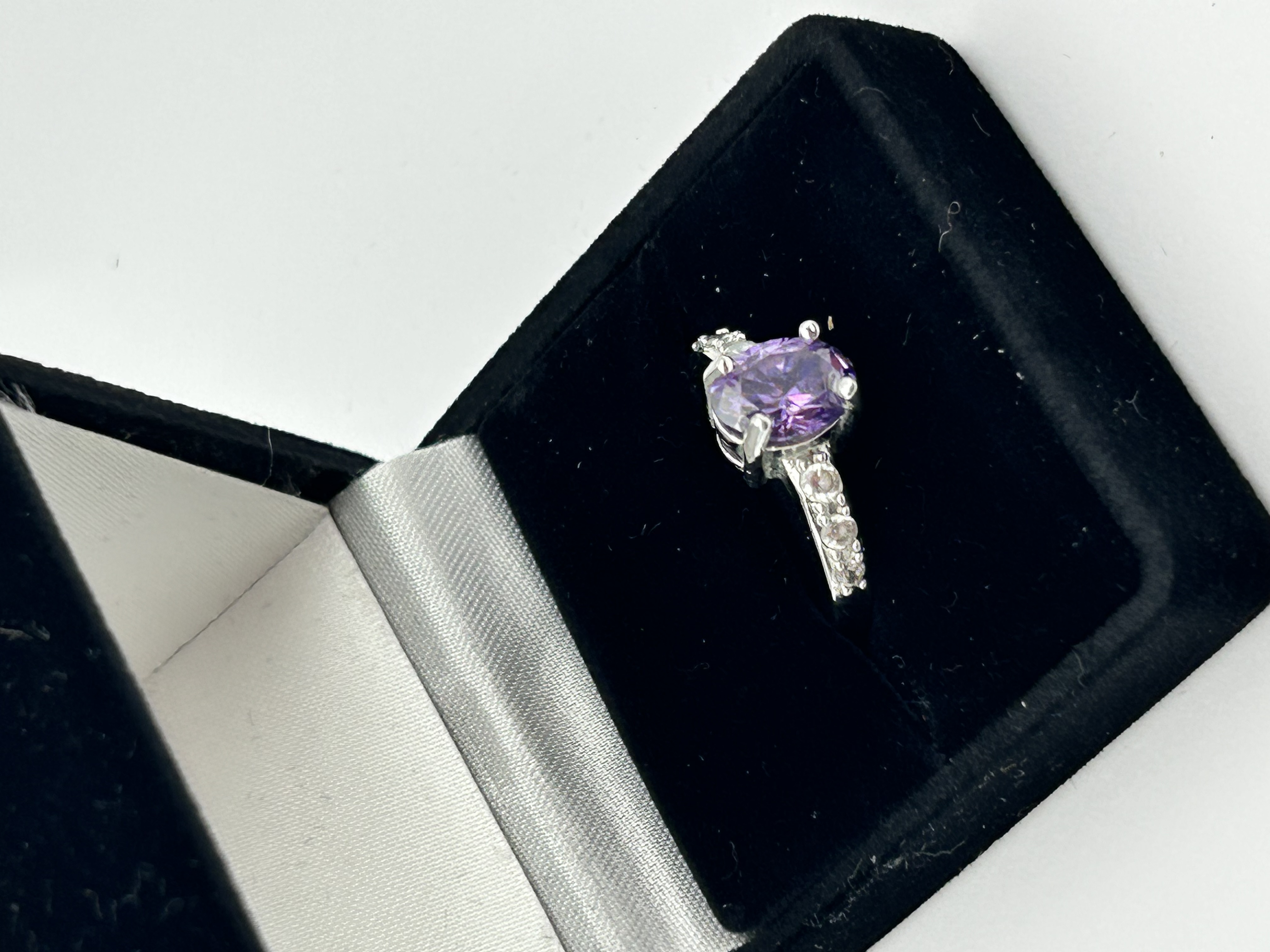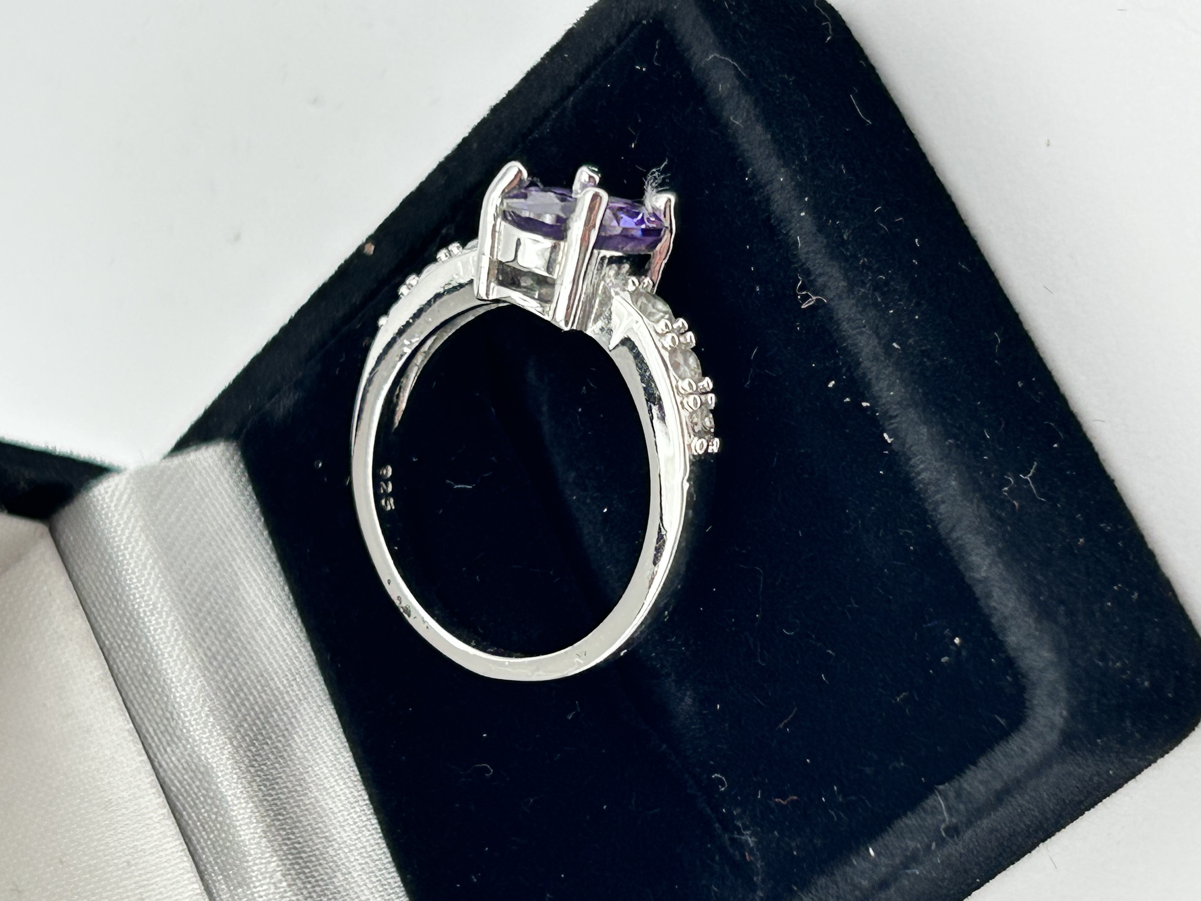 A contemporary sterling silver dress ring featuring a central oval-cut purple gemstone, identified as an amethyst. The stone is secured in a four-prong raised basket setting. The shank is accented on each shoulder with a series of small, round, clear stones. The inner shank is stamped with a 925 hallmark, indicating sterling silver composition. The ring is presented in a black velvet-lined jewelry box.