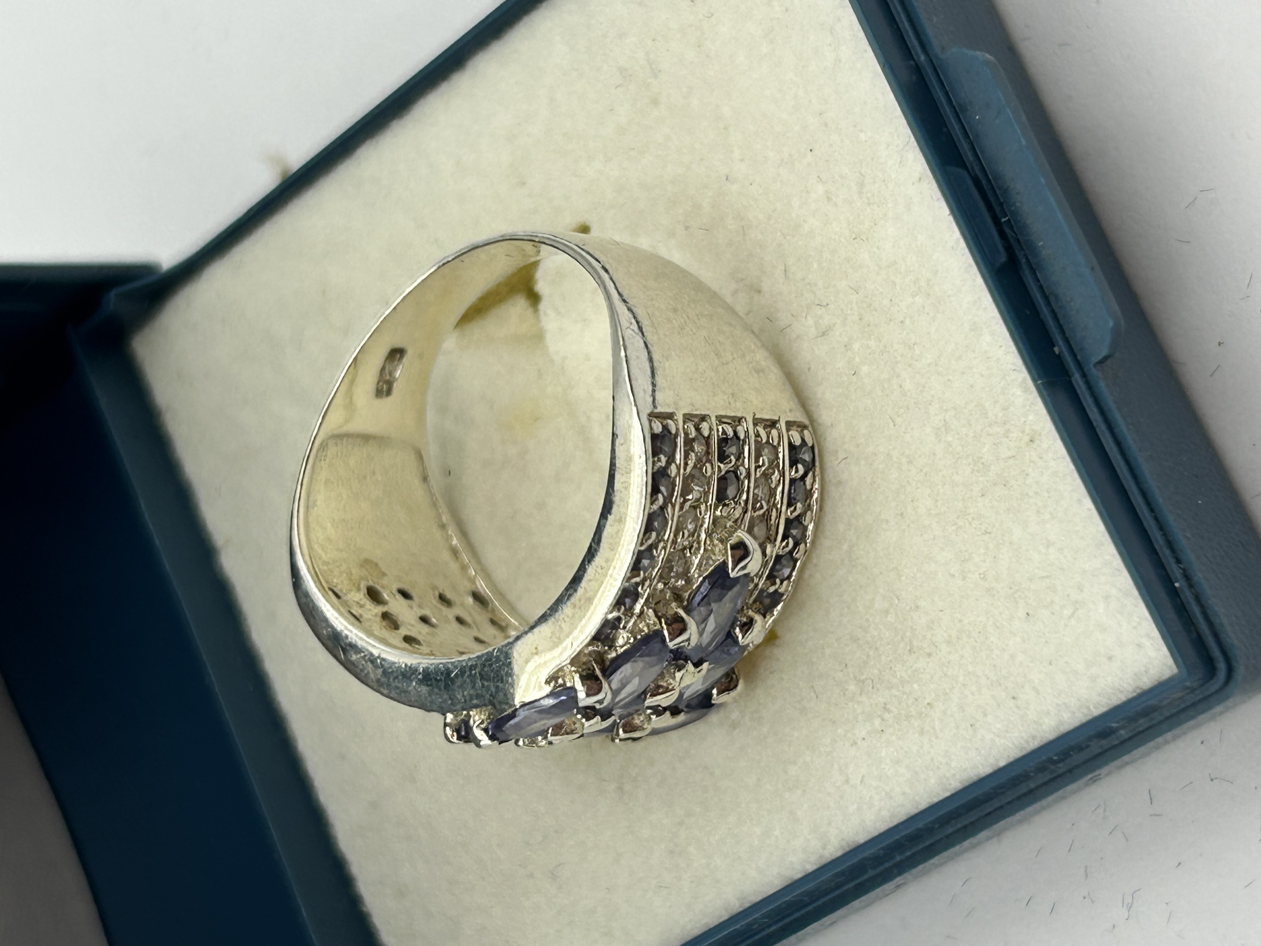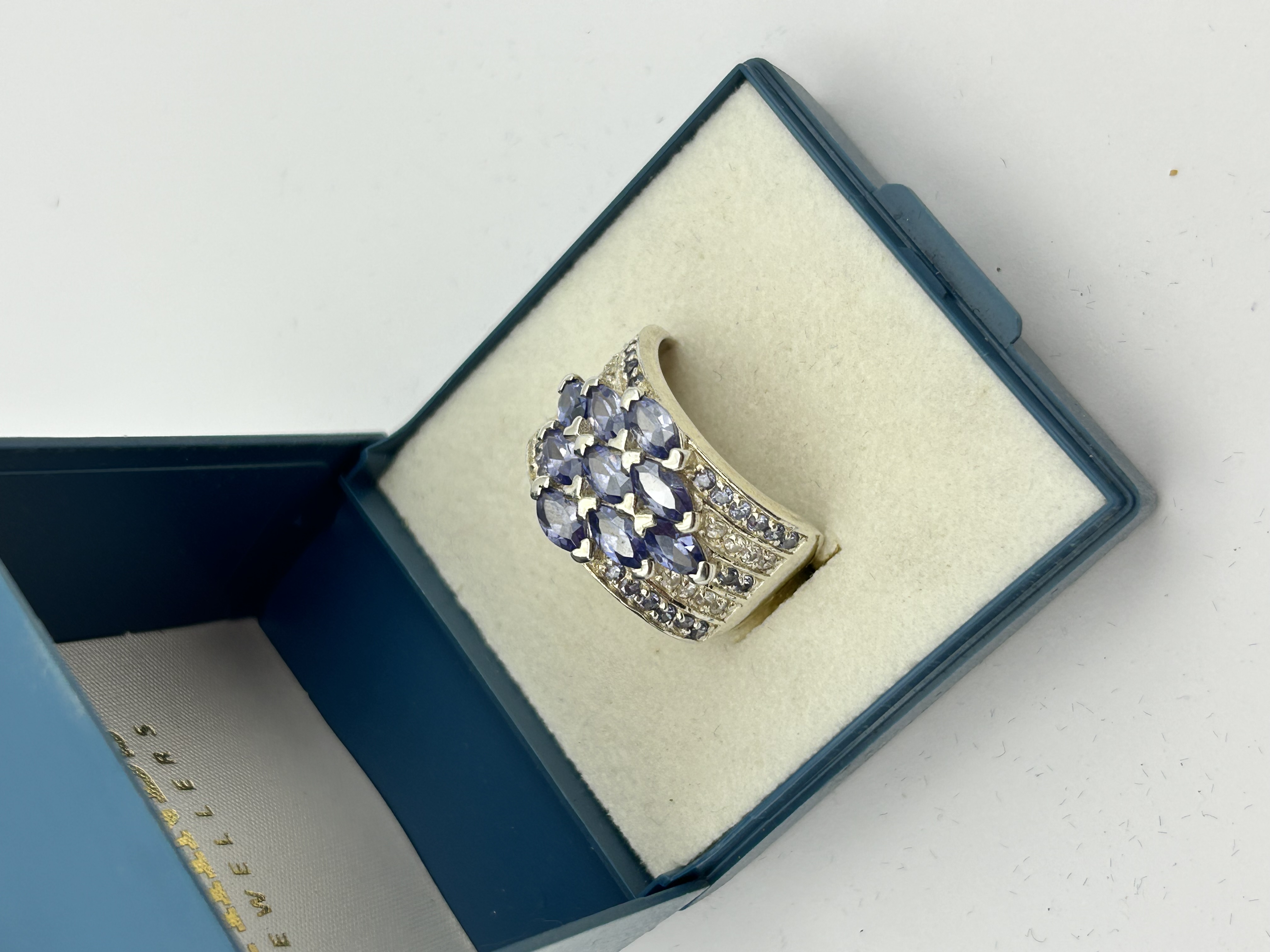 A contemporary wide-band cocktail ring featuring a central cluster of marquise-cut tanzanite stones. The shoulders and band are further embellished with multiple rows of small, round-cut lavender and clear accent stones. The ring is crafted from sterling silver and features an indistinct hallmark on the interior of the band. The item is presented in a blue velvet-lined jewelry box with the word JEWELLERS visible on the interior lid.