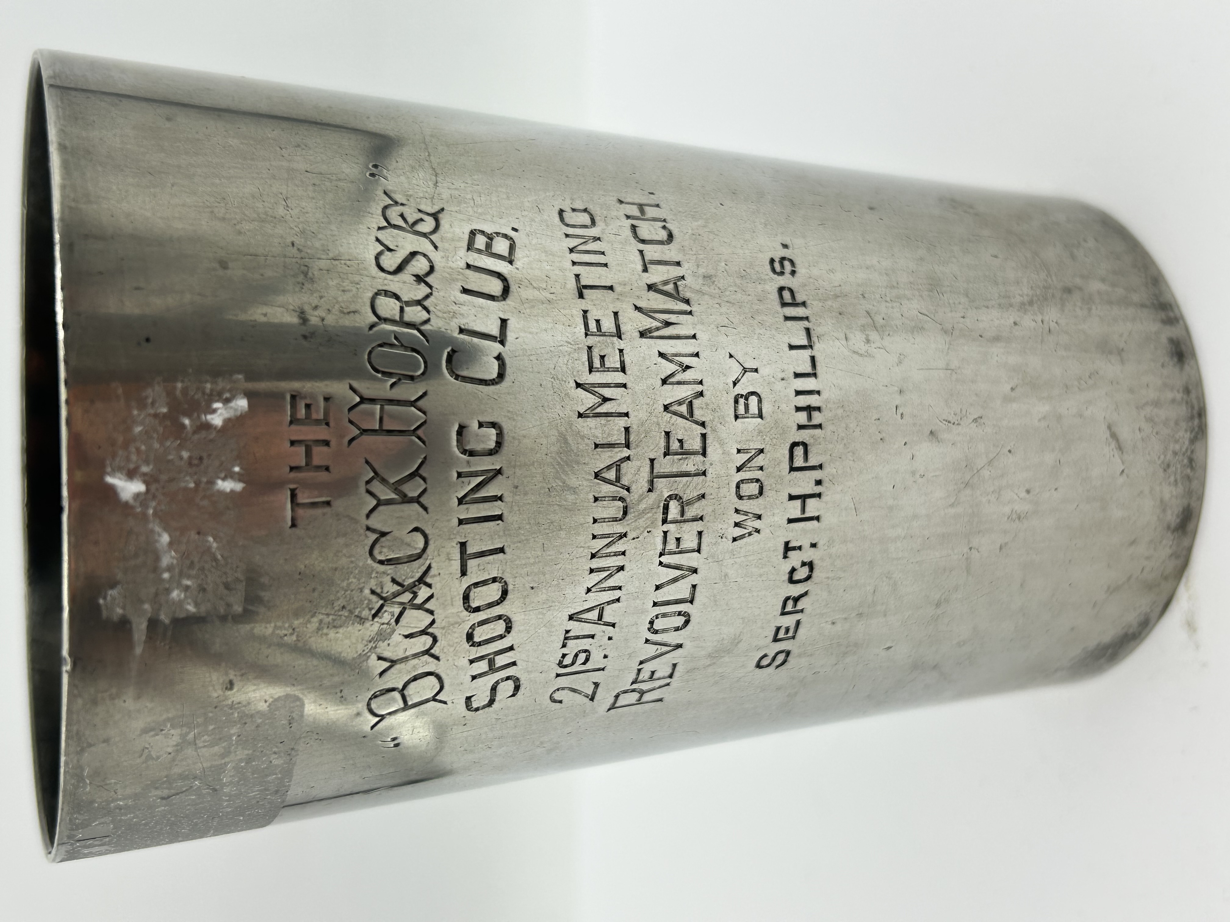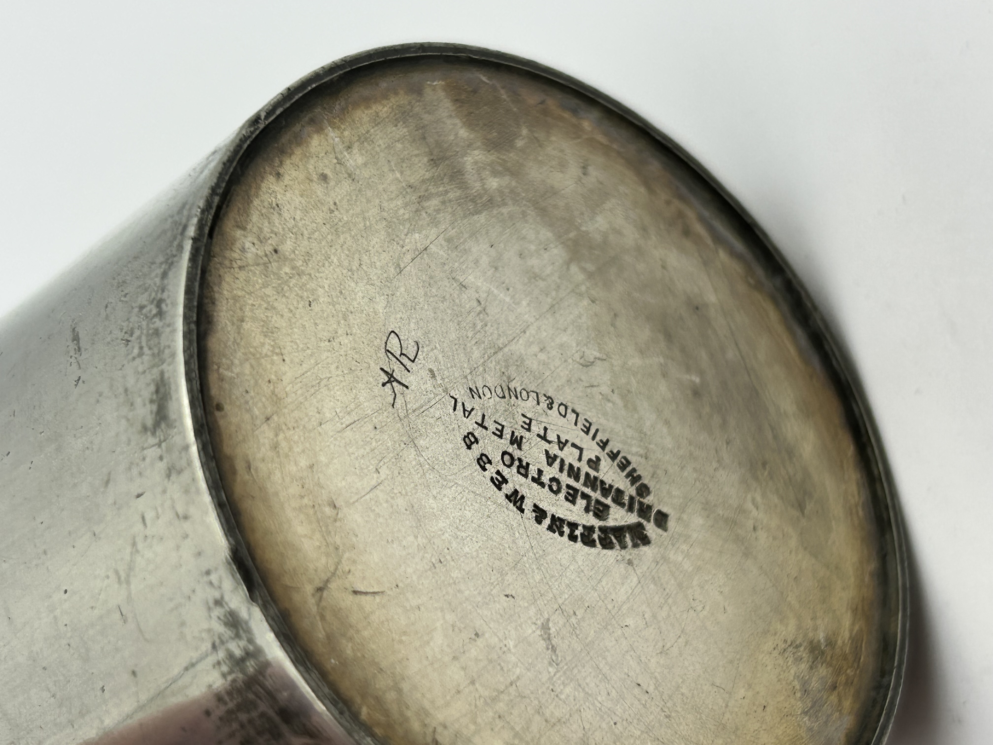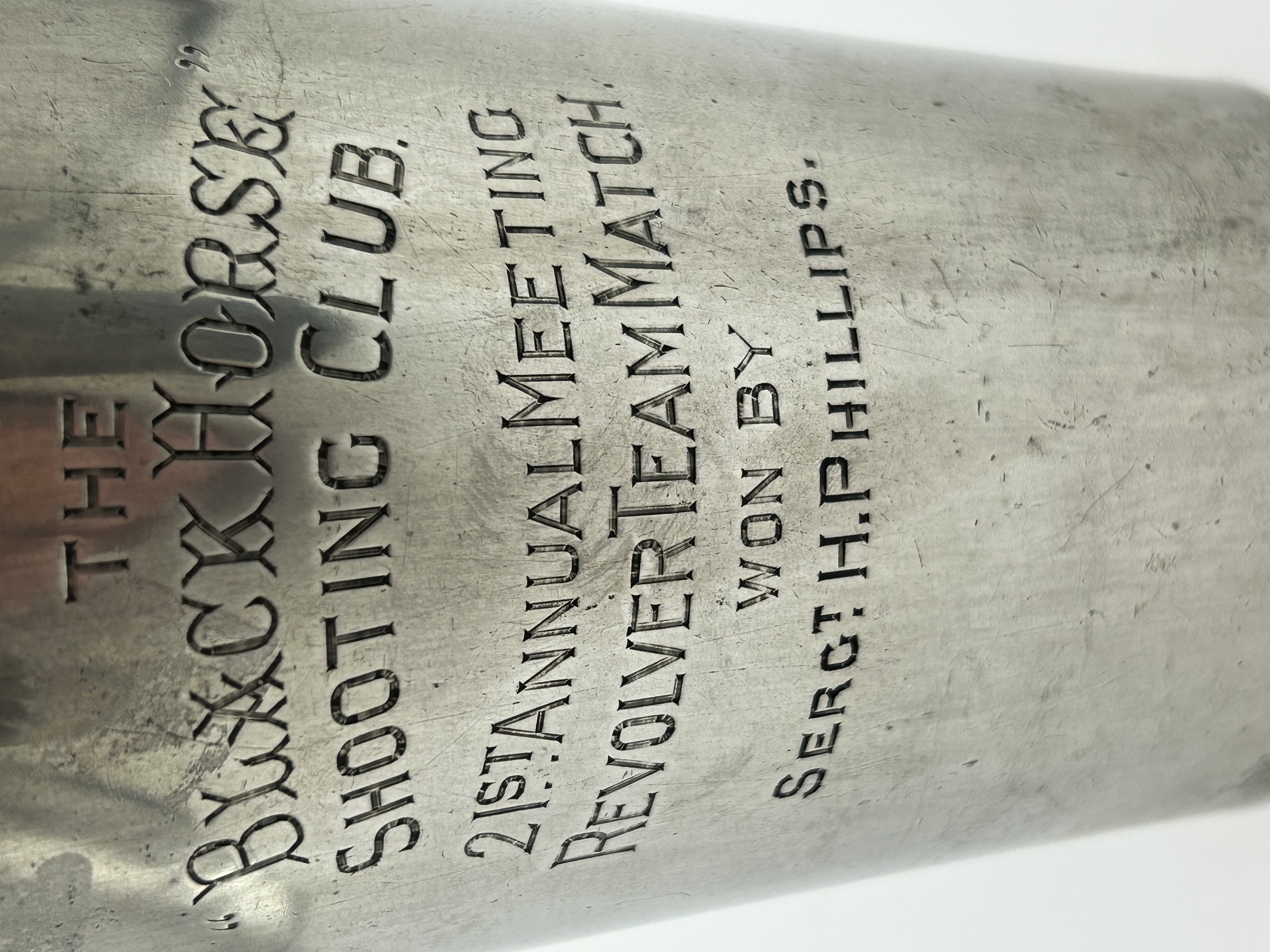 A silver plated Britannia metal presentation beaker of cylindrical form manufactured by Mappin and Webb. The body features a commemorative engraving reading THE ‘BLACK HORSE’ SHOOTING CLUB. 21ST ANNUAL MEETING REVOLVER TEAM MATCH WON BY Sergt. H. PHILLIPS. The underside is stamped with the maker mark MAPPIN & WEBB ELECTRO BRITANNIA METAL PLATE SHEFFIELD & LONDON and includes hand etched initials appearing as HR.