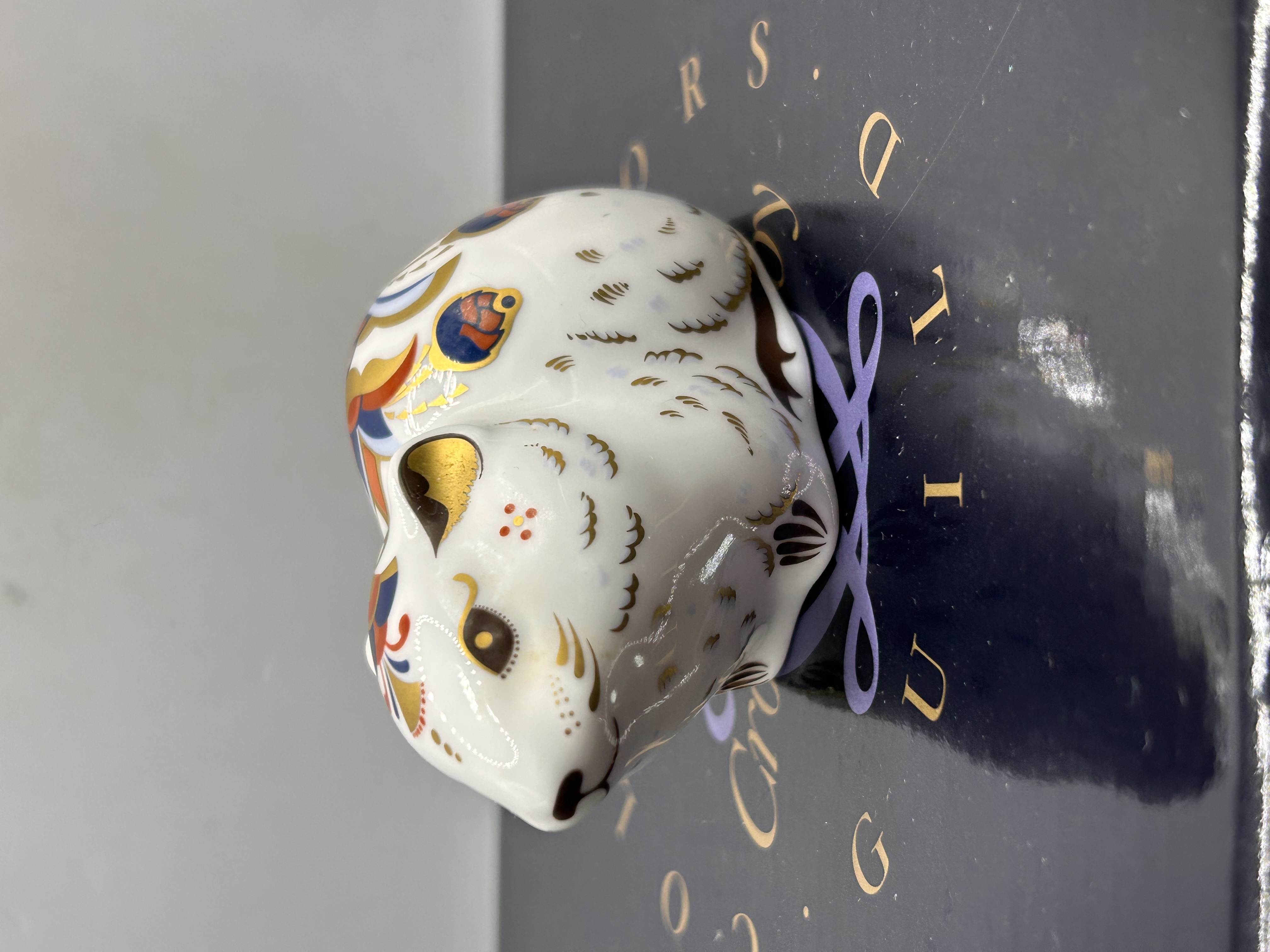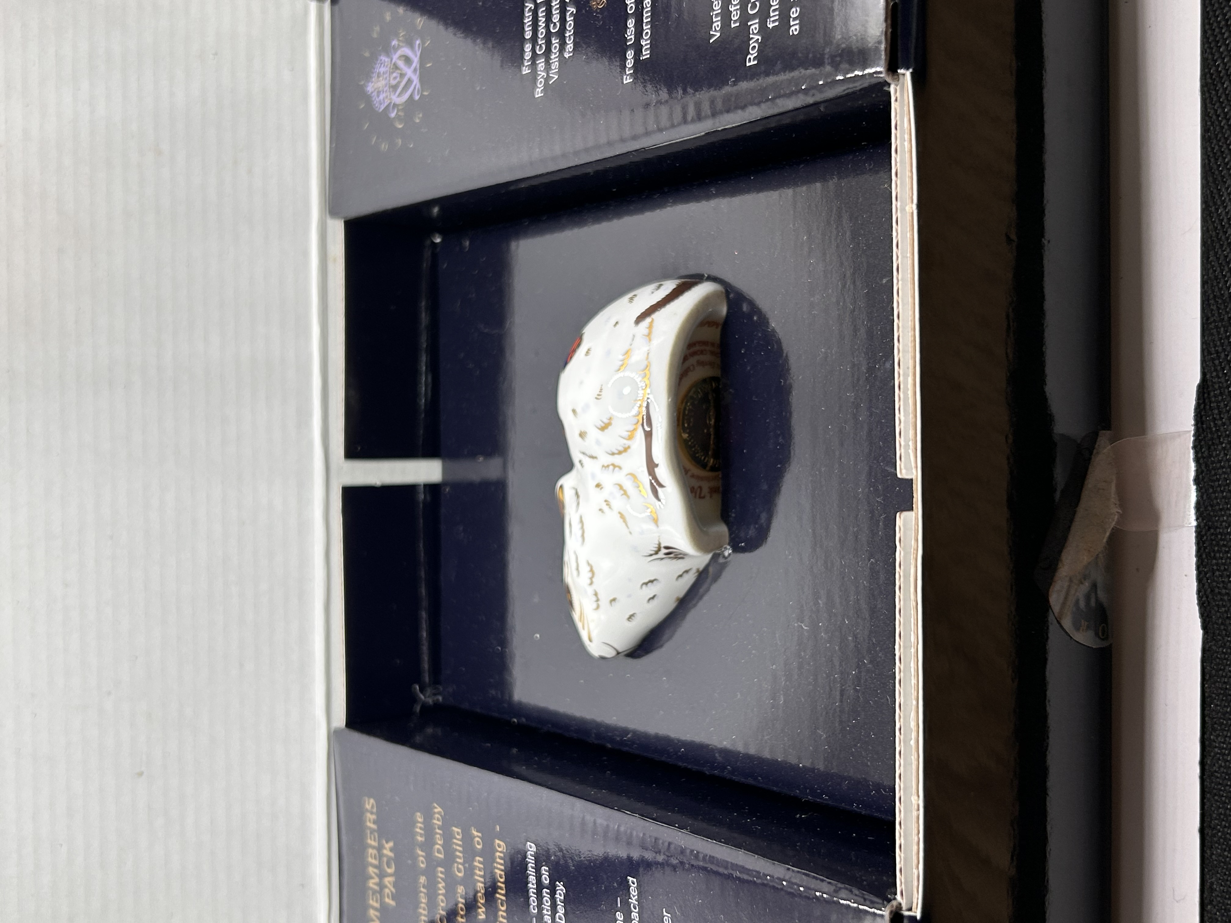 A Royal Crown Derby fine bone china paperweight titled Bank Vole, produced as an exclusive for the Royal Crown Derby Collector’s Guild. The piece is decorated in the traditional Imari style, featuring cobalt blue, iron red, and gold gilded patterns over a white ground. The underside is marked with red printed text identifying the subject, its status as a Guild exclusive, a 2004 copyright date, and the Roman numeral date cypher MMV for 2005. A gold-colored metal stopper, stamped Royal Crown Derby Made in England, is present in the base. The figurine is housed in its original dark blue Members Pack presentation box.