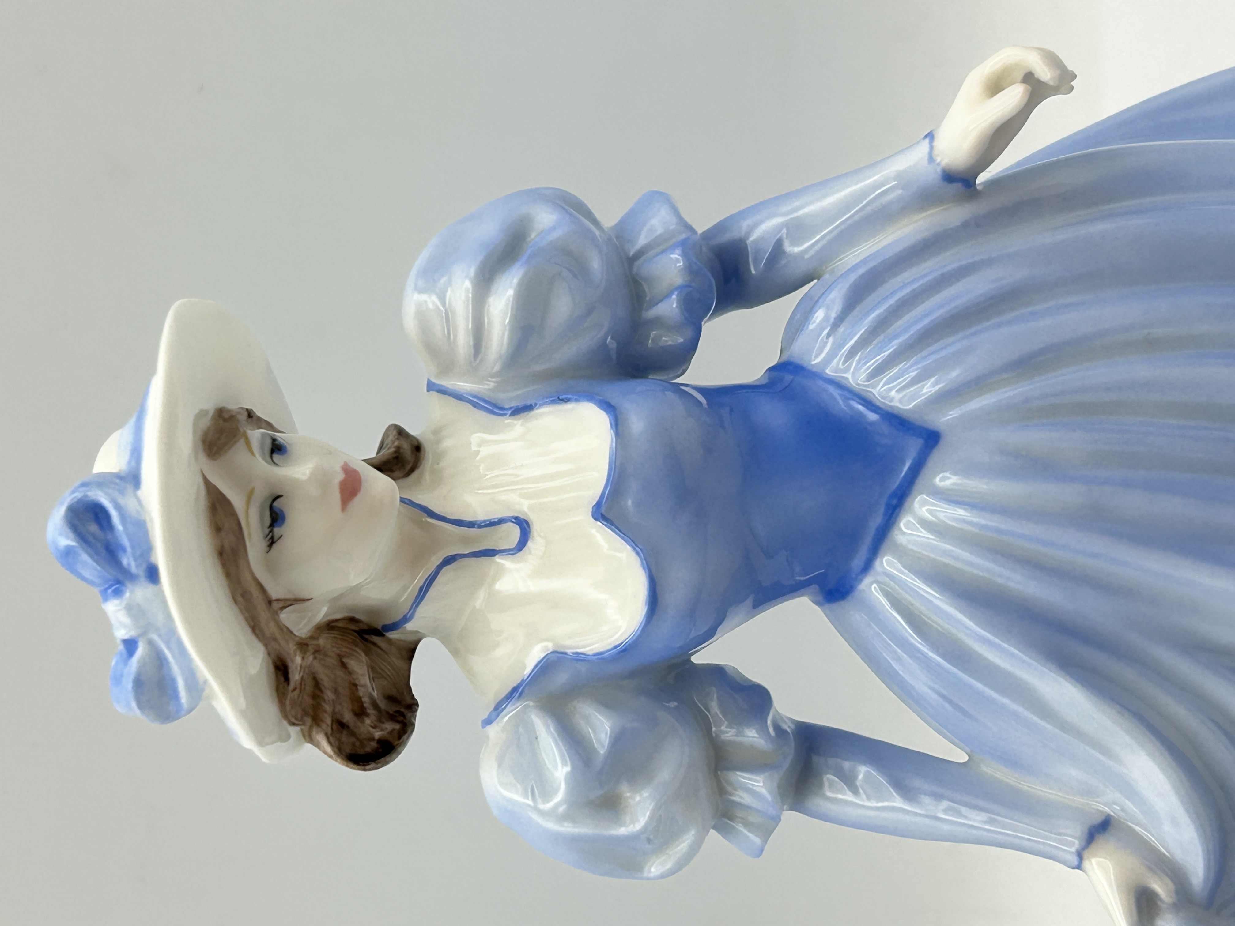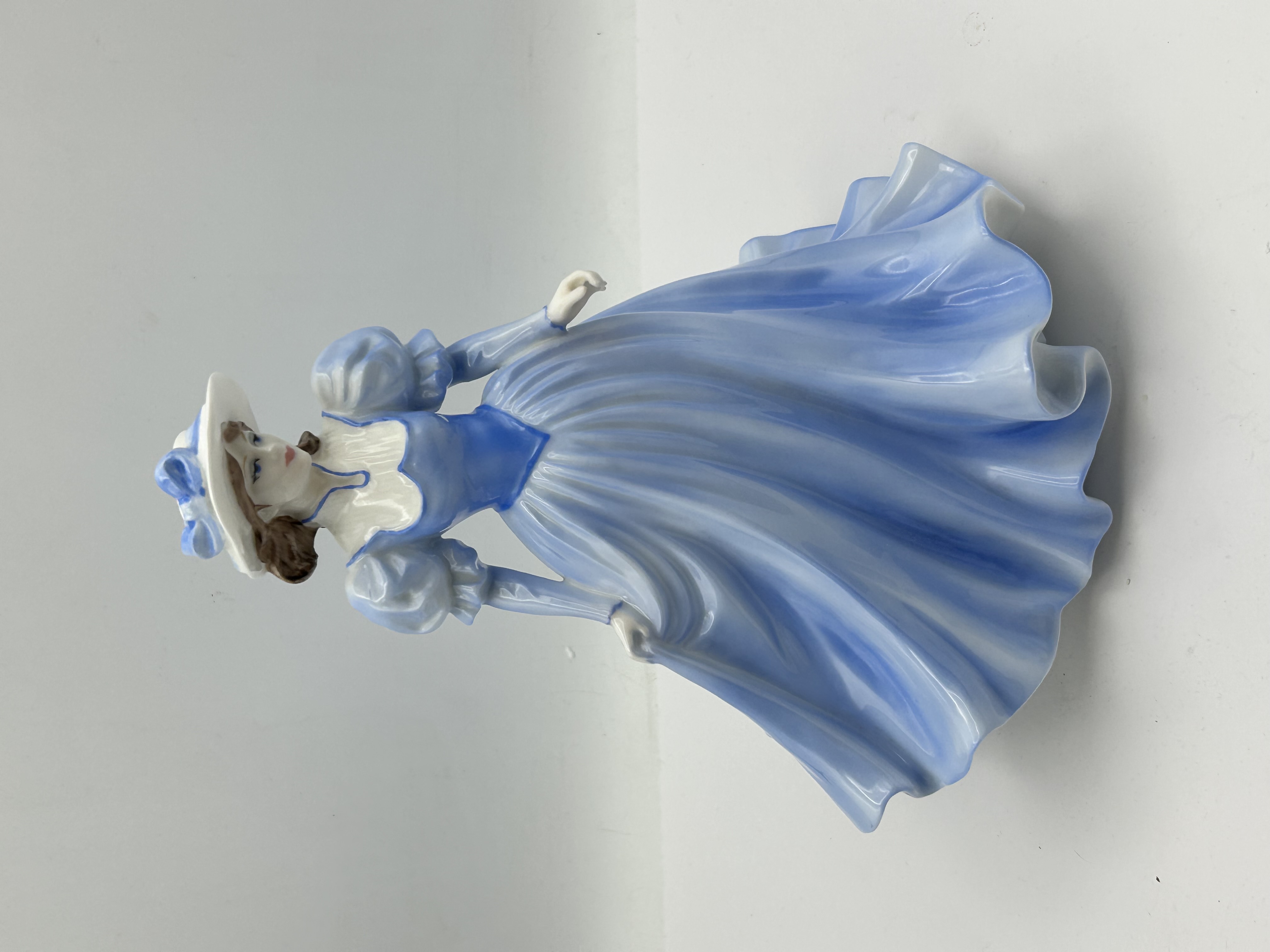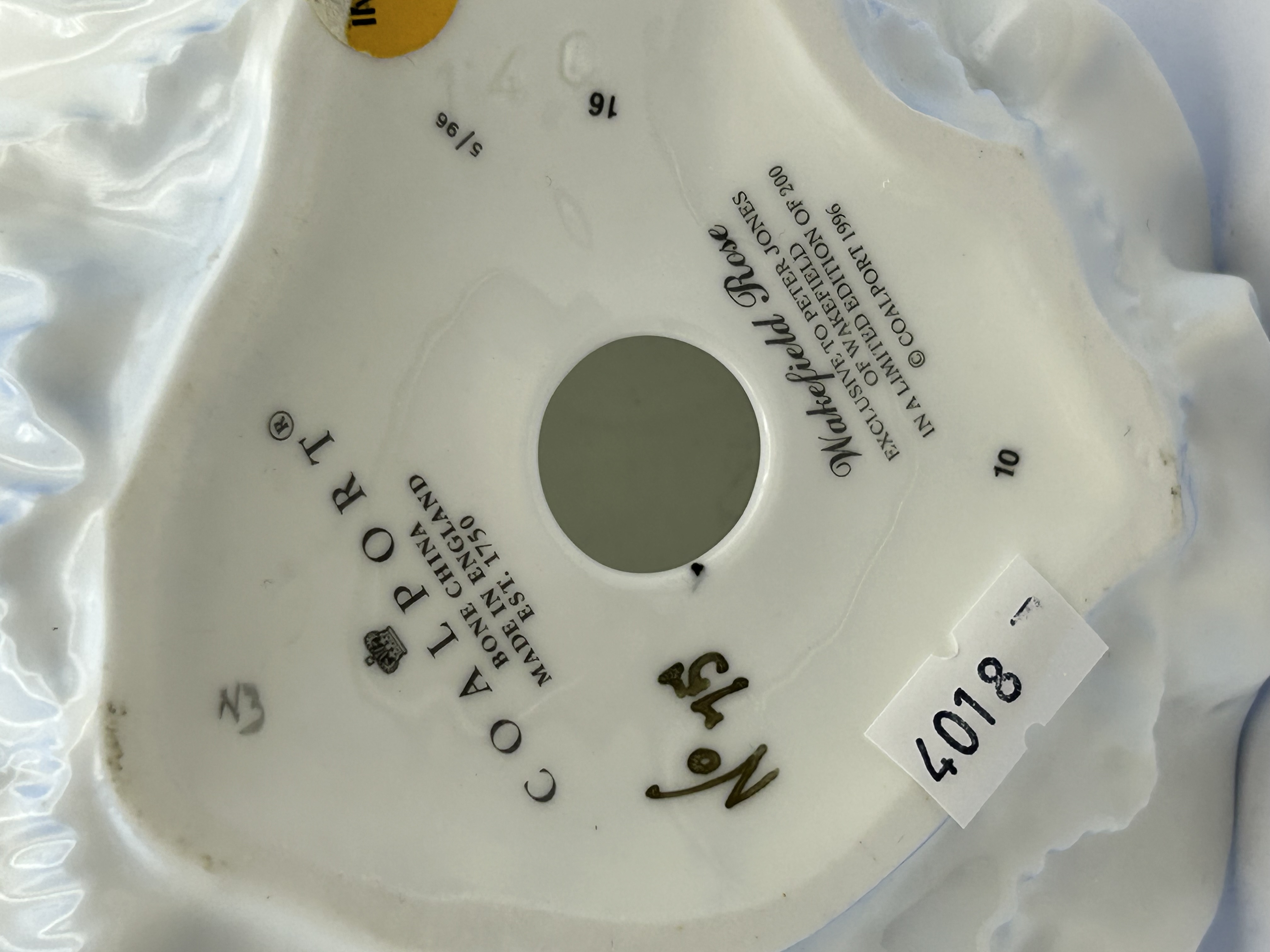 A Coalport bone china figurine titled Wakefield Rose, depicting a lady in a flowing, shaded blue and white gown with a matching wide-brimmed hat. The figurine features a high-gloss finish. The base of the piece bears the manufacturer’s printed marks, identifying it as a limited edition produced in England exclusively for Peter Jones of Wakefield. This specific piece is hand-numbered No 75 from a limited edition of 200 and carries a 1996 copyright date. The figure is constructed of fine bone china with hand-painted decorative elements.