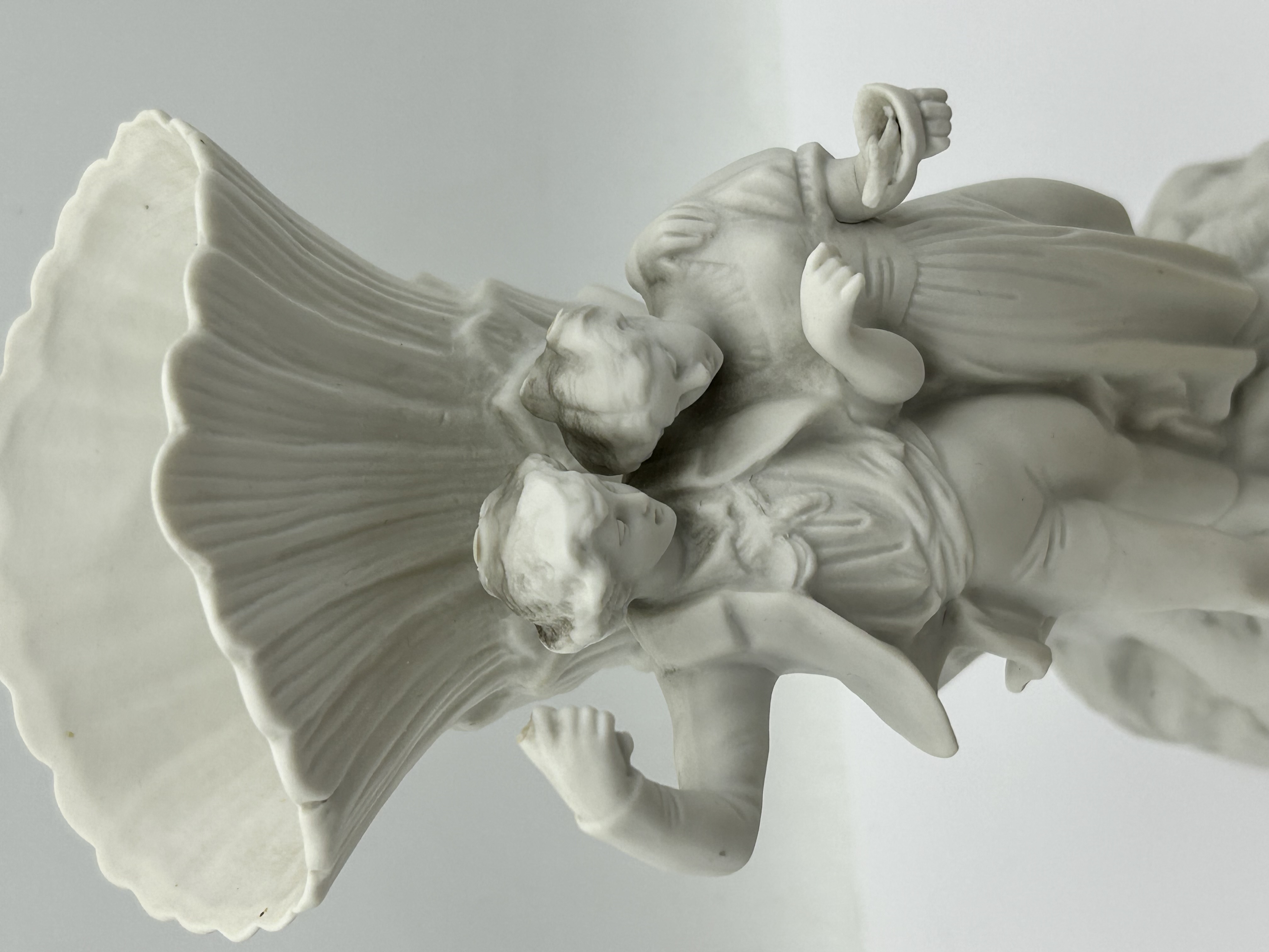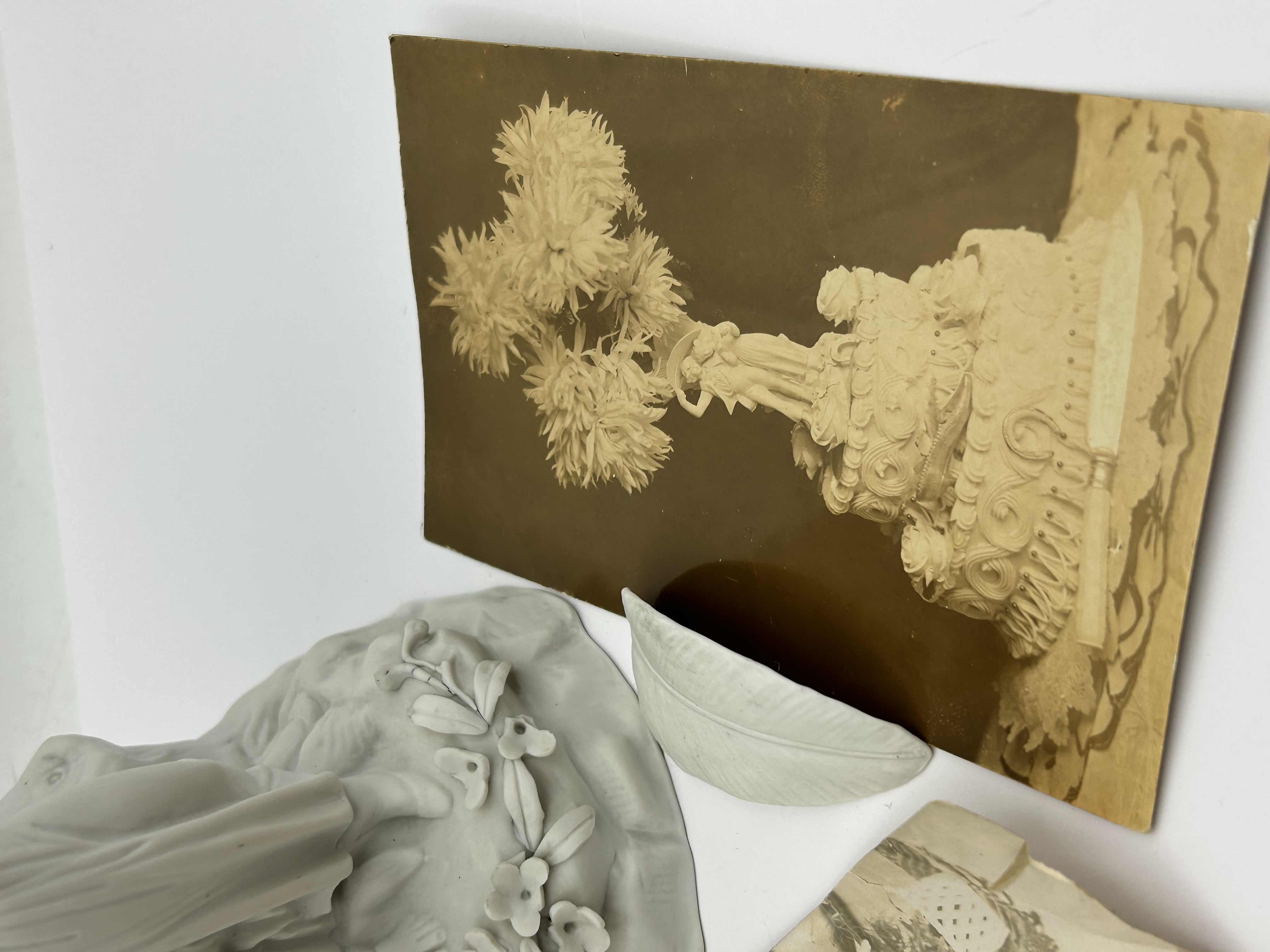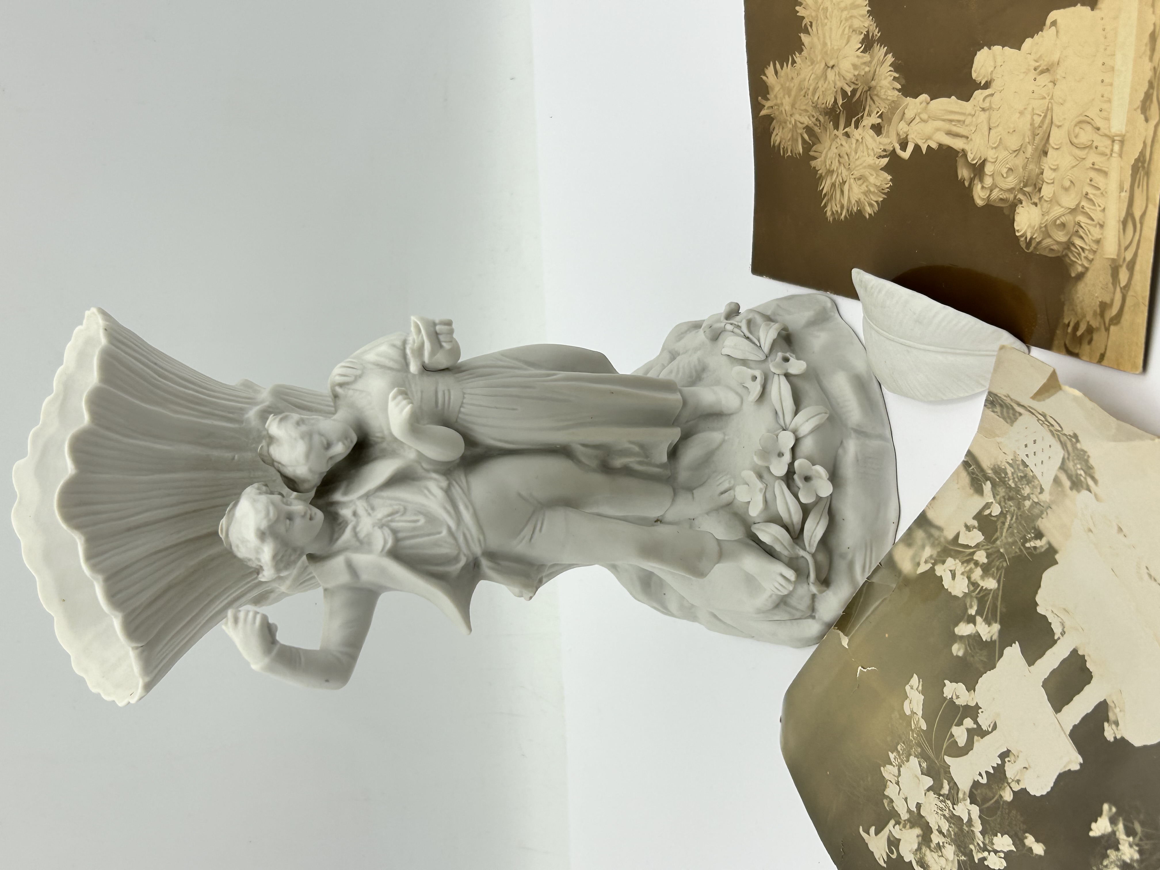 This lot consists of a matte white bisque porcelain figural vase and several sepia-toned photographs. The figurine depicts a male and female couple in rustic attire standing before a large, vertically-ribbed vessel resembling a sheaf of wheat. The figures are positioned on a rocky base decorated with small flowers. The accompanying historical photographs include one image depicting the figurine utilized as a topper for an elaborate, multi-tiered cake. The porcelain is constructed in the Parian style with a matte finish.