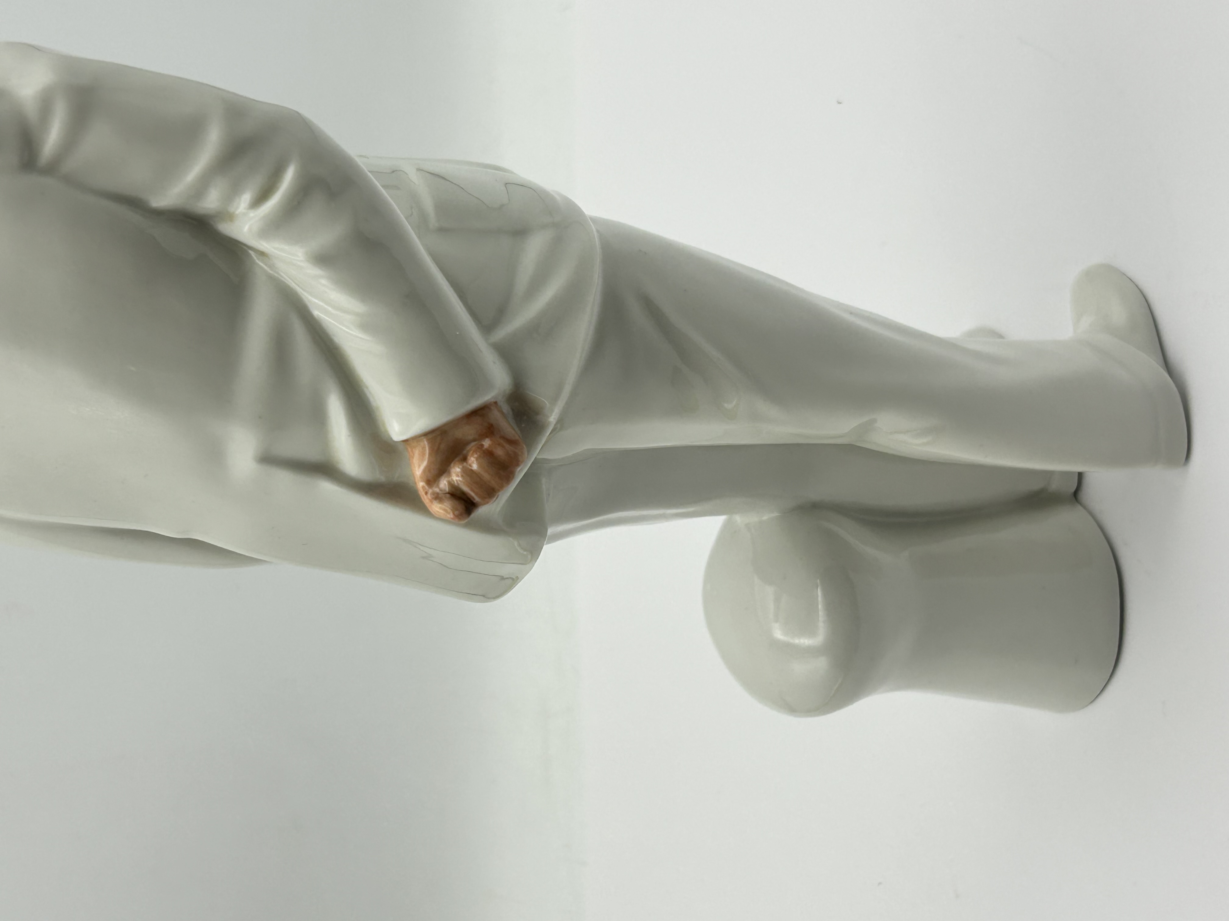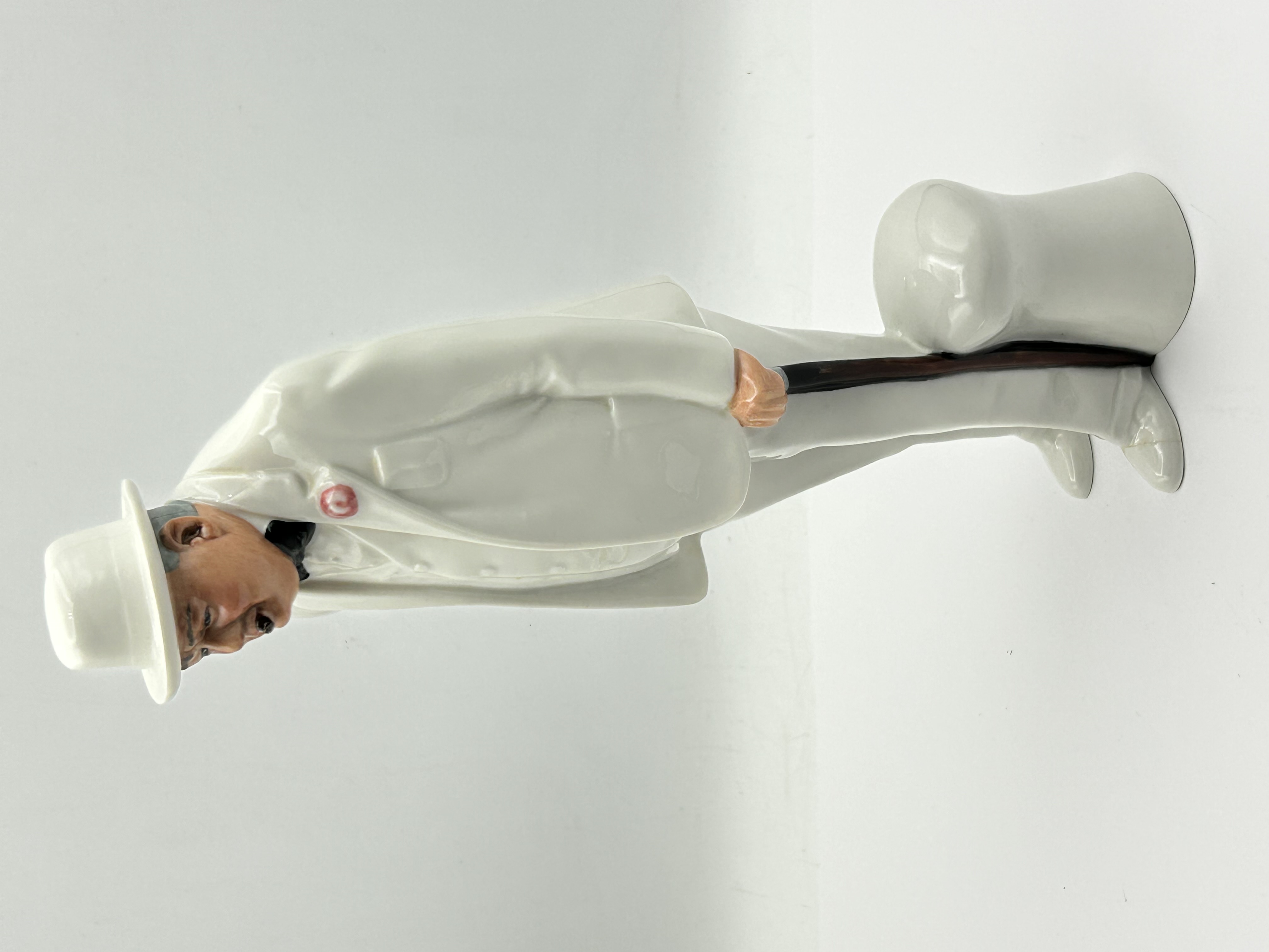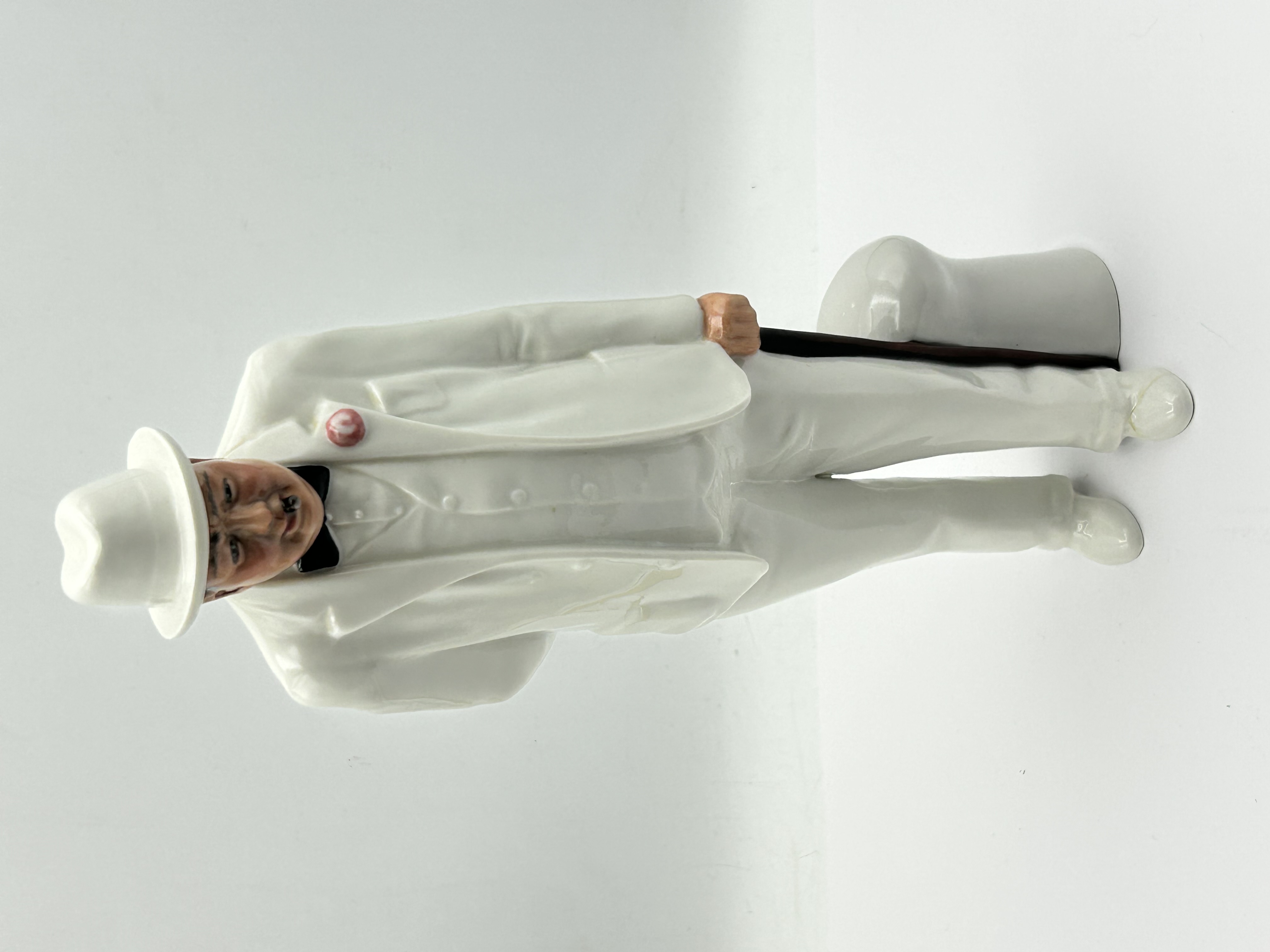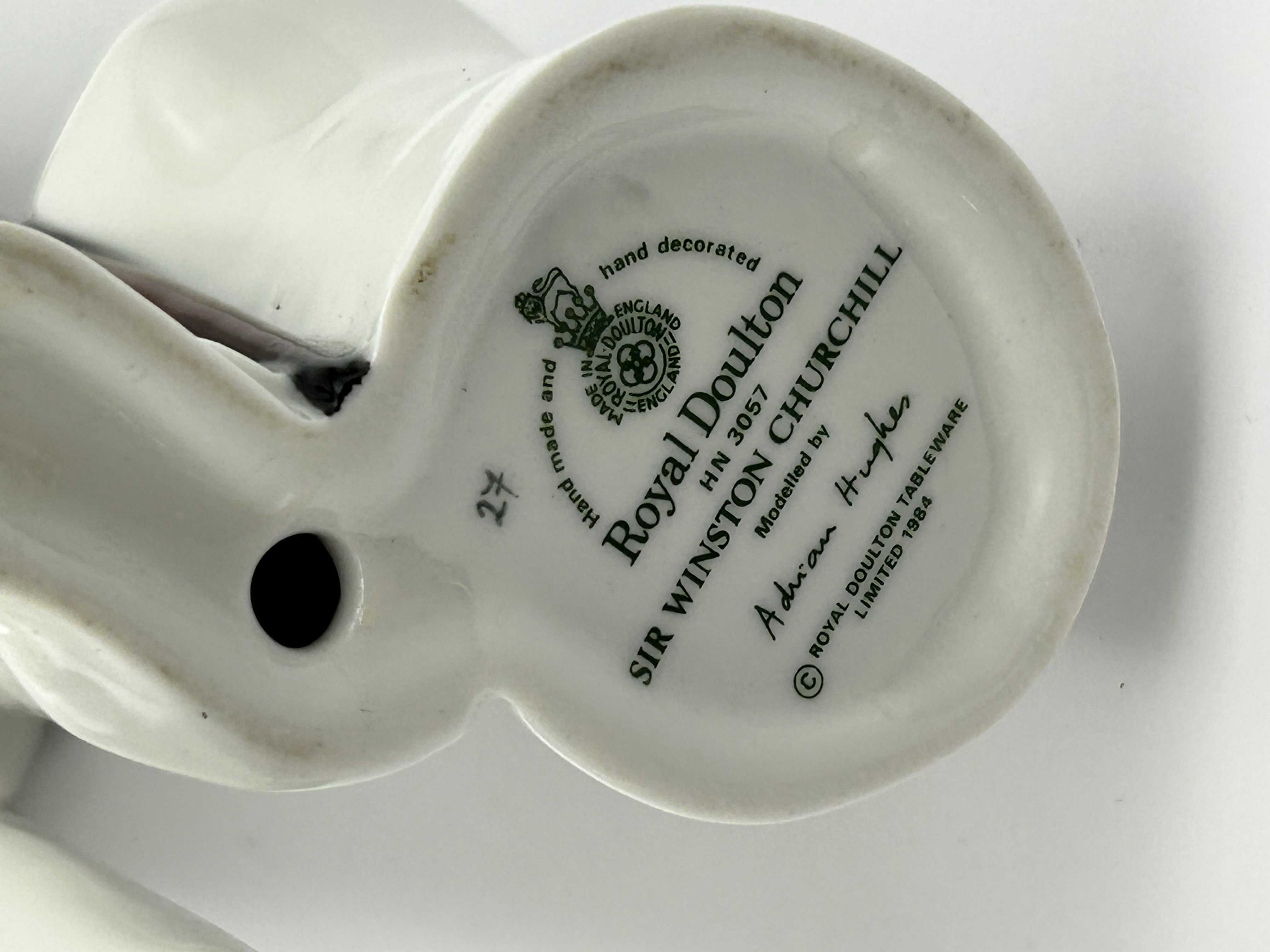 A Royal Doulton porcelain figurine titled Sir Winston Churchill, model number HN 3057. This figure was modeled by Adrian Hughes and produced in 1984. The subject is depicted in a formal white three-piece suit with a matching fedora, a black bow tie, and a pink boutonnière, while holding a dark walking stick. The underside features a green backstamp with the Royal Doulton lion and crown logo, indicating the piece is hand made and hand decorated. The mark also includes the modeler name and a 1984 copyright for Royal Doulton Tableware Limited.