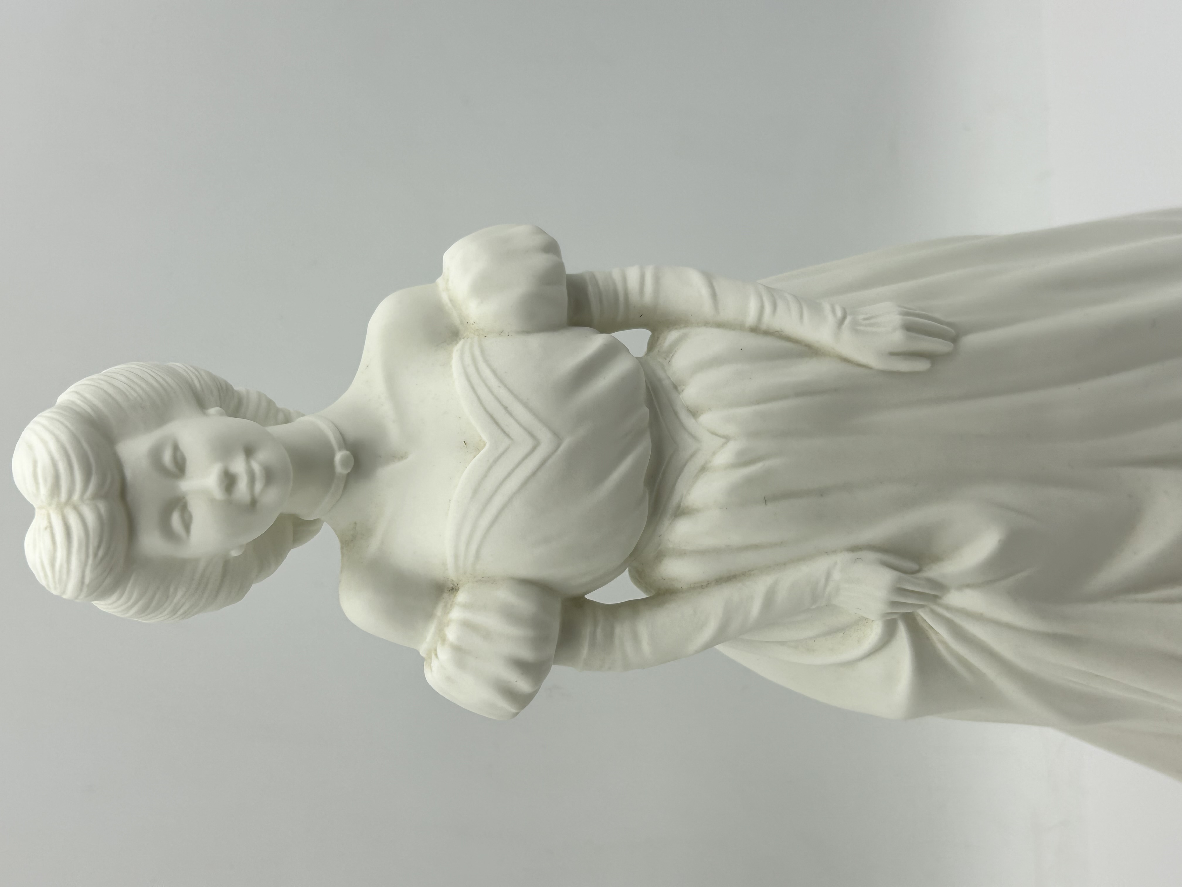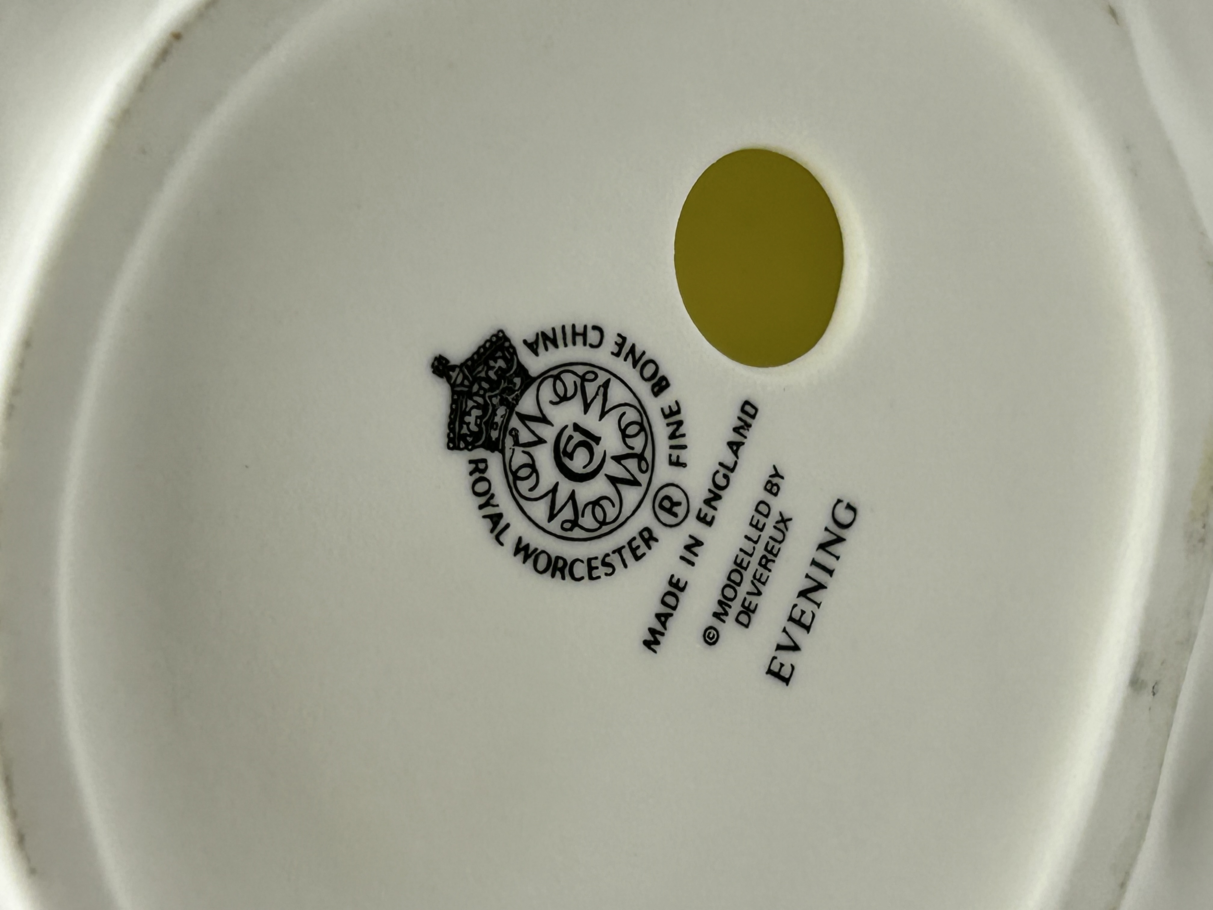 A Royal Worcester fine bone china figurine titled Evening, modeled by Devereux in a matte white parian-style finish. The figure depicts a woman in a formal evening gown with puffed sleeves, a tiered ruffled hem, and long gloves. The underside features the printed manufacturer backstamp stating ROYAL WORCESTER FINE BONE CHINA, MADE IN ENGLAND, (c) MODELLED BY DEVEREUX, and the title EVENING.
