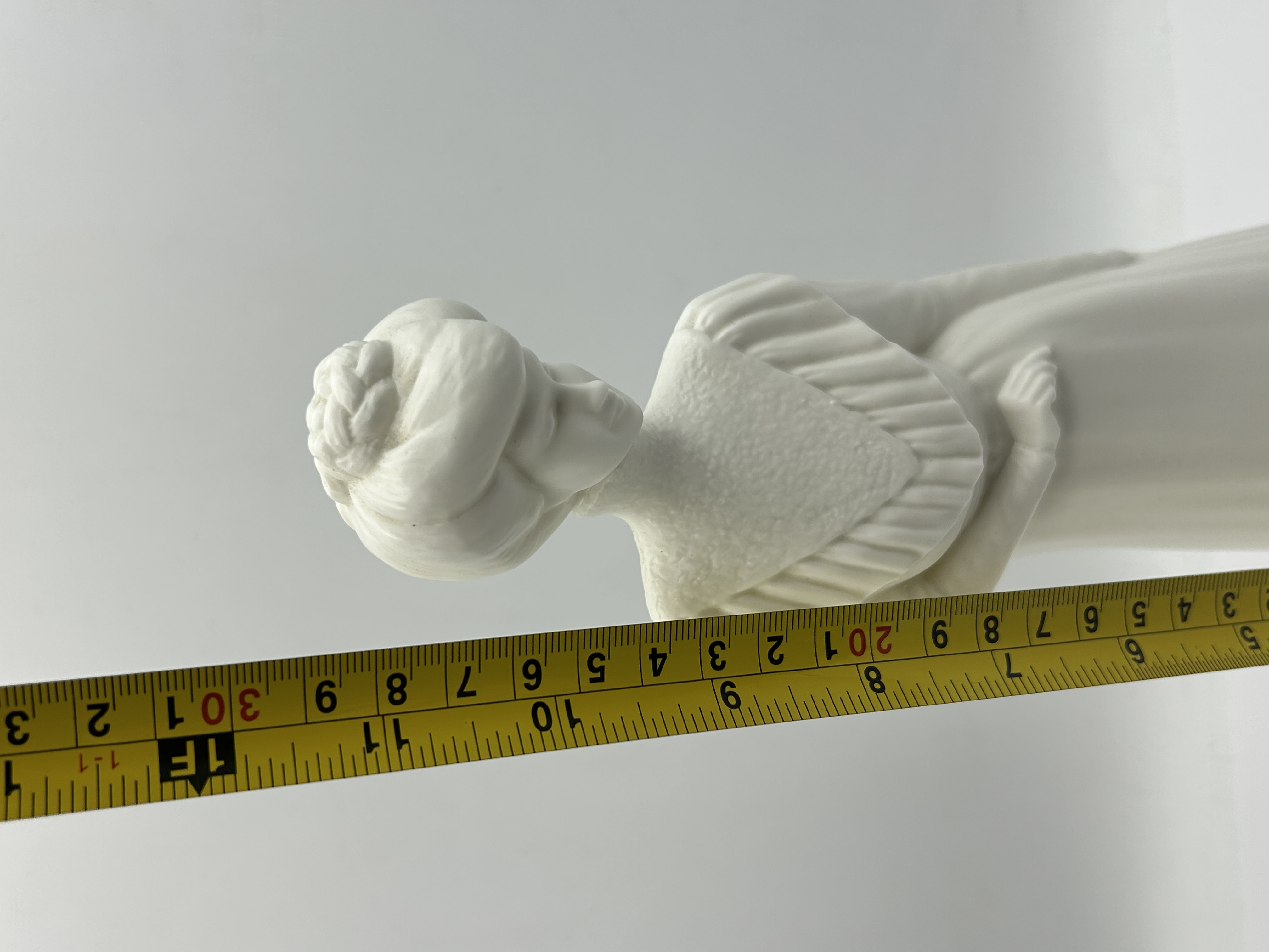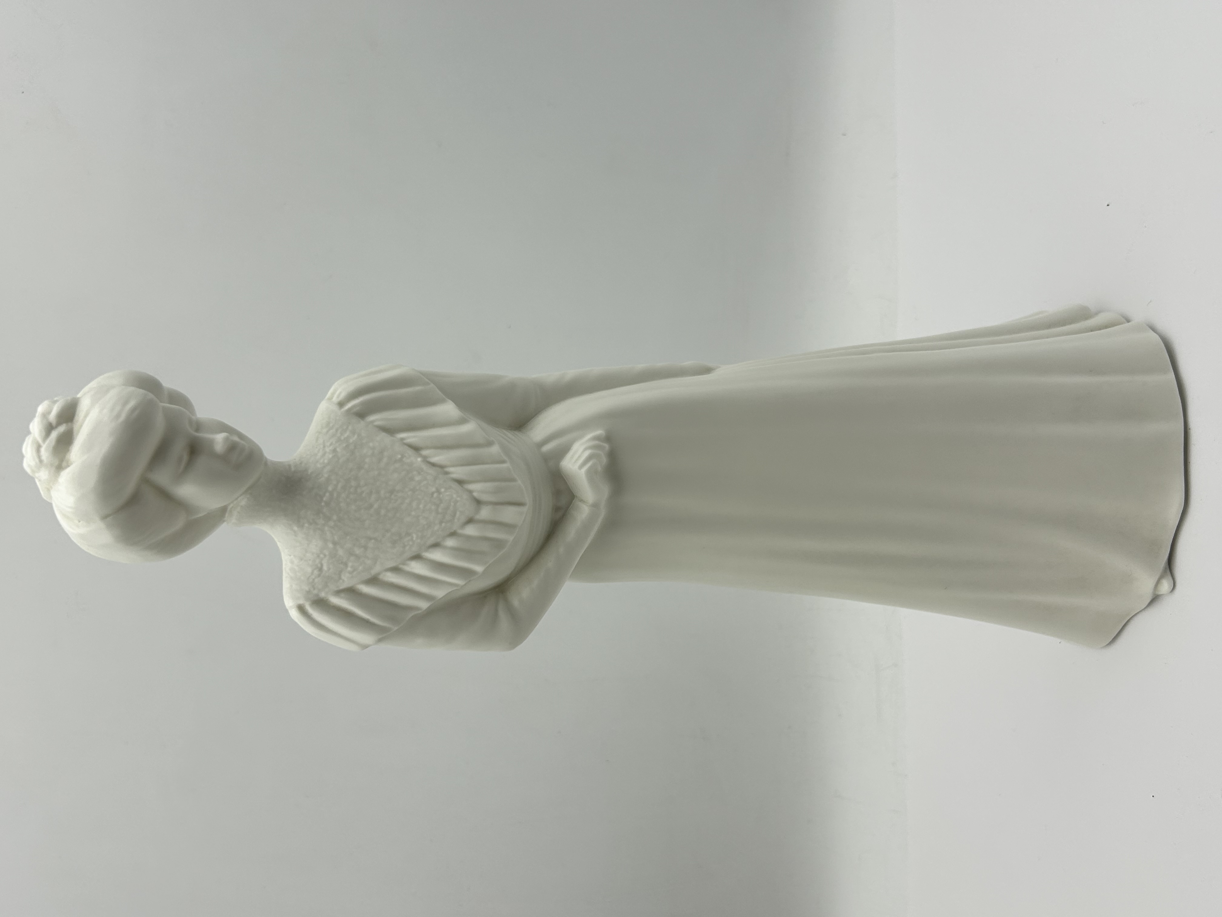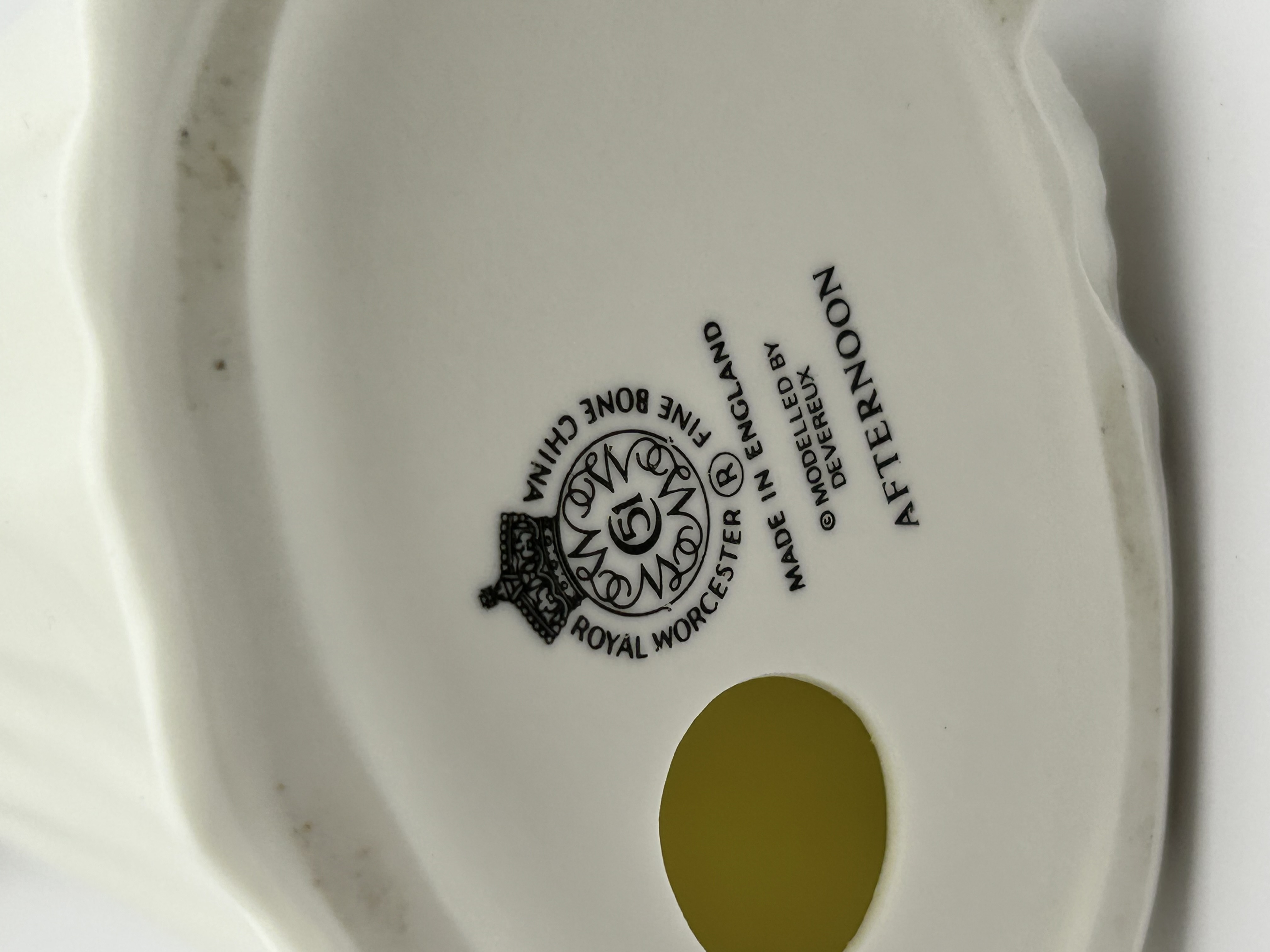 A Royal Worcester fine bone china figurine titled Afternoon, modeled by Devereux. The piece is part of the All White series and features a matte bisque finish. It depicts a standing female figure in Edwardian-style attire, including a long-sleeved dress with a pleated bodice, textured collar, and a floor-length skirt. Her hair is styled in a formal updo. The underside bears the Royal Worcester backstamp with a crown and circle motif, the number 51, and the inscriptions Fine Bone China, Made in England, Modelled by Devereux, and Afternoon.