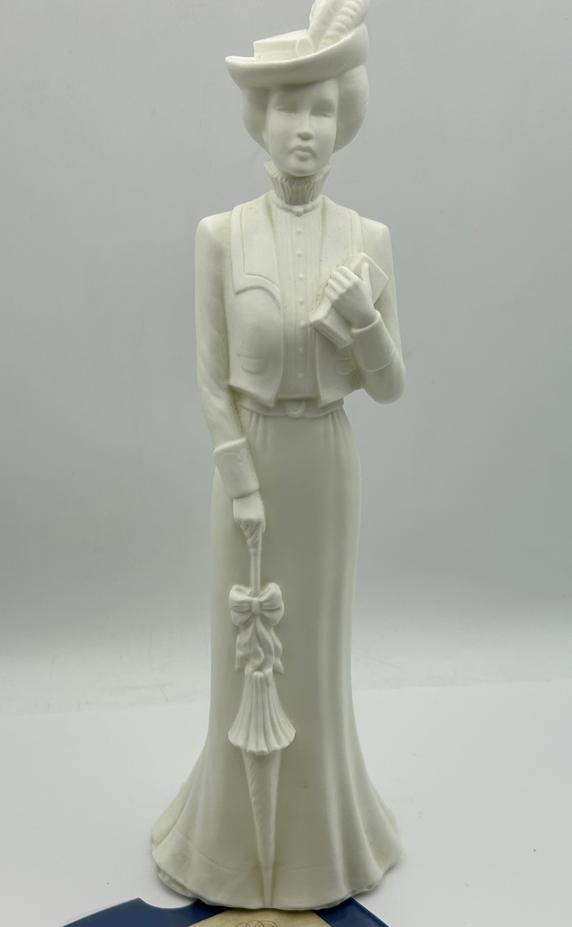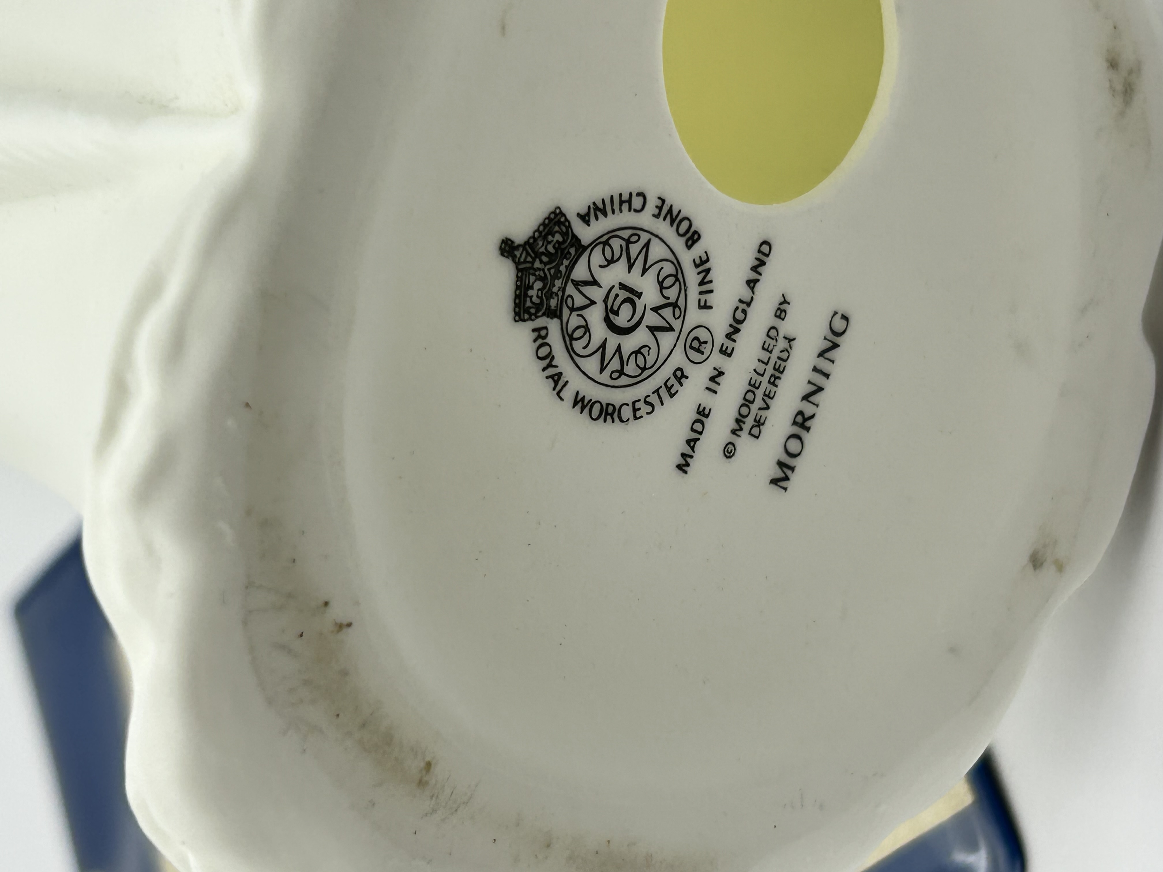 A Royal Worcester fine bone china figurine titled Morning, modeled by Devereux. This matte white biscuit-style figure depicts a woman in late 19th or early 20th-century attire, featuring a long, flowing dress, a tailored jacket, and a plumed hat. The figure is shown holding a book in one hand and a closed parasol in the other. The underside bears the official Royal Worcester stamp, identifying it as fine bone china made in England, and includes the series title and the modeler’s name.