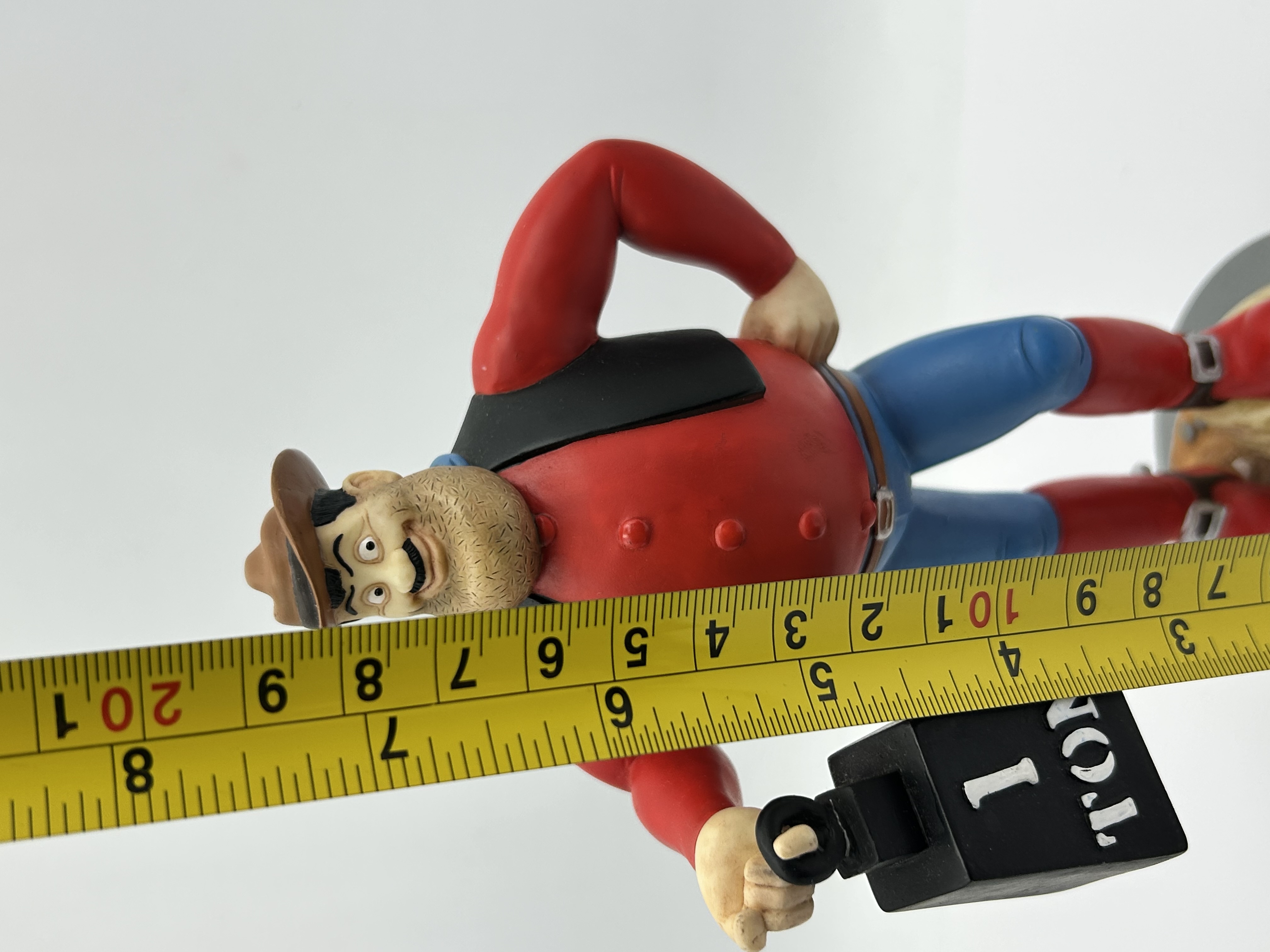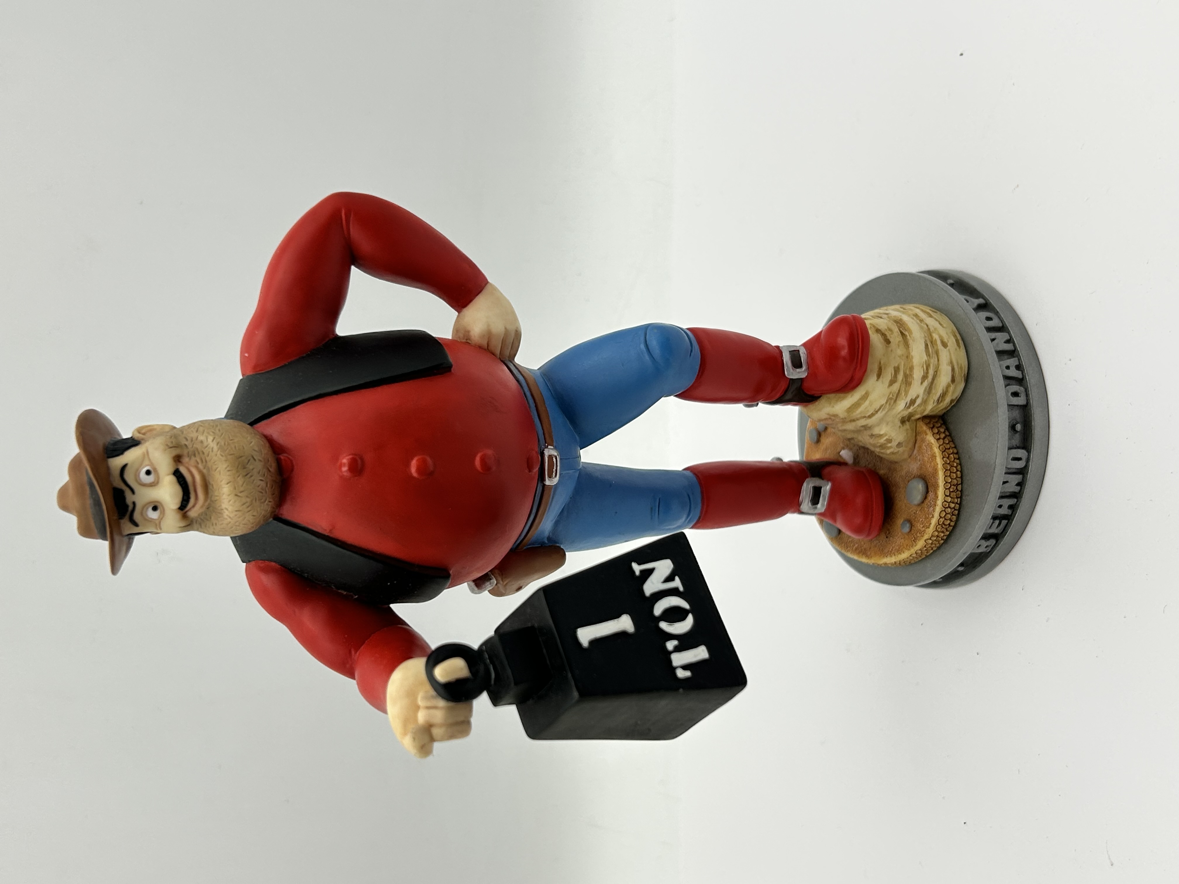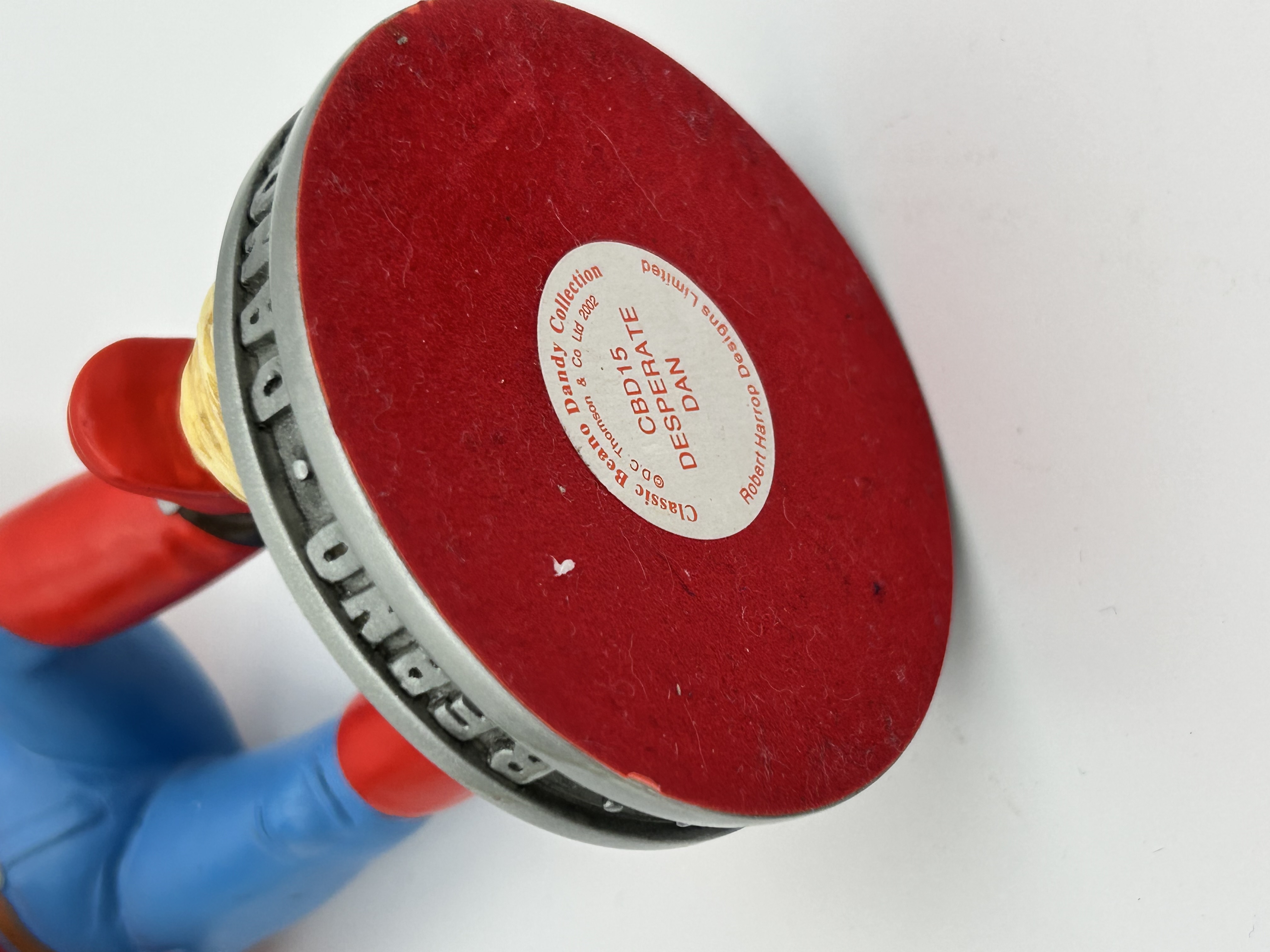 A Robert Harrop hand-painted resin figurine of the comic character Desperate Dan, part of the Classic Beano Dandy Collection, reference number CBD15. Produced in 2002 under license from D.C. Thomson and Co Ltd, the figure depicts the character in a standing pose wearing a red shirt, black waistcoat, blue trousers, and a brown cowboy hat, while holding a black 1 TON weight. The figure is mounted on a circular gray base with embossed BEANO DANDY lettering around the edge. The underside is covered in red felt and retains the original manufacturer label with the series name, reference number, and copyright information.