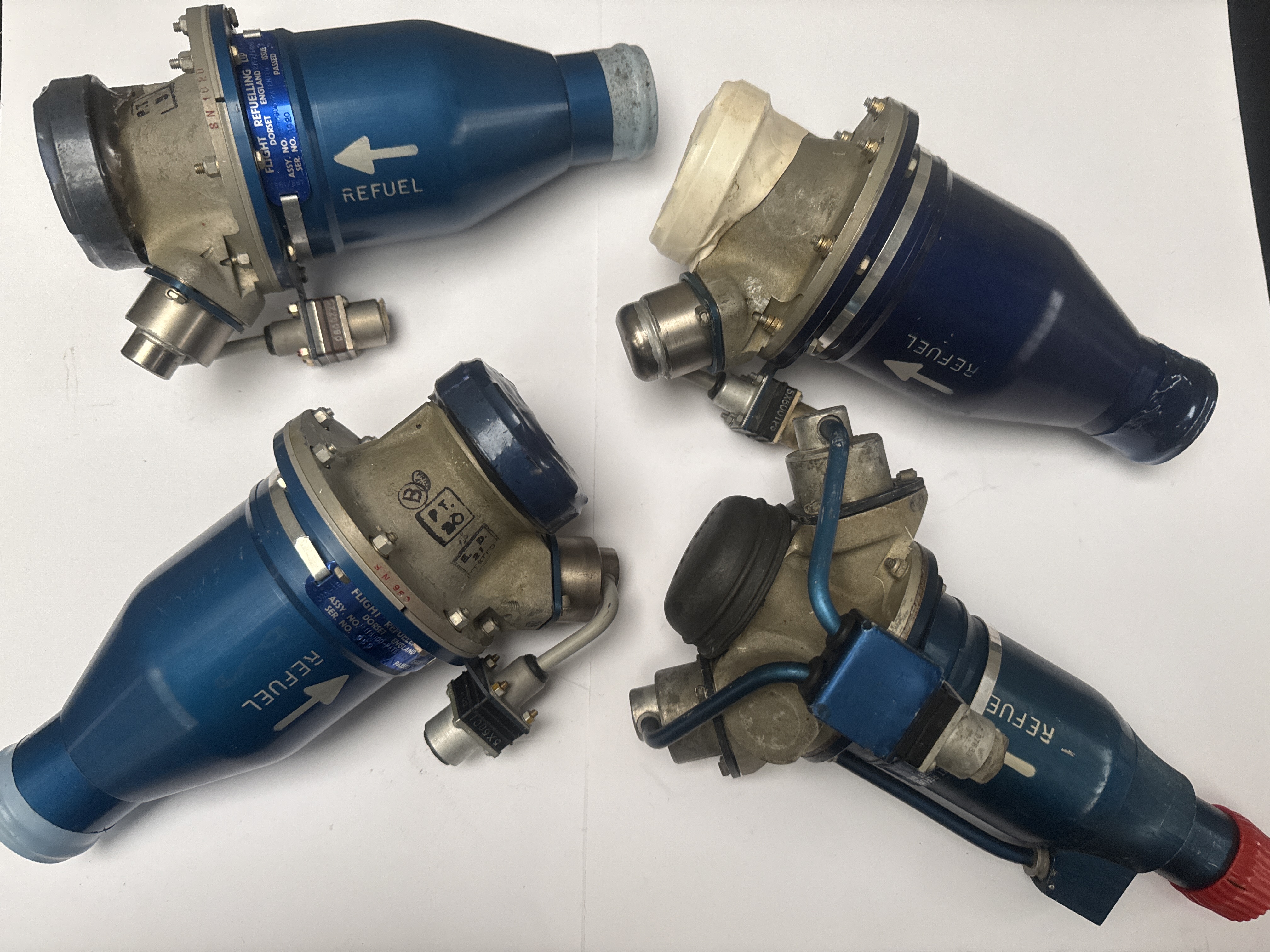 A group of four fuel jettison valves manufactured by Flight Refuelling Ltd of Dorset, England. Each unit features a tapered blue-anodized body joined to a cast metal housing equipped with various fittings and electrical connectors. The components are marked with the word REFUEL and directional arrows. Identification plates are present on the assemblies, listing serial numbers including 959 and 1020, and a manufacture and inspection date of January 1963. The cast housings display several visible inspection stamps. Some units are fitted with protective caps and ancillary cabling.