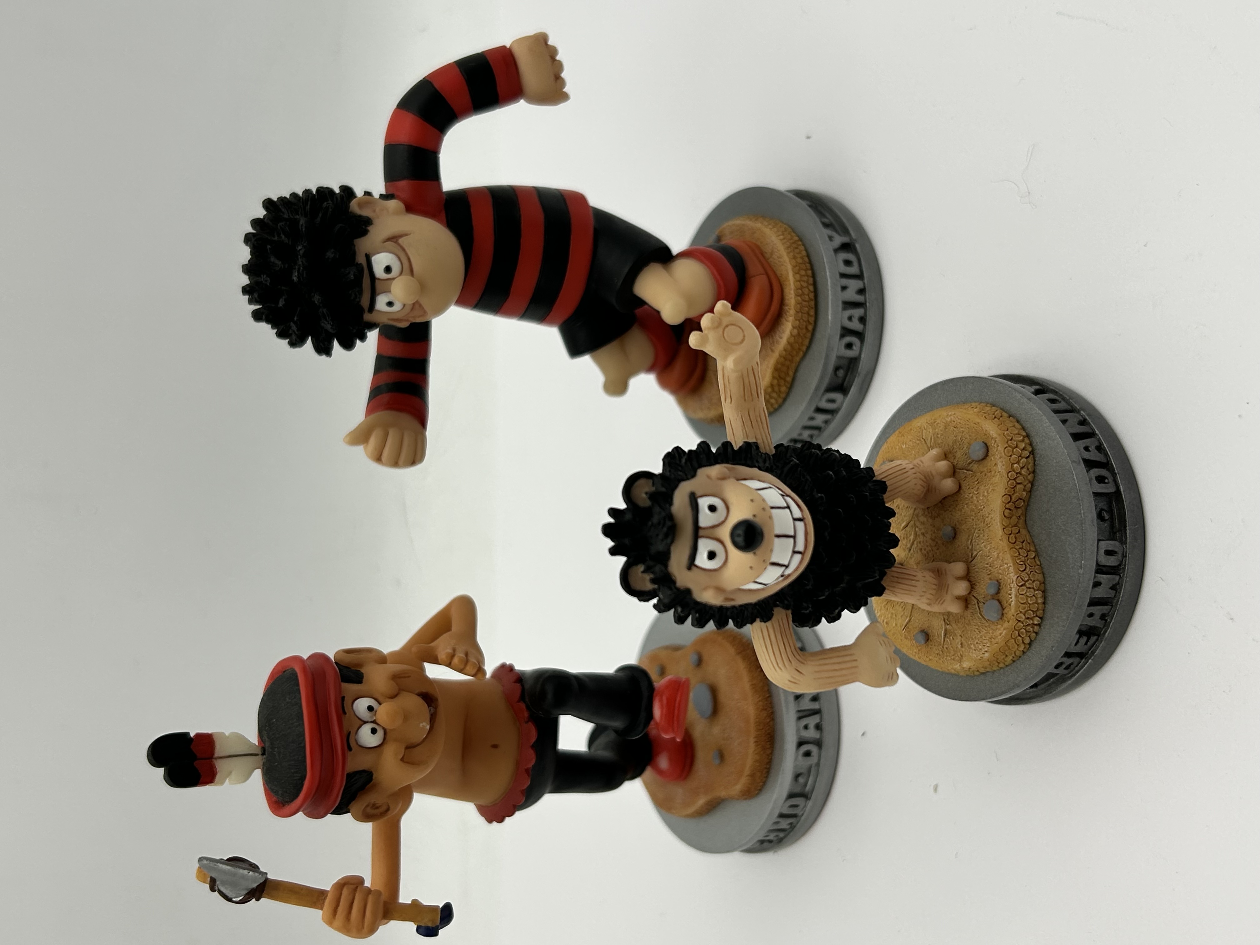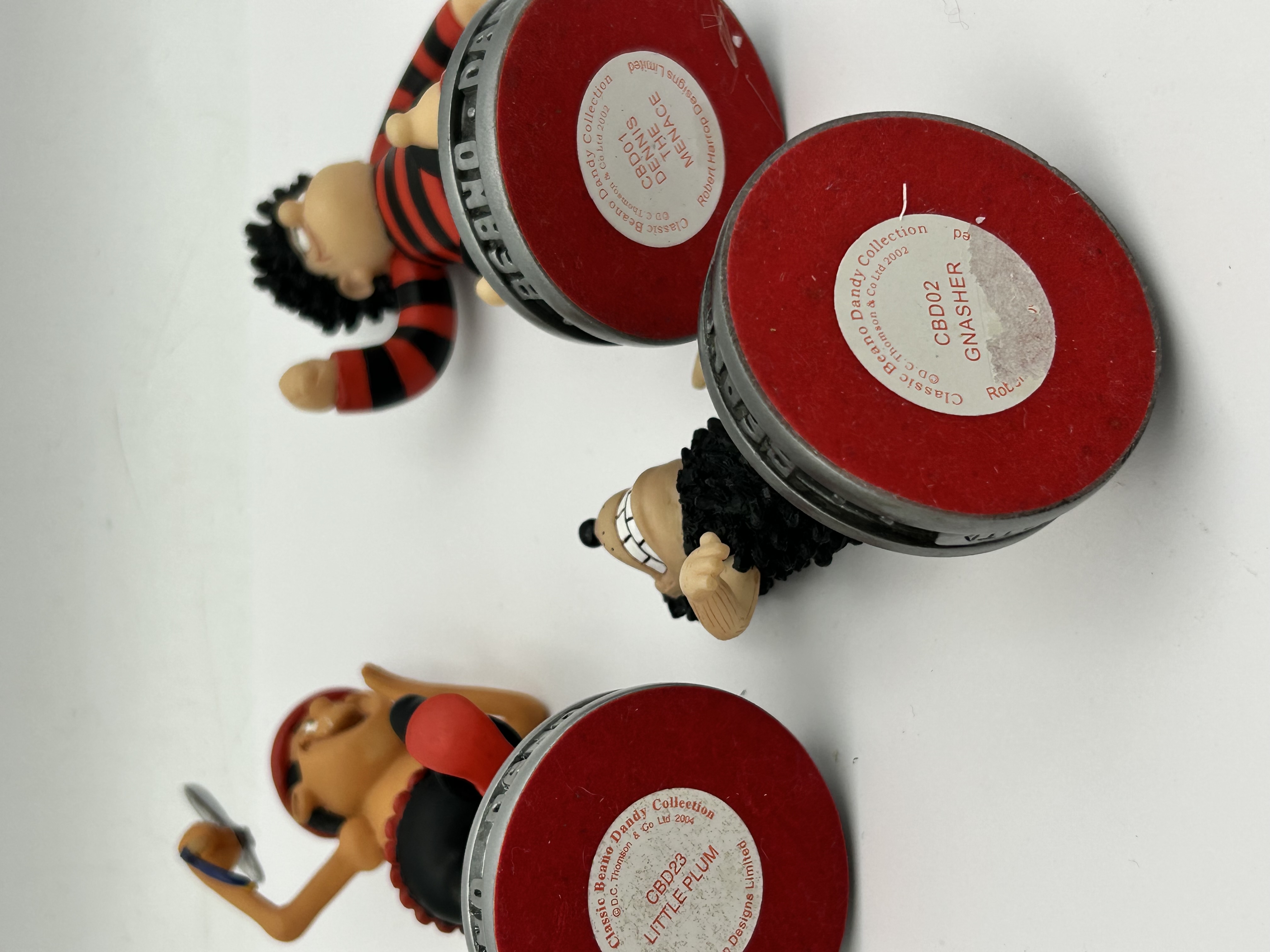 A trio of hand-painted molded figurines from the Classic Beano Dandy Collection by Robert Harrop Designs. The group includes the characters Dennis the Menace, Gnasher, and Little Plum. Each figure is depicted in a dynamic pose and mounted on a circular grey base with the embossed text BEANO – DANDY around the rim. The undersides are finished with red felt pads and circular identifying labels. These labels include the character names and reference numbers CBD01 for Dennis the Menace, CBD02 for Gnasher, and CBD23 for Little Plum. The labels also bear copyright marks for D.C. Thomson and Co Ltd dated 2002 and 2004.