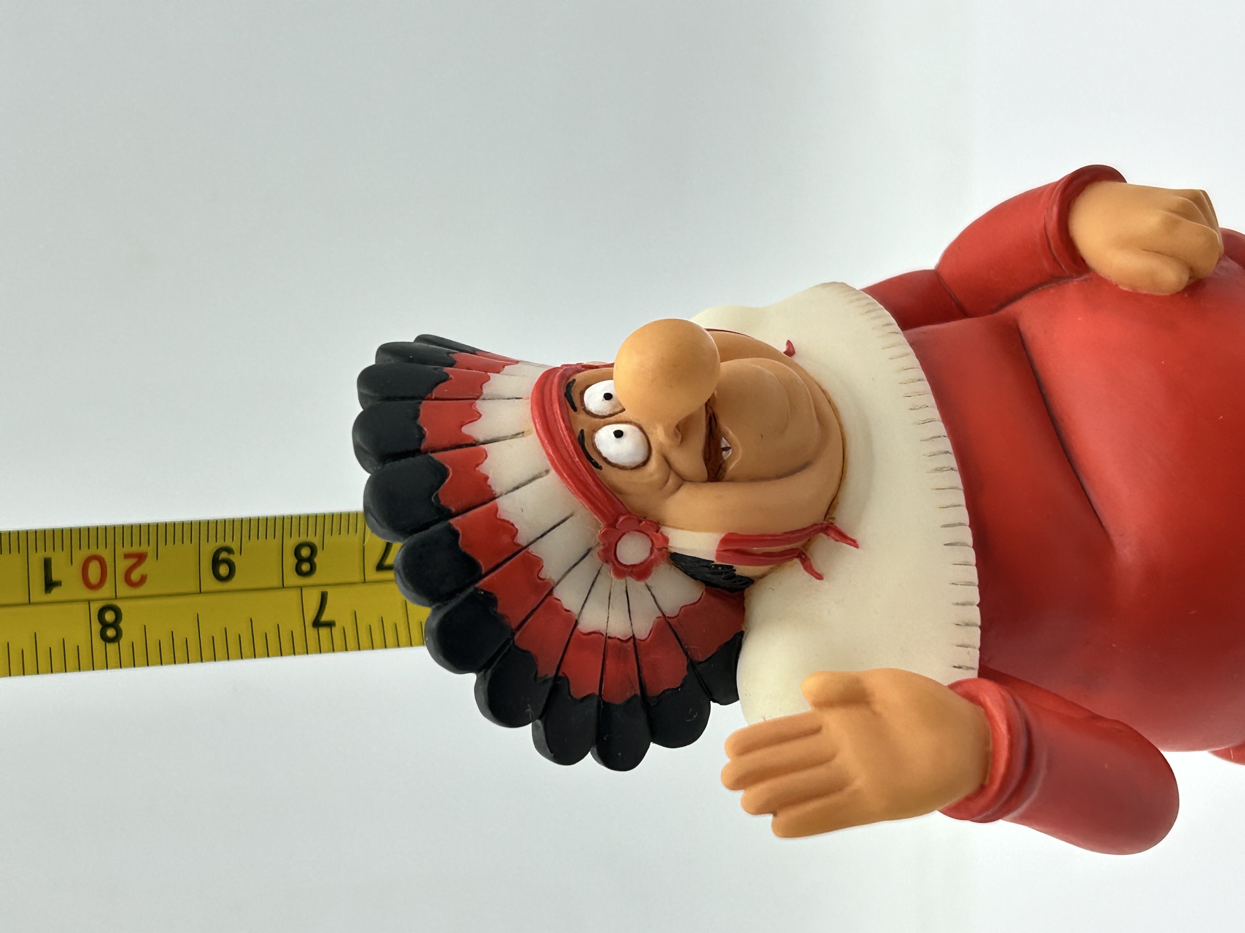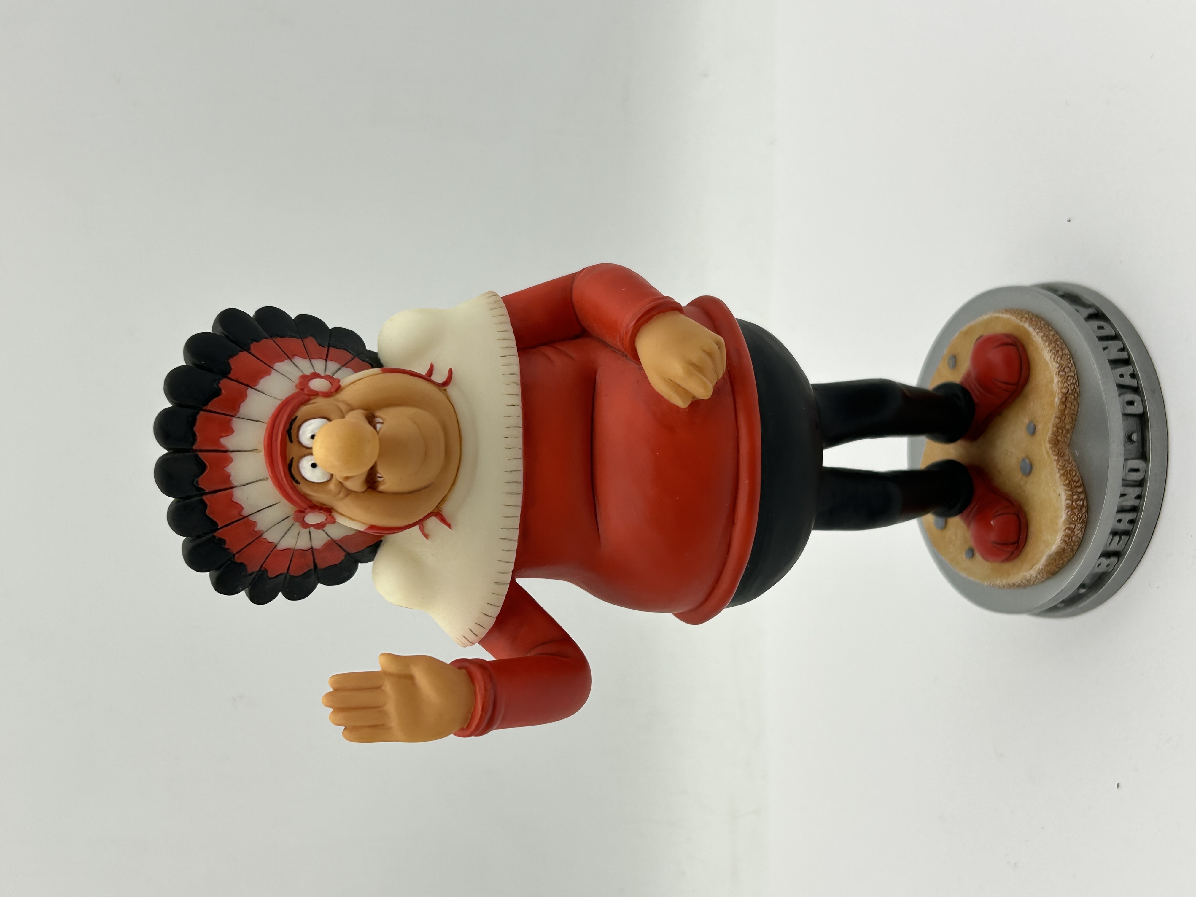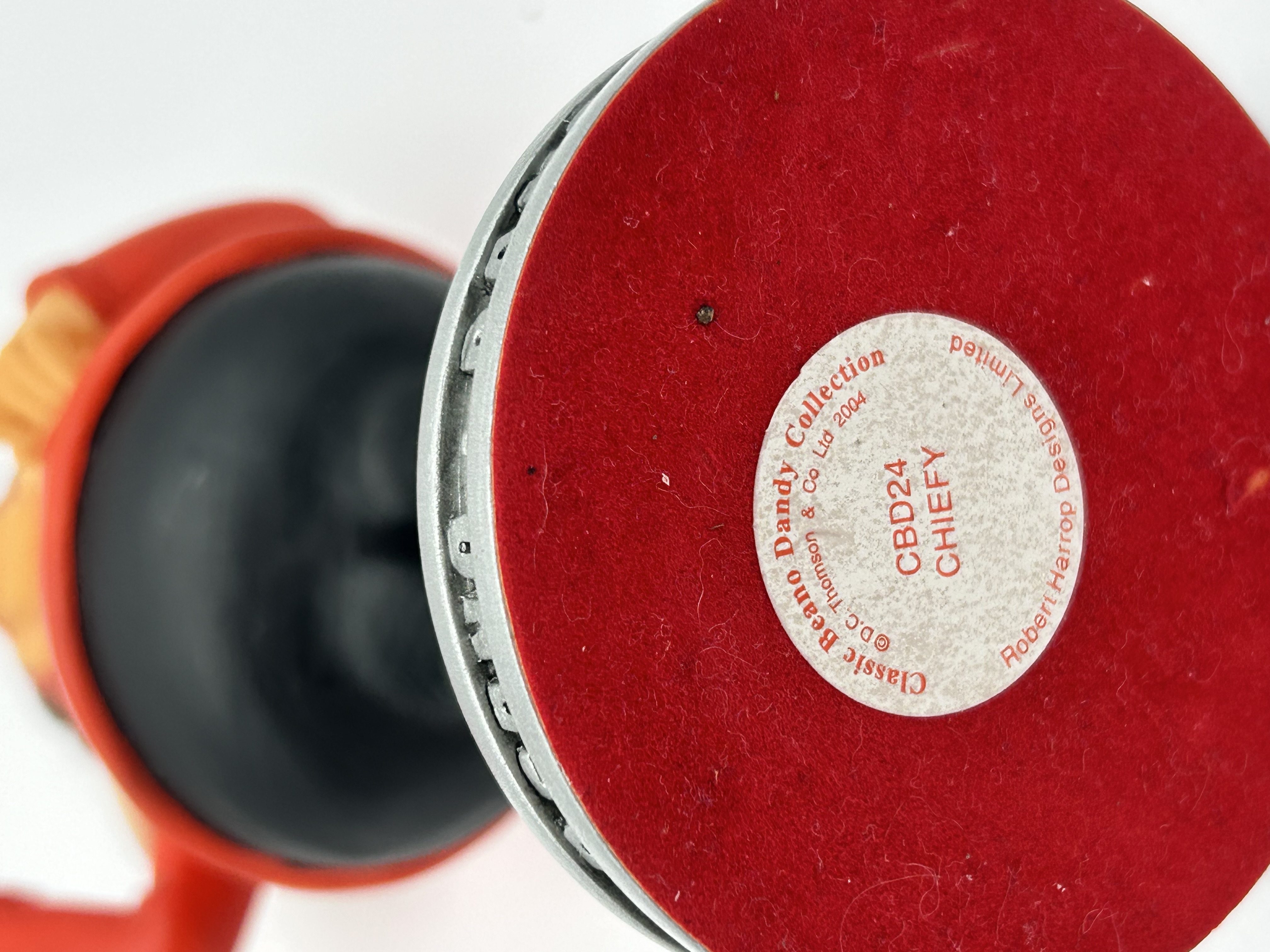 A Robert Harrop Designs Limited hand-painted figurine from the Classic Beano Dandy Collection depicting the character Chiefy. The caricature figure is modeled wearing a red tunic and a multicolored feathered headdress, standing upon a circular gray base embossed with BEANO-DANDY. The underside features a red felt covering with a manufacturer label identifying the piece as model CBD24 CHIEFY with a copyright for D.C. Thomson & Co. Ltd dated 2004.