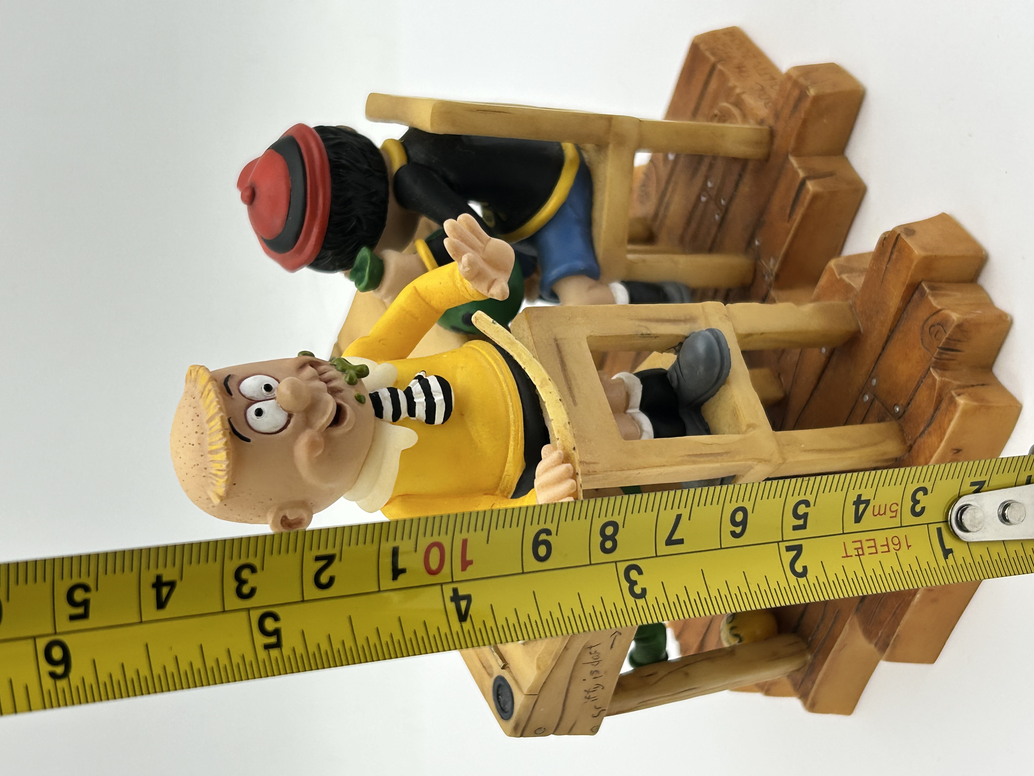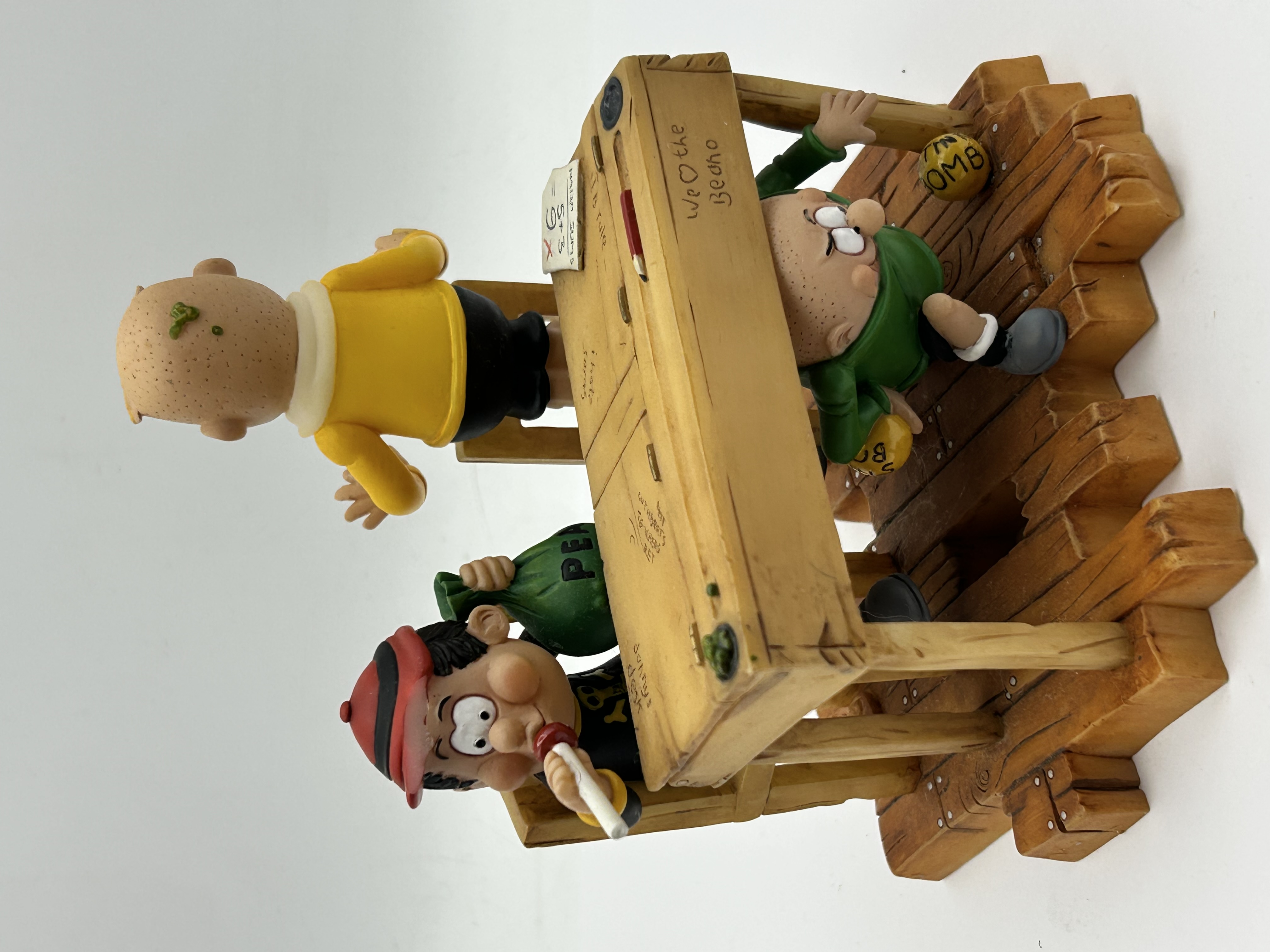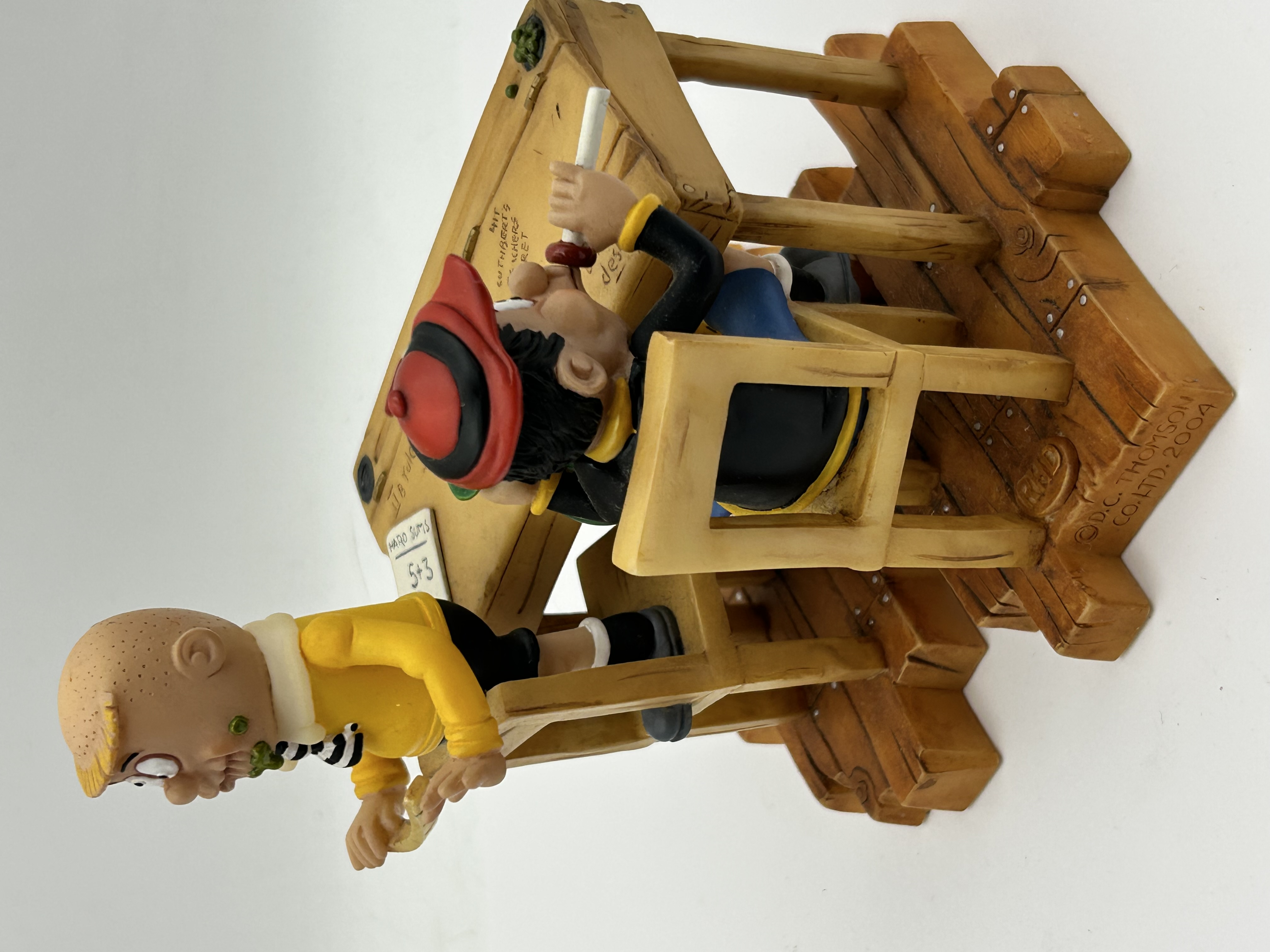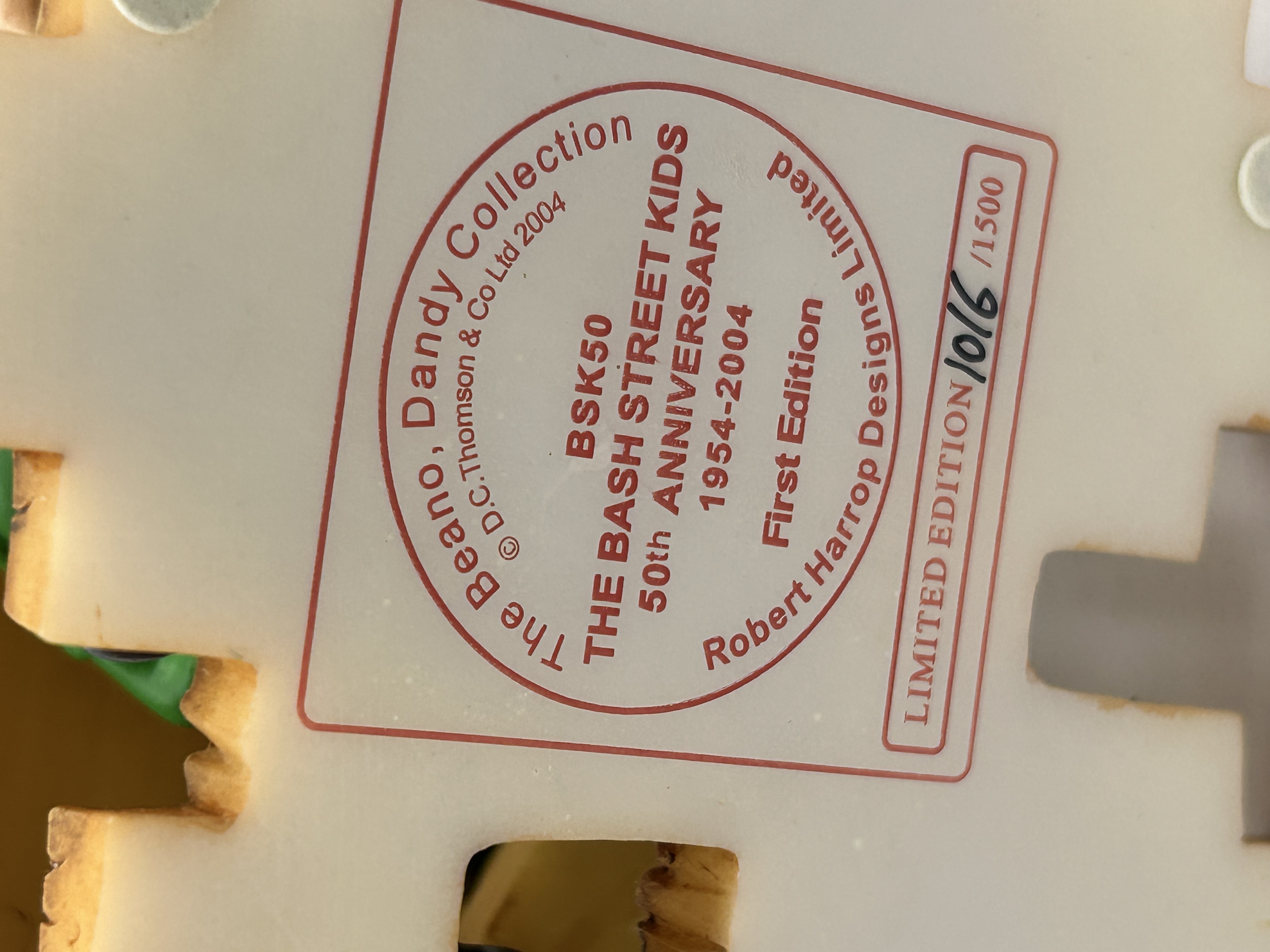A Robert Harrop Designs diorama titled The Bash Street Kids 50th Anniversary 1954-2004, from The Beano, Dandy Collection. The piece is crafted from painted resin and depicts multiple characters from the comic strip within a classroom setting. The scene includes period-style wooden desks situated on a plank-effect floor. The desks feature various carved and written inscriptions including I love the Beano, SMIFFY is daft, and CUTHBERT’S TEACHERS PET. The base includes a copyright mark for D.C. Thomson and Co. Ltd. dated 2004. The underside bears a commemorative label identifying the item as a first edition, numbered 1016 of a limited run of 1500.