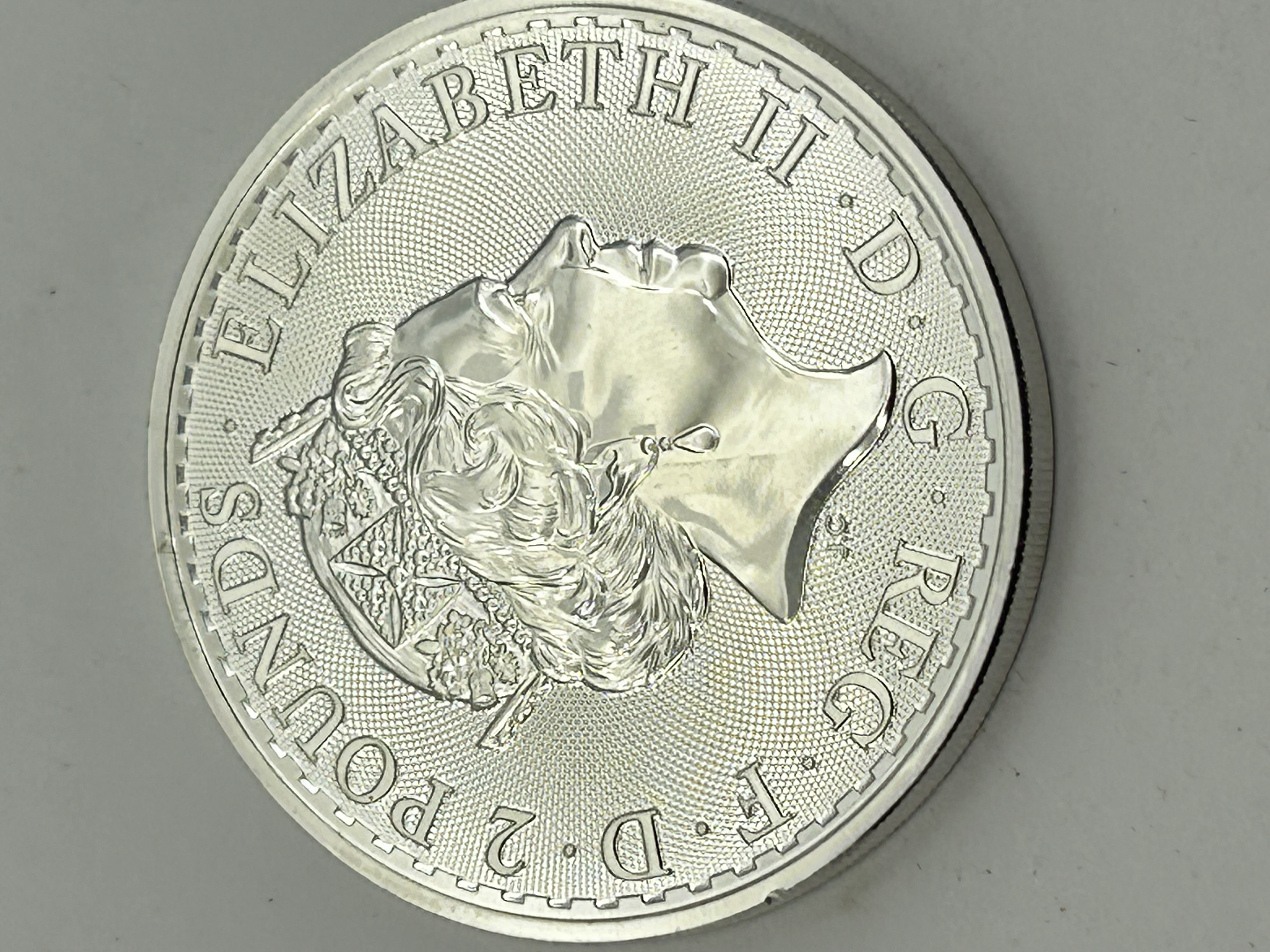 A 2019 British Britannia silver bullion coin struck in one of .999 fine silver. The obverse features the fifth definitive portrait of Queen Elizabeth II by Jody Clark, set against a guilloché pattern with the legend ELIZABETH II · D · G · REG · F · D · 2 POUNDS. The reverse depicts the standing personification of Britannia holding a trident and a shield bearing the Union flag, set against a textured radial background and inscribed BRITANNIA · 2019 ·