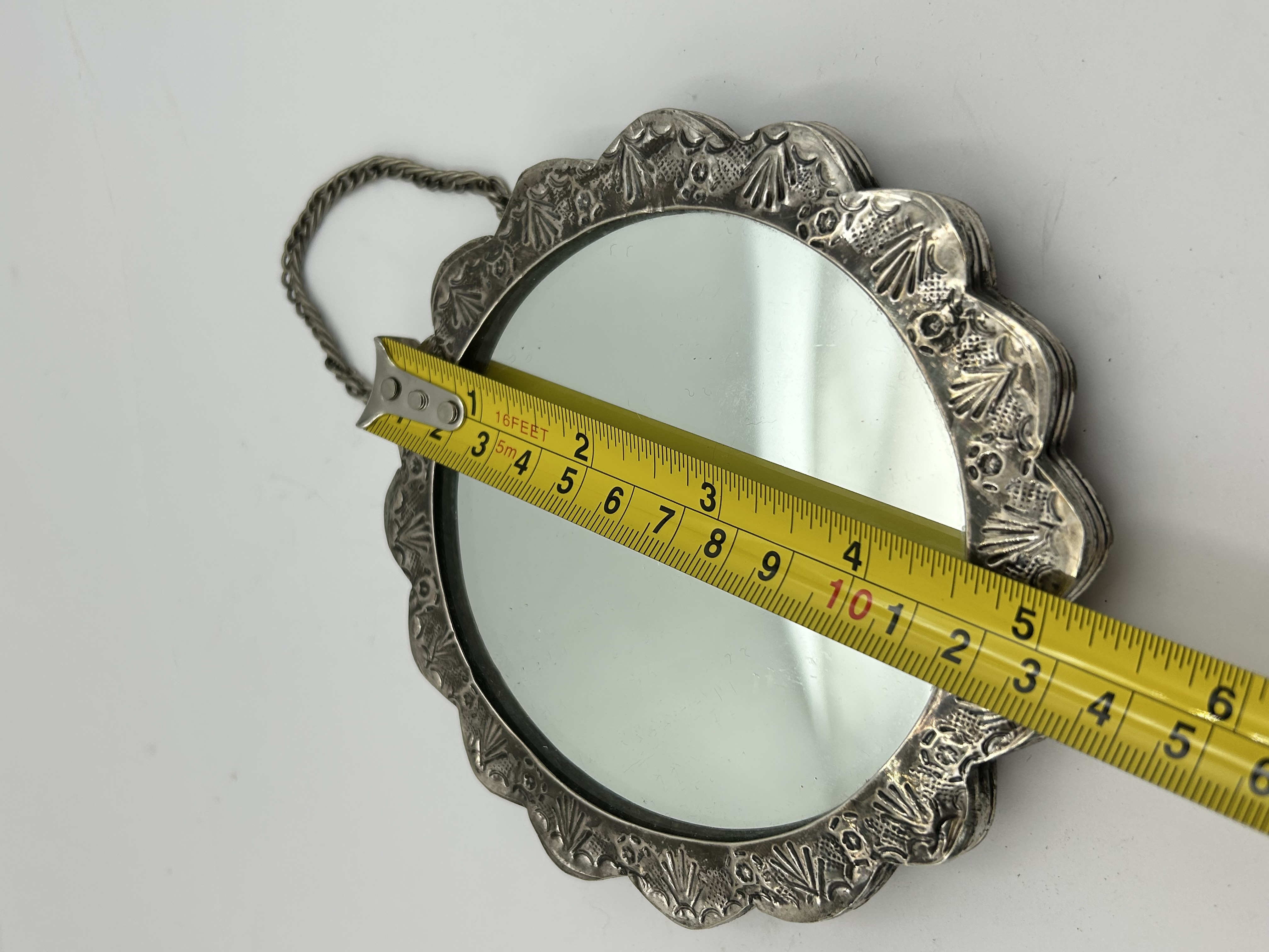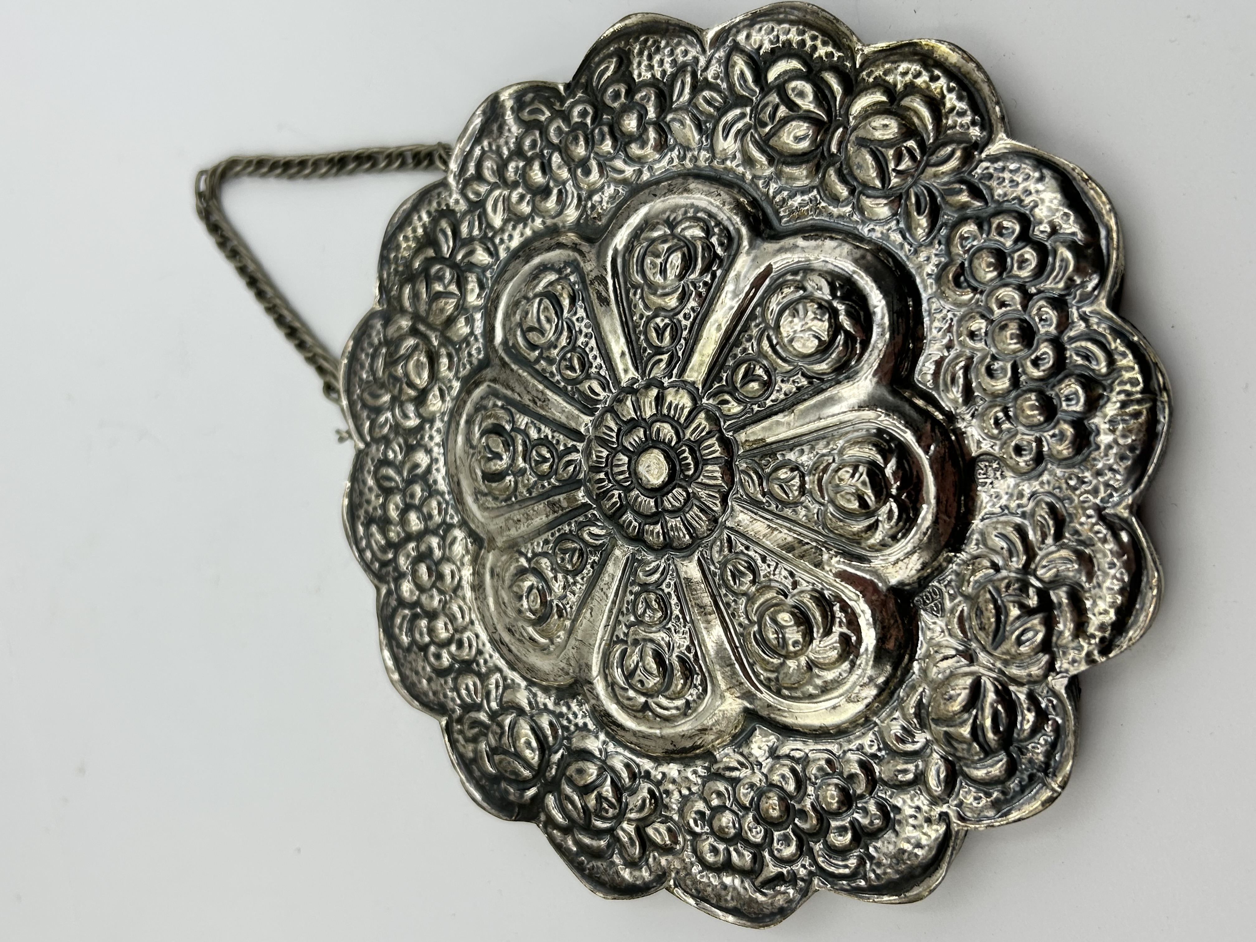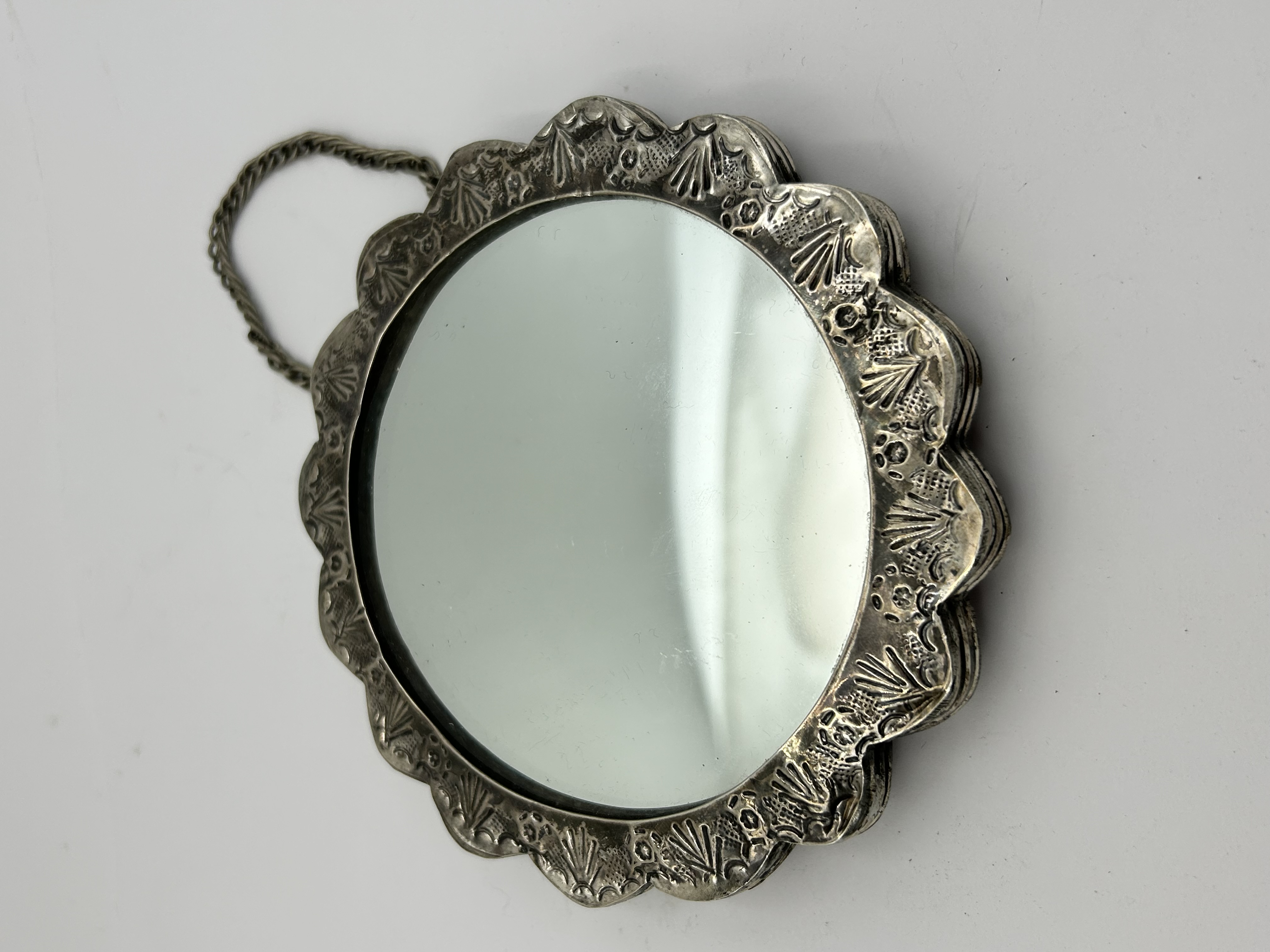 A Turkish 900 silver wedding mirror, frequently attributed to the maker Bedo. The circular wall-hanging mirror features a scalloped frame decorated with repousse floral and botanical motifs. The reverse of the frame is heavily embossed with a central flower head surrounded by smaller blossoms and is stamped with a 900 fineness mark. A twisted wire chain is attached to the top for suspension.