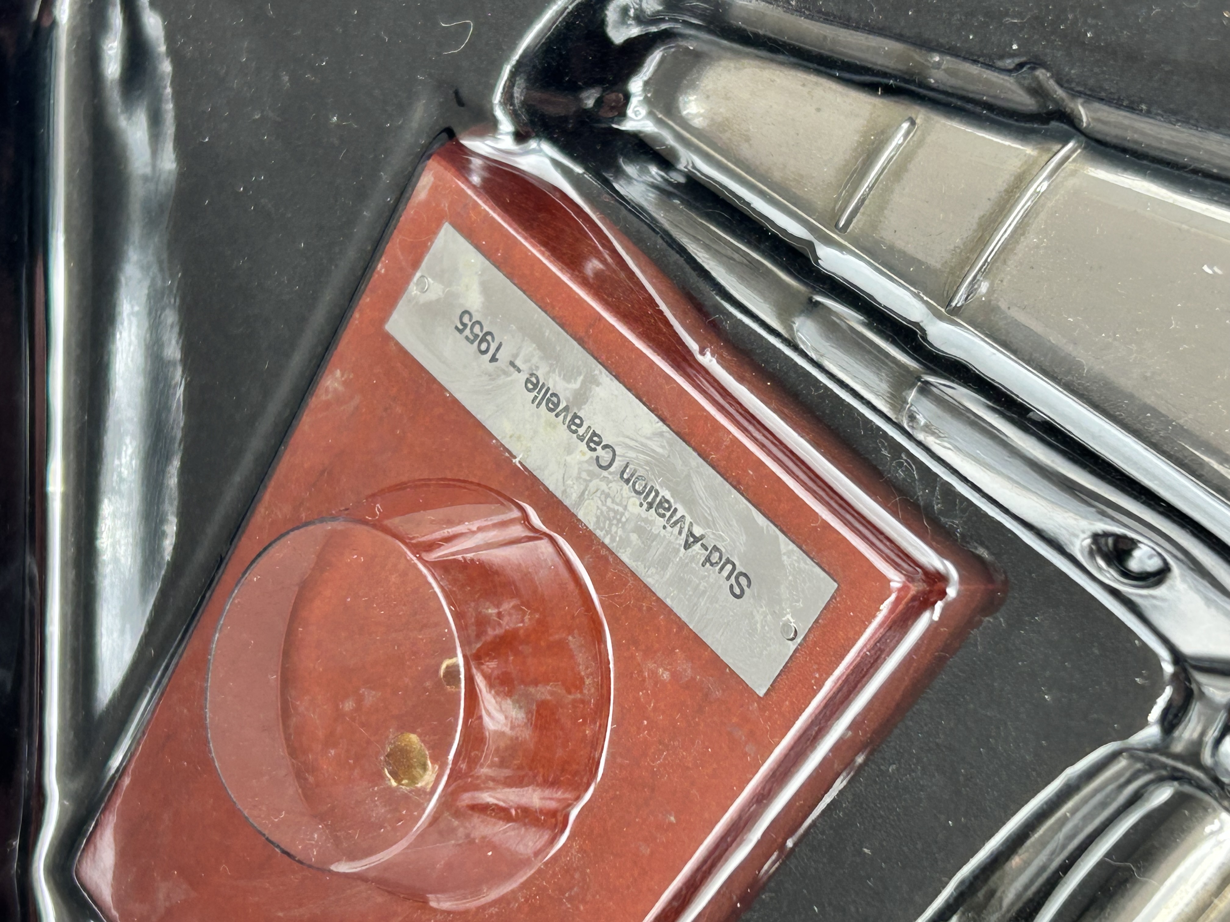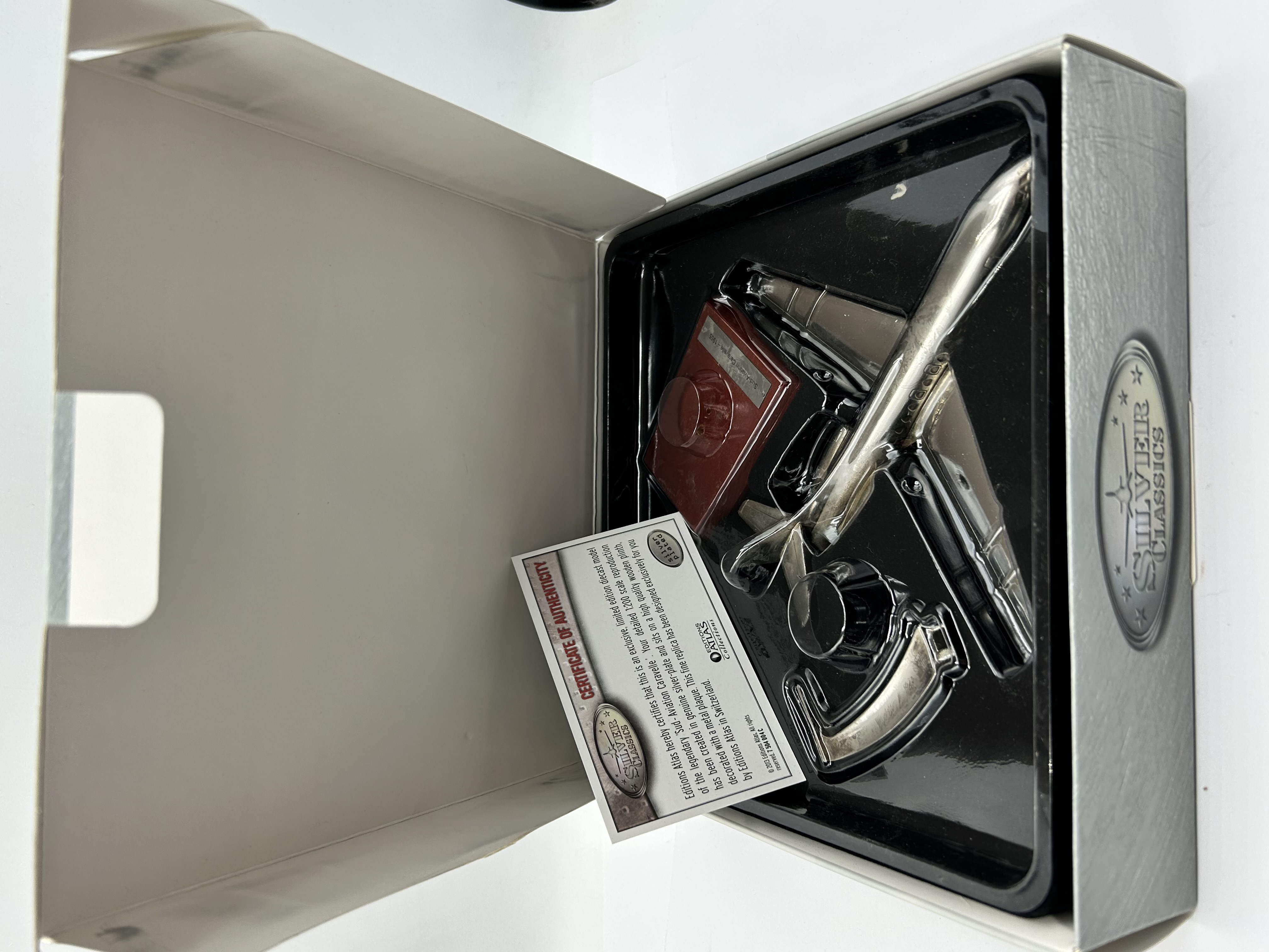 An Editions Atlas Silver Classics series diecast model airplane, representing a 1:200 scale reproduction of the Sud-Aviation Caravelle from 1955. The model is constructed from silver-plated metal and features a polished, reflective finish. The lot includes a wooden display plinth with an inset metal plaque engraved with the text Sud-Aviation Caravelle – 1955. Also present is the original silver-toned presentation box with a black molded plastic interior insert and a Certificate of Authenticity certifying the item as an exclusive, limited edition reproduction by Editions Atlas.