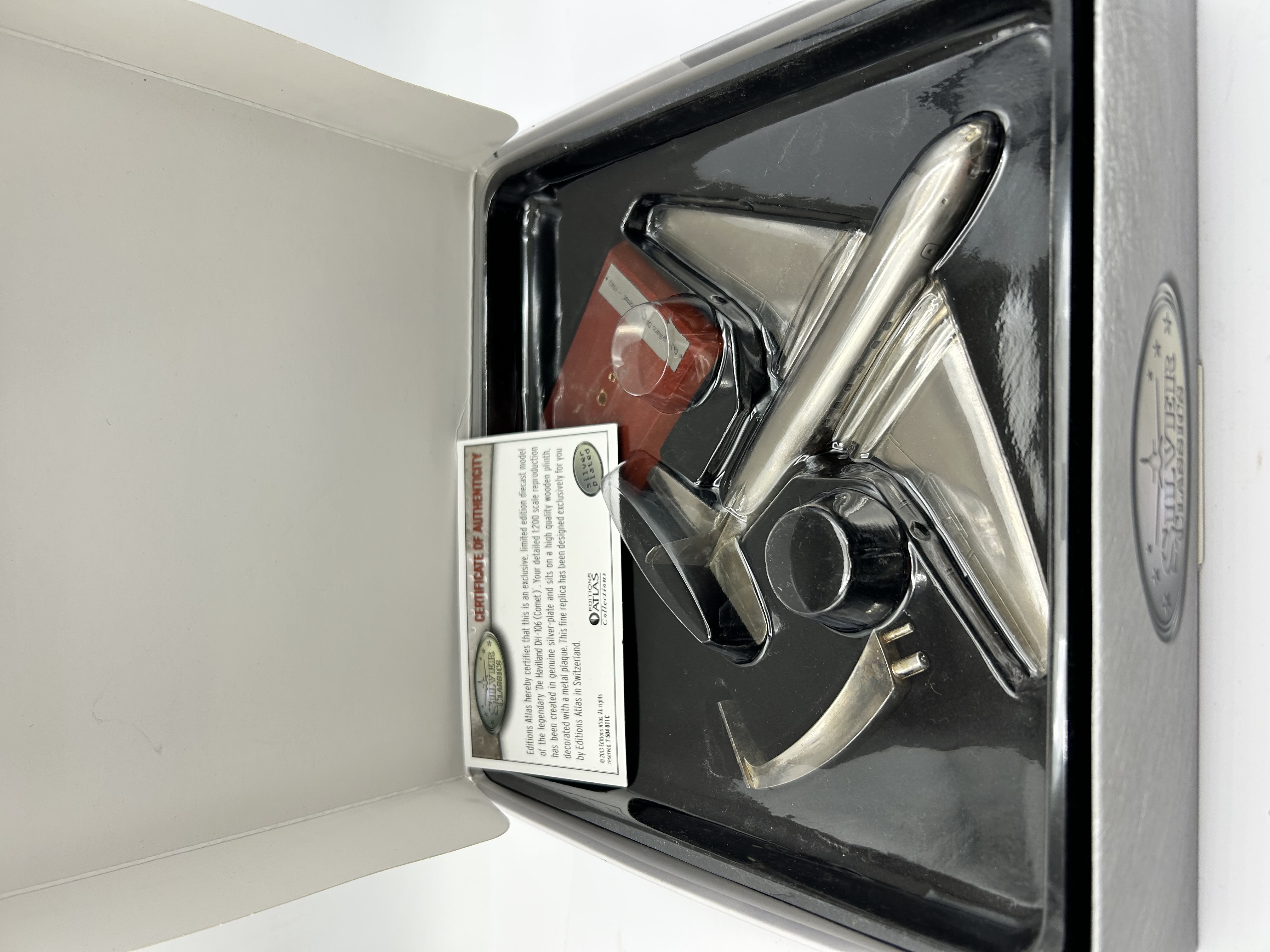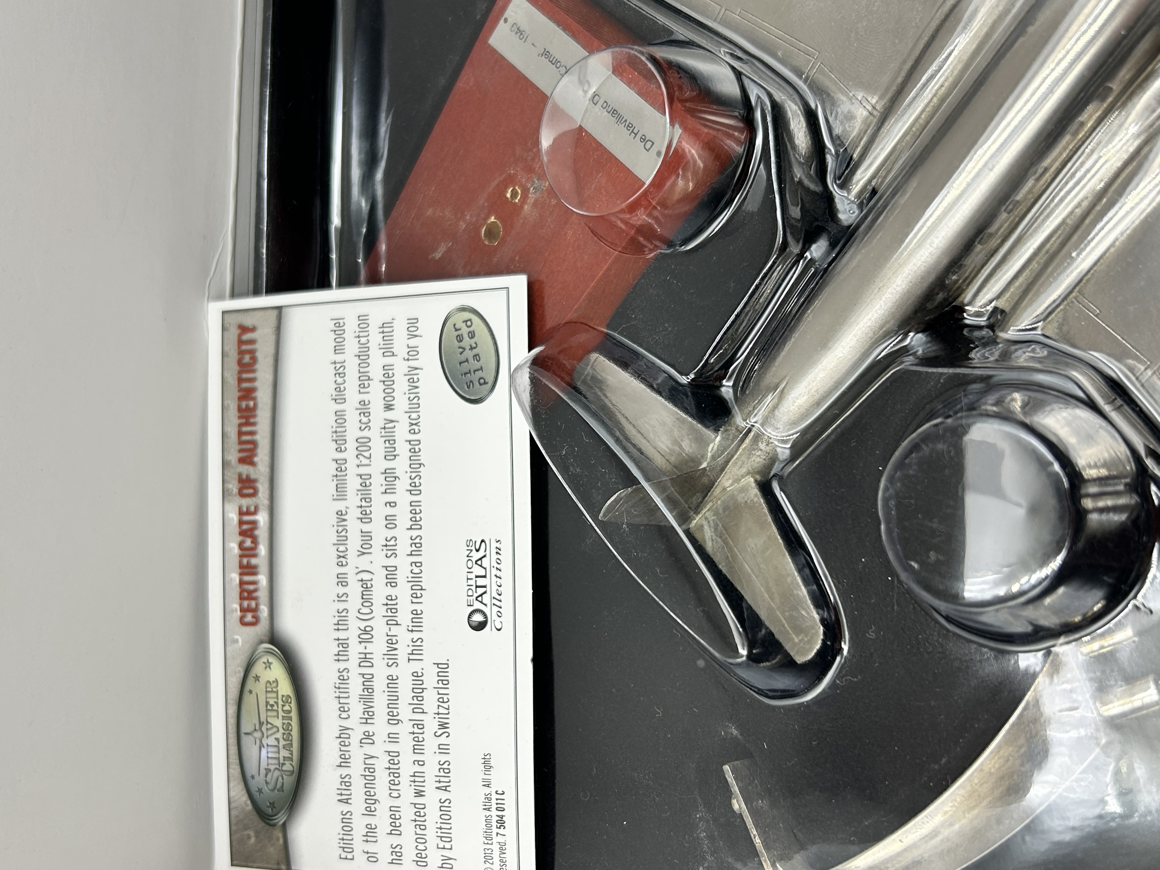 A silver-plated diecast metal model of a De Havilland DH-106 Comet aircraft, produced by Editions Atlas Collections as part of the Silver Classics series. The 1:200 scale reproduction features a polished silver-plated finish. The model is accompanied by a wooden display plinth featuring an engraved metal identification plaque and a printed Certificate of Authenticity dated 2013. The certificate identifies the piece as an exclusive limited edition reproduction designed in Switzerland. The item is presented in its original retail packaging with a custom-molded plastic insert.
