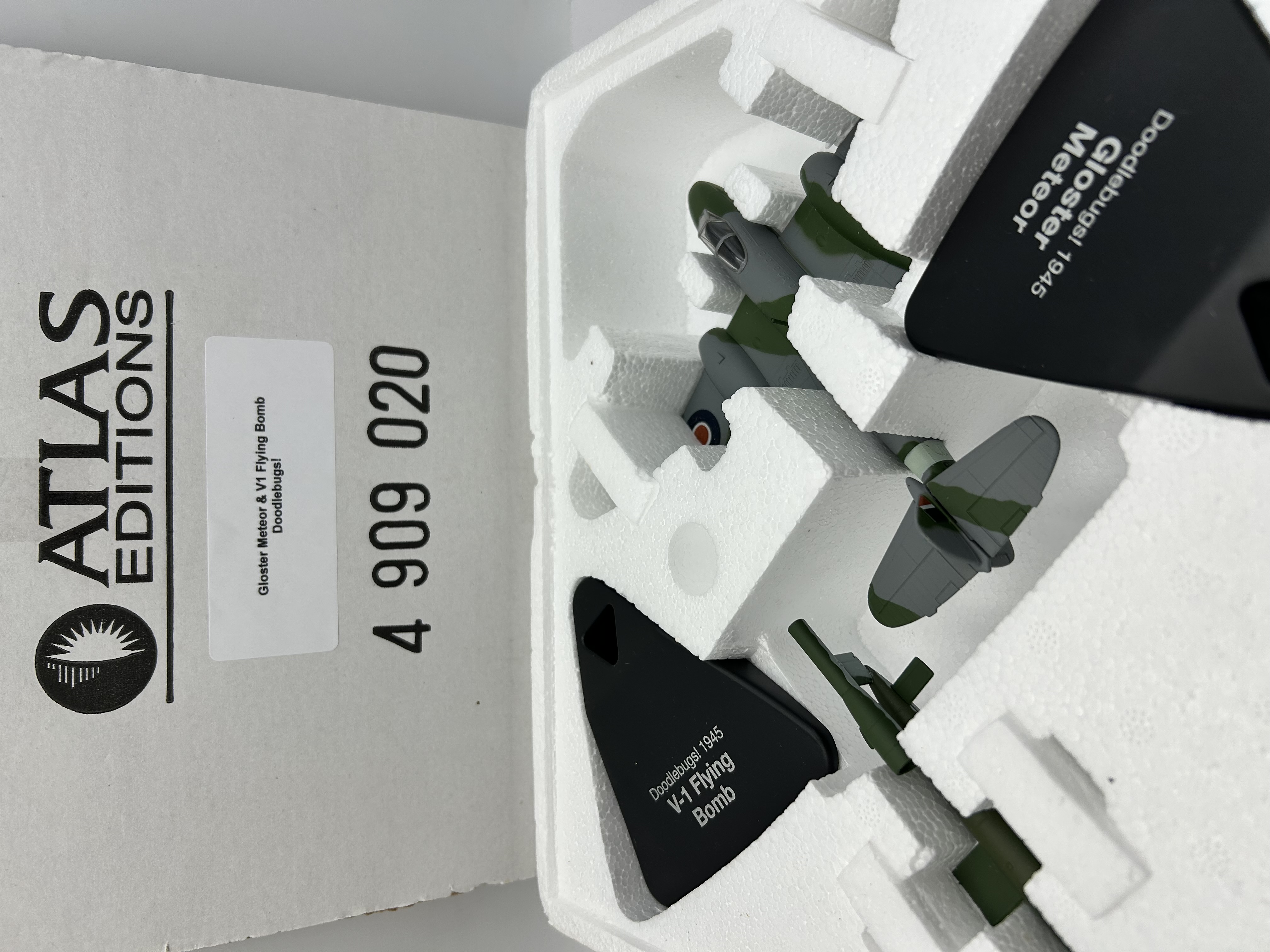 Two Atlas Editions die-cast model aircraft from the Doodlebugs! 1945 series, comprising a Gloster Meteor and a V-1 Flying Bomb. The models feature die-cast construction with a period-accurate two-tone green and gray camouflage finish. The Gloster Meteor is detailed with RAF roundel markings. Included are two black plastic display stands with white printed identifiers for each craft. The items are contained within their original branded white cardboard box, bearing item number 4 909 020, and are secured in the original polystyrene insert.