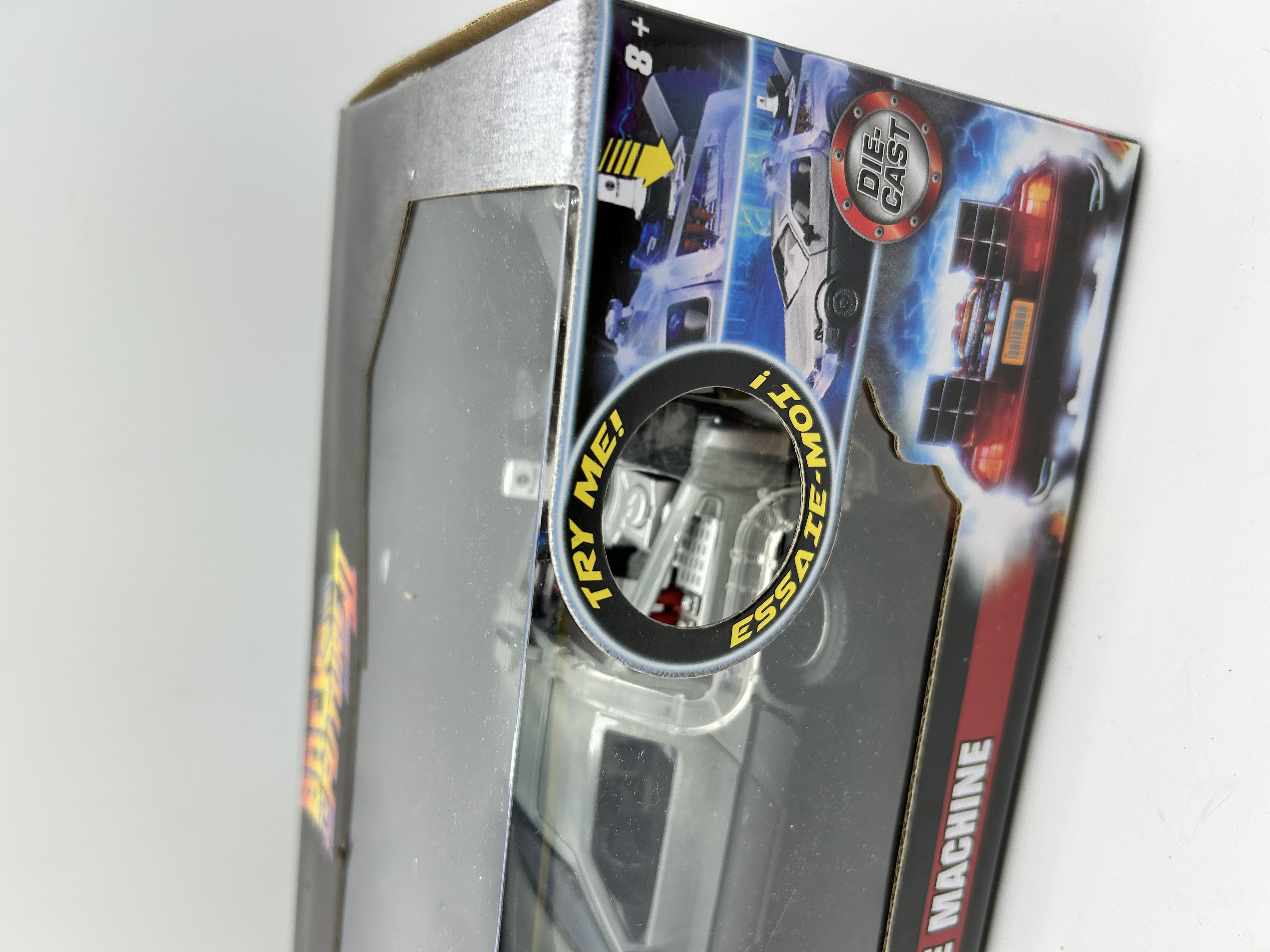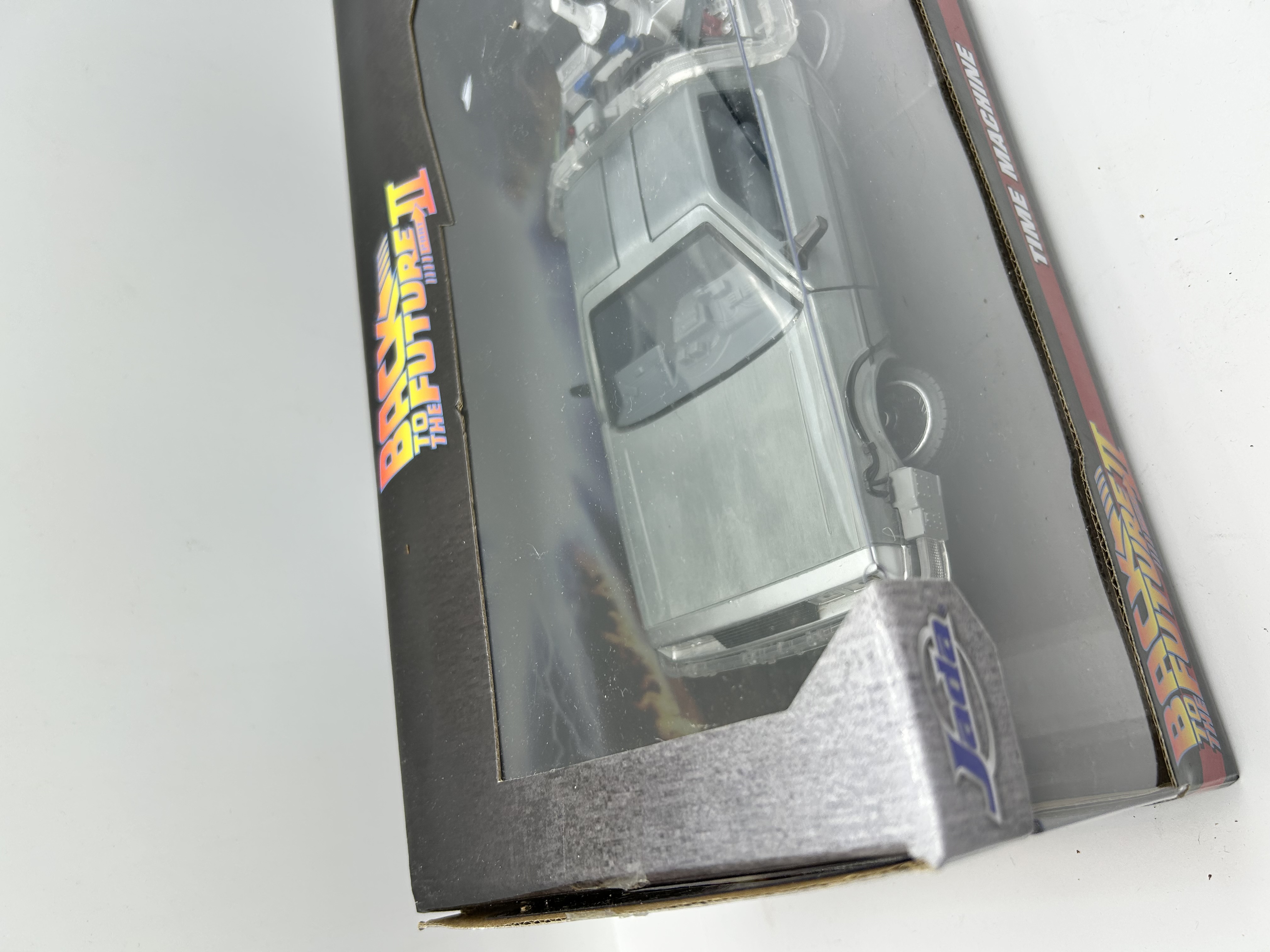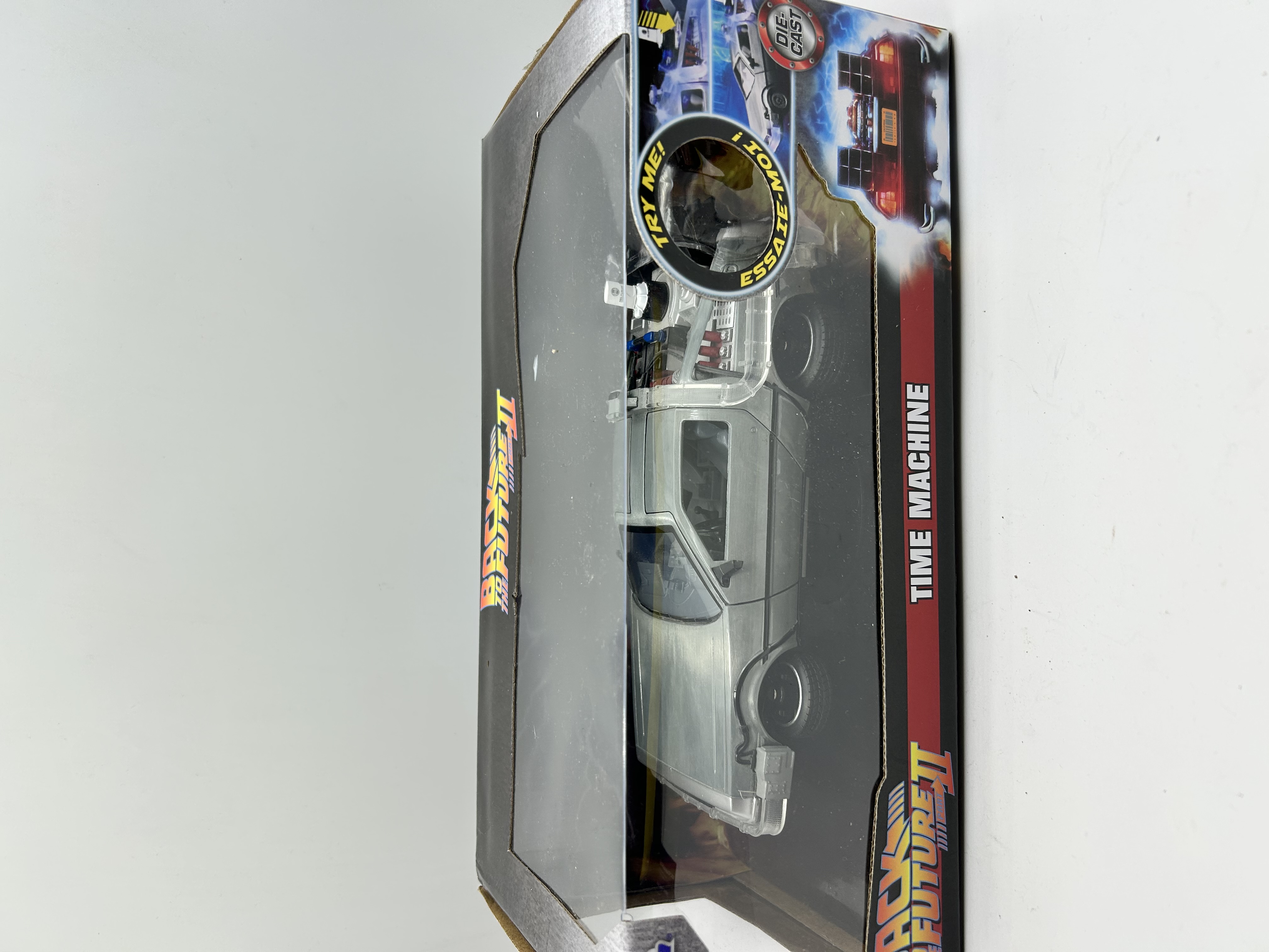 A Jada Toys 1:24 scale die-cast metal model of the Time Machine DeLorean as featured in the film Back to the Future Part II. The vehicle is finished in a silver-tone metallic paint and features movie-accurate detailing, including the Mr. Fusion reactor and external wiring. The model is presented in its original retail window-box packaging decorated with franchise graphics and logos. The packaging includes interactive Try Me prompts indicating light or sound features.