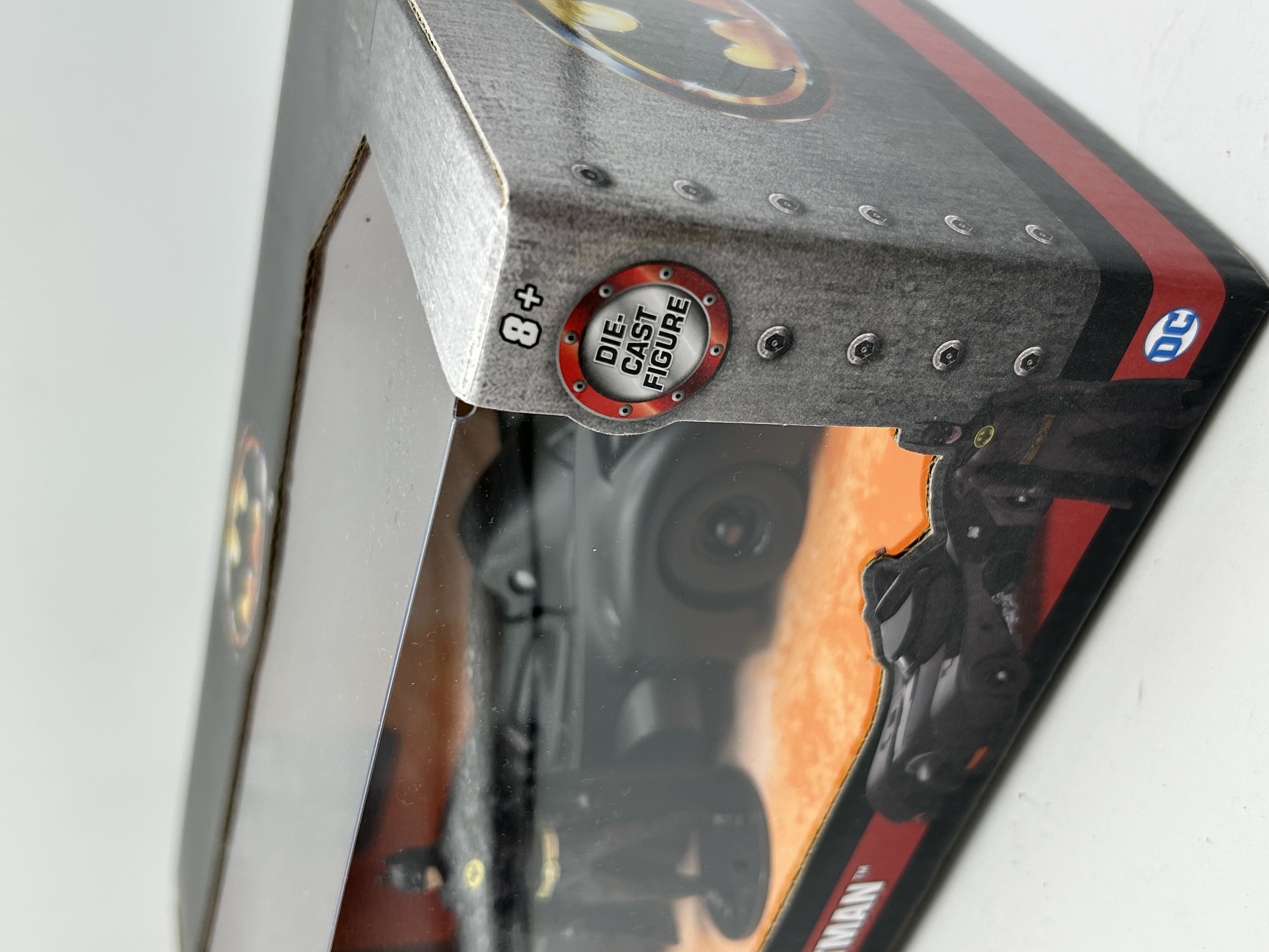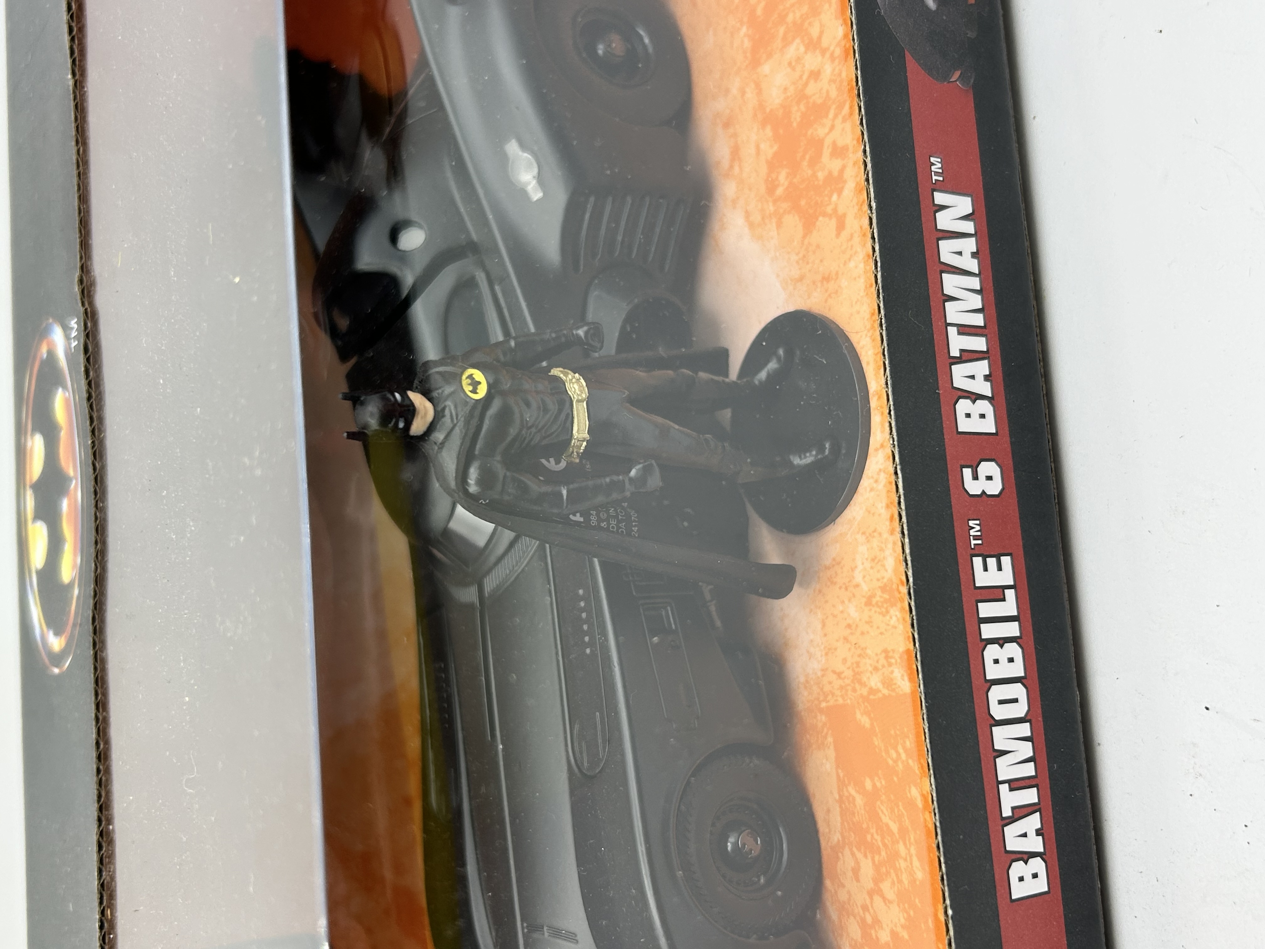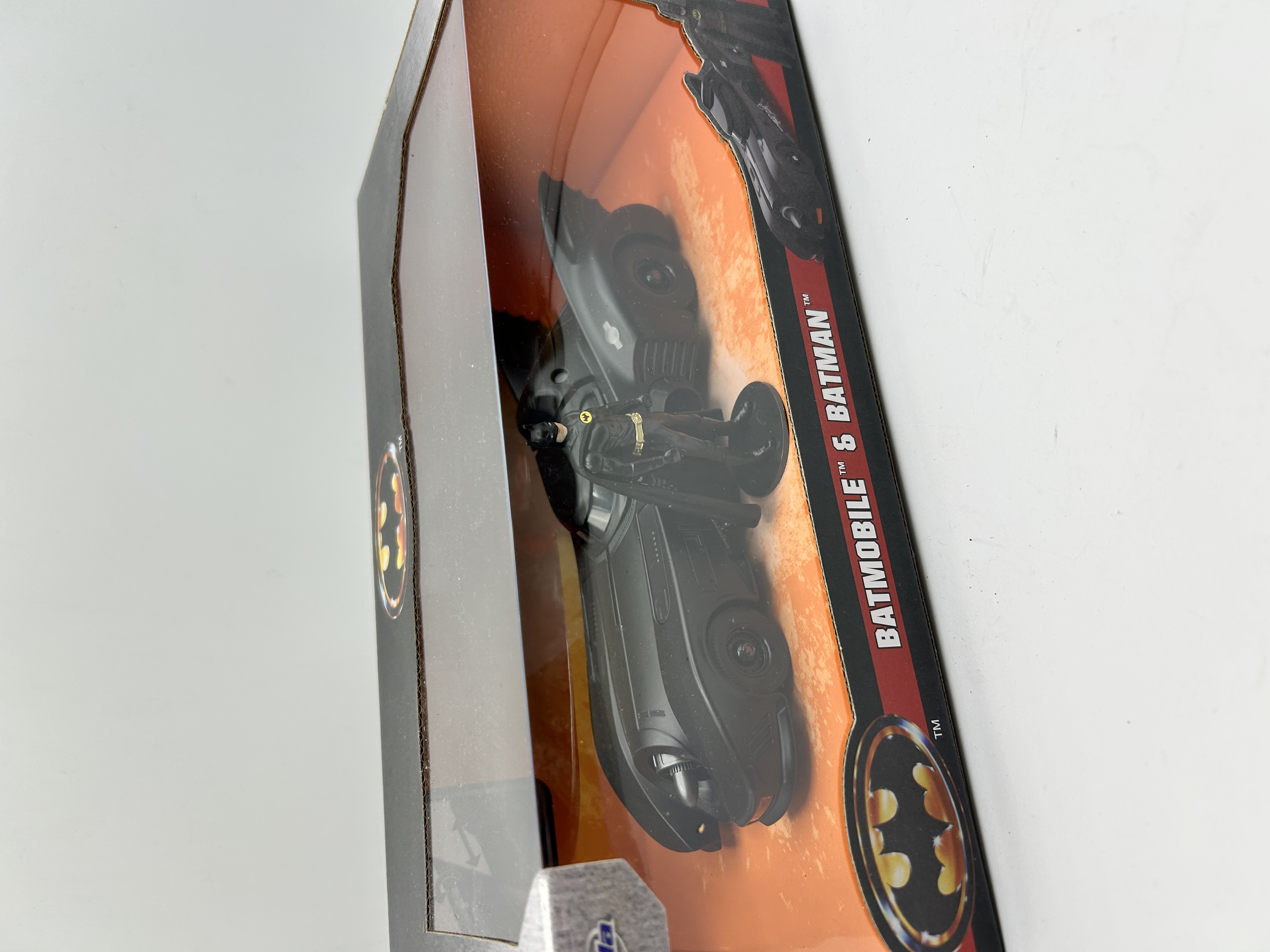 Jada Toys Hollywood Rides 1989 Batmobile and Batman figure set. This collectible features a die-cast metal model of the Batmobile from the 1989 film alongside a coordinated Batman figure. Both components are finished in matte black. The Batman figure includes a yellow bat emblem and utility belt. The set is contained within its original retail window box, which displays DC Comics branding and a Die-Cast Figure sticker.