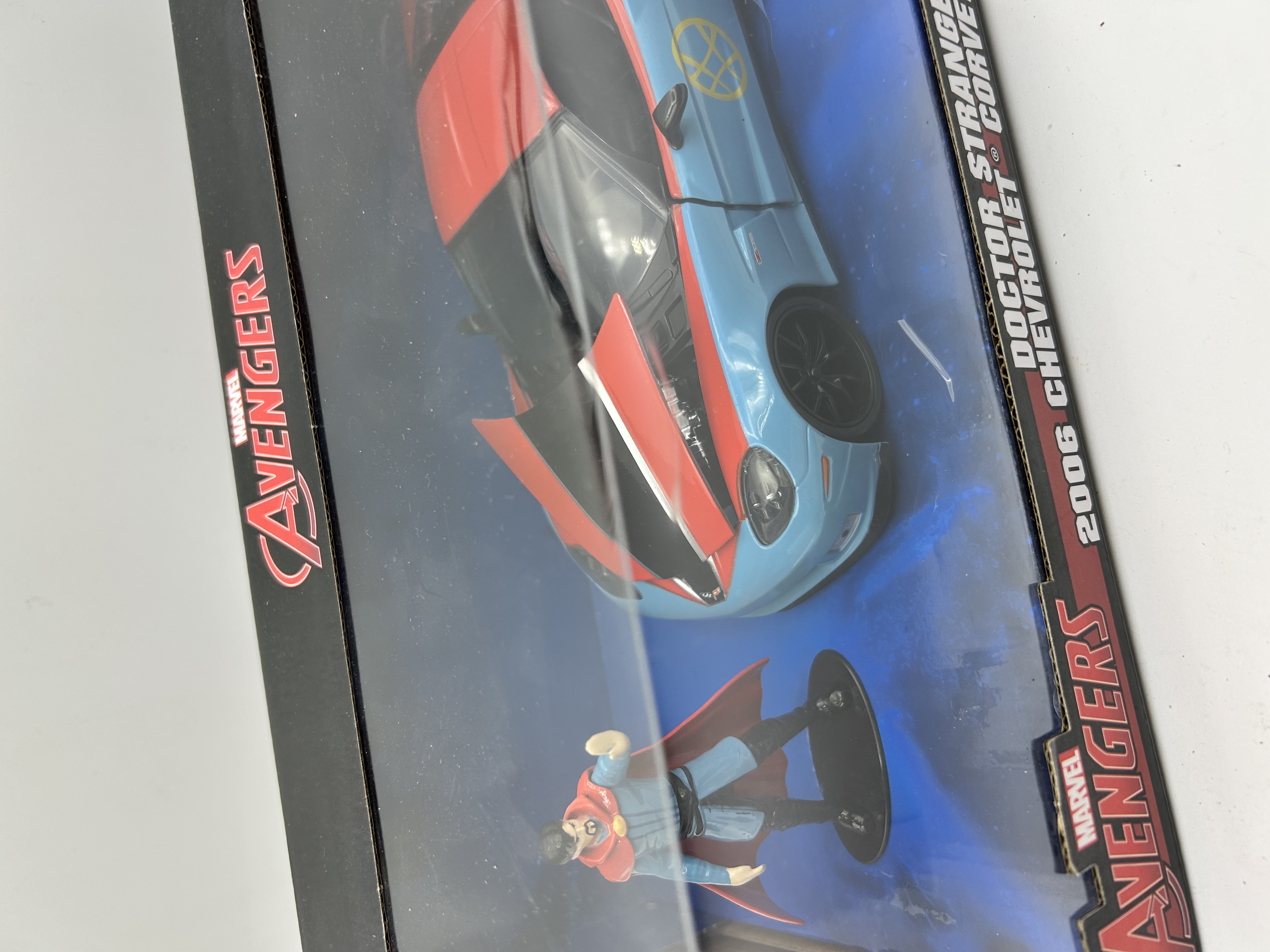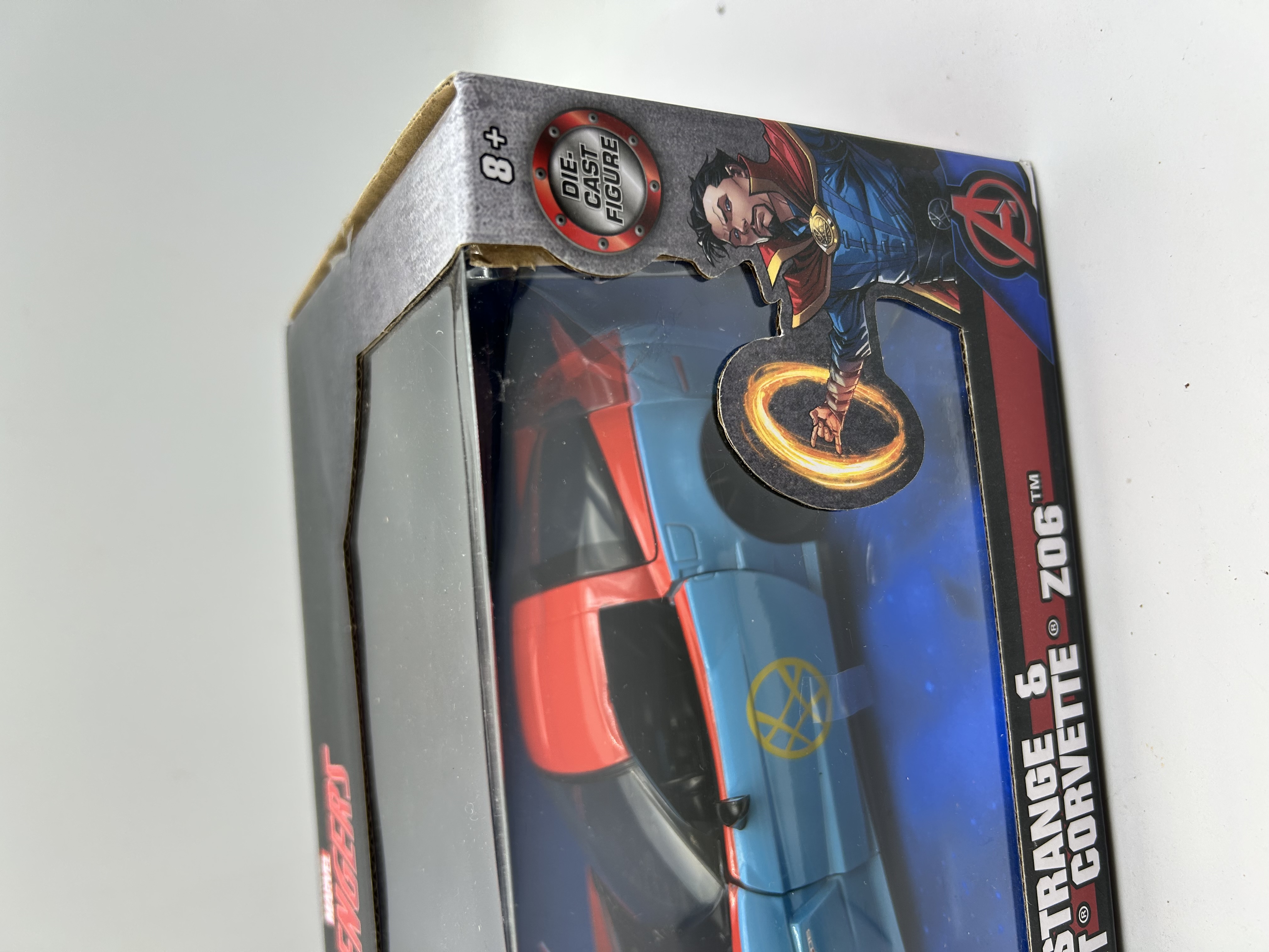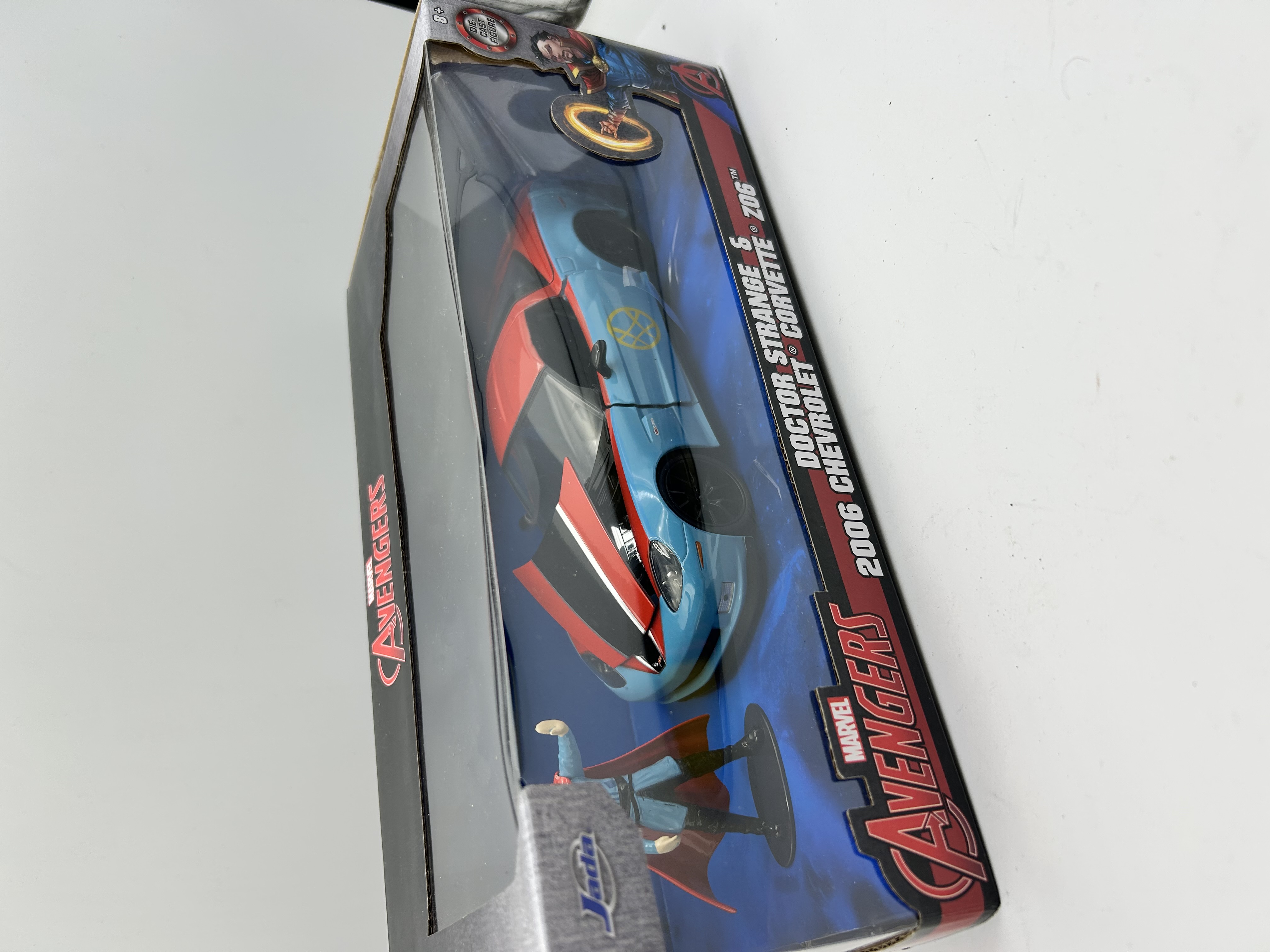 A Jada Toys Marvel Avengers die-cast vehicle and figure set featuring a 1/24 scale 2006 Chevrolet Corvette Z06 and a Doctor Strange figurine. The vehicle is finished in a light blue and red color scheme with the yellow Seal of Vishanti emblem on the door and features an opening hood. It is accompanied by a small, posed die-cast figure of the character Doctor Strange in his signature blue tunic and red cloak. The set is housed in its original retail window box, which includes branding for Marvel Avengers and Jada, and specifies the set is for ages 8 and up.
