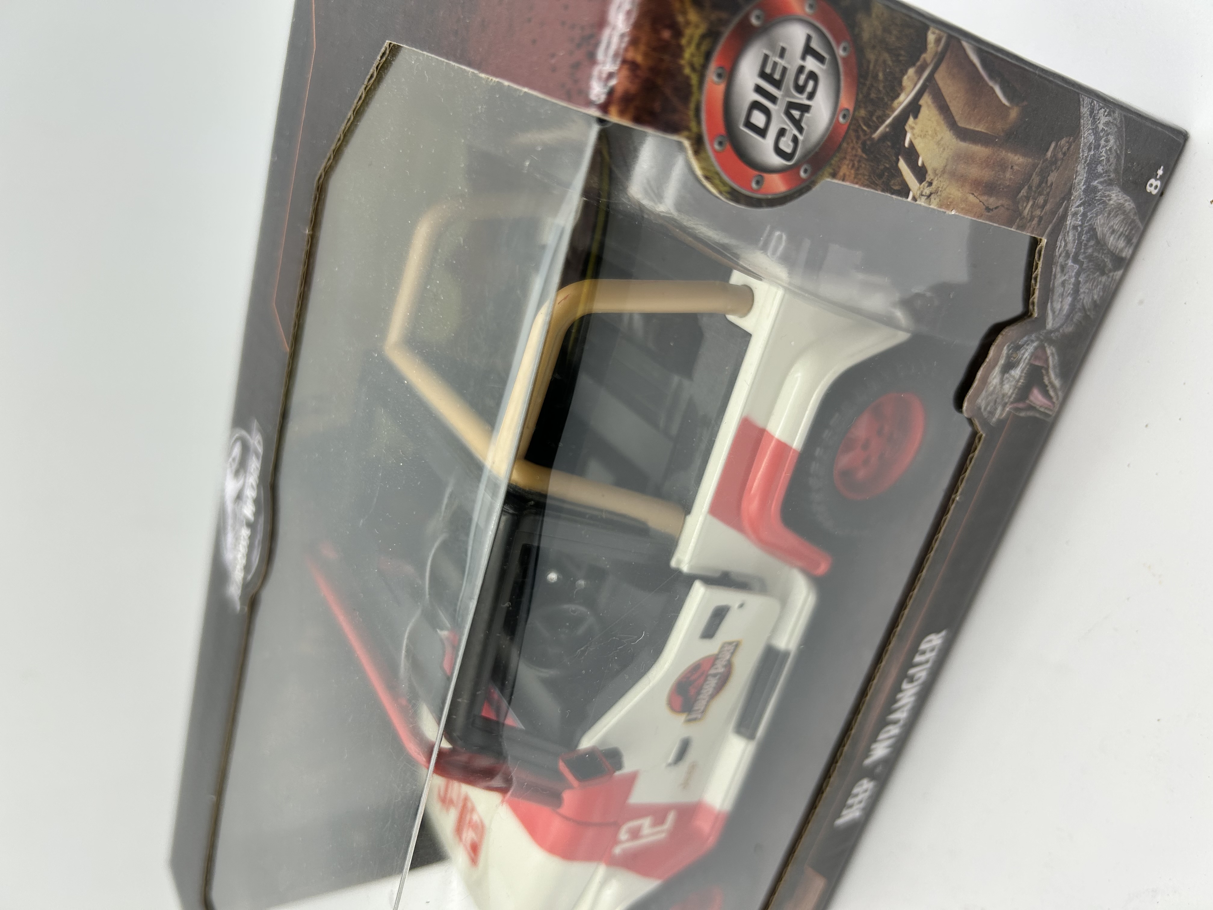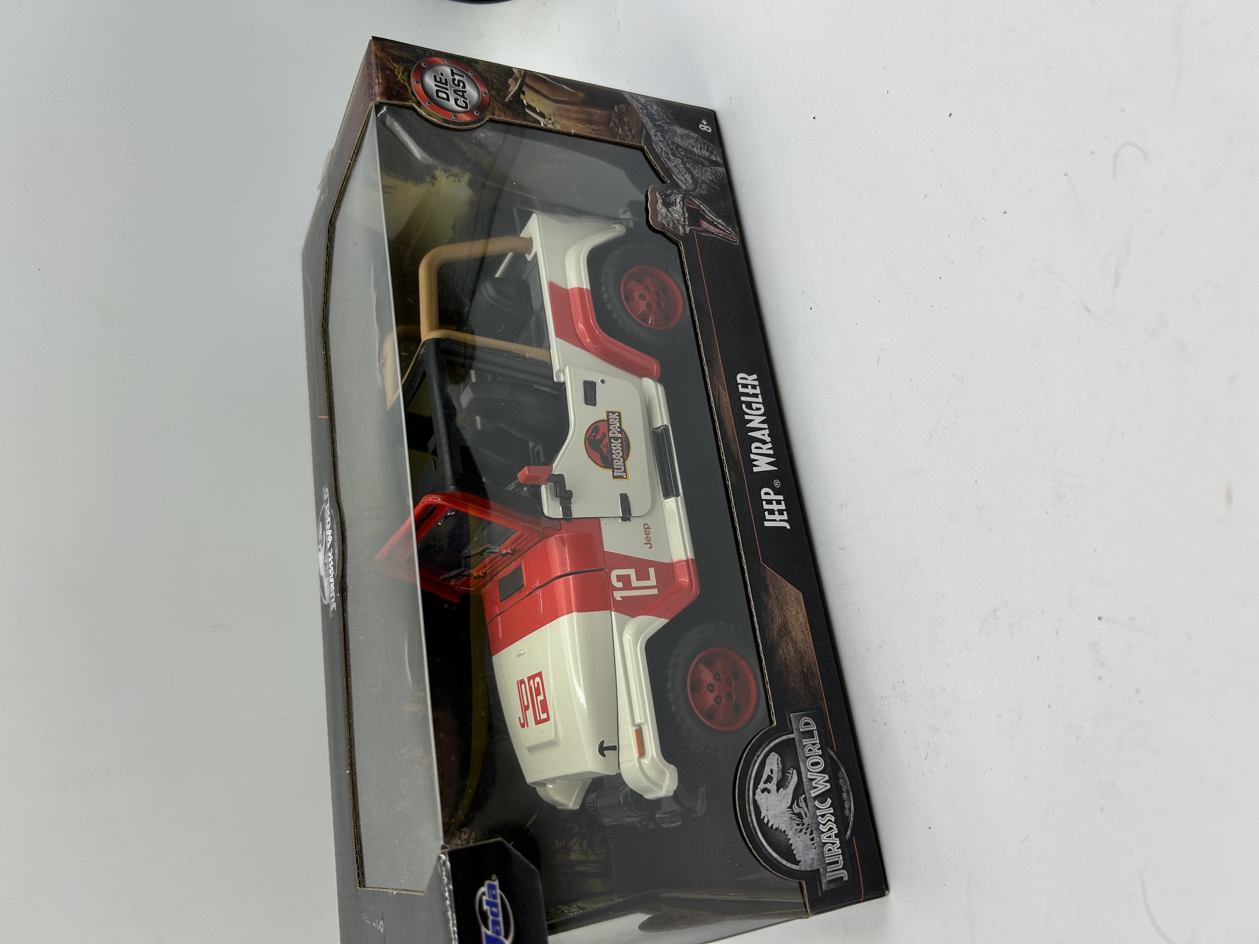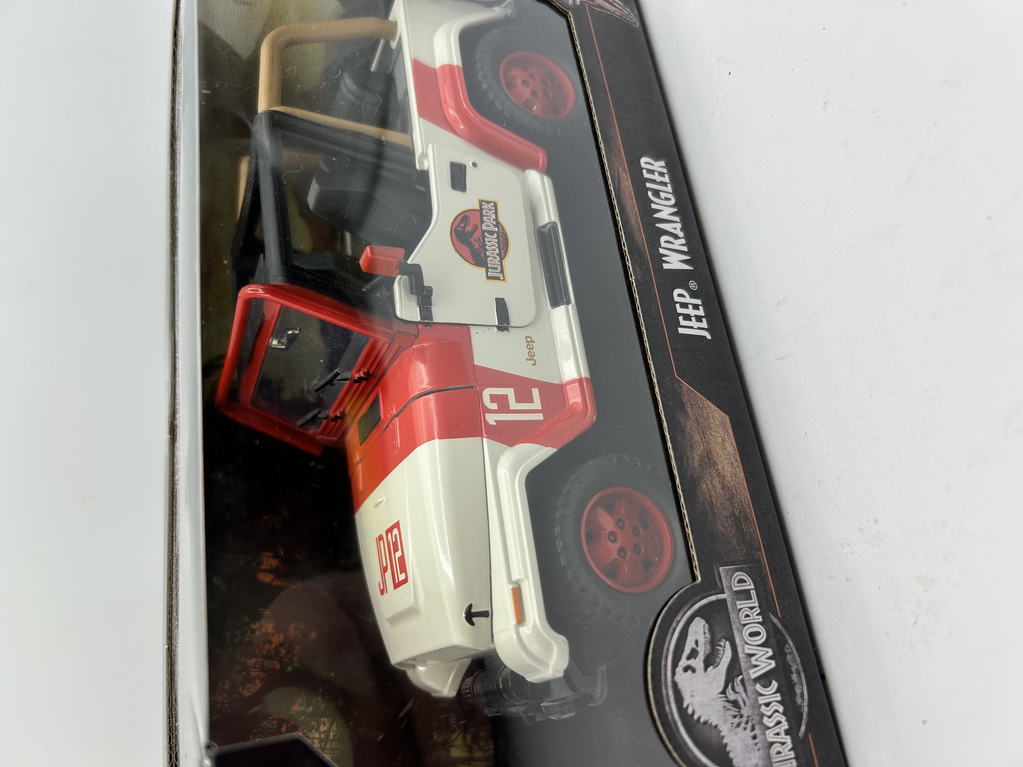 A Jada Toys Hollywood Rides series die-cast model of a Jeep Wrangler, featuring the livery from the Jurassic Park film franchise. The vehicle is finished in white and red with the Jurassic Park logo and vehicle number JP12 on the hood and doors. The model includes a tan roll cage, red wheels, and interior detailing. It is housed in its original Jurassic World themed retail window box packaging labeled for ages 8 and up.