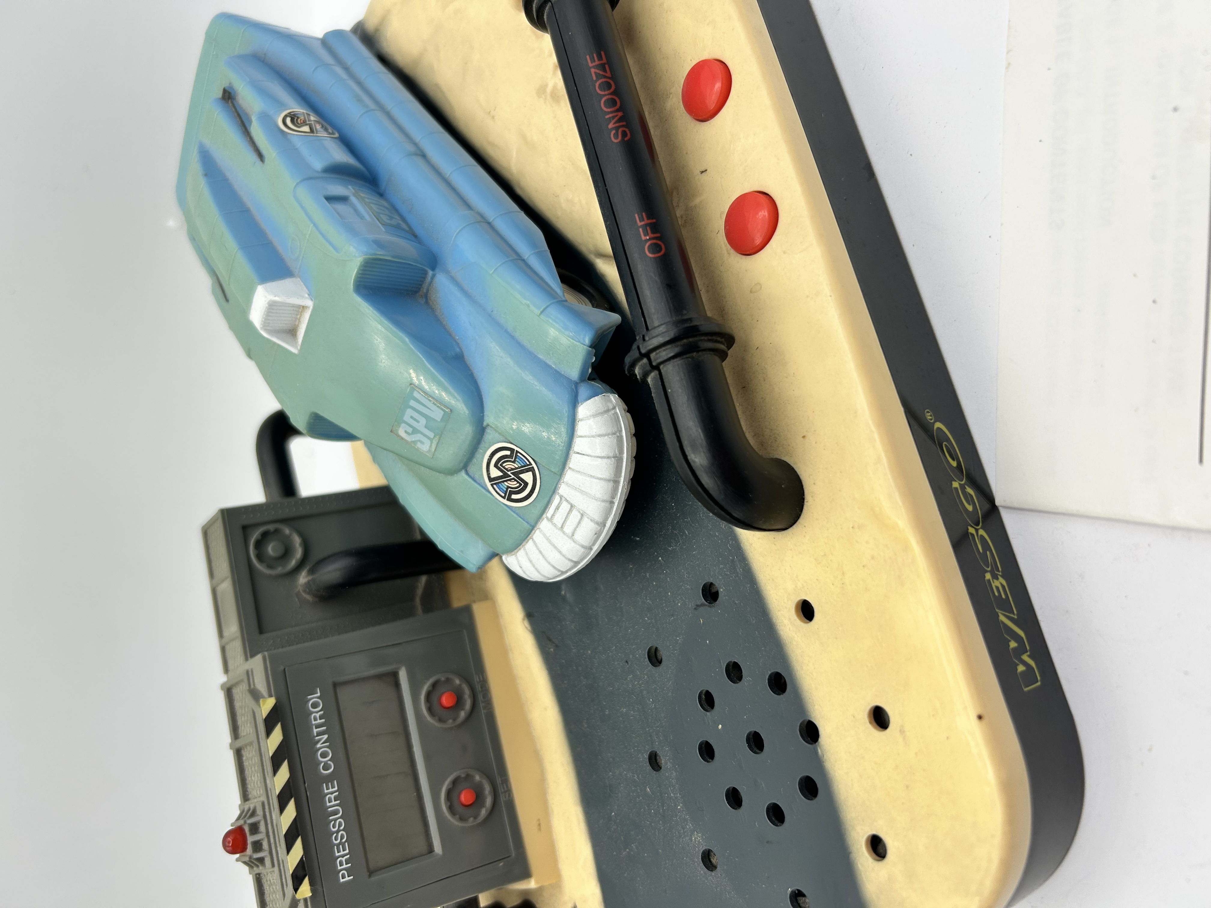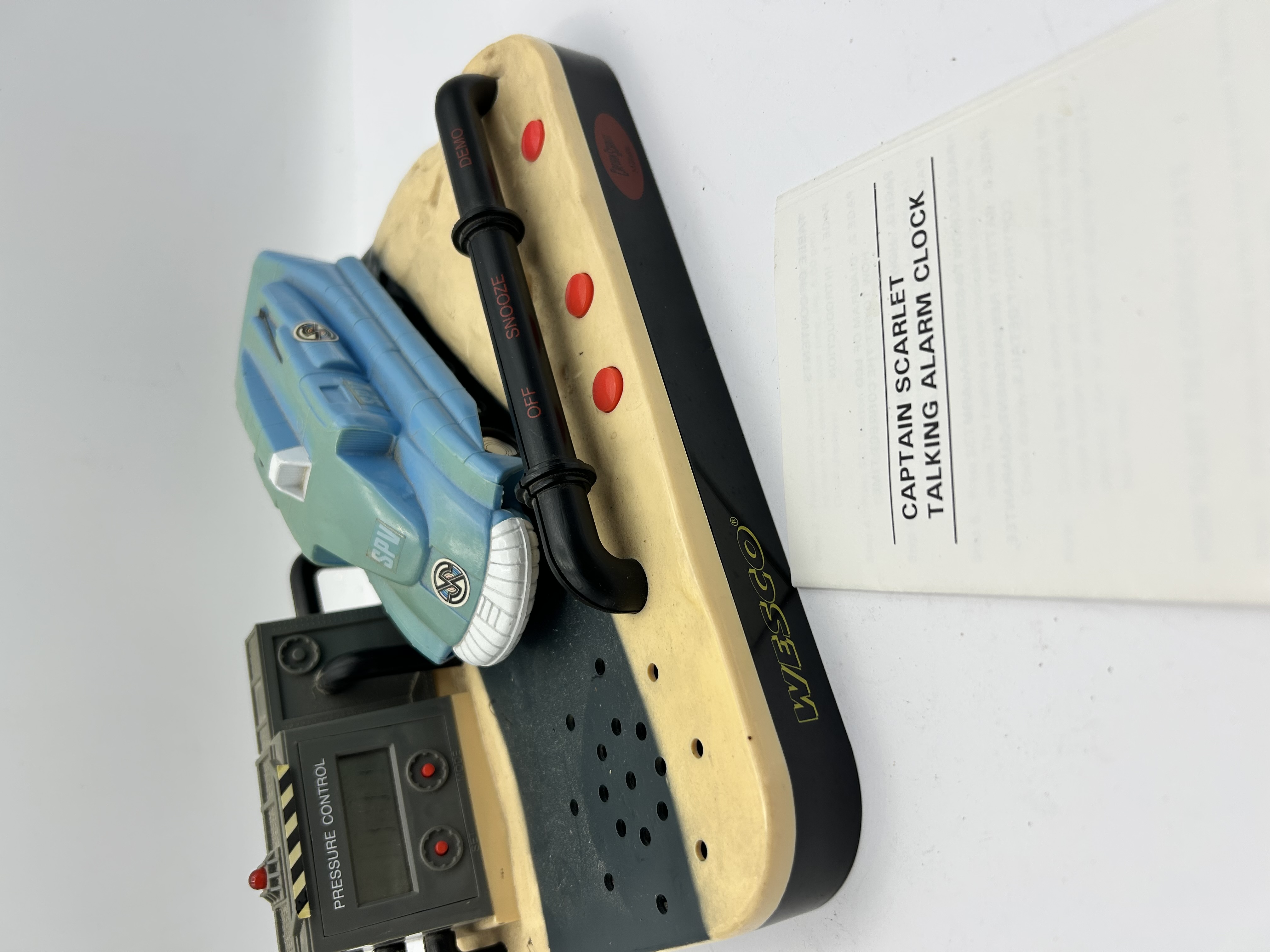 A Wesco Captain Scarlet talking alarm clock manufactured from molded plastic. The assembly features a model of the Spectrum Pursuit Vehicle (SPV) situated on a themed base. The base includes a digital display labeled Pressure Control, an integrated speaker, and red function buttons. A black decorative pipe section features red lettering for OFF, SNOOZE, and DEMO. The manufacturer mark WESCO is printed on the side of the base. This item is accompanied by the original printed instruction sheet.