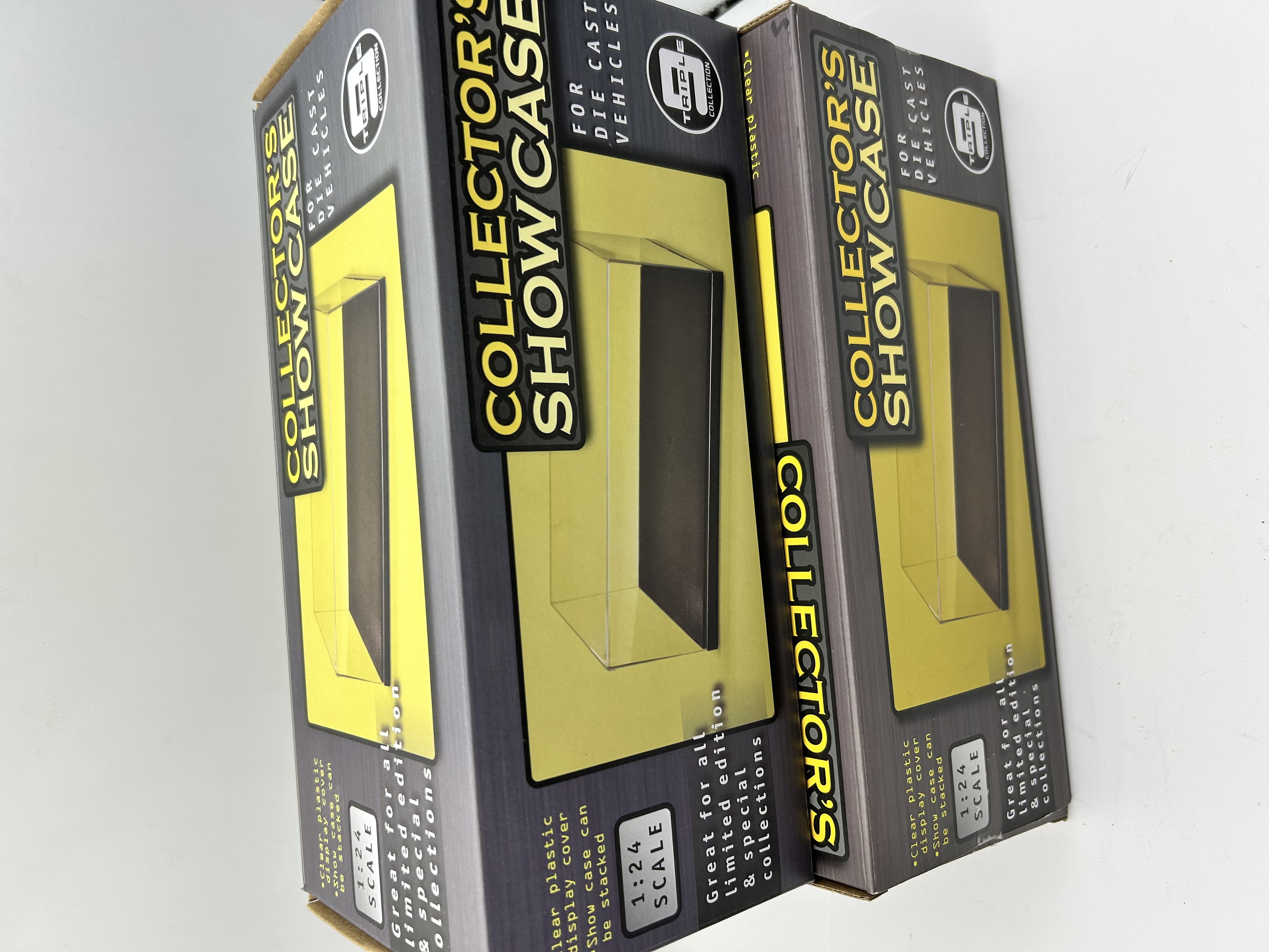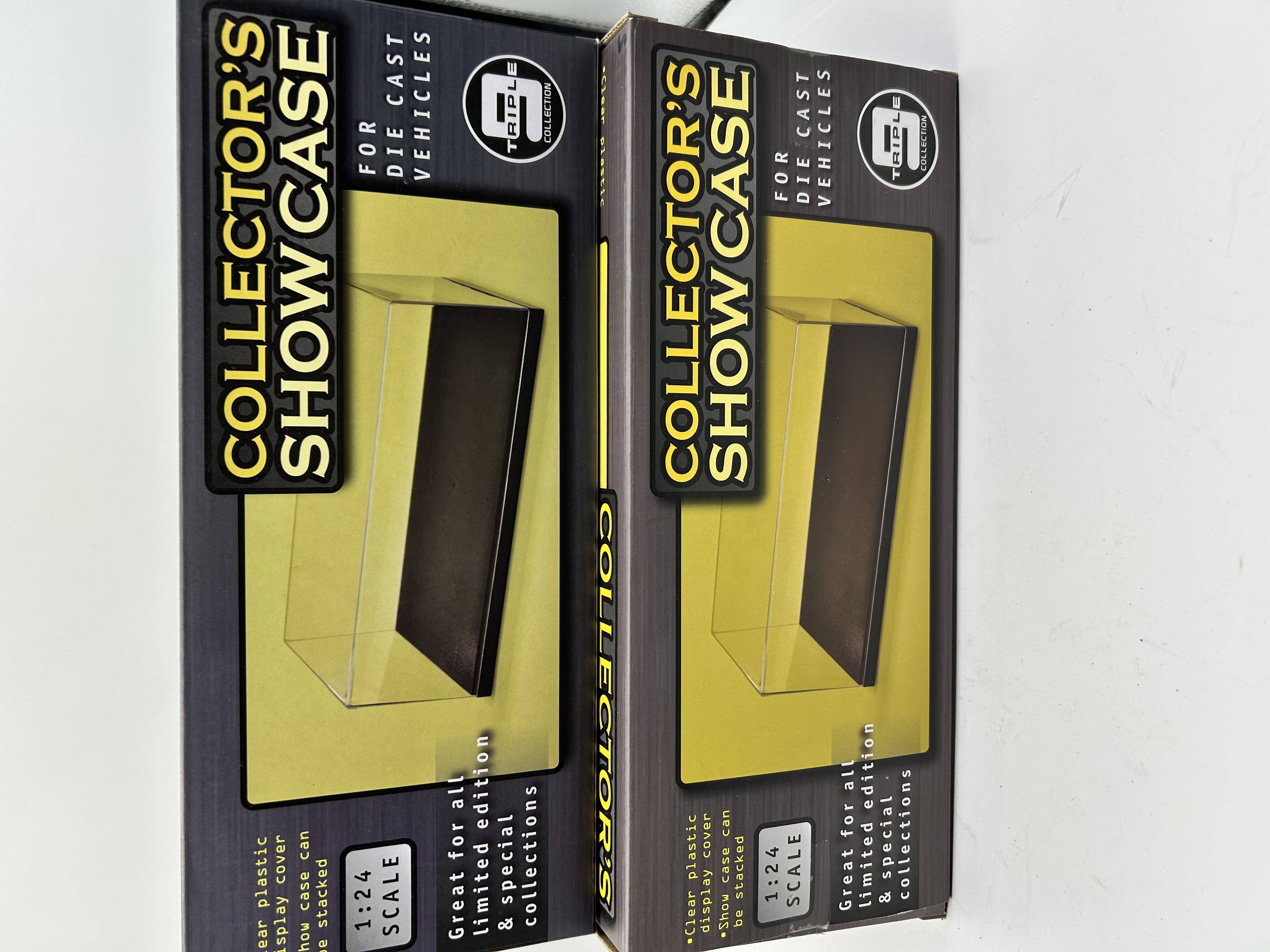 Two Triple 9 Collection Collector’s Showcase display boxes manufactured for 1:24 scale die-cast vehicles. Each unit consists of a clear plastic display cover and a base with a stackable design. The items are contained within their original dark gray and yellow retail packaging featuring the Triple 9 Collection branding and product specifications. The cases are intended for the protection and presentation of various collectibles.