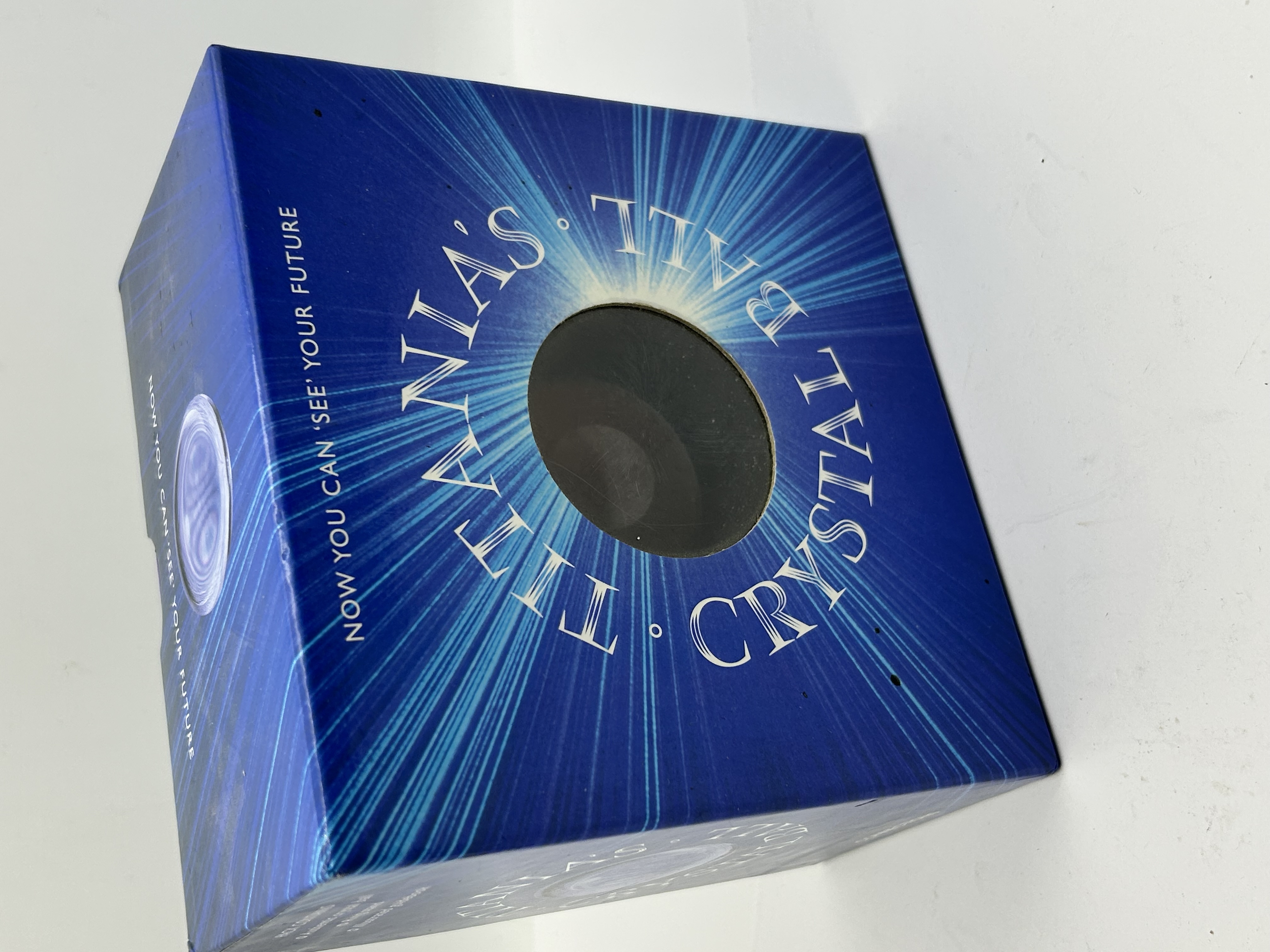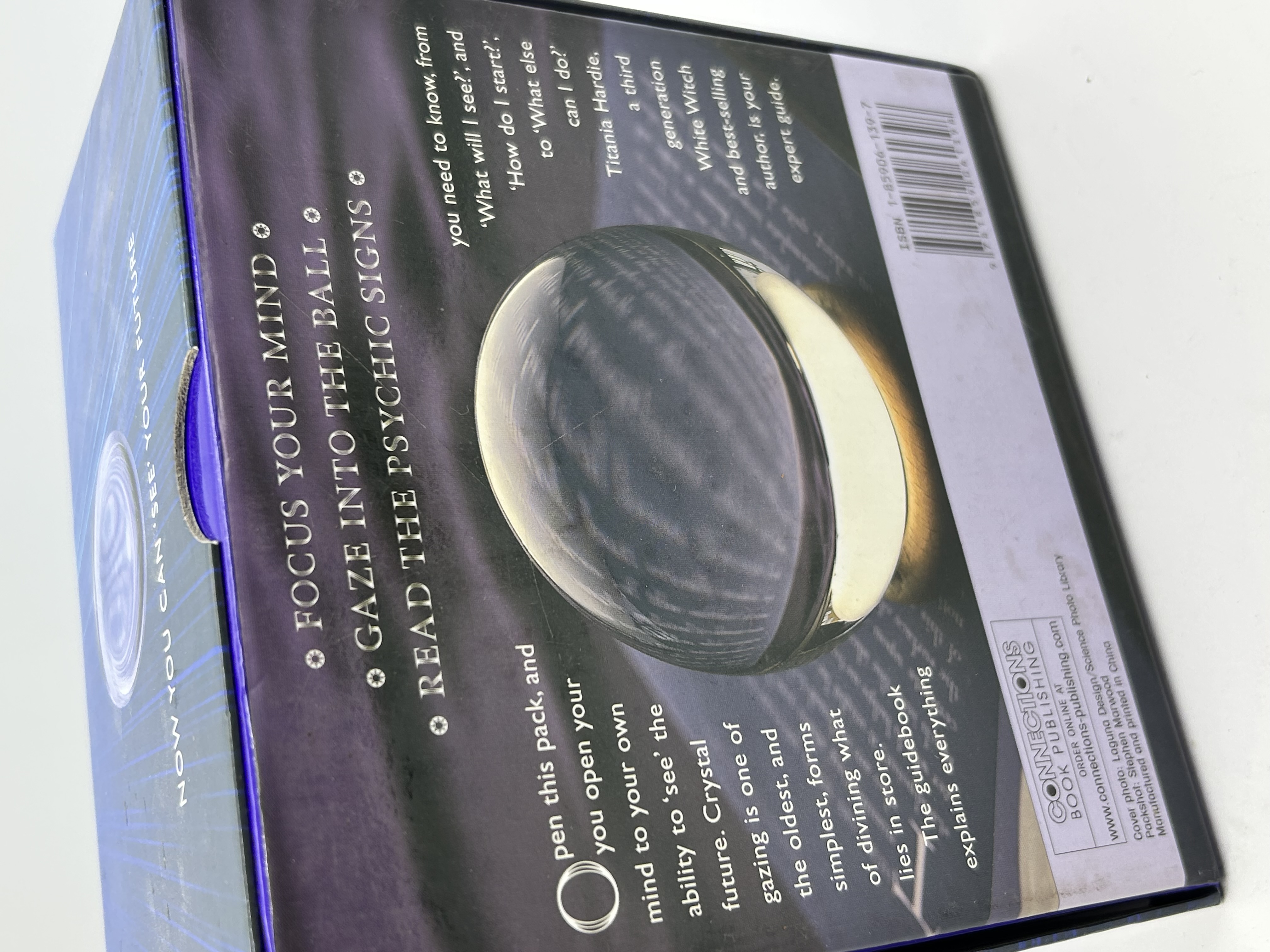 A Titania’s Crystal Ball kit by author Titania Hardie, published by Connections Book Publishing. The set is presented in its original blue-toned illustrated cardboard box featuring a circular cutout on the front panel. This kit includes a guidebook for crystal gazing, a crystal ball, and a stand. The reverse of the packaging displays the ISBN 1-85906-139-7 and provides a summary of the contents and the author’s background. The item was manufactured and printed in China.