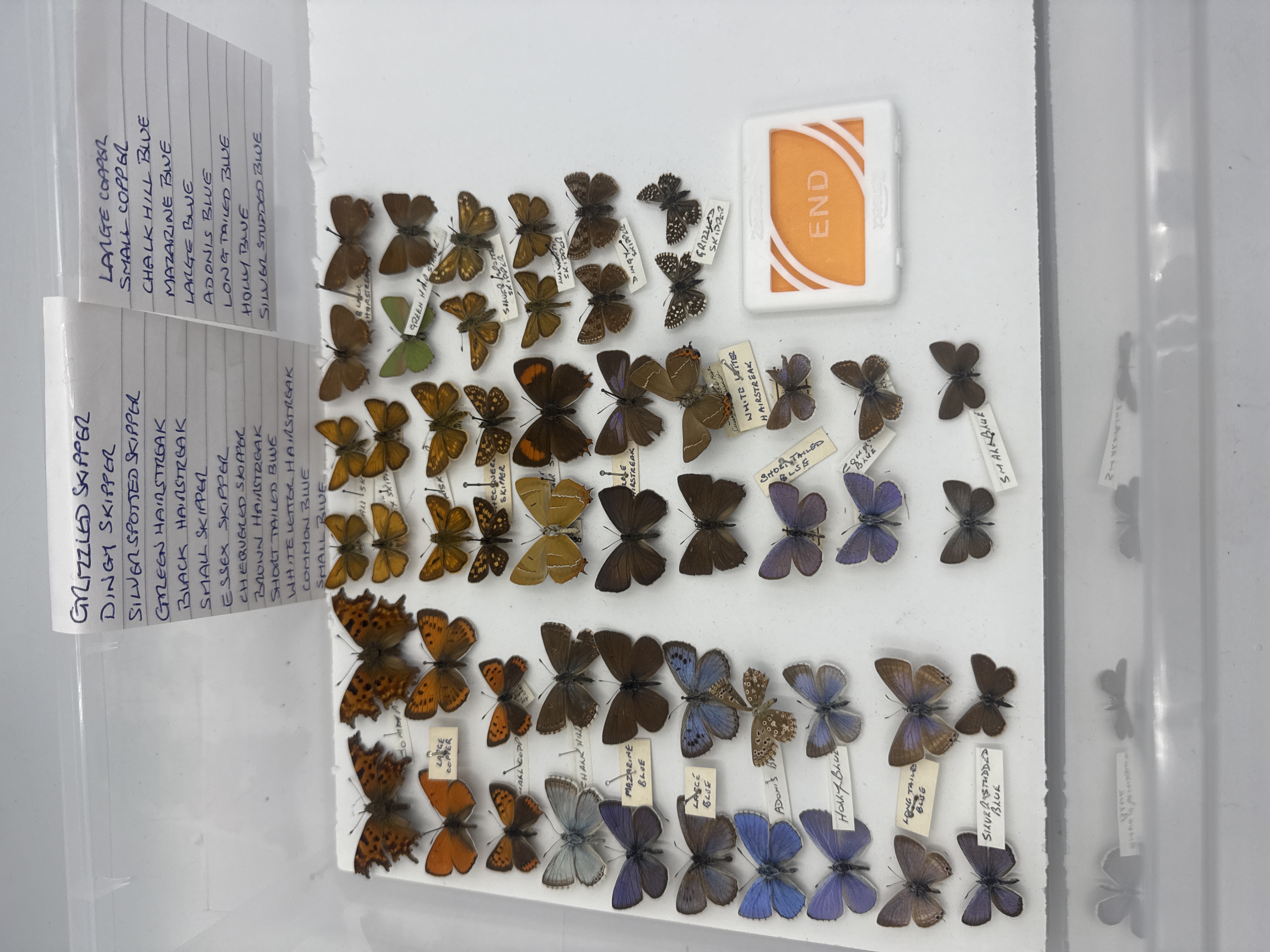 A collection of preserved entomological specimens comprising various butterfly species pinned and mounted on a white foam backing. The collection includes species such as Large Copper, Small Copper, Chalk Hill Blue, Mazarine Blue, Large Blue, Adonis Blue, Holly Blue, Long Tailed Blue, Silver Studded Blue, Grizzled Skipper, Dingy Skipper, Silver Spotted Skipper, Green Hairstreak, Black Hairstreak, Small Skipper, Essex Skipper, Chequered Skipper, Brown Hairstreak, Short Tailed Blue, White Letter Hairstreak, Common Blue, and Small Blue. The specimens are organized in rows, with individual handwritten identification labels placed beneath each. Two handwritten index sheets accompany the collection, providing a comprehensive list of the included species. The assembly includes an orange and white plastic marker labeled END at the upper right corner.