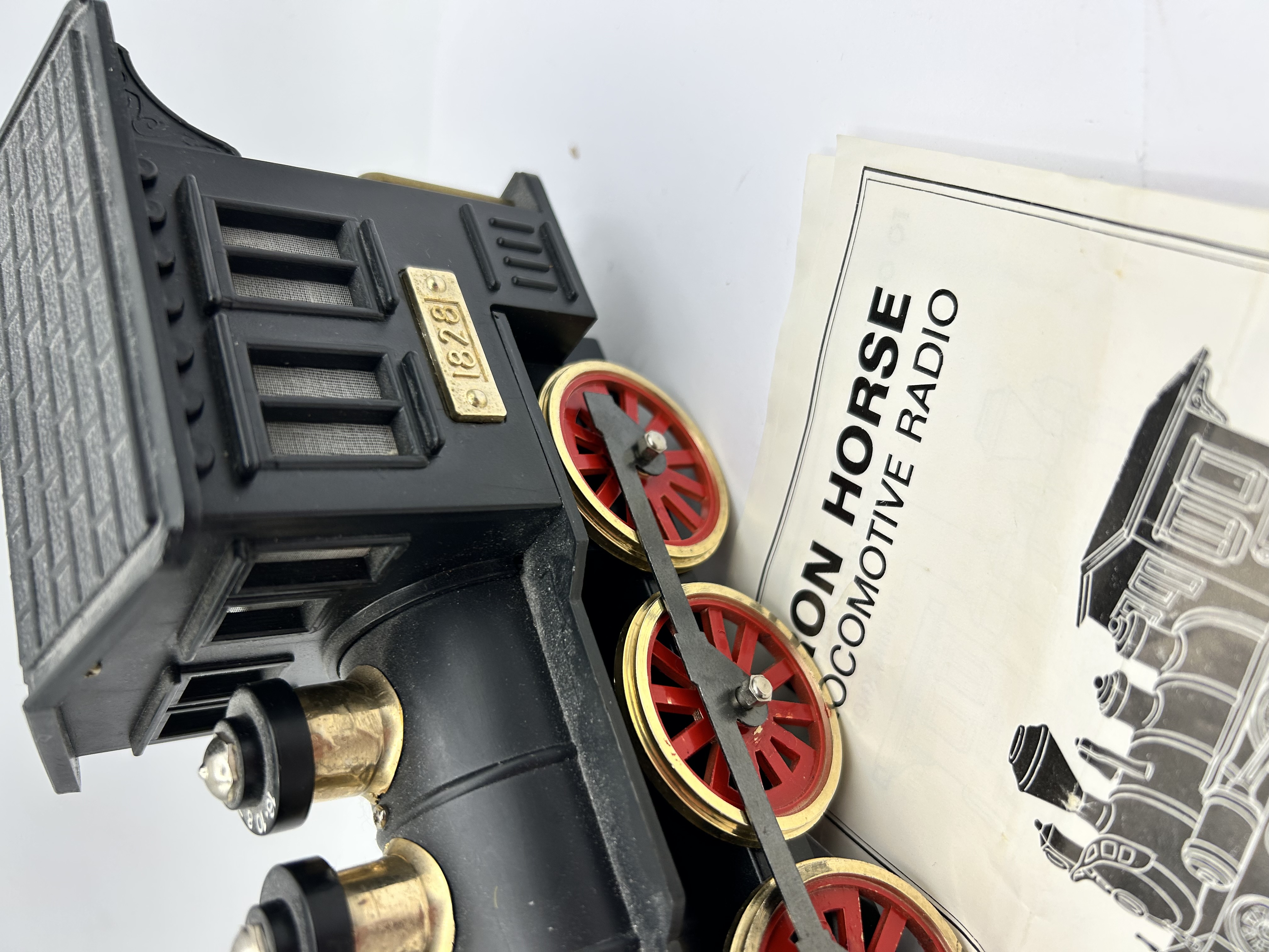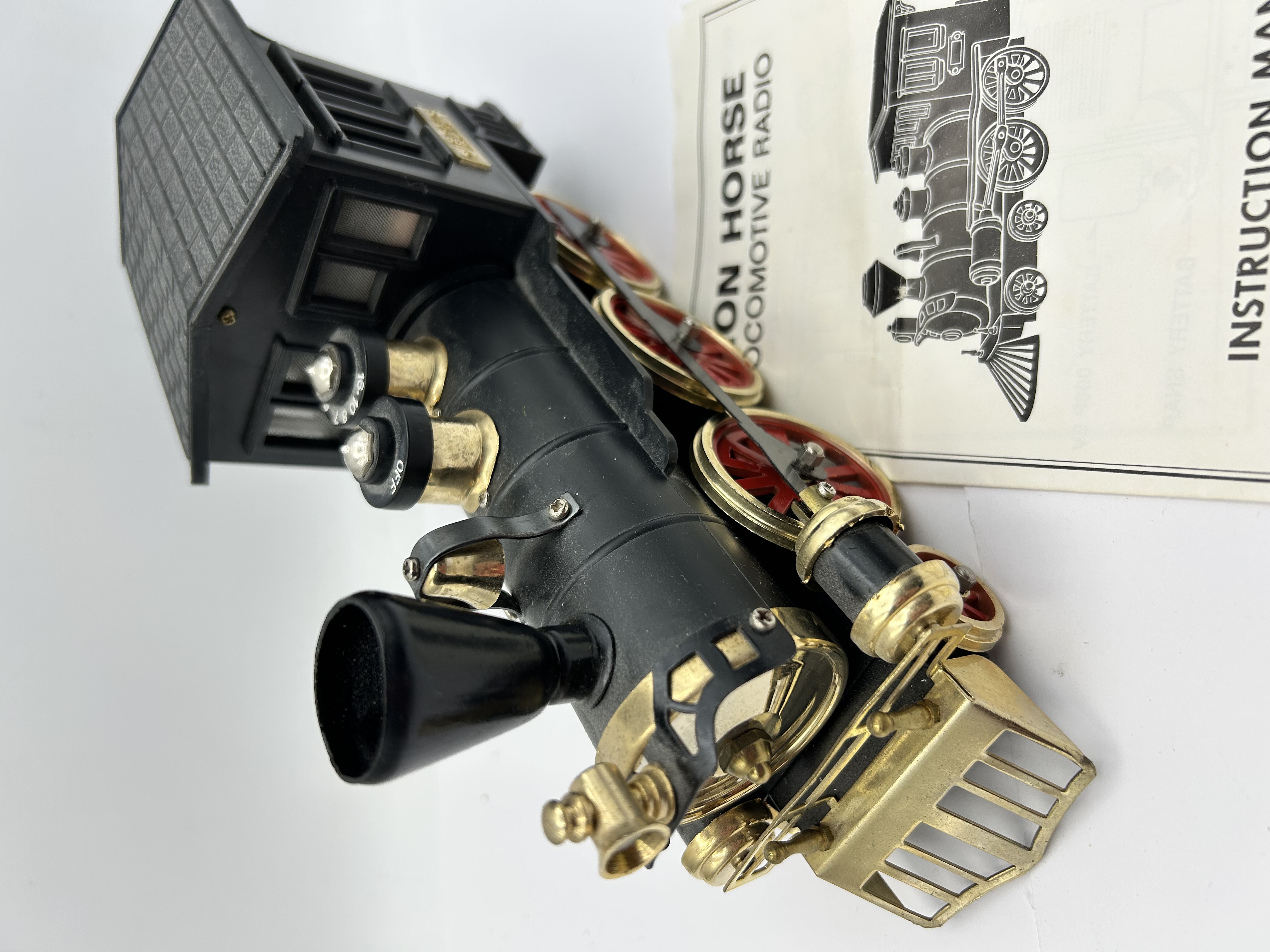An Iron Horse 1828 model train locomotive novelty AM radio accompanied by its original printed instruction manual. The piece is constructed from molded black plastic with gold-toned metallic accents, including a front cowcatcher and a plaque on the side of the cab embossed with 1828. The design features red-spoked wheels with gold-colored rims. Two integrated control knobs for radio operation are situated along the boiler. The instruction manual includes a graphic illustration of the locomotive and operating instructions.