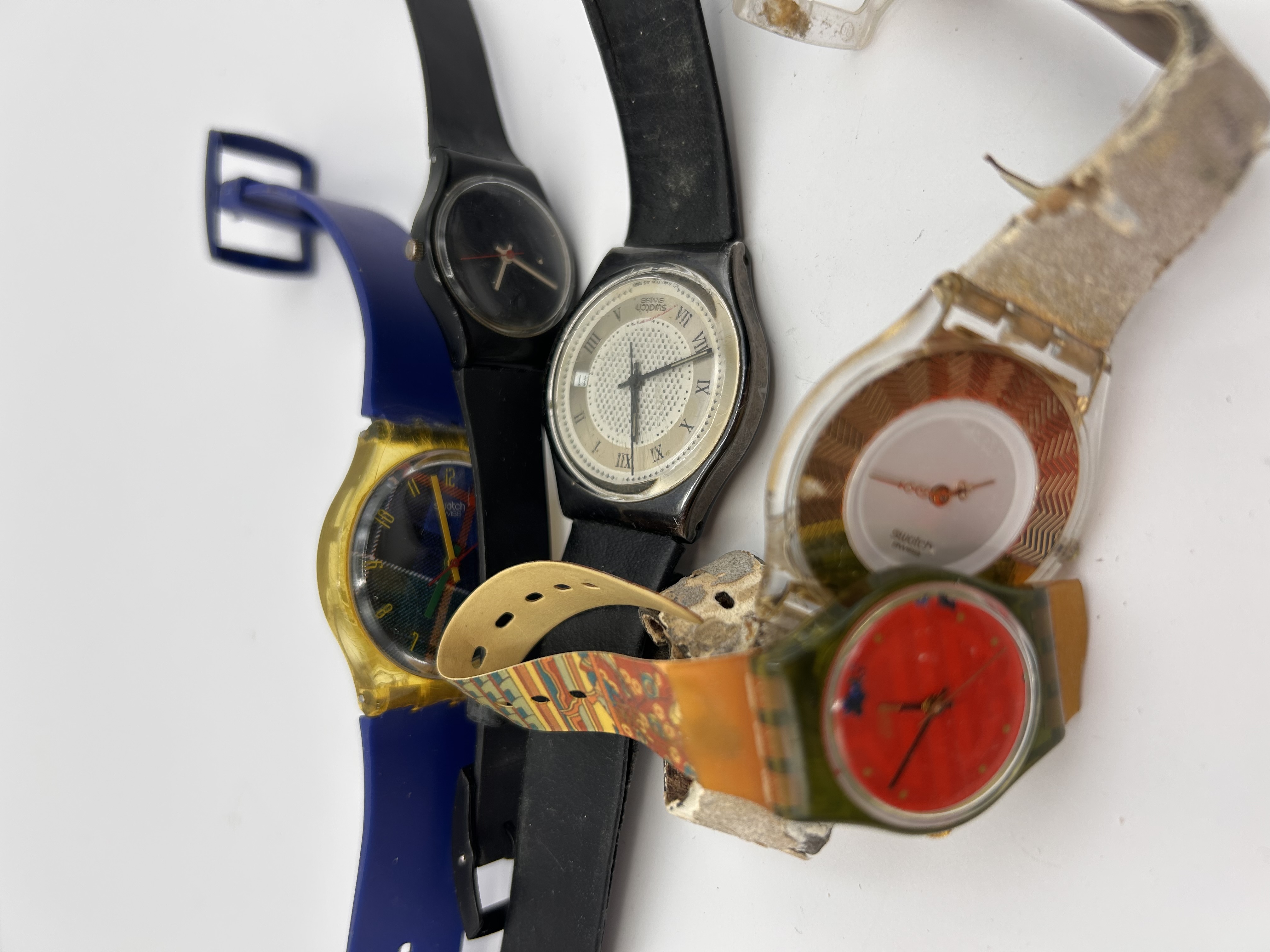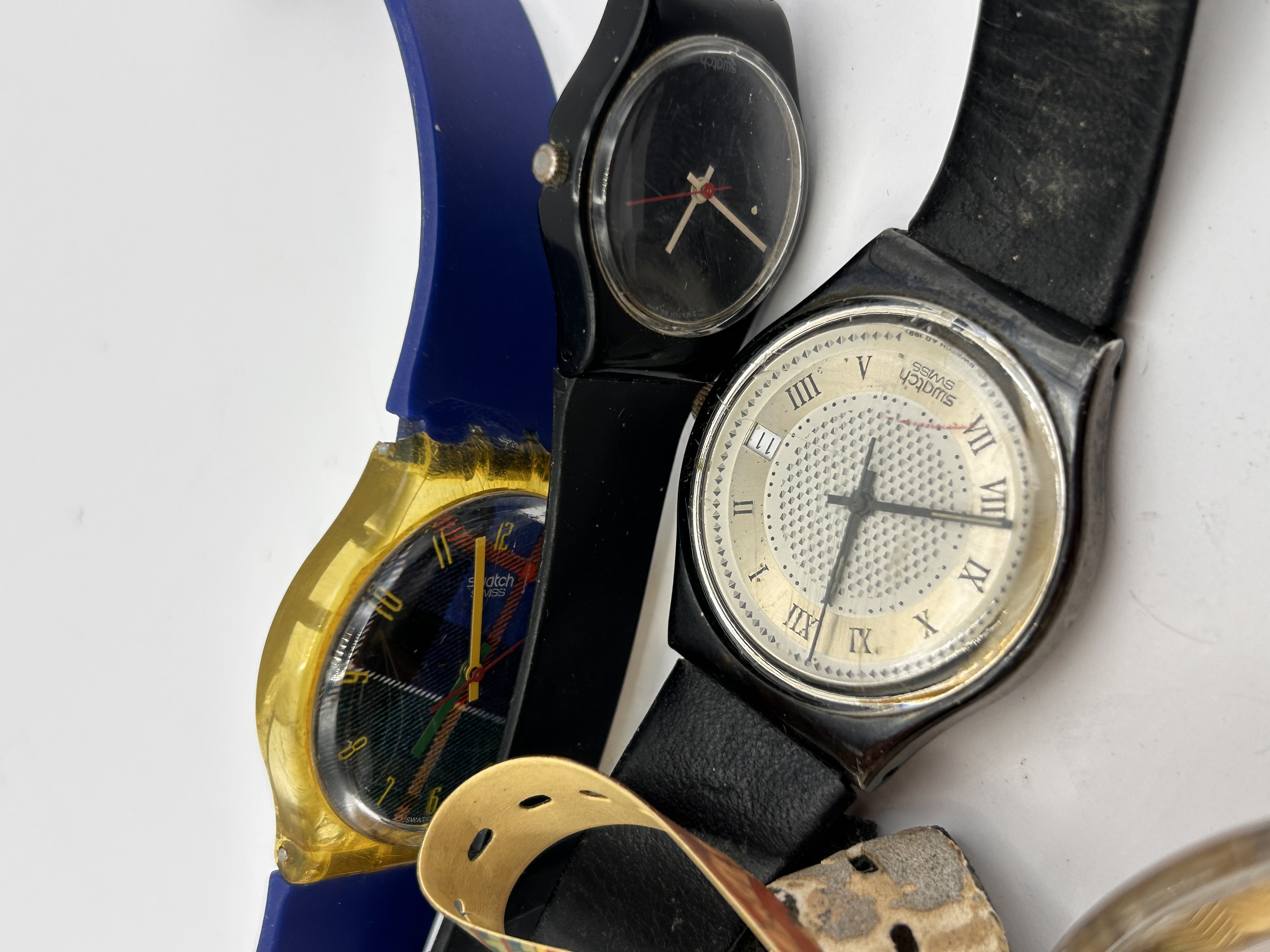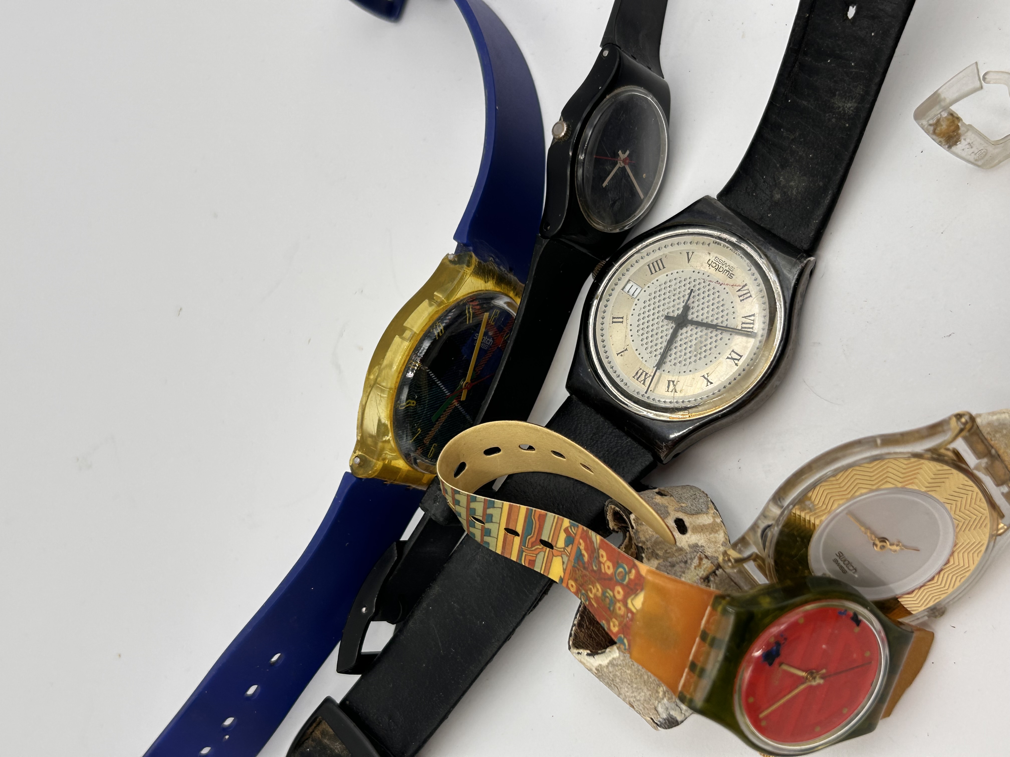 A group of vintage Swatch wristwatches featuring various designs from the late 20th century. The collection includes a model with a blue silicone strap, yellow translucent resin case, and a plaid-patterned dial; a minimalist all-black model; a model featuring Roman numerals on a textured silver-tone dial with a black strap; and several art-inspired versions with patterned straps and vibrant dials. Construction primarily consists of plastic or resin cases with various silicone, plastic, or composite straps. Dials are marked with swatch and swatch swiss branding.