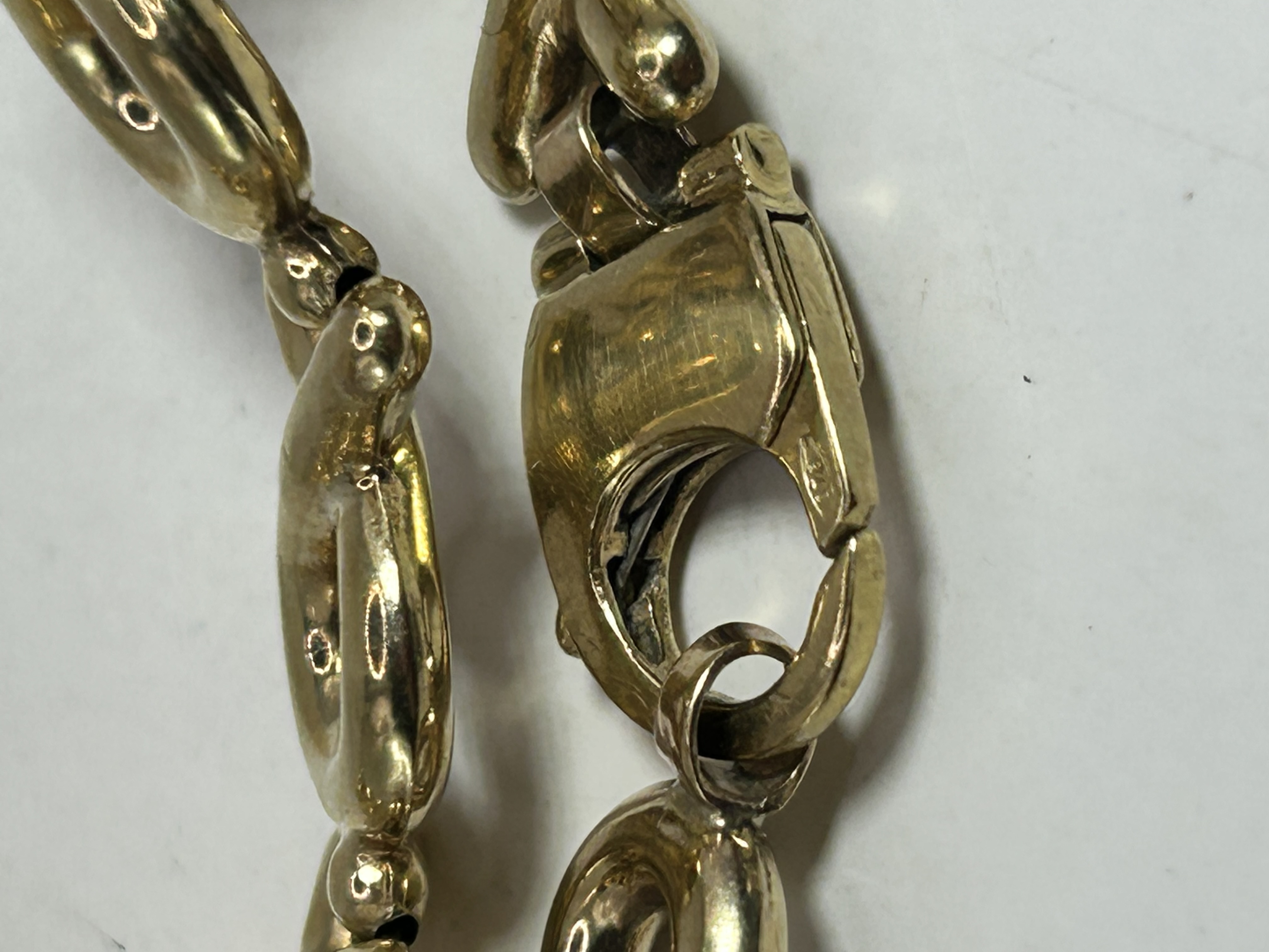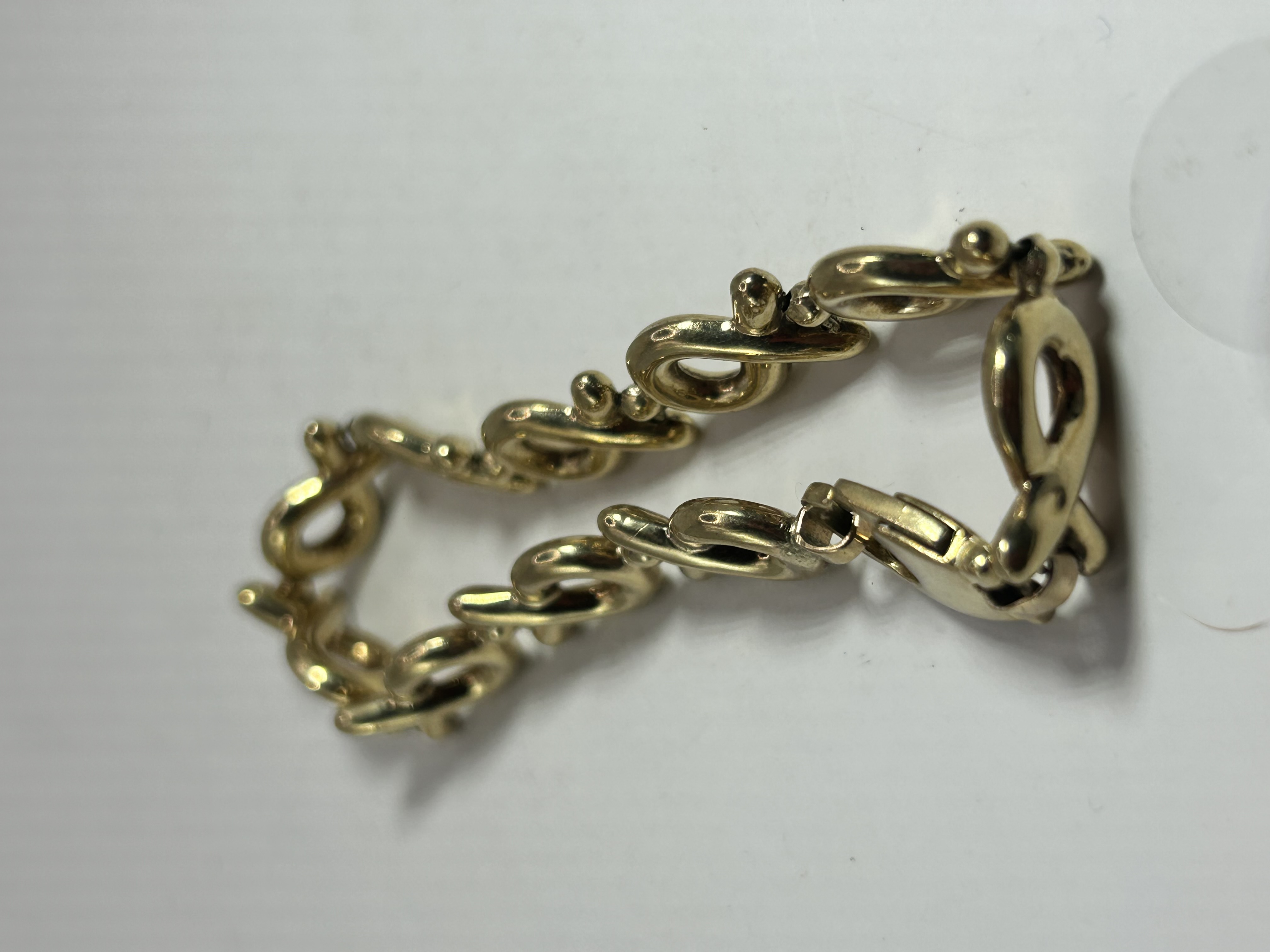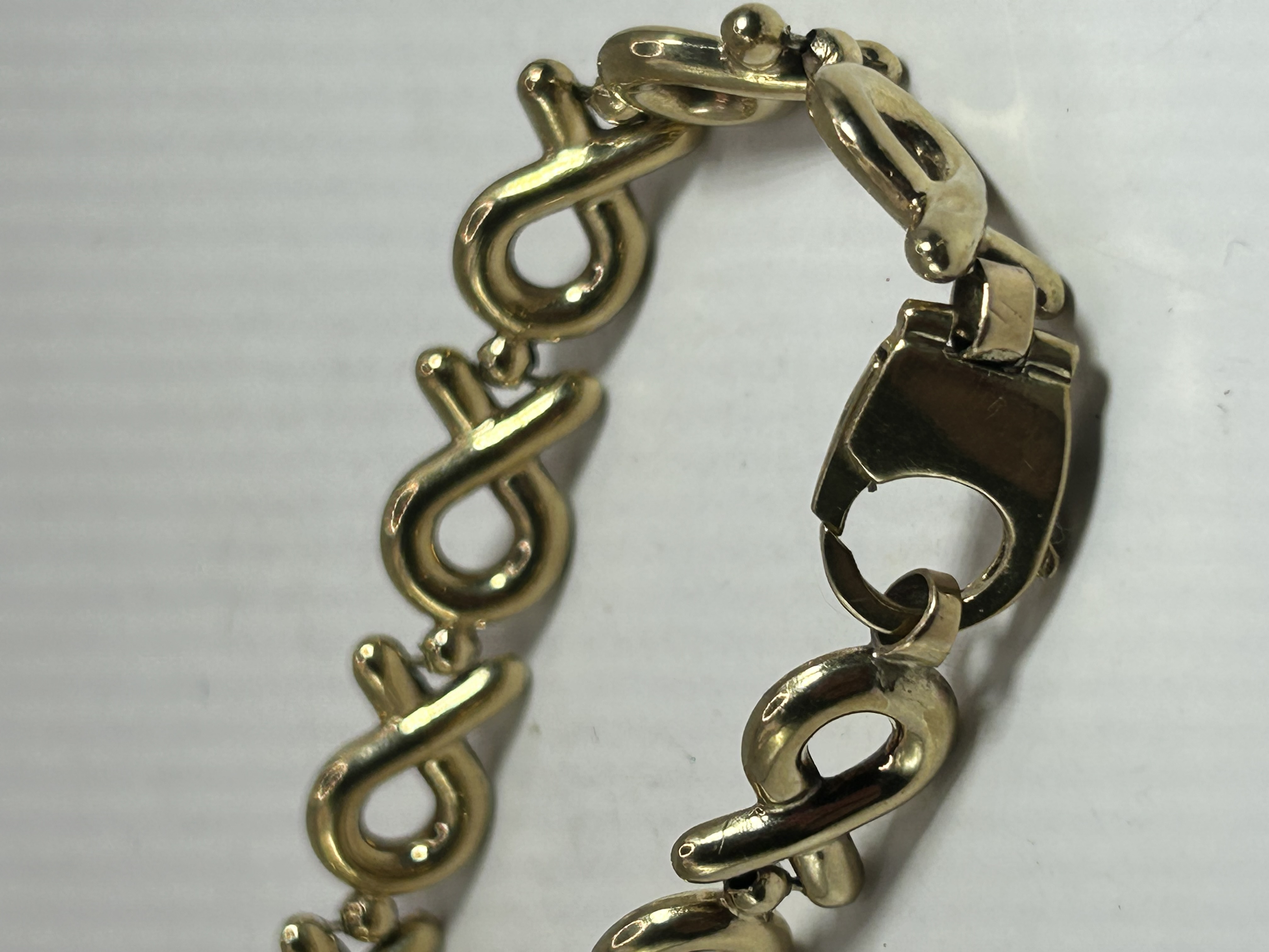 A gold link bracelet featuring the Hugs and Kisses pattern. The design is composed of a series of interlocking, rounded figure-eight or X-shaped links with a polished finish. The piece is secured by an integrated, oversized lobster claw clasp. A hallmark or maker’s mark is present on the lever of the clasp.