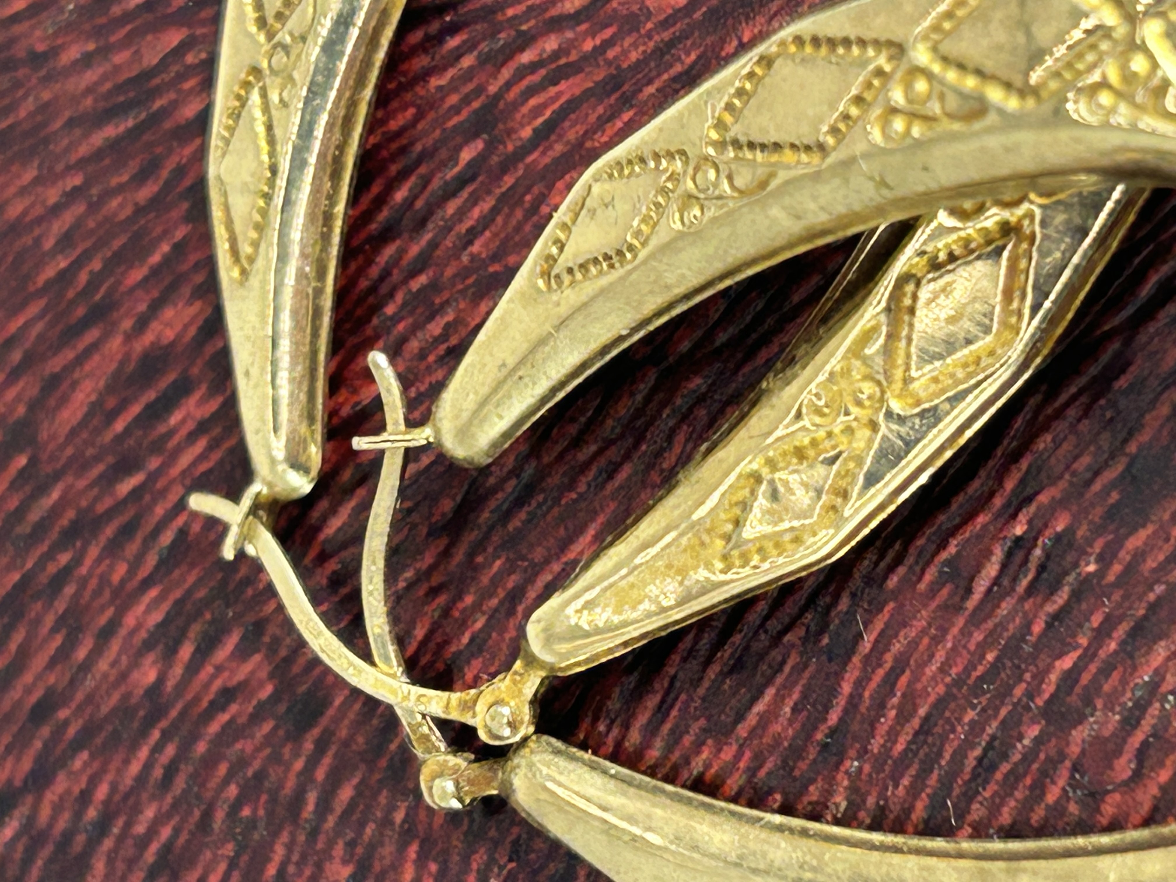 A pair of 9ct yellow gold hoop earrings designed in a Victorian style creole form. Each earring features an elongated, tapered crescent shape embellished with a stamped geometric pattern of repeating diamond motifs containing fine stippling, accented by small circular details. The earrings are secured with hinged latch-back closures and possess smooth, polished interior surfaces. Faint, illegible markings are present on the ear wires.