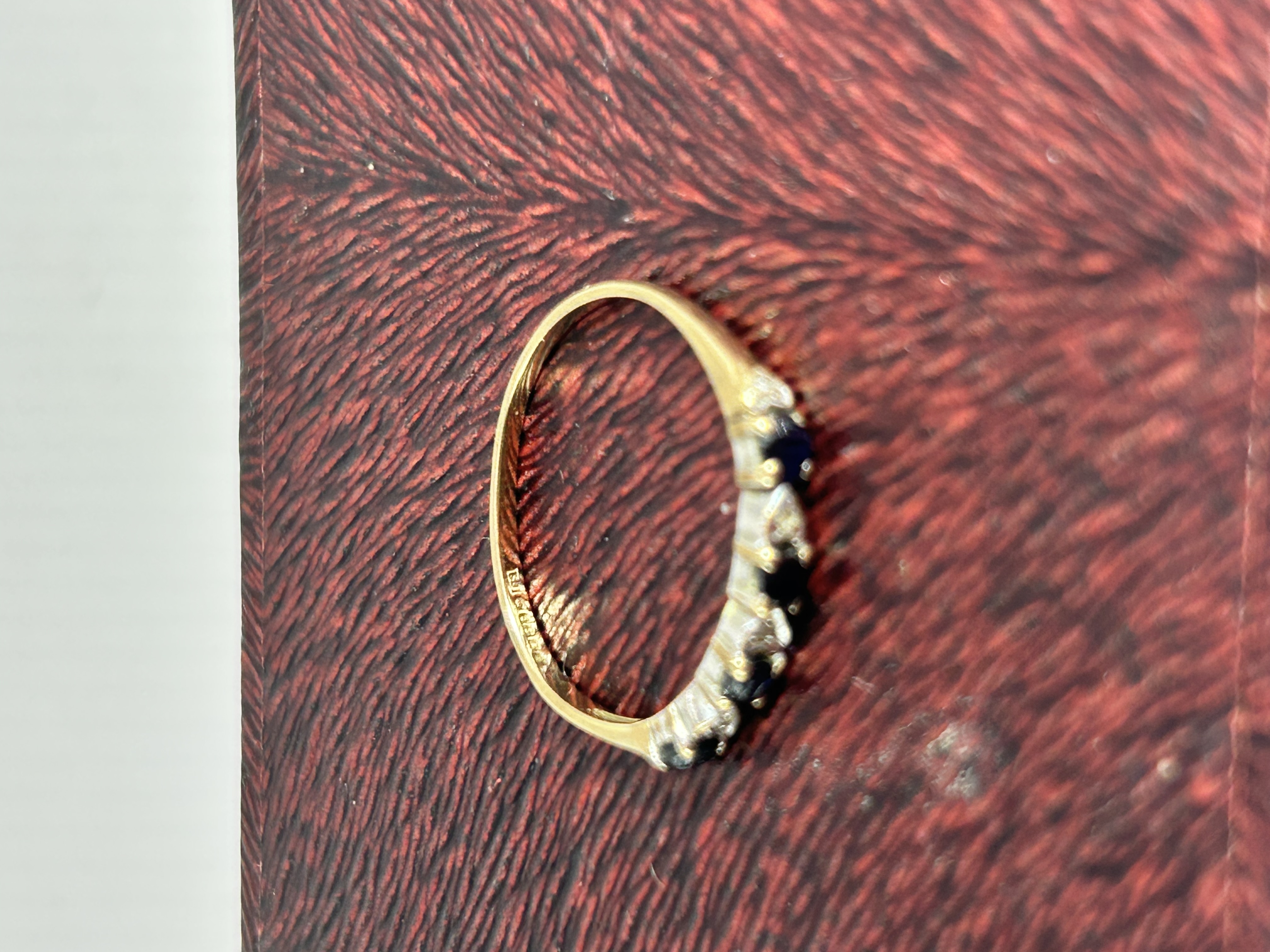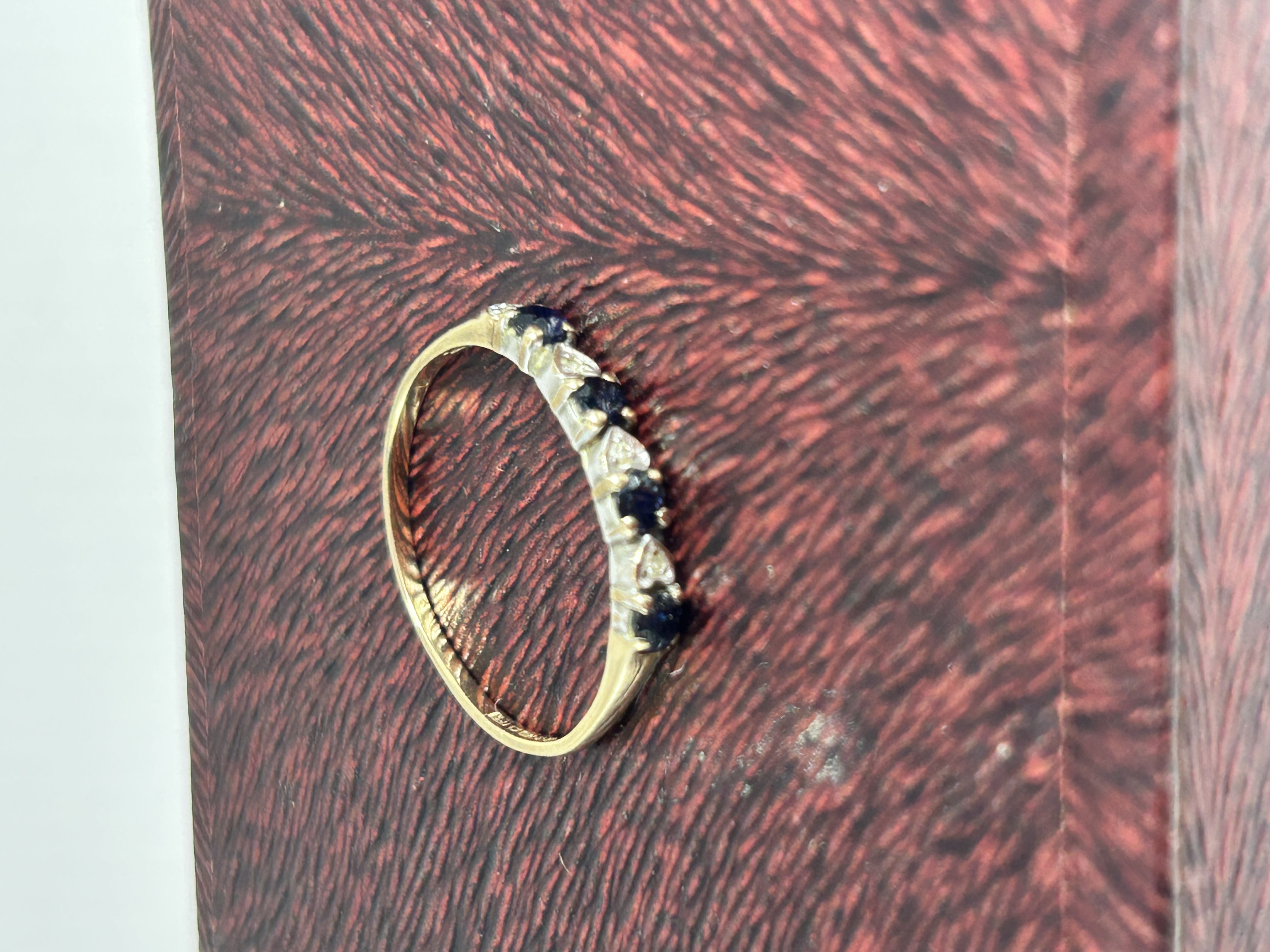A 9ct yellow gold half eternity ring featuring a row of five round-cut dark blue natural sapphires alternating with four smaller clear diamond accents. The gemstones are secured in white metal claw settings atop a yellow gold band. The interior of the band is stamped with a 10K hallmark and a partially legible maker’s mark. This style of jewelry is commonly identified as a September birthstone or anniversary band.