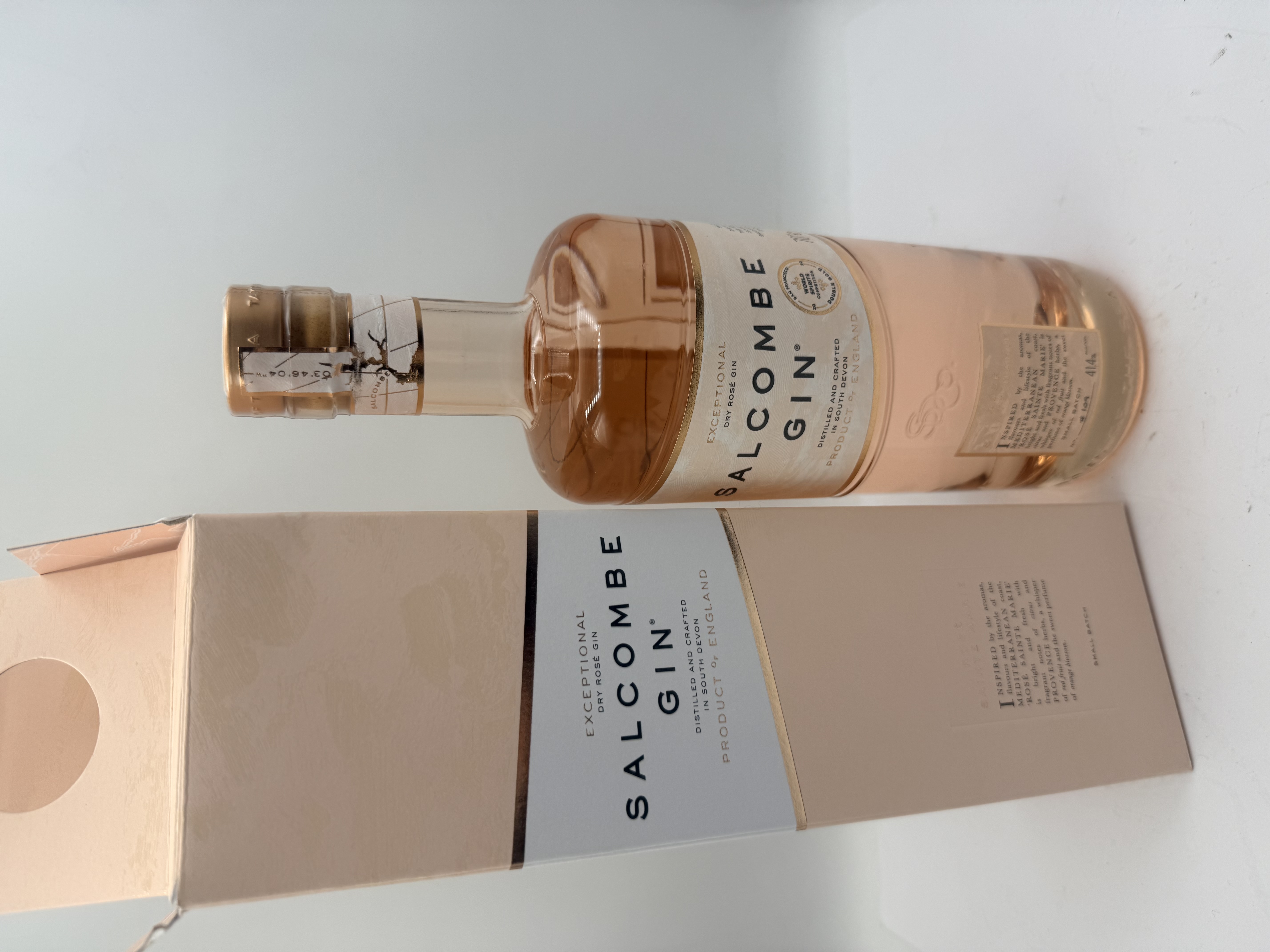 One bottle of Salcombe Rose Sainte Marie dry rose gin, distilled and crafted in South Devon, England. The clear glass bottle contains a pale pink spirit and features a white and gold label with the brand name Salcombe Gin and the designation Exceptional Dry Rose Gin. The label displays a Double Gold award mark from the San Francisco World Spirits Competition. The bottle is sealed with a gold-toned cap and retains an intact duty stamp. Included is the original light pink cardboard presentation box with matching branding and descriptive text regarding Mediterranean inspiration.