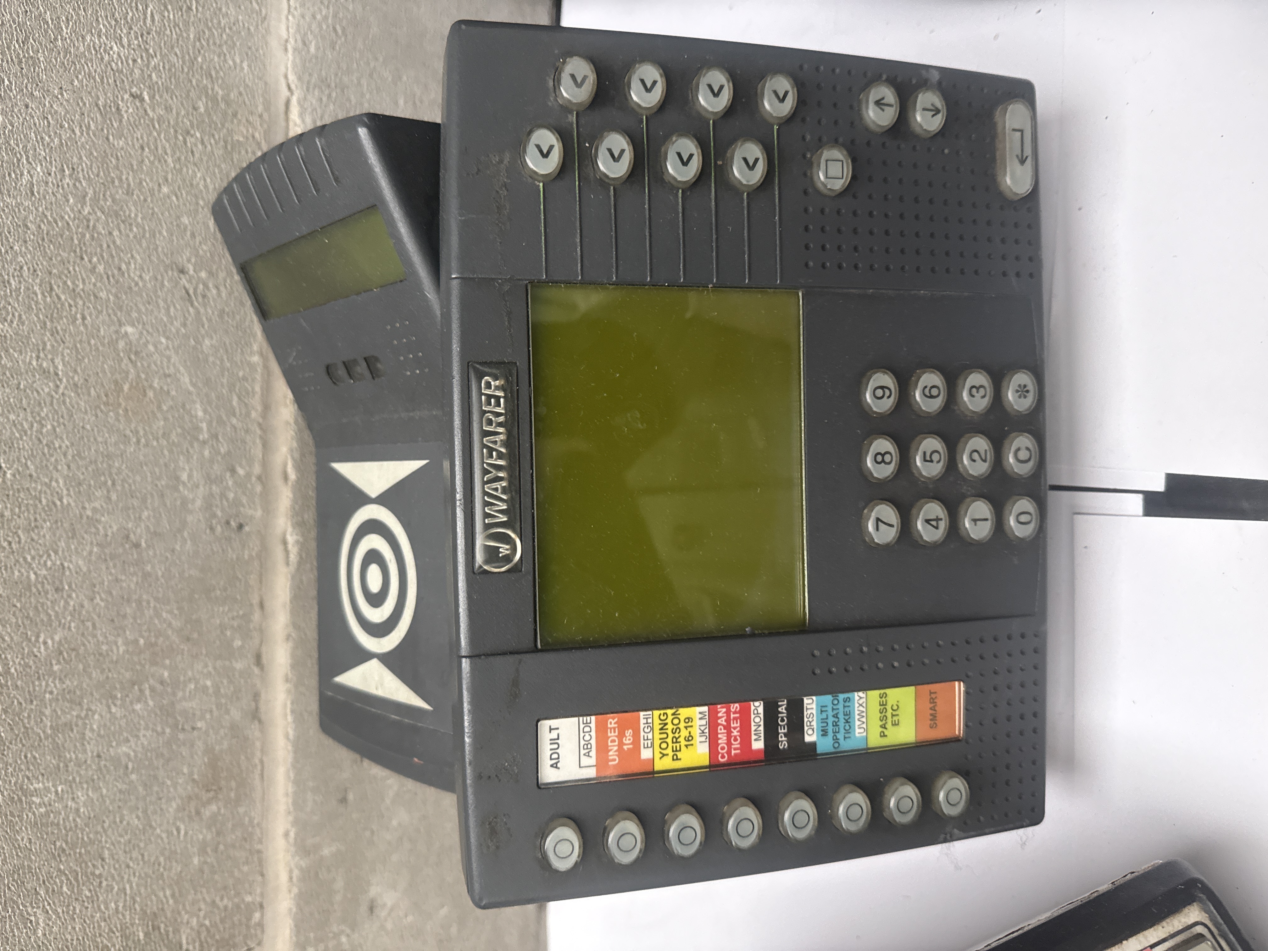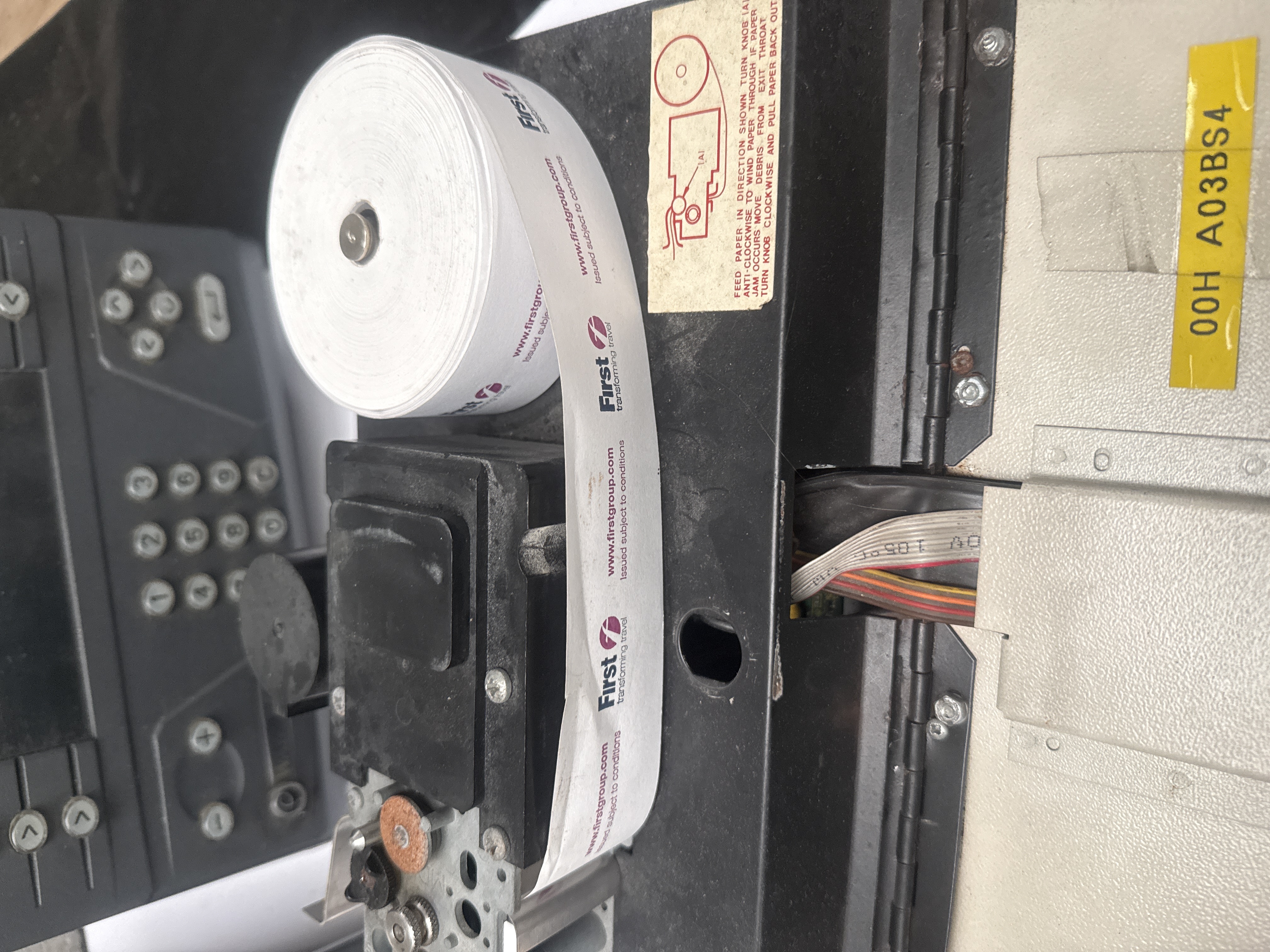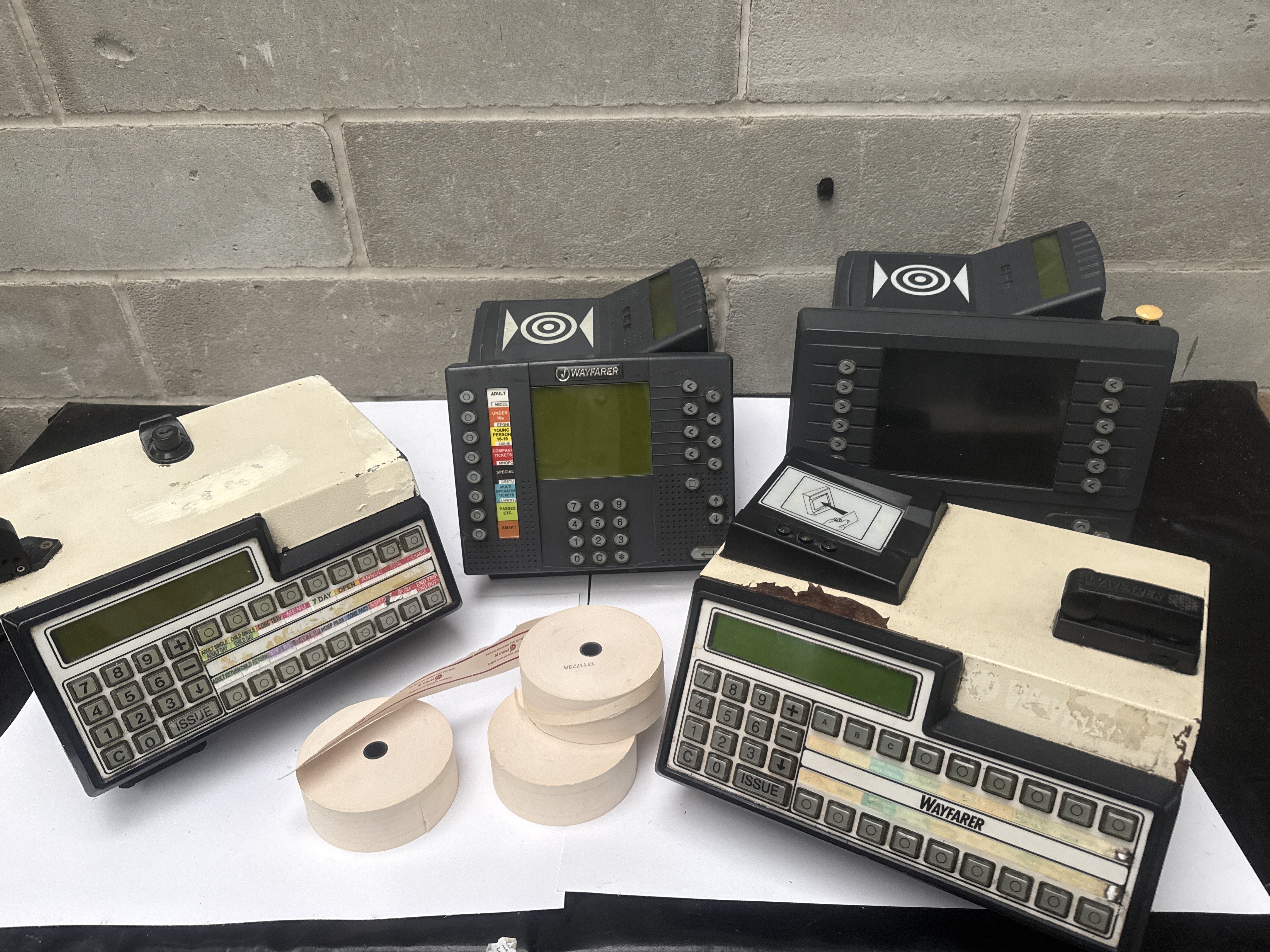 A collection of four Wayfarer 3 electronic bus ticket terminals and associated accessories. The group includes two distinct models: dark grey units featuring integrated digital screens with color-coded category labels for various passenger types, and cream and black keyboard-style machines with prominent ISSUE buttons. The terminals are constructed from plastic and metal housing. Included in the lot are several rolls of printed paper ticket tape bearing First Group branding and the company website. The units feature various operational instructional labels and Wayfarer branding. Internal components and wiring are visible on certain units.