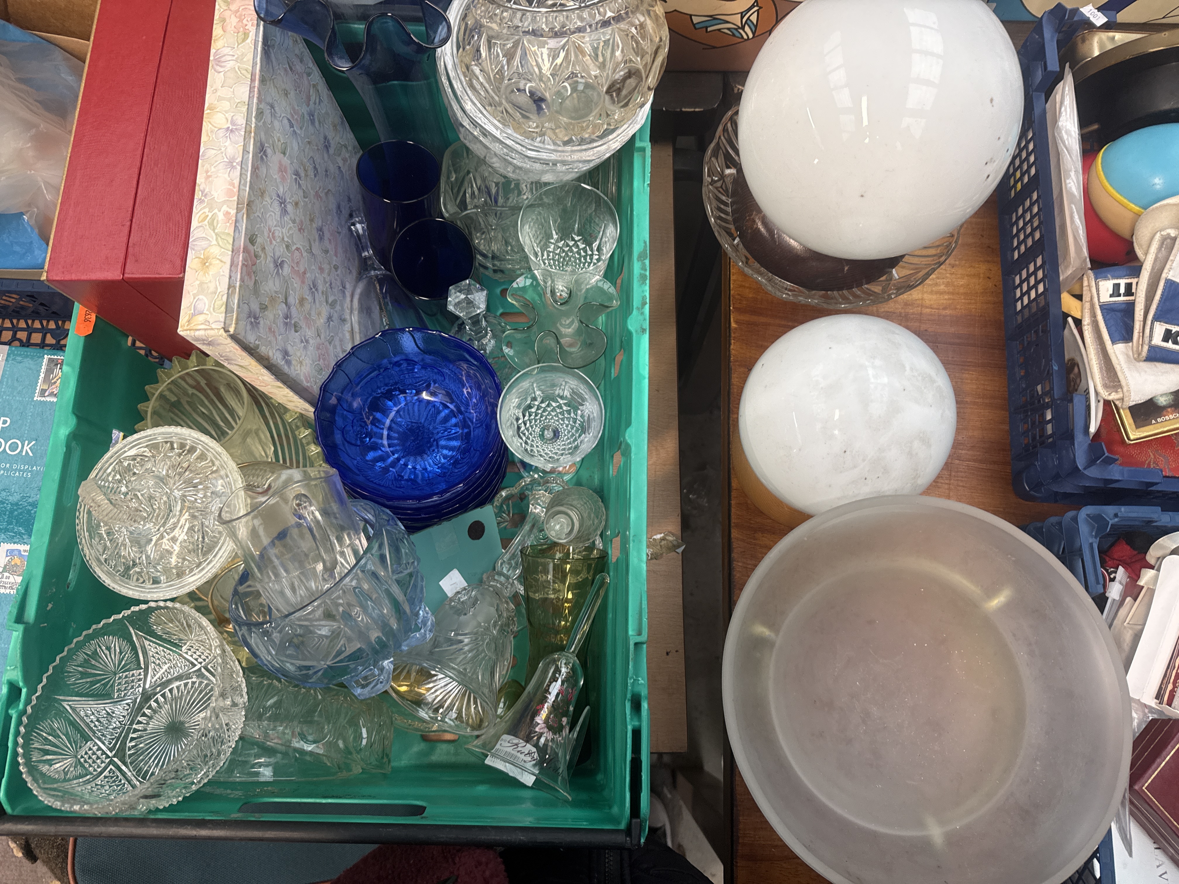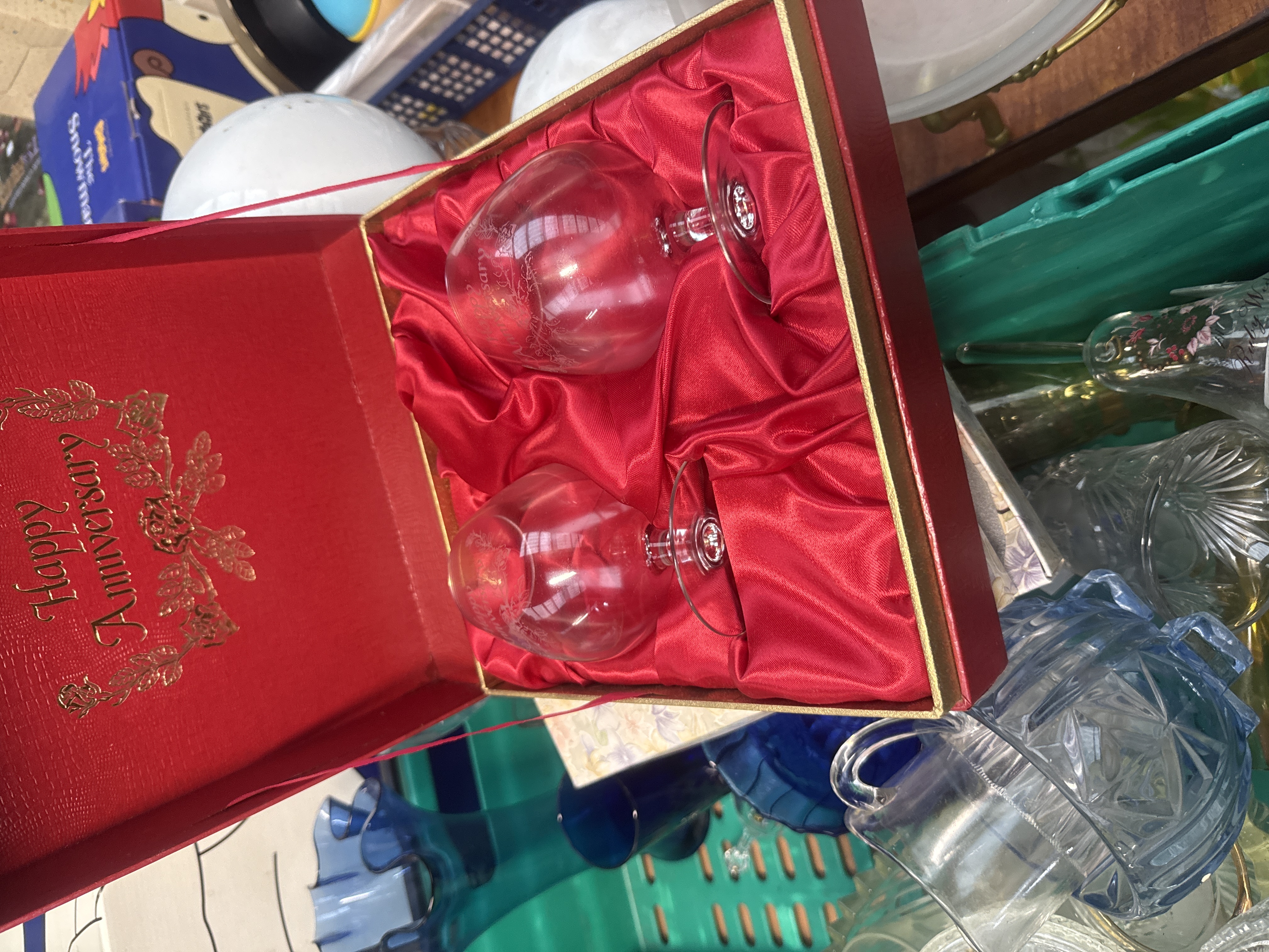 An assortment of glassware and decorative objects comprising various cut and pressed glass vessels including bowls, a pitcher, and stemware in clear, light blue, and cobalt blue tones. The lot features a pair of commemorative drinking glasses presented in a red, satin-lined box with gold-toned Happy Anniversary embossing and floral motifs. Also included are two large white frosted glass spherical lamp shades, a frosted glass bowl, and a small glass hand-bell decorated with painted floral motifs.